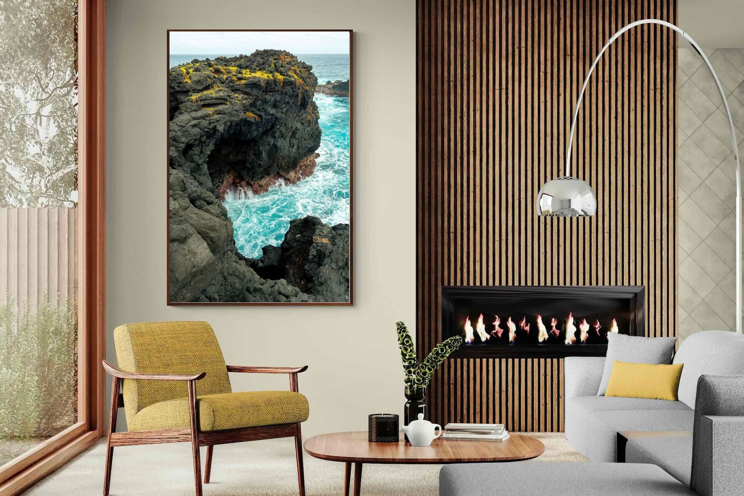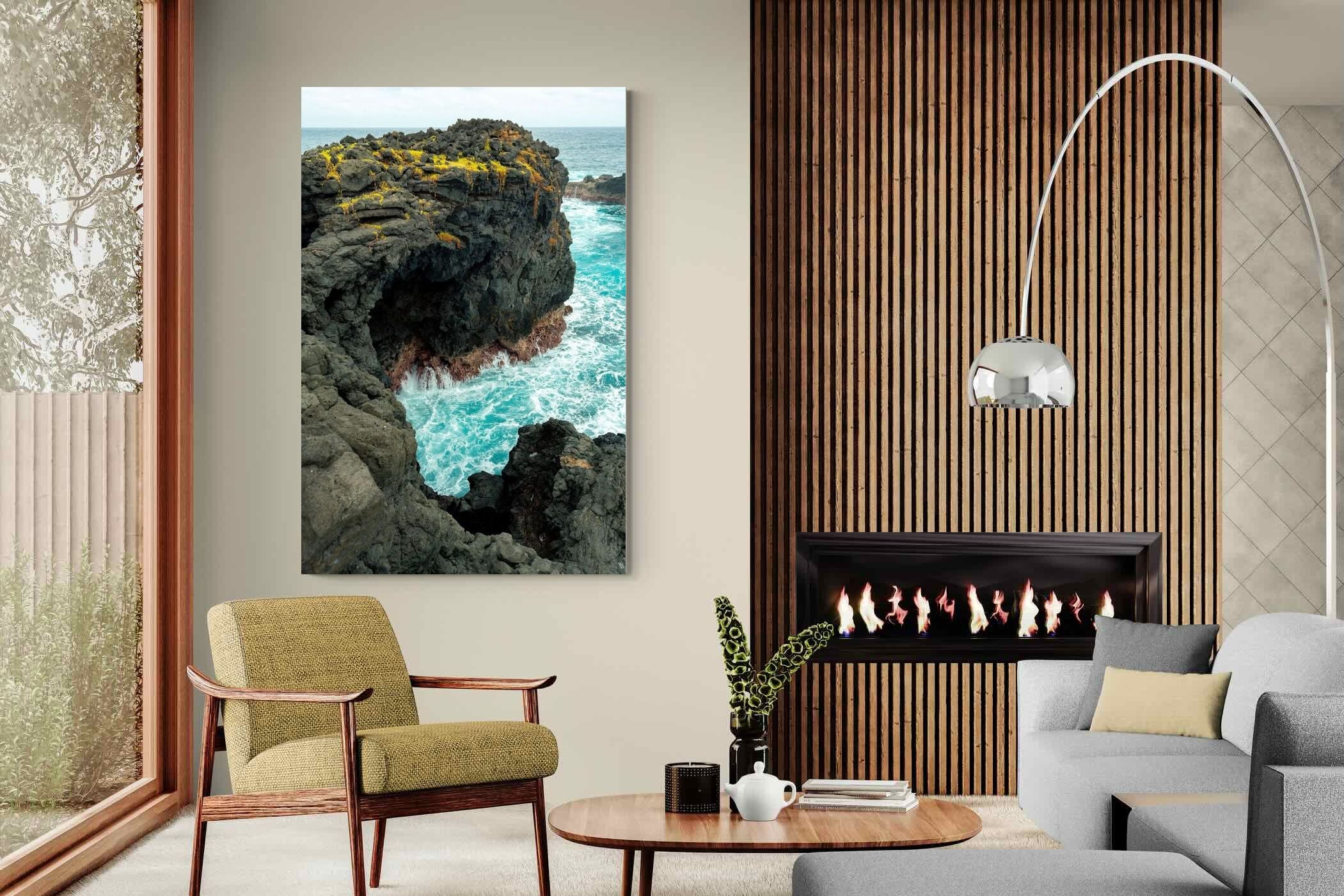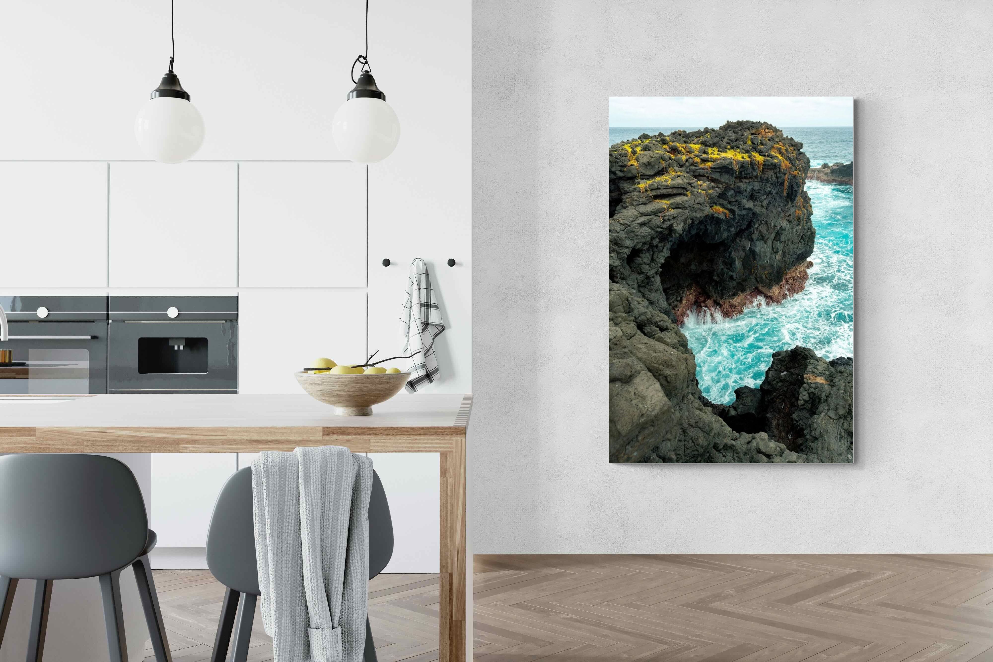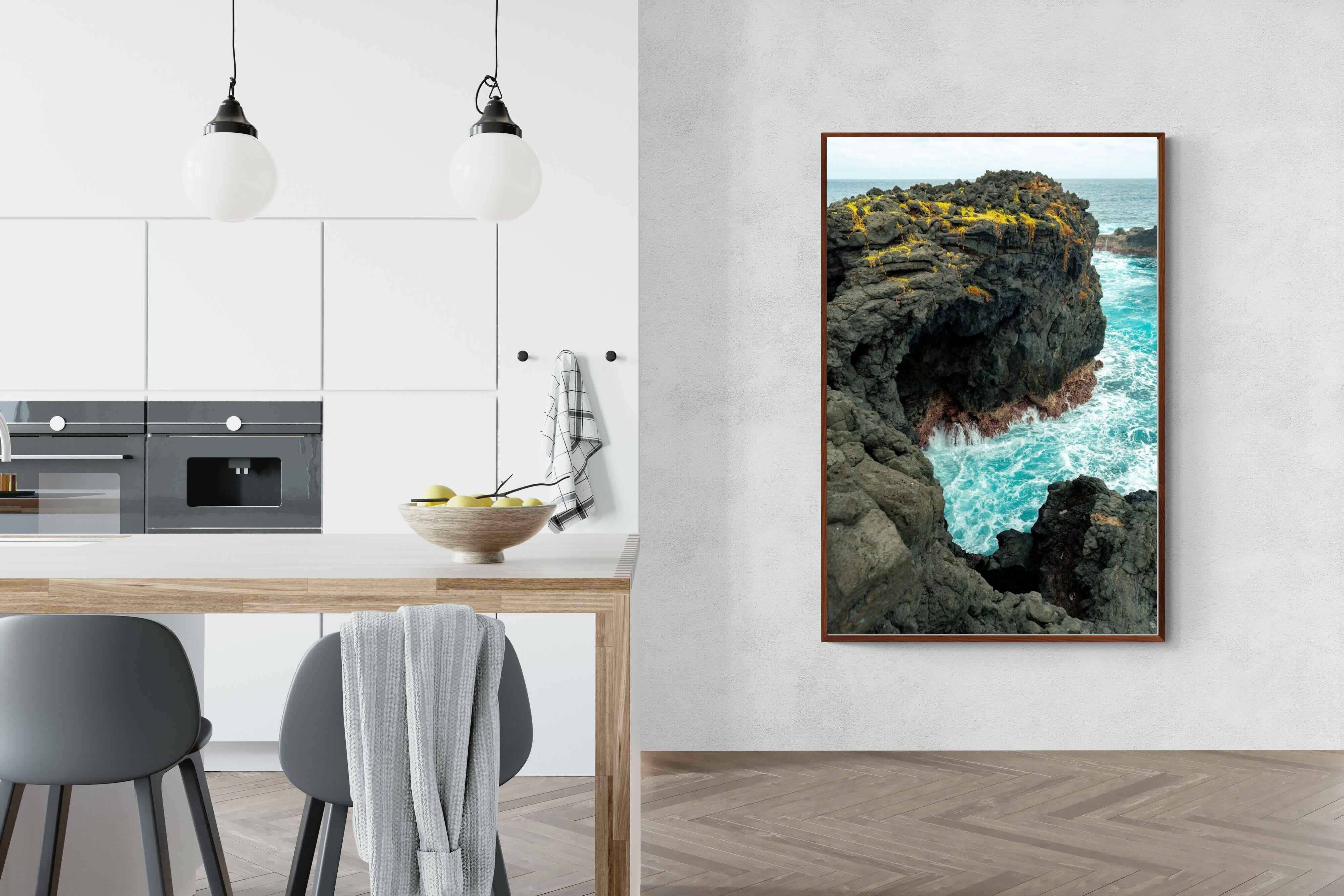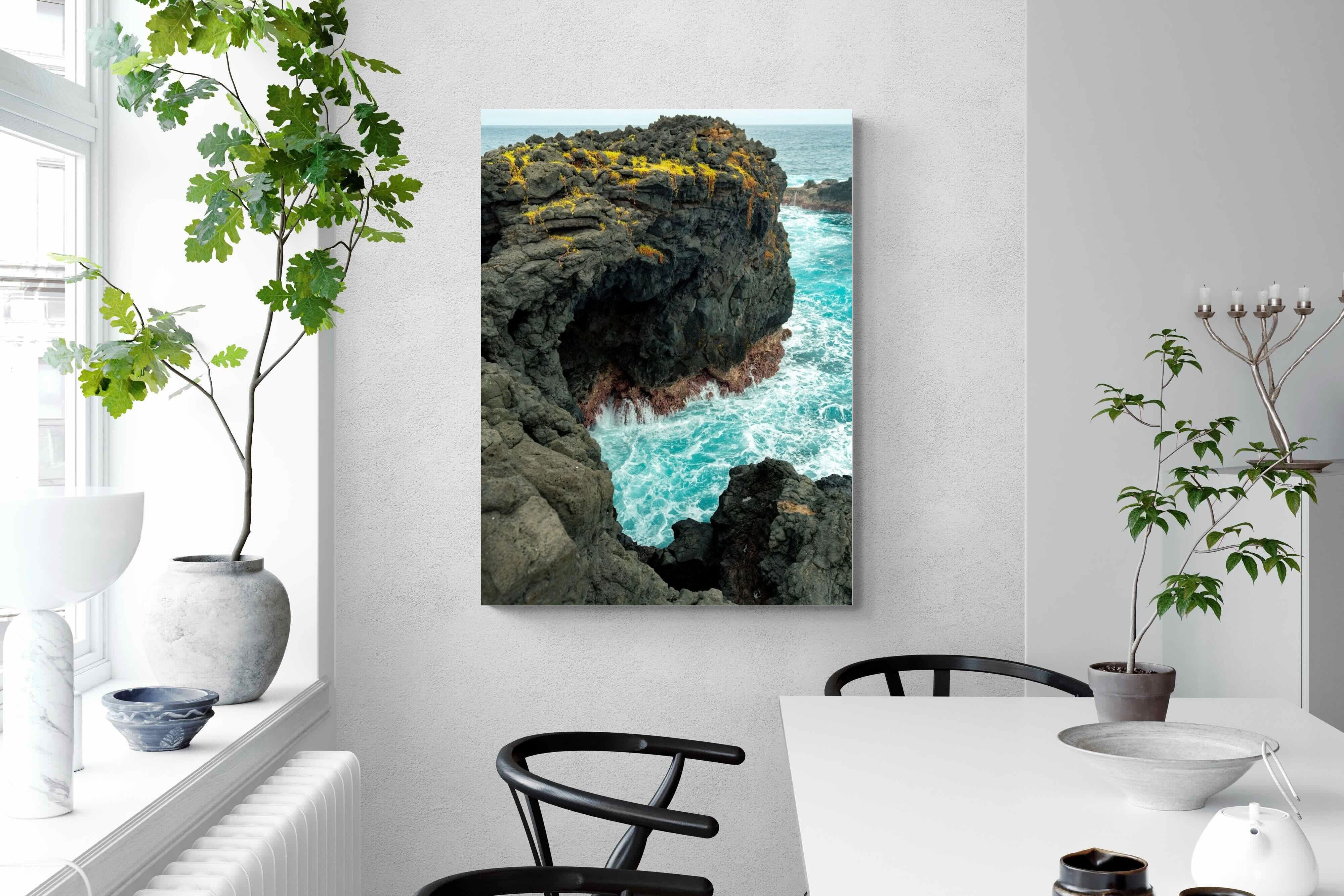 Powerful turquoise waves crash against rugged volcanic cliffs along the wild coastline of São Tomé and Príncipe. Dark rock formations rise sharply above the Atlantic while bright coastal vegetation clings to the stone, adding vivid contrast to the scene. The photograph captures the raw beauty and geological drama of this remote island landscape. A striking wall art piece that brings natural energy and adventurous coastal character to contemporary interiors.