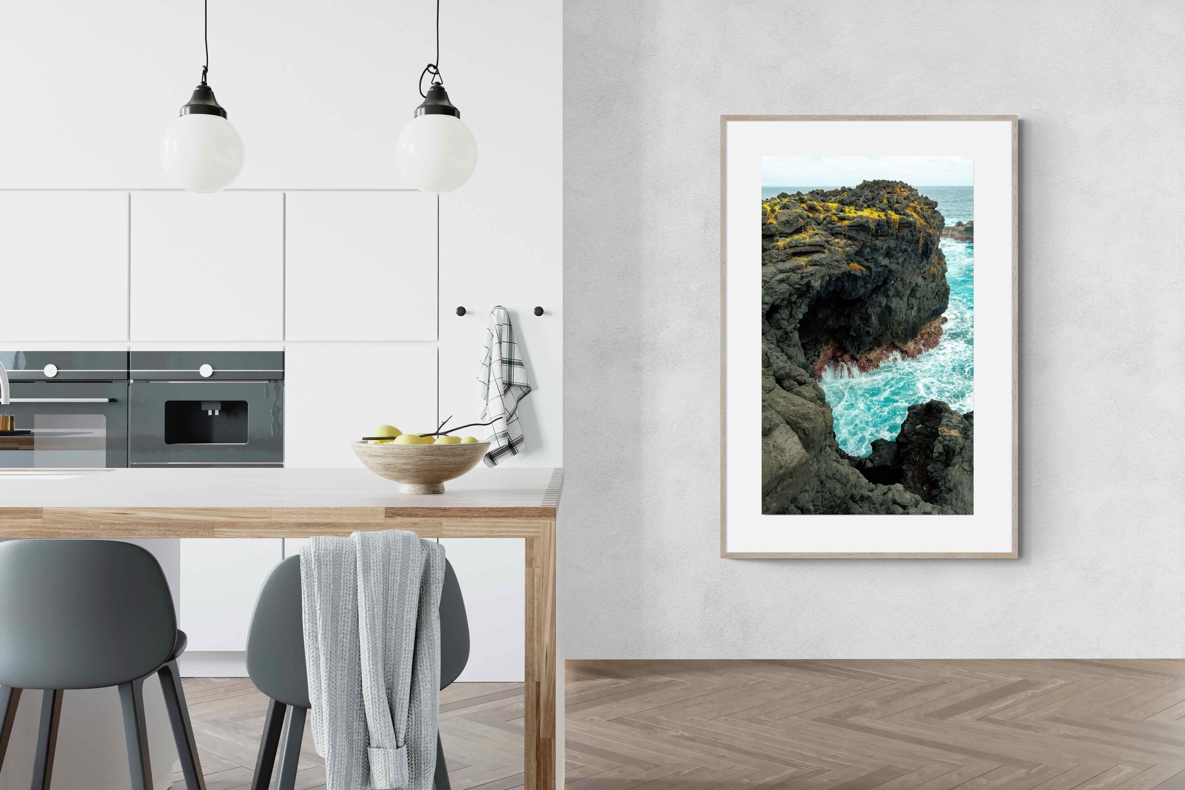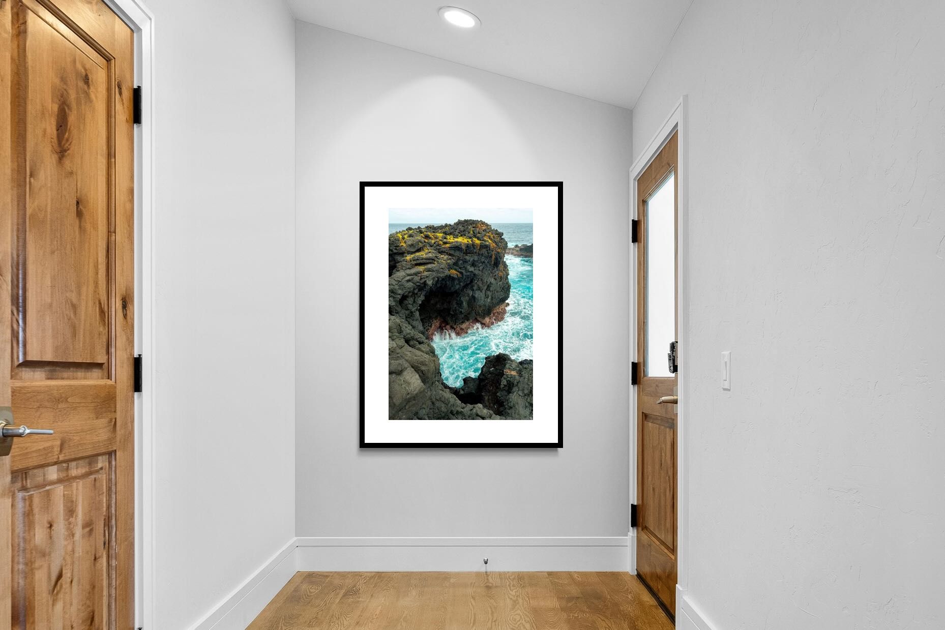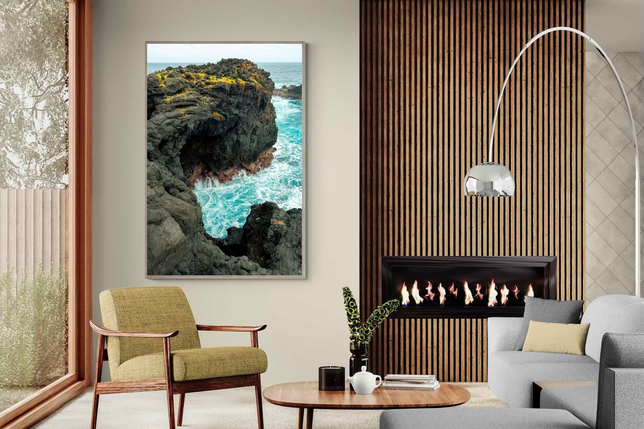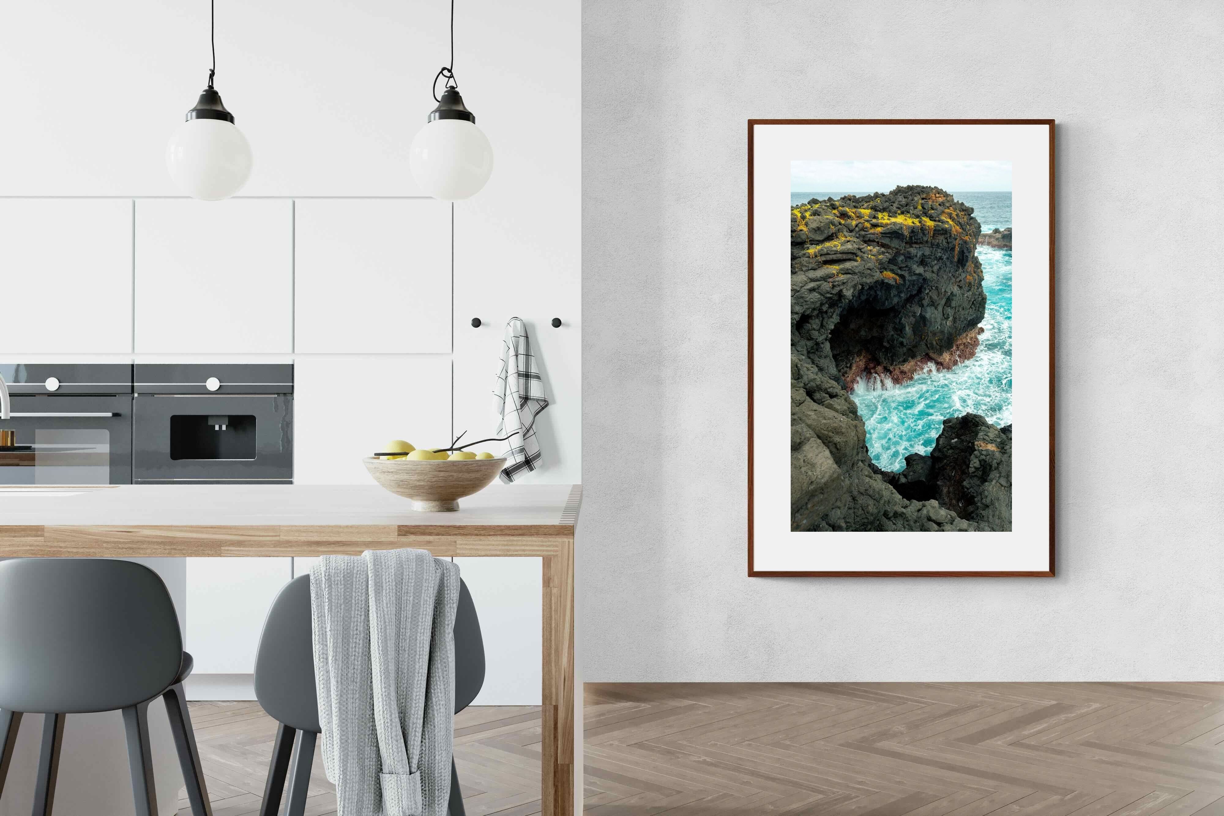 Powerful turquoise waves crash against rugged volcanic cliffs along the wild coastline of São Tomé and Príncipe. Dark rock formations rise sharply above the Atlantic while bright coastal vegetation clings to the stone, adding vivid contrast to the scene. The photograph captures the raw beauty and geological drama of this remote island landscape. A striking wall art piece that brings natural energy and adventurous coastal character to contemporary interiors.
