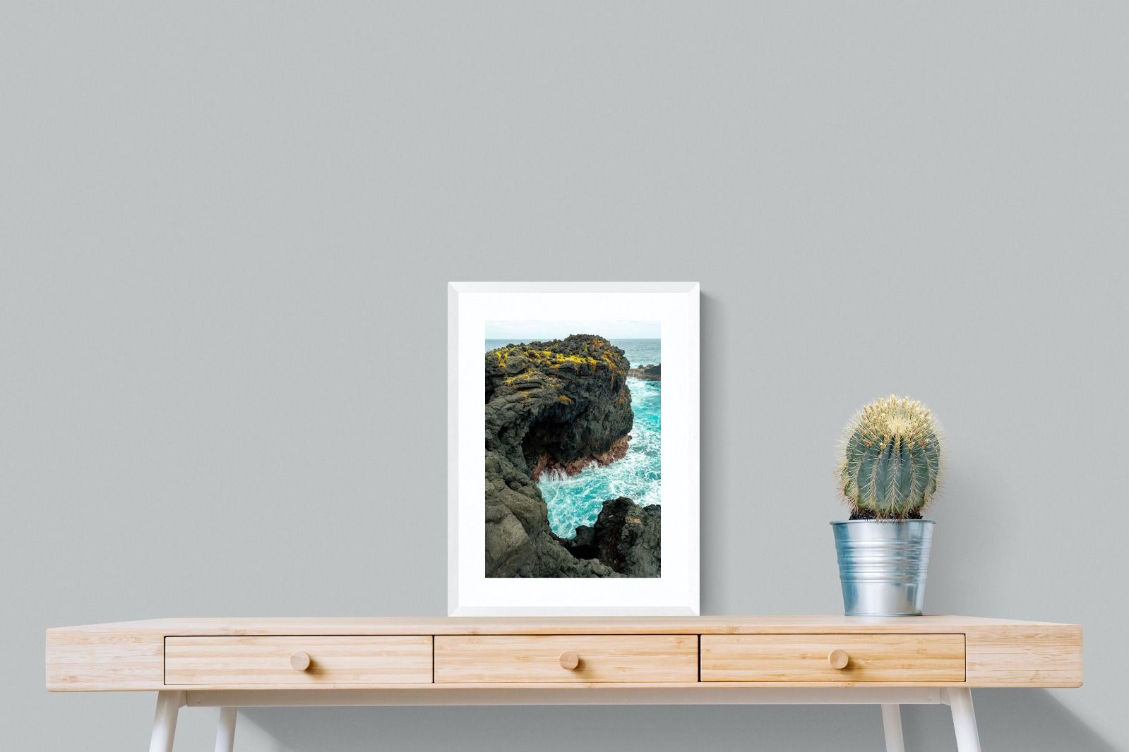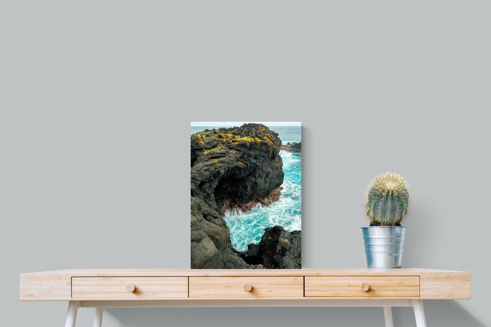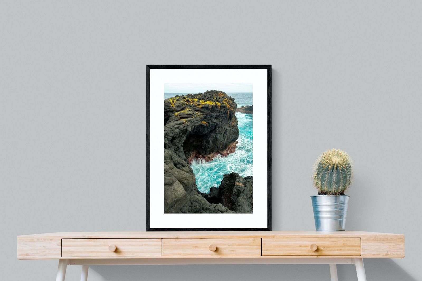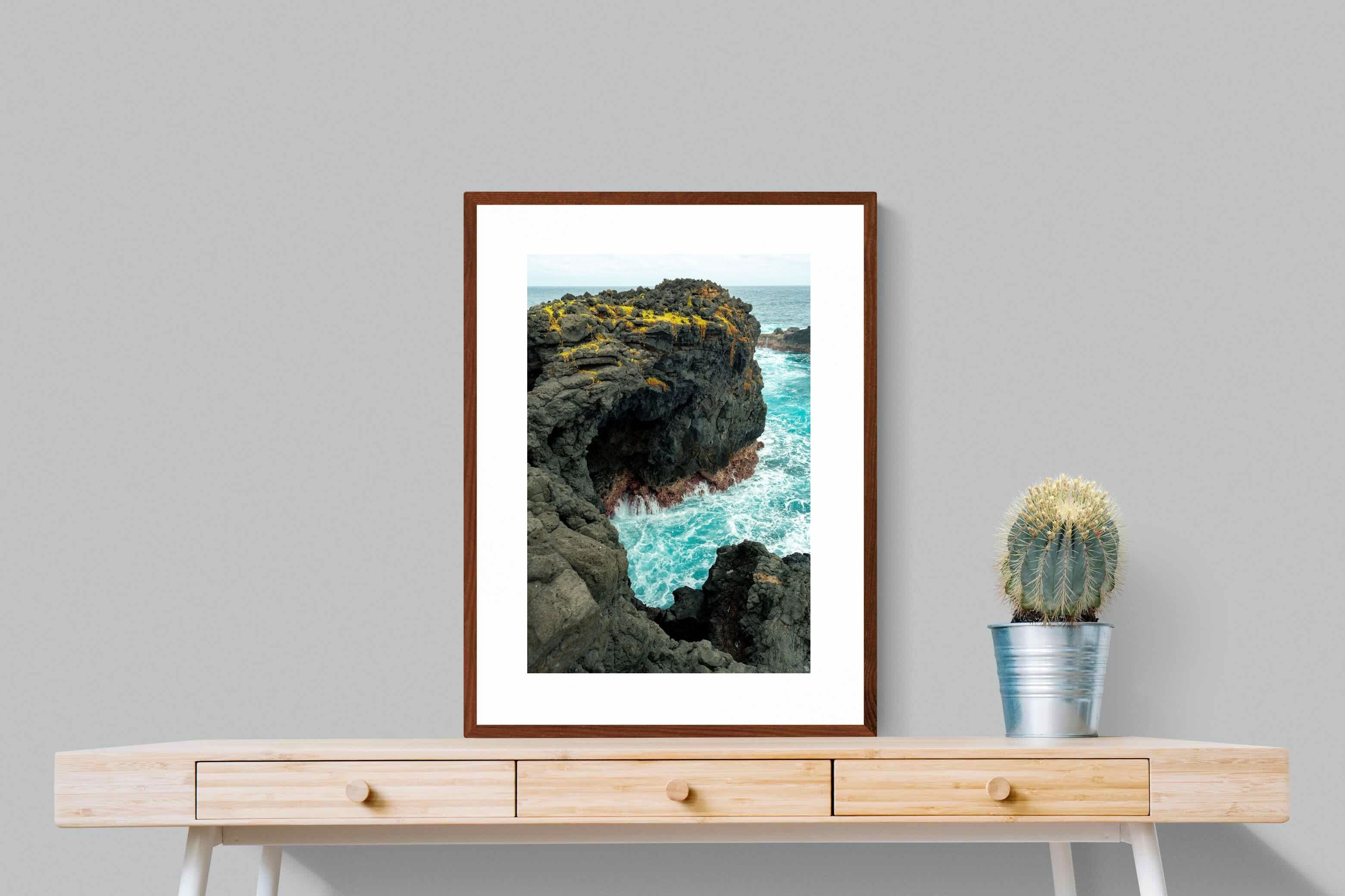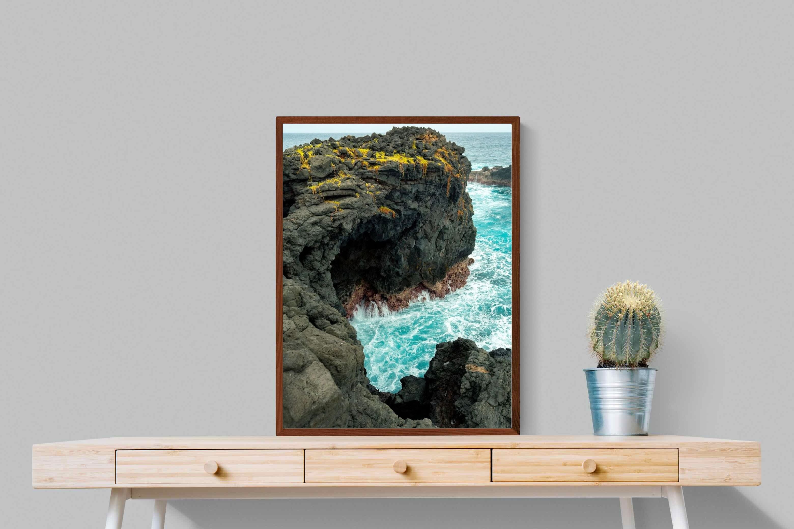 Powerful turquoise waves crash against rugged volcanic cliffs along the wild coastline of São Tomé and Príncipe. Dark rock formations rise sharply above the Atlantic while bright coastal vegetation clings to the stone, adding vivid contrast to the scene. The photograph captures the raw beauty and geological drama of this remote island landscape. A striking wall art piece that brings natural energy and adventurous coastal character to contemporary interiors.