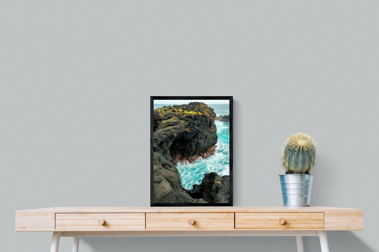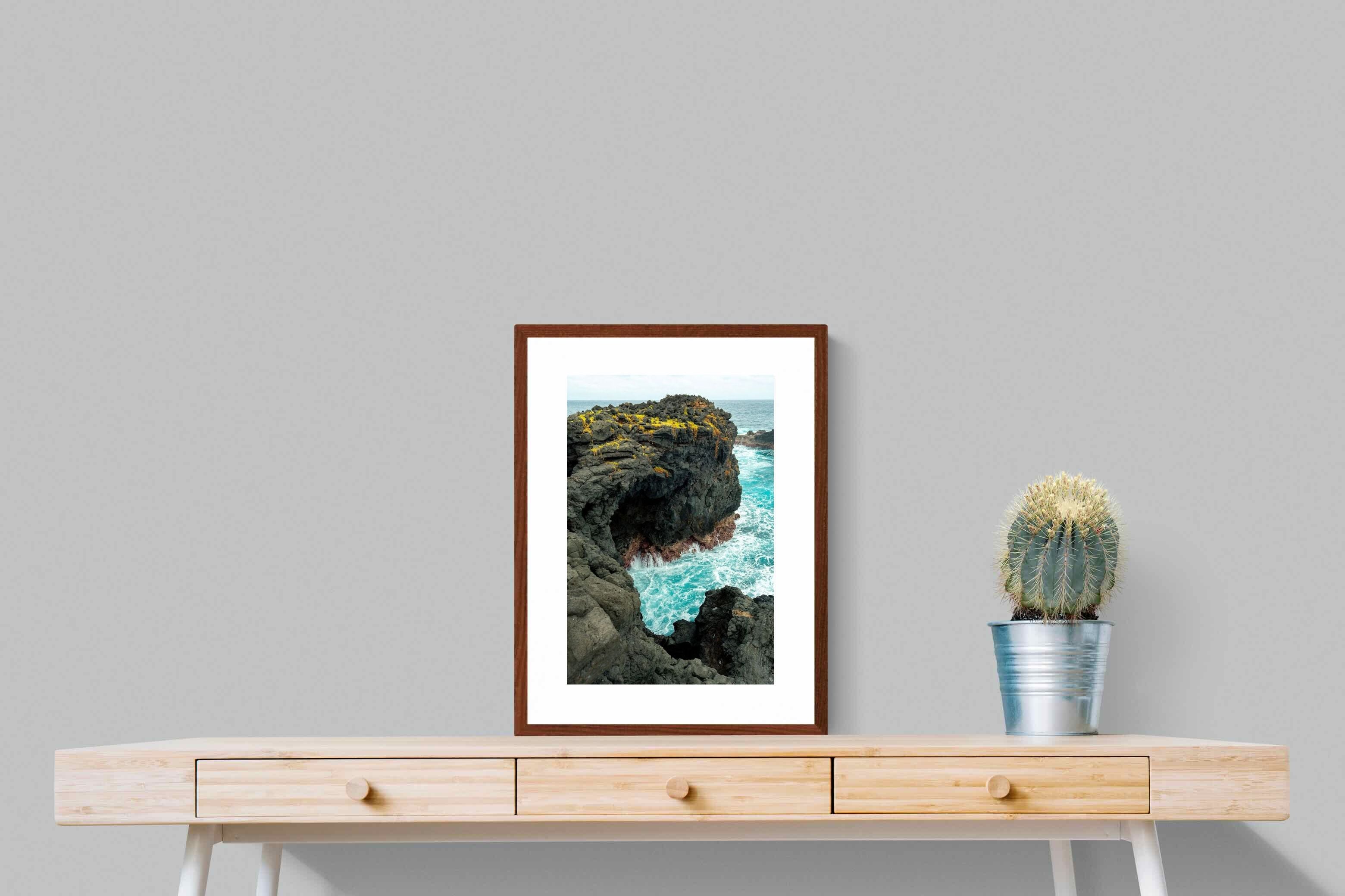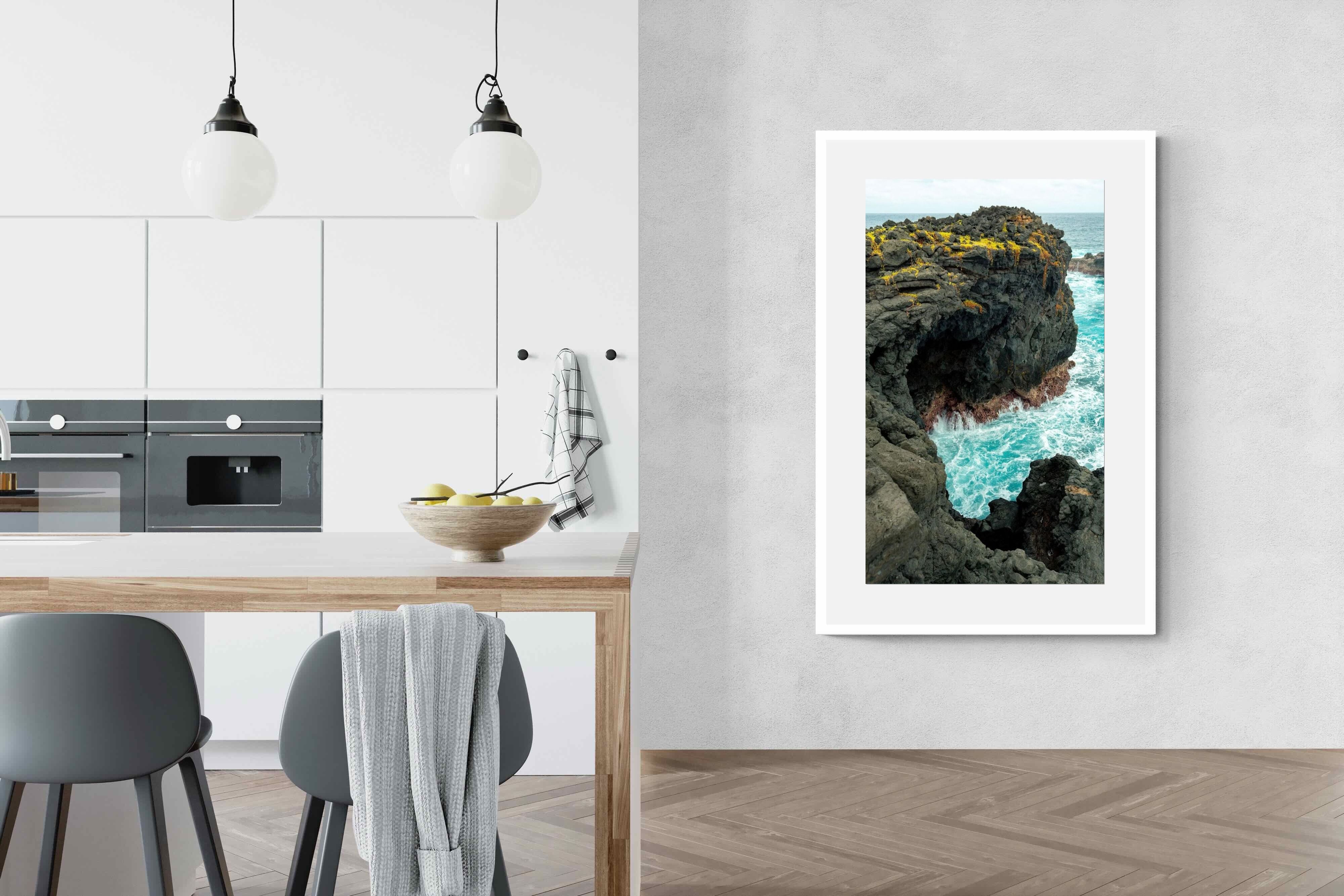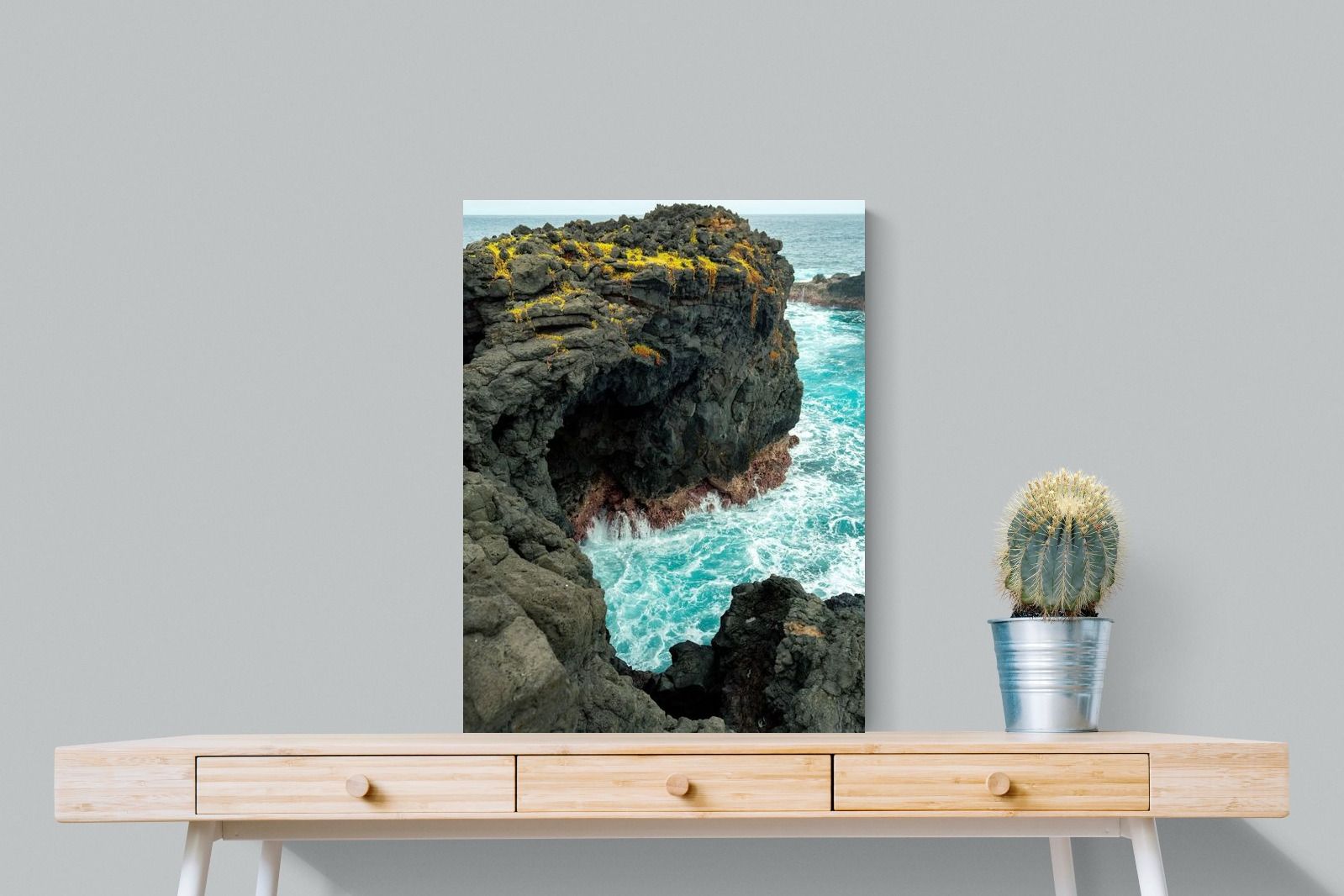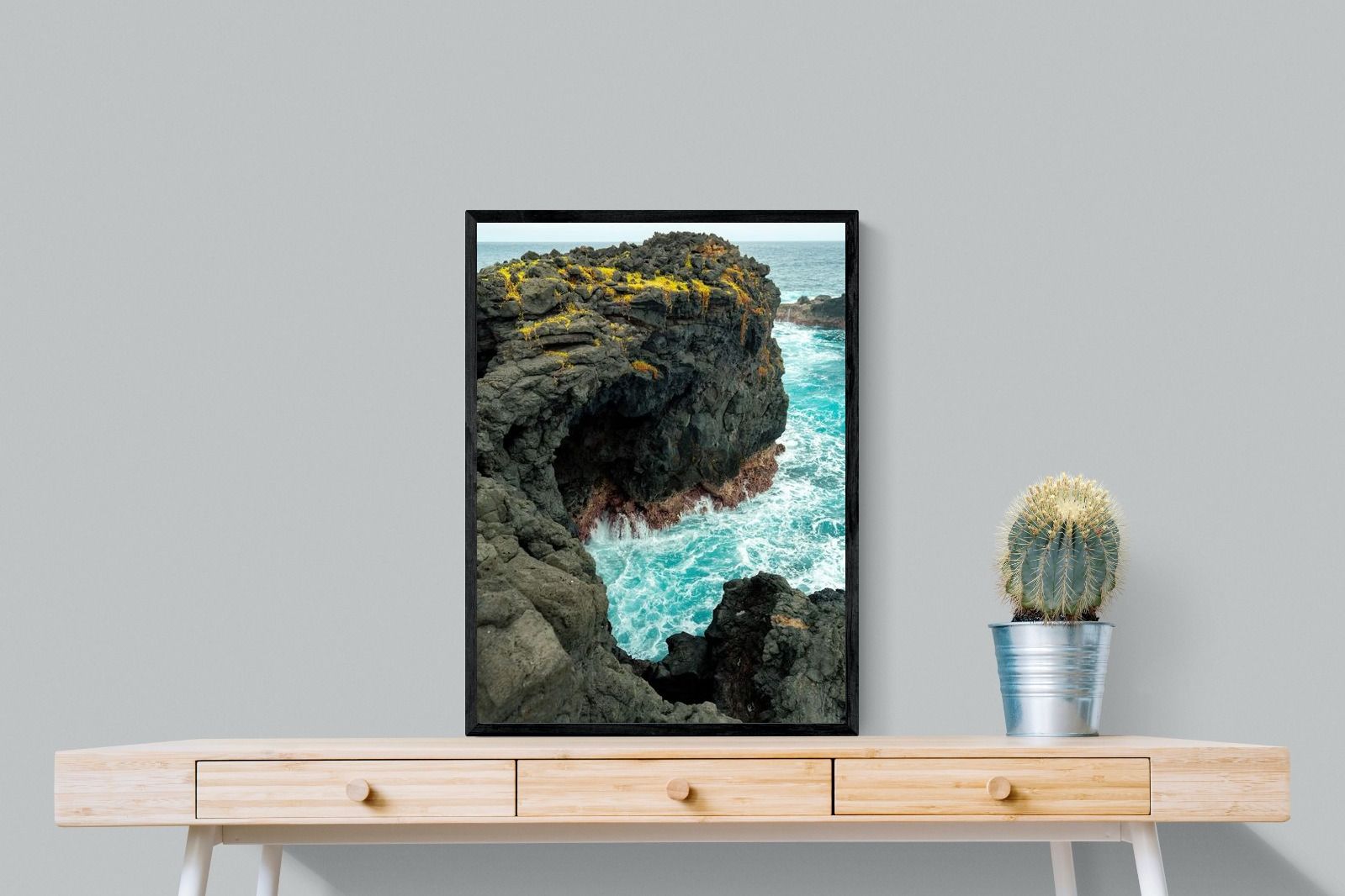 Powerful turquoise waves crash against rugged volcanic cliffs along the wild coastline of São Tomé and Príncipe. Dark rock formations rise sharply above the Atlantic while bright coastal vegetation clings to the stone, adding vivid contrast to the scene. The photograph captures the raw beauty and geological drama of this remote island landscape. A striking wall art piece that brings natural energy and adventurous coastal character to contemporary interiors.