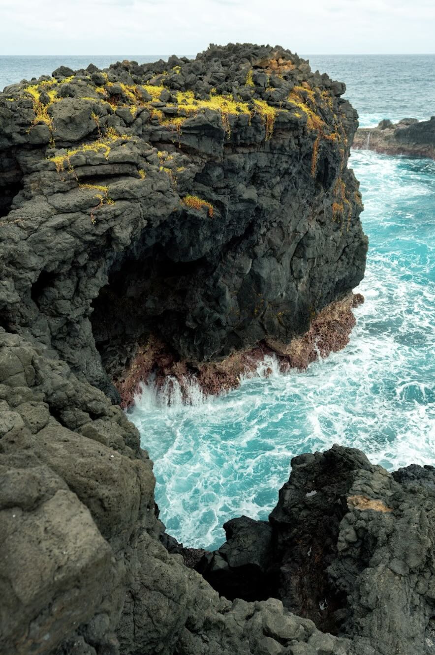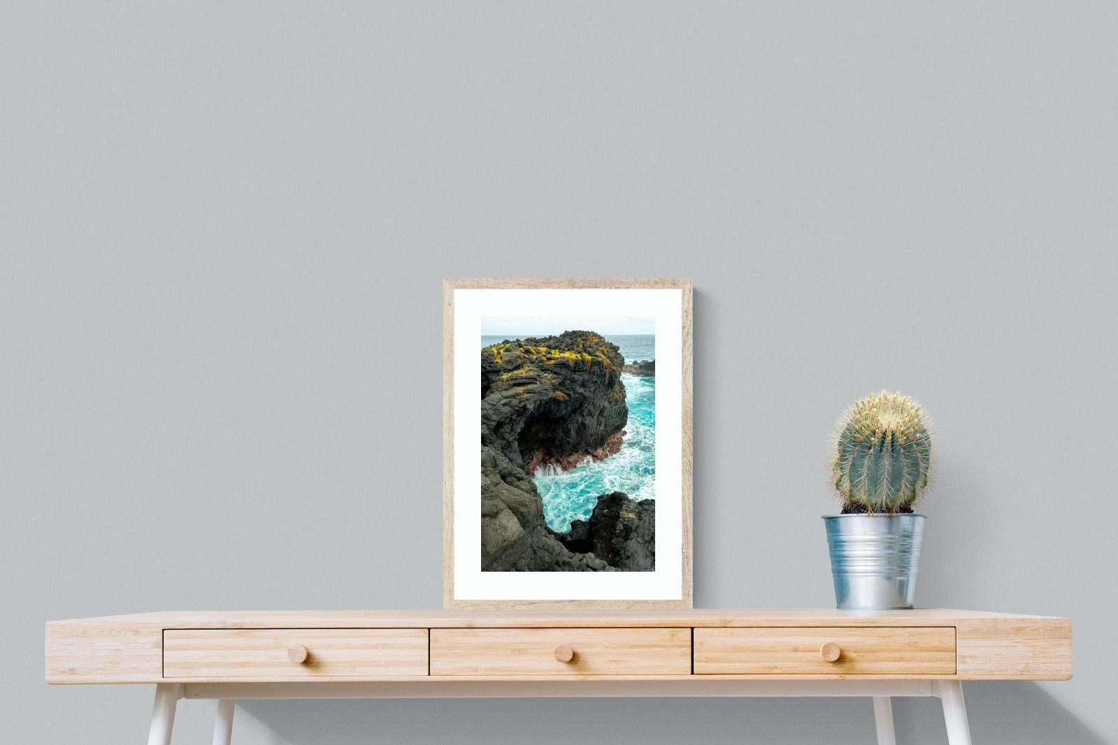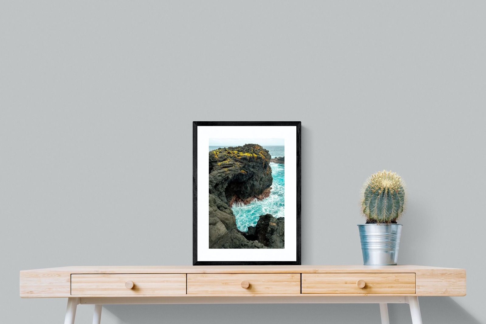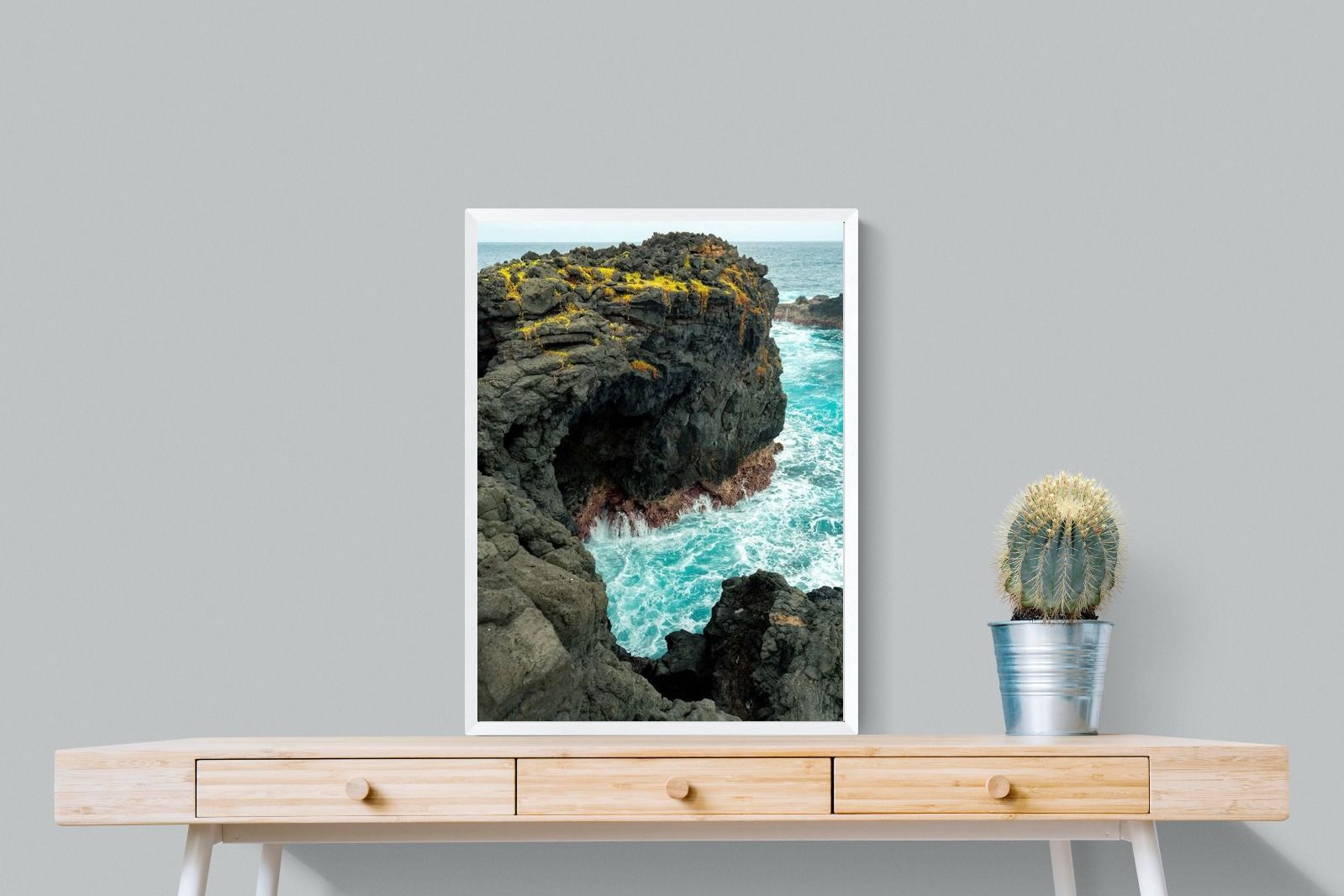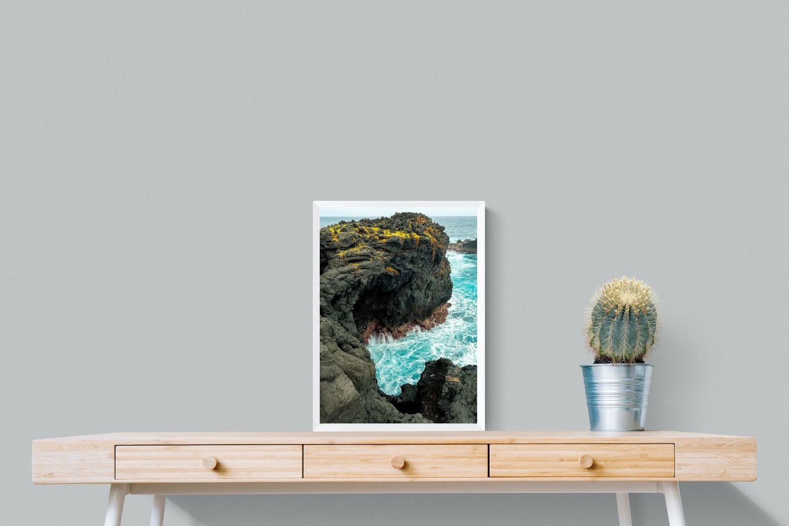 Powerful turquoise waves crash against rugged volcanic cliffs along the wild coastline of São Tomé and Príncipe. Dark rock formations rise sharply above the Atlantic while bright coastal vegetation clings to the stone, adding vivid contrast to the scene. The photograph captures the raw beauty and geological drama of this remote island landscape. A striking wall art piece that brings natural energy and adventurous coastal character to contemporary interiors.