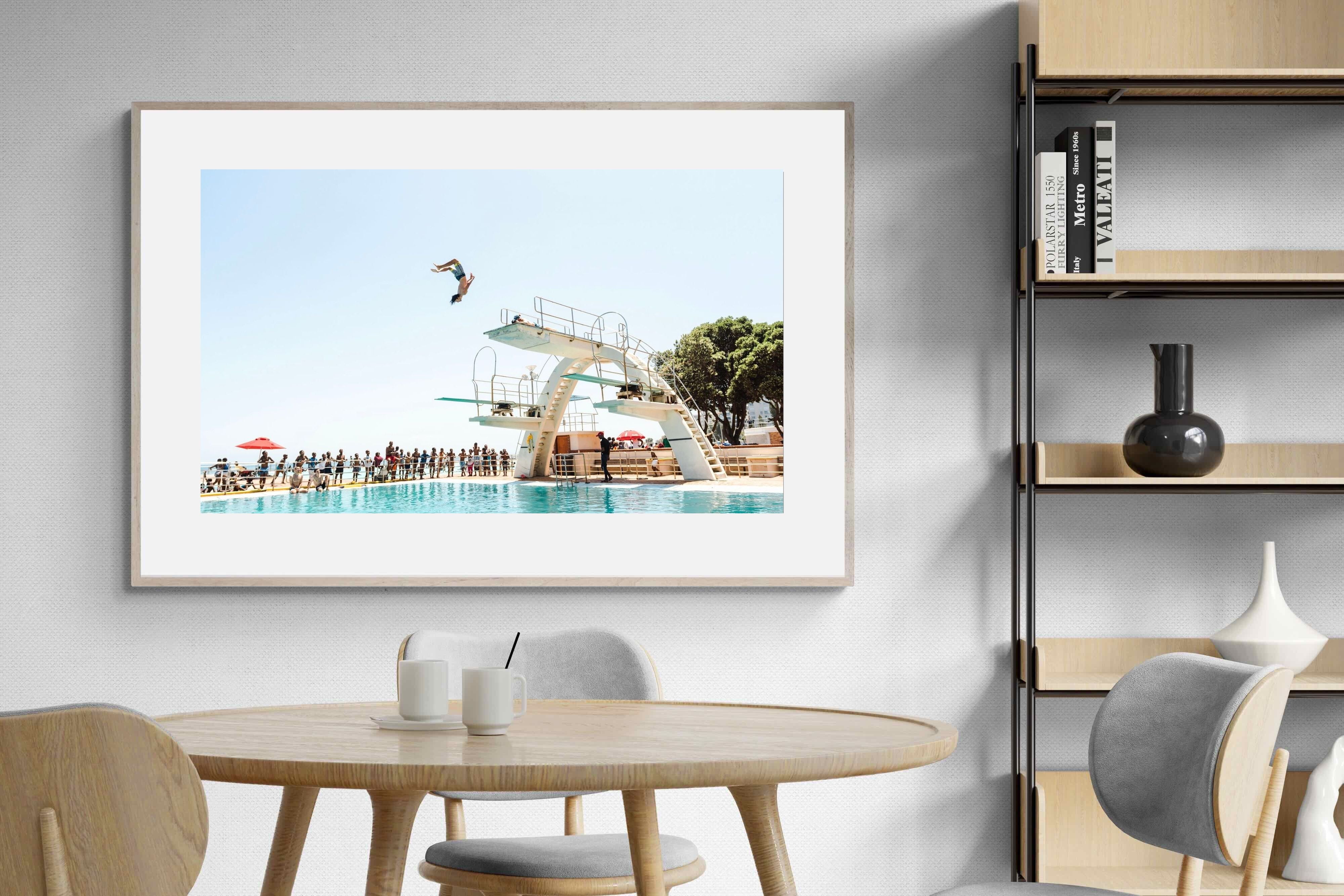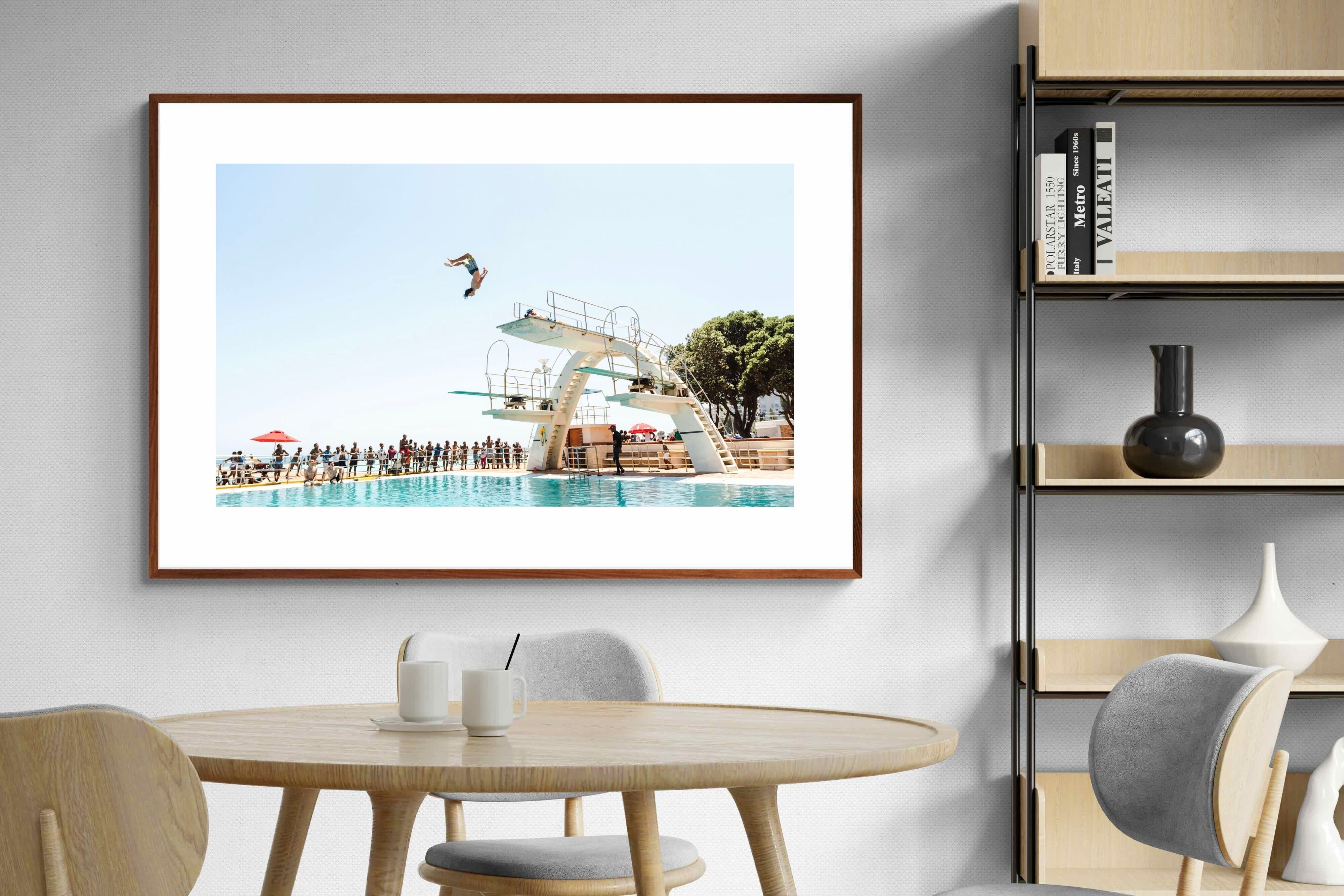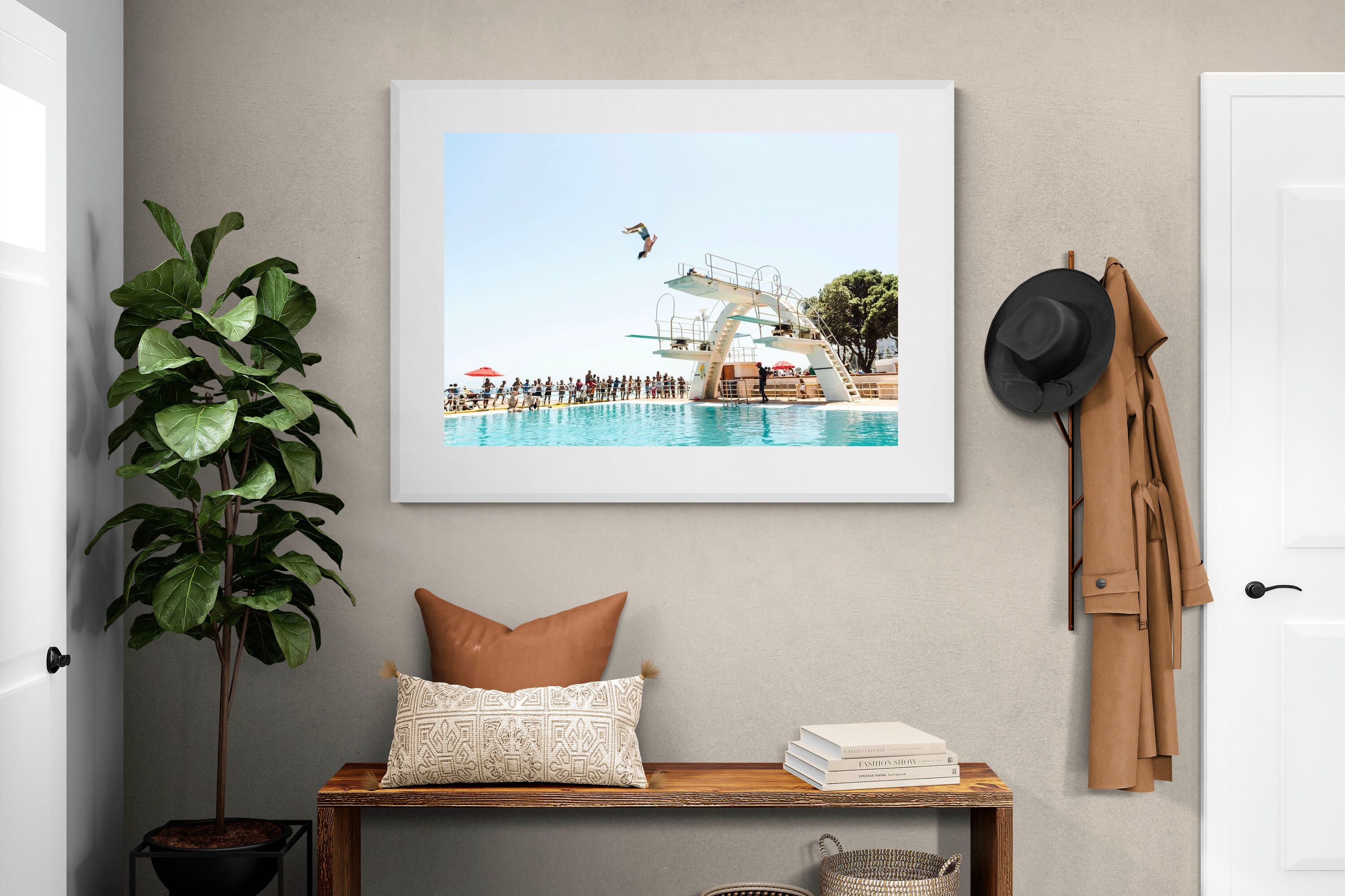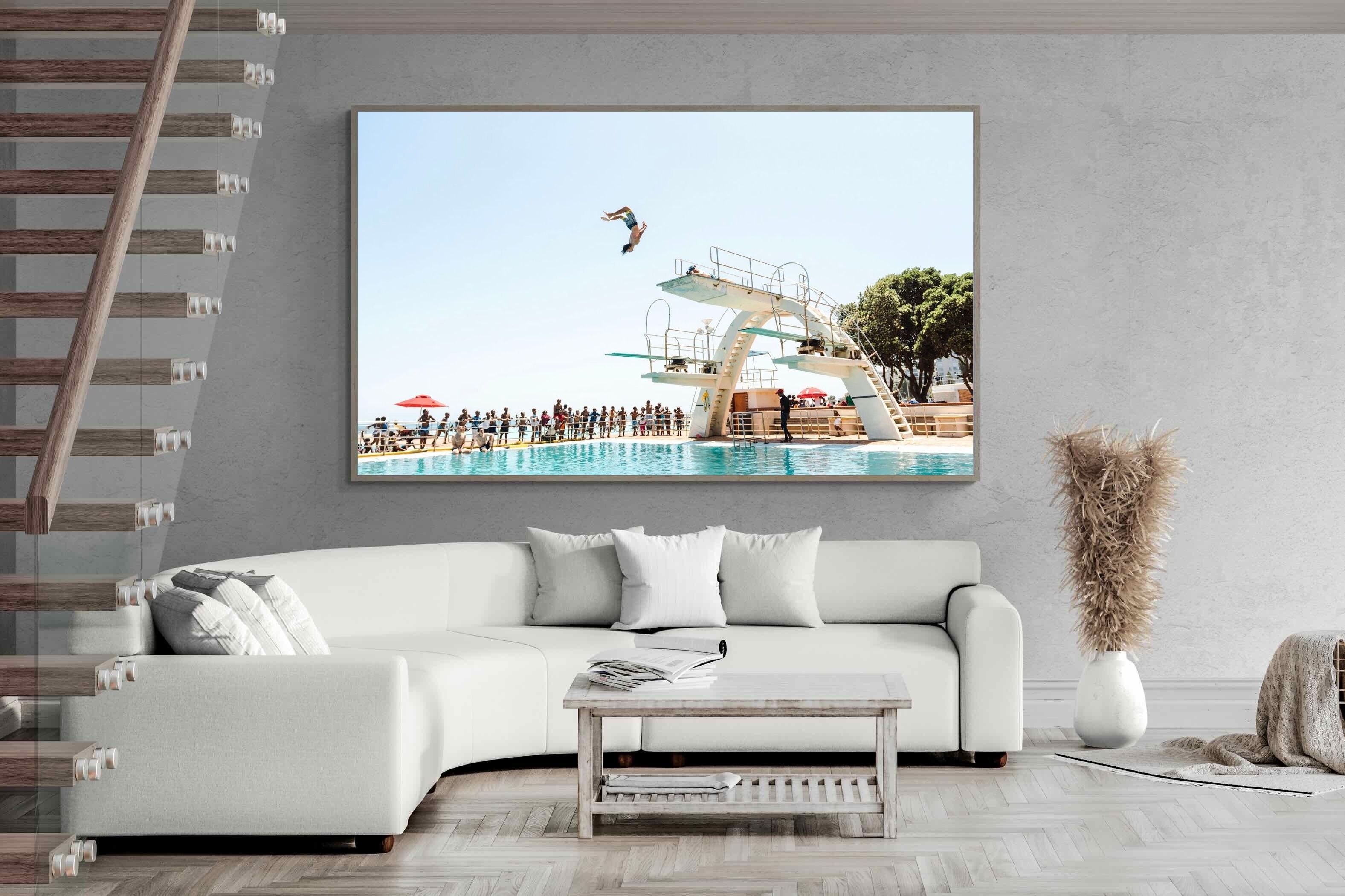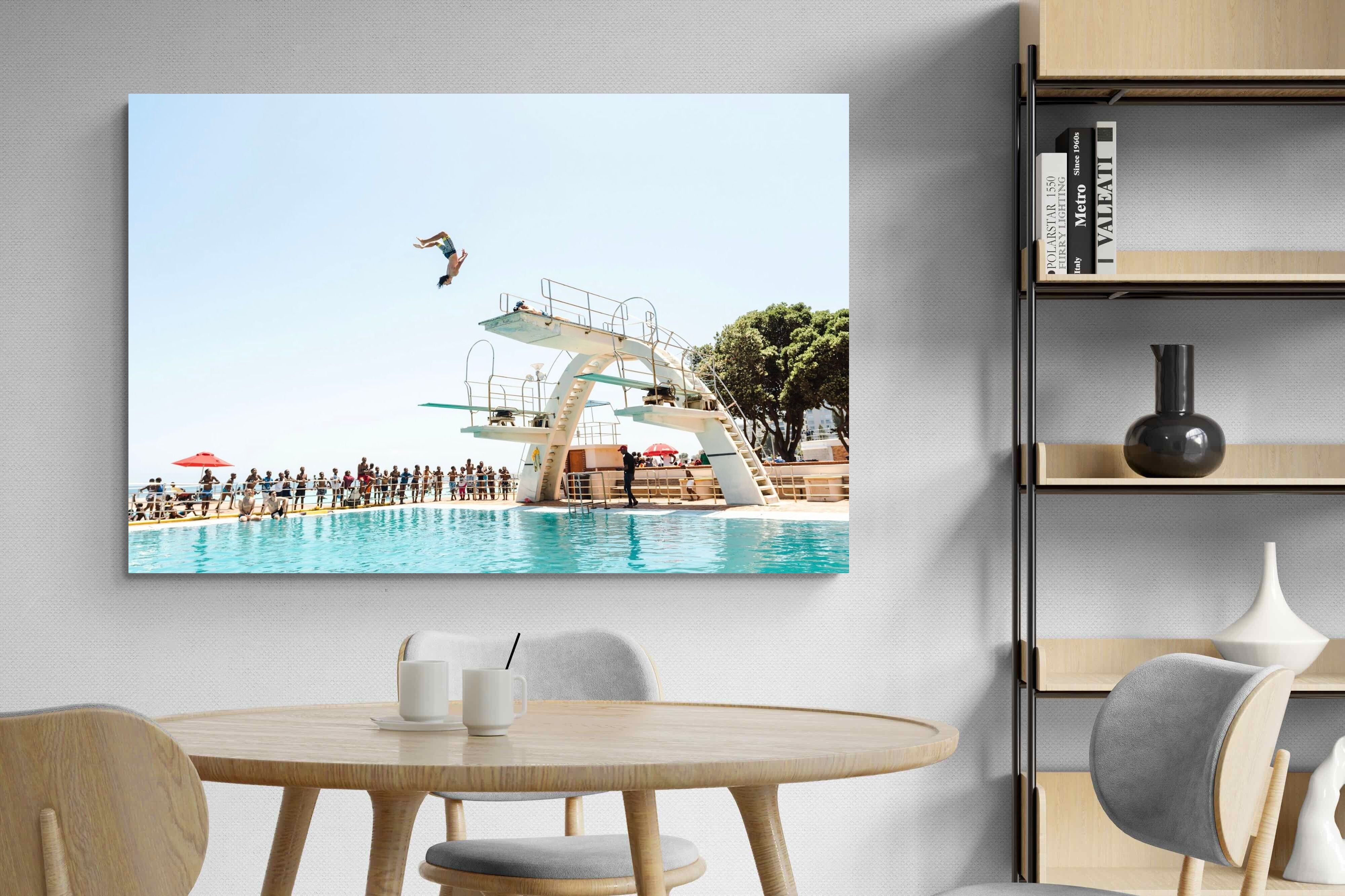Captured at the Sea Point Pavilion in Cape Town, this vibrant summer scene freezes a diver mid-air above turquoise water. The geometric diving boards and gathered spectators add structure and energy to the composition. Clear skies and crisp light create a fresh, contemporary aesthetic. Perfect for modern homes and lively interiors, this artwork celebrates movement, youth and the unmistakable atmosphere of a Cape Town seaside afternoon.