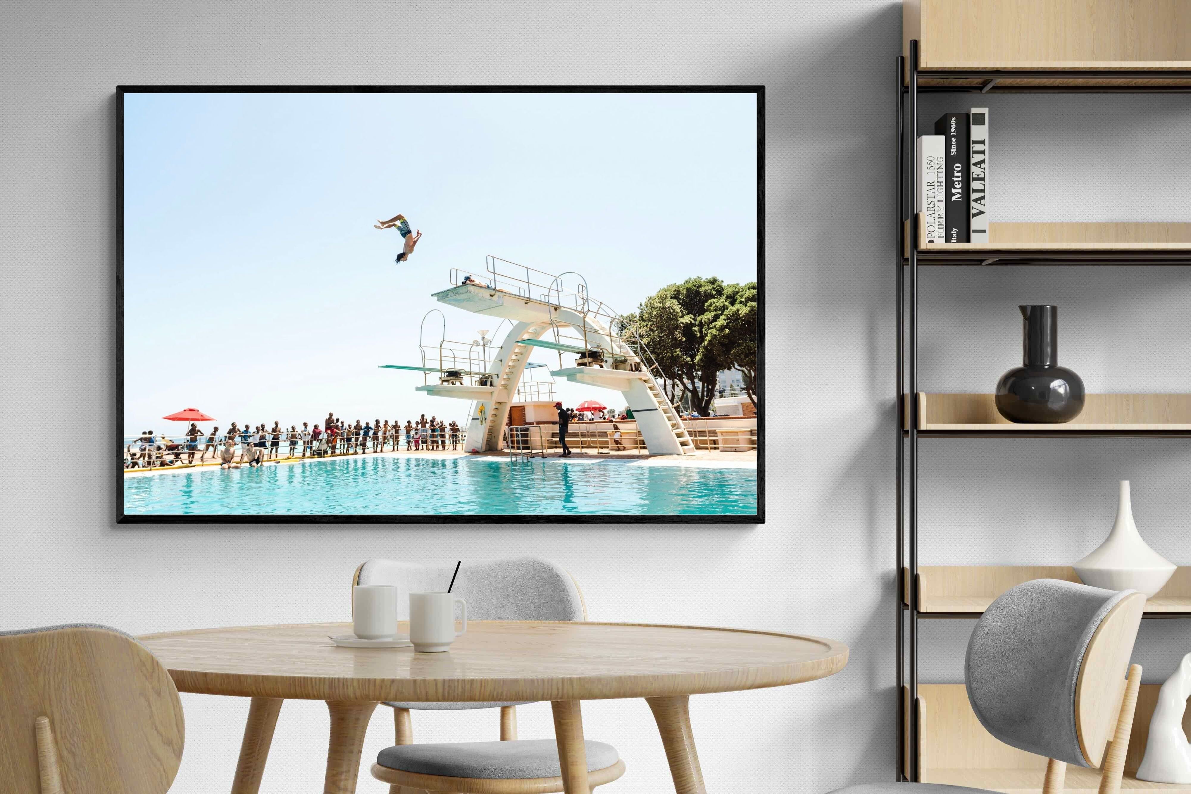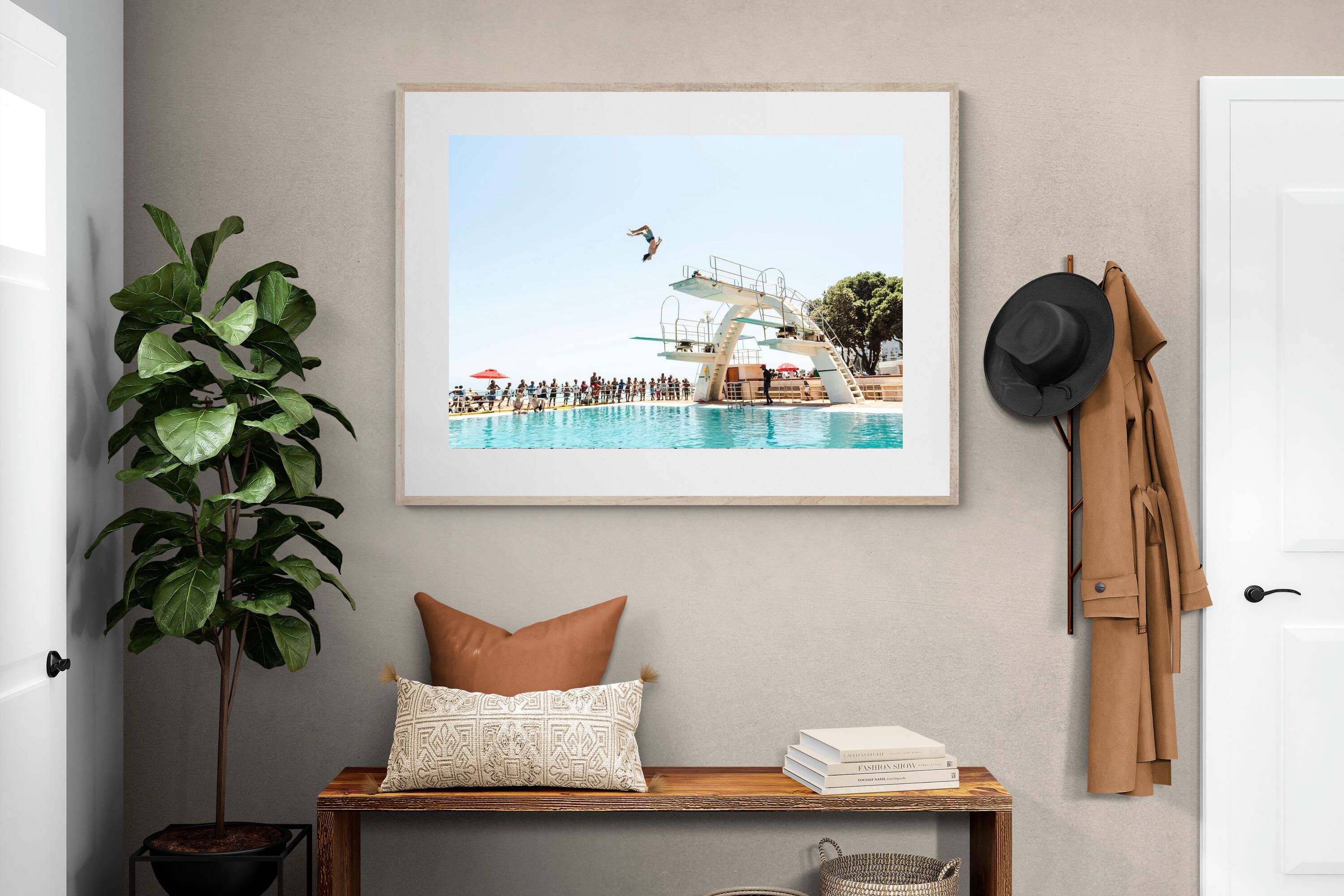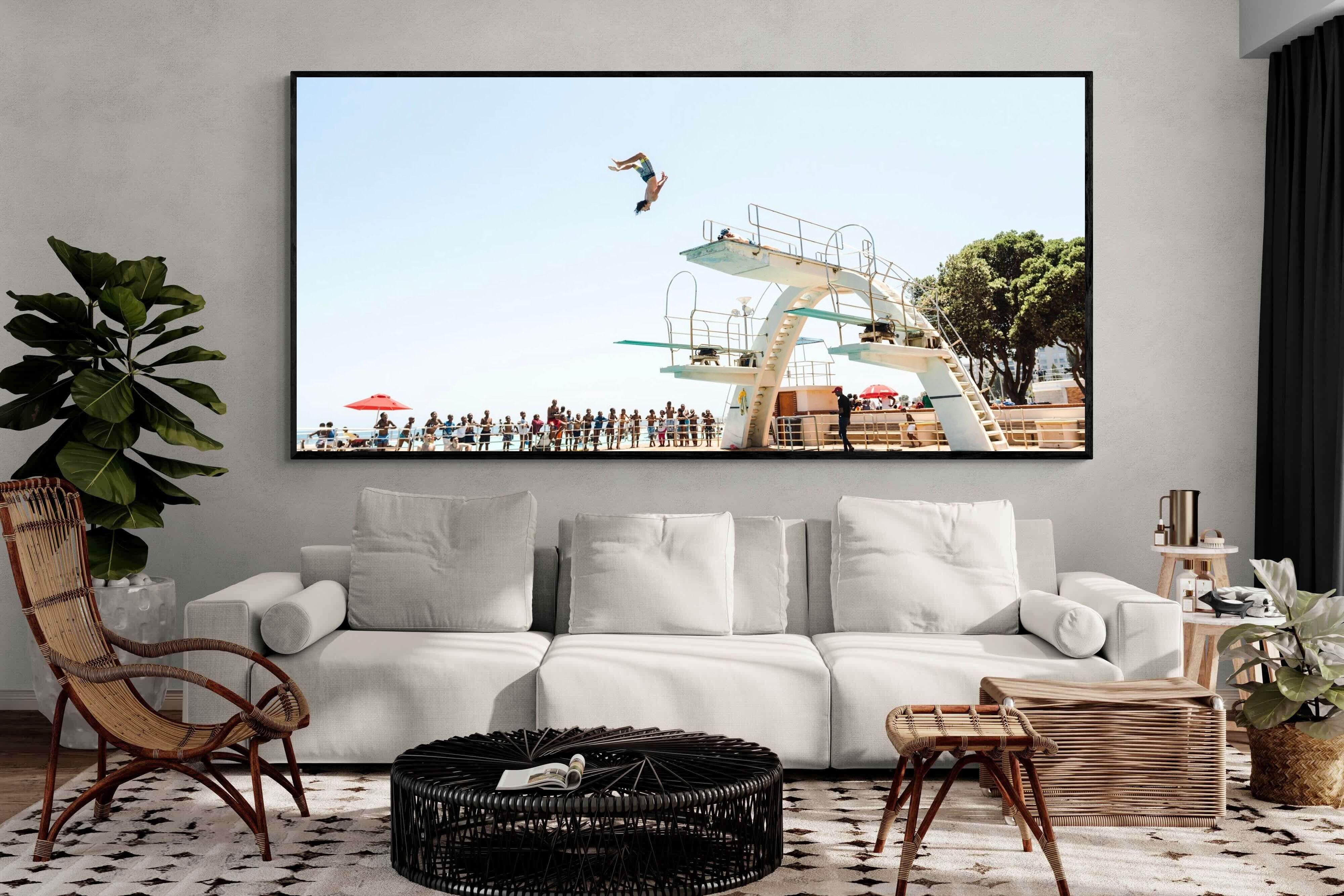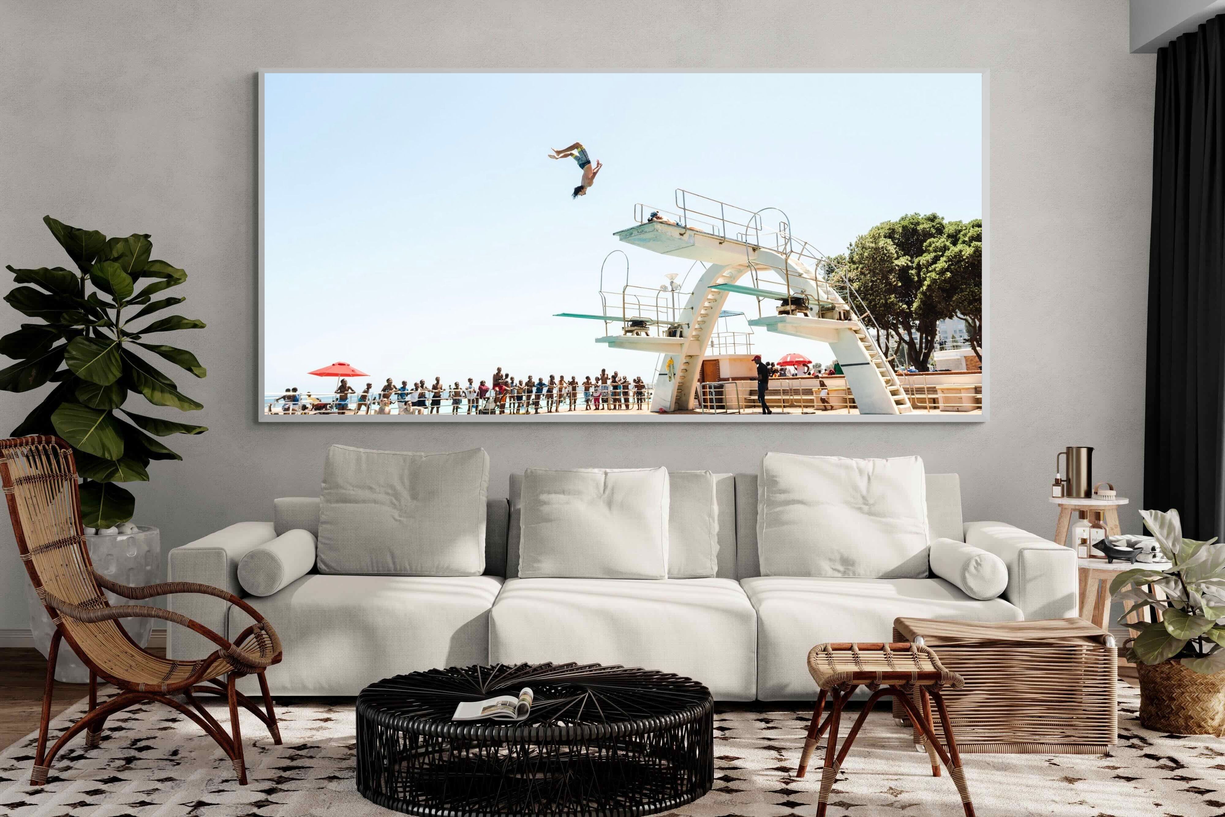 Captured at the Sea Point Pavilion in Cape Town, this vibrant summer scene freezes a diver mid-air above turquoise water. The geometric diving boards and gathered spectators add structure and energy to the composition. Clear skies and crisp light create a fresh, contemporary aesthetic. Perfect for modern homes and lively interiors, this artwork celebrates movement, youth and the unmistakable atmosphere of a Cape Town seaside afternoon.