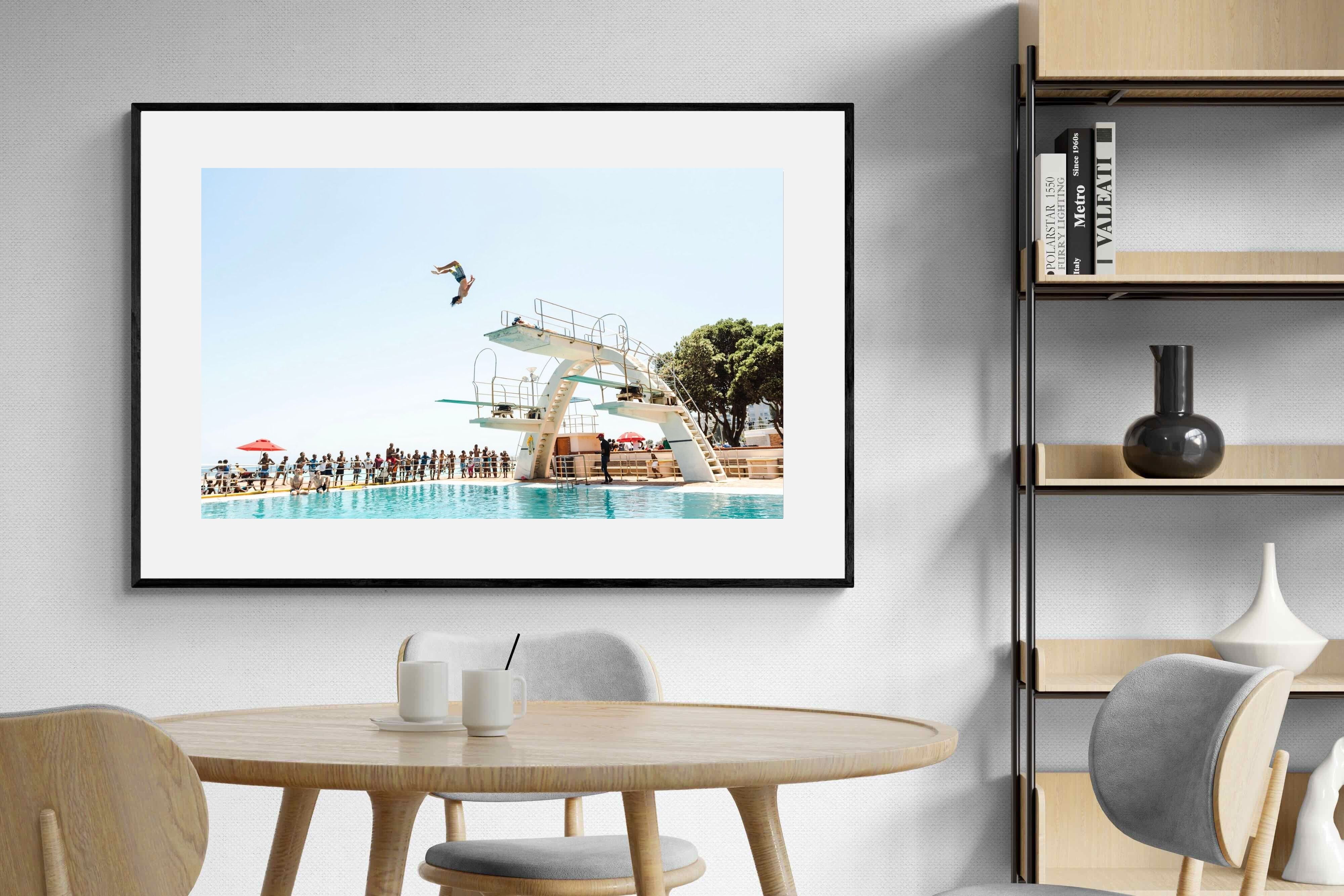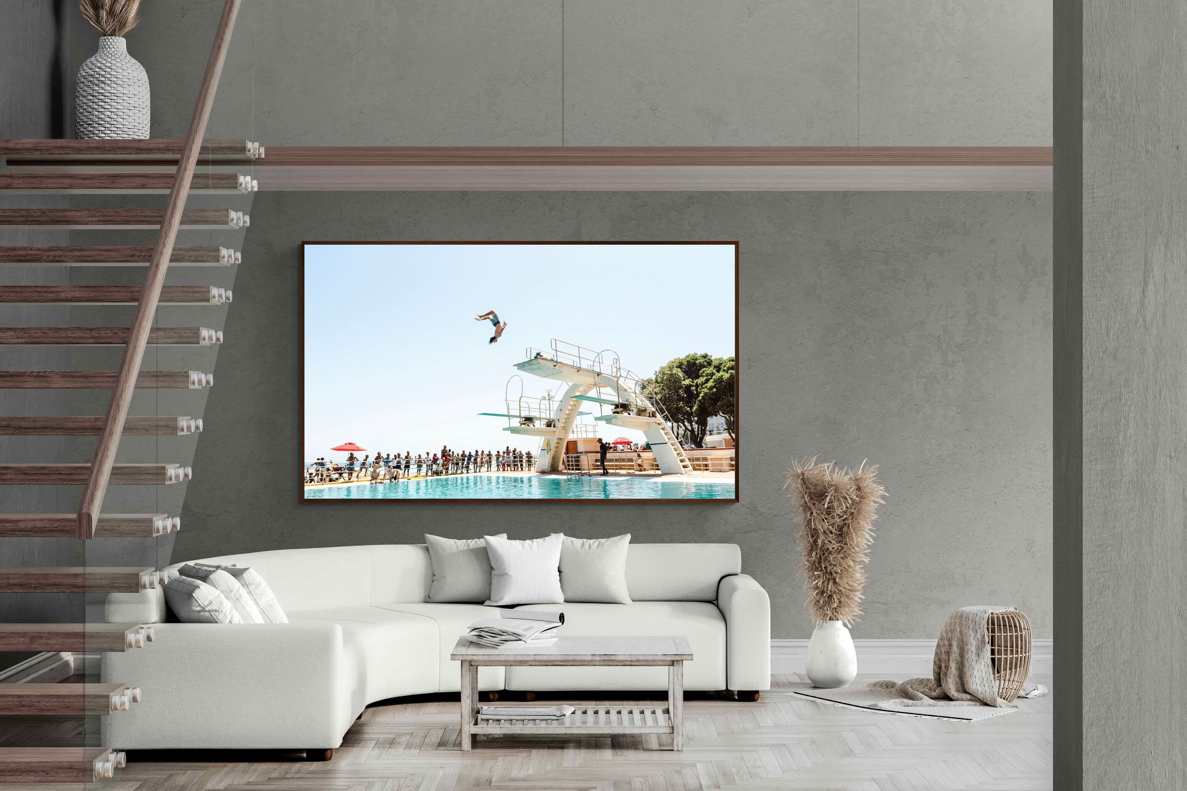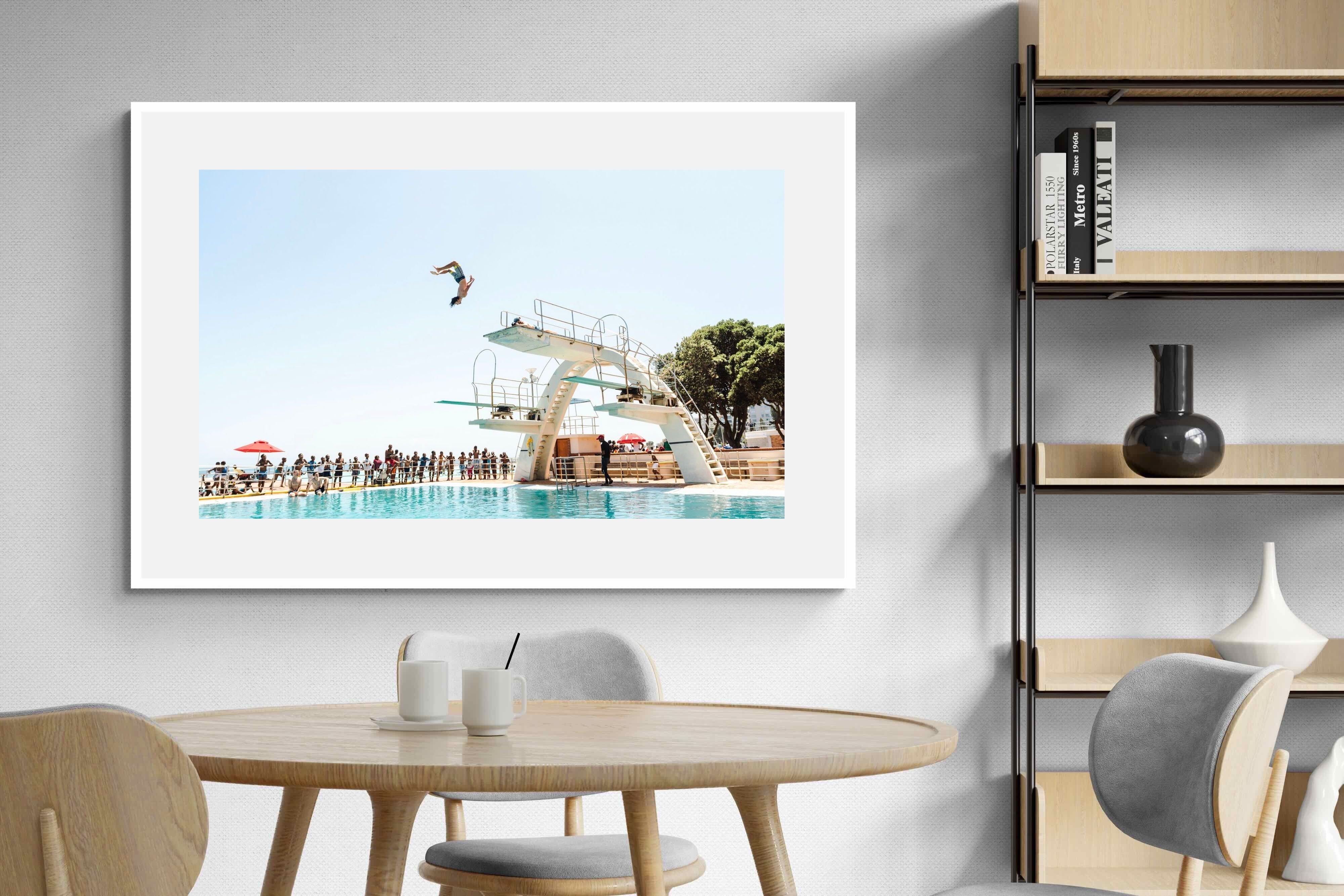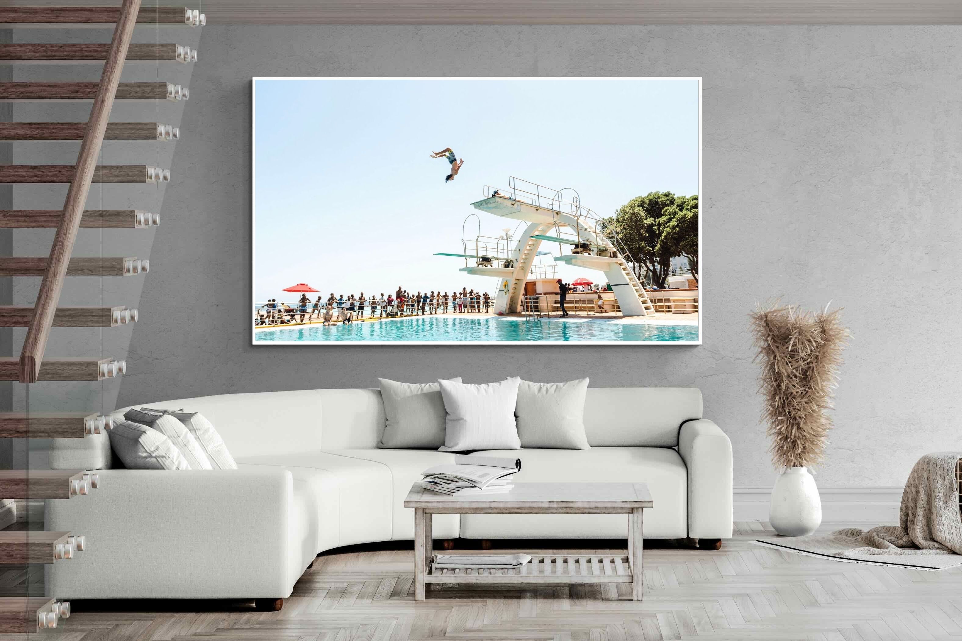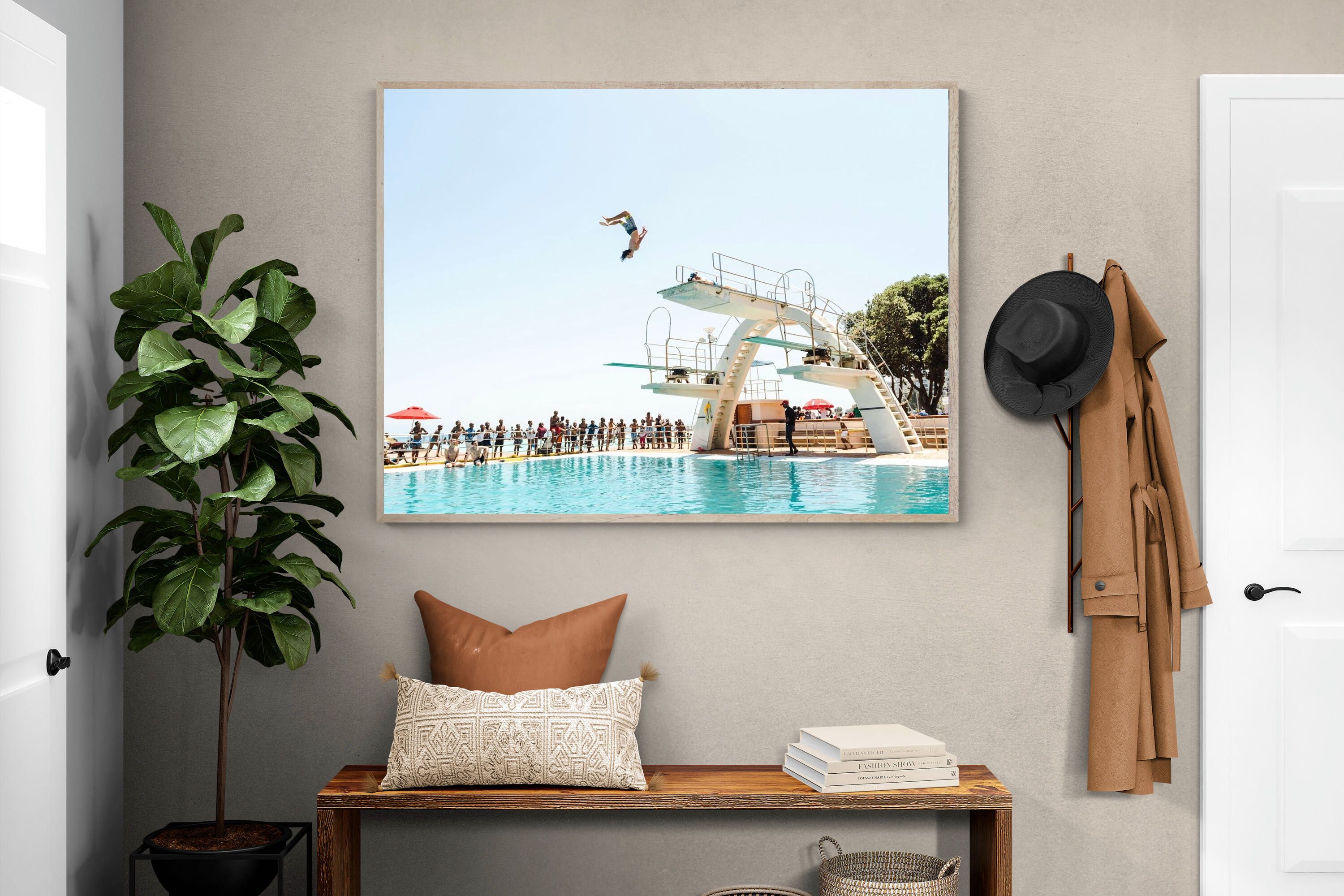 Captured at the Sea Point Pavilion in Cape Town, this vibrant summer scene freezes a diver mid-air above turquoise water. The geometric diving boards and gathered spectators add structure and energy to the composition. Clear skies and crisp light create a fresh, contemporary aesthetic. Perfect for modern homes and lively interiors, this artwork celebrates movement, youth and the unmistakable atmosphere of a Cape Town seaside afternoon.