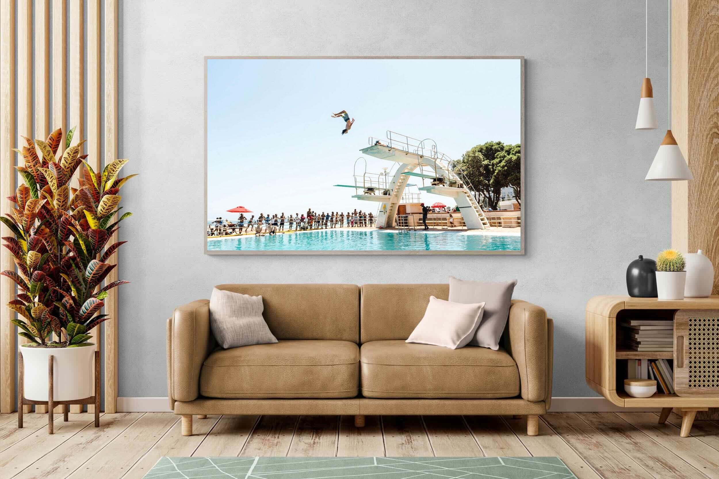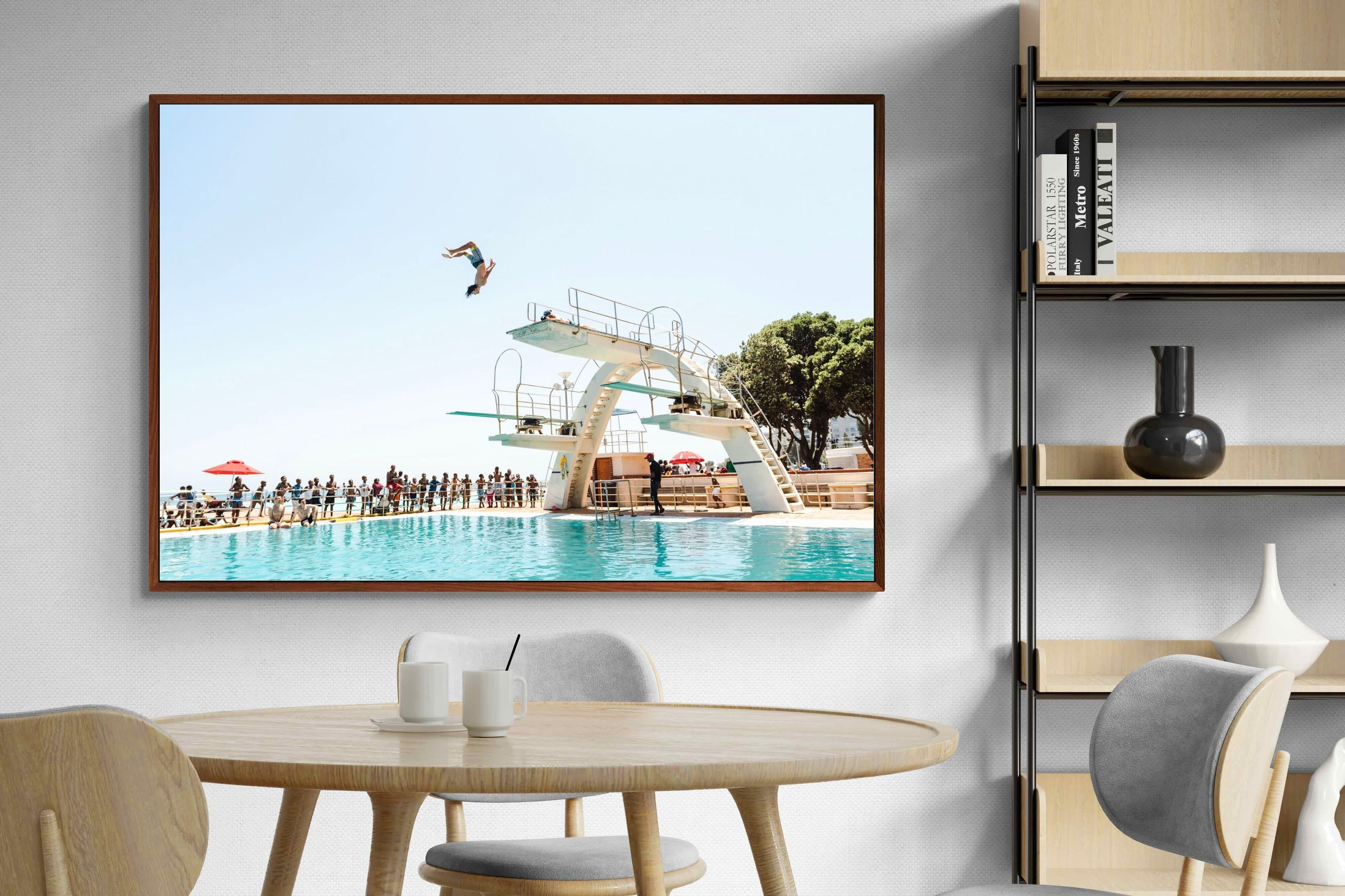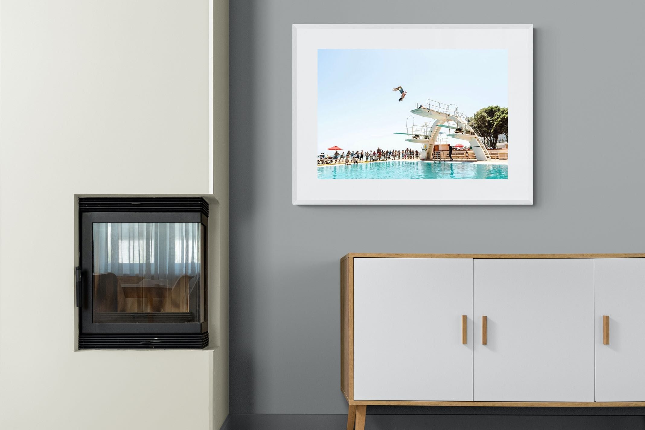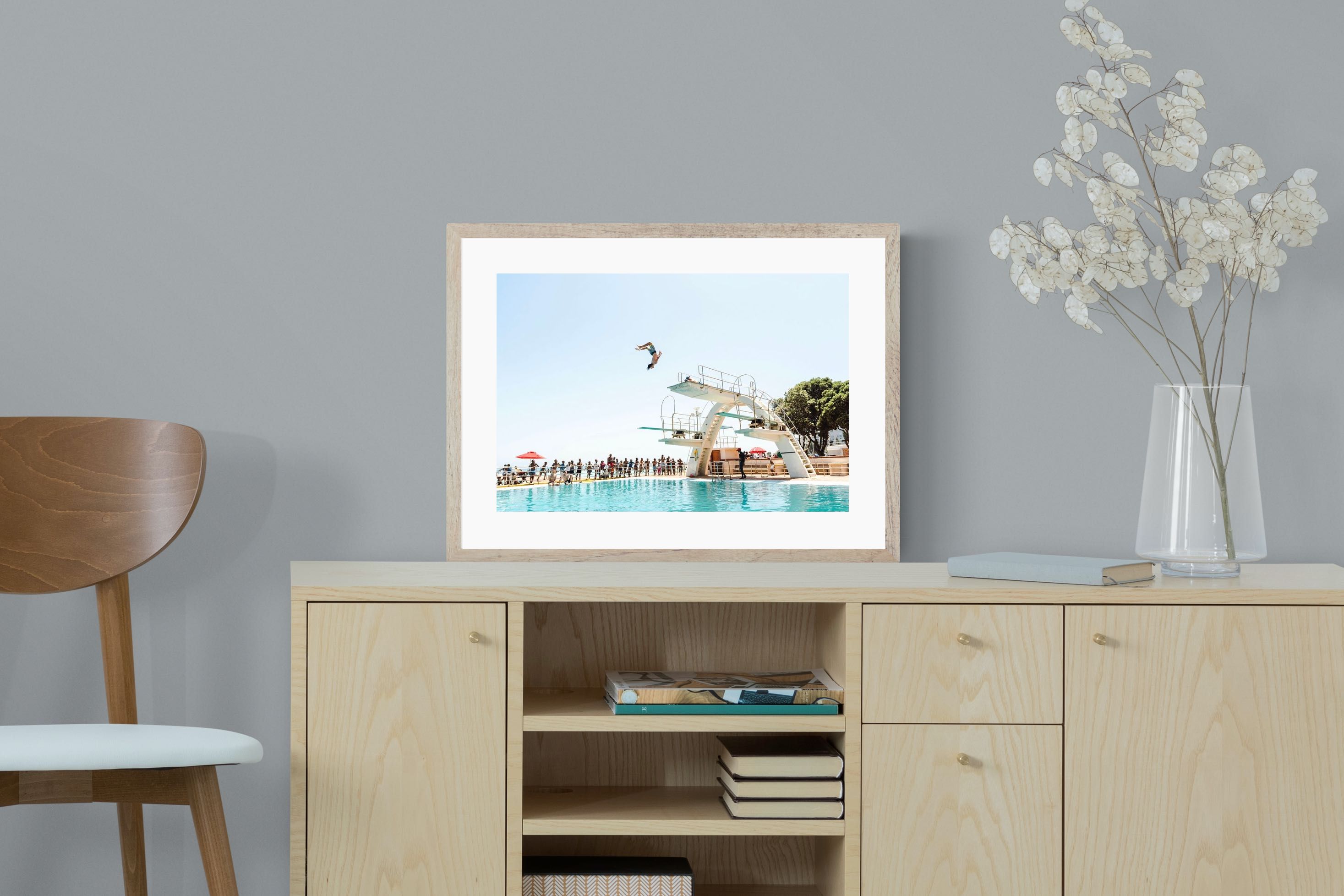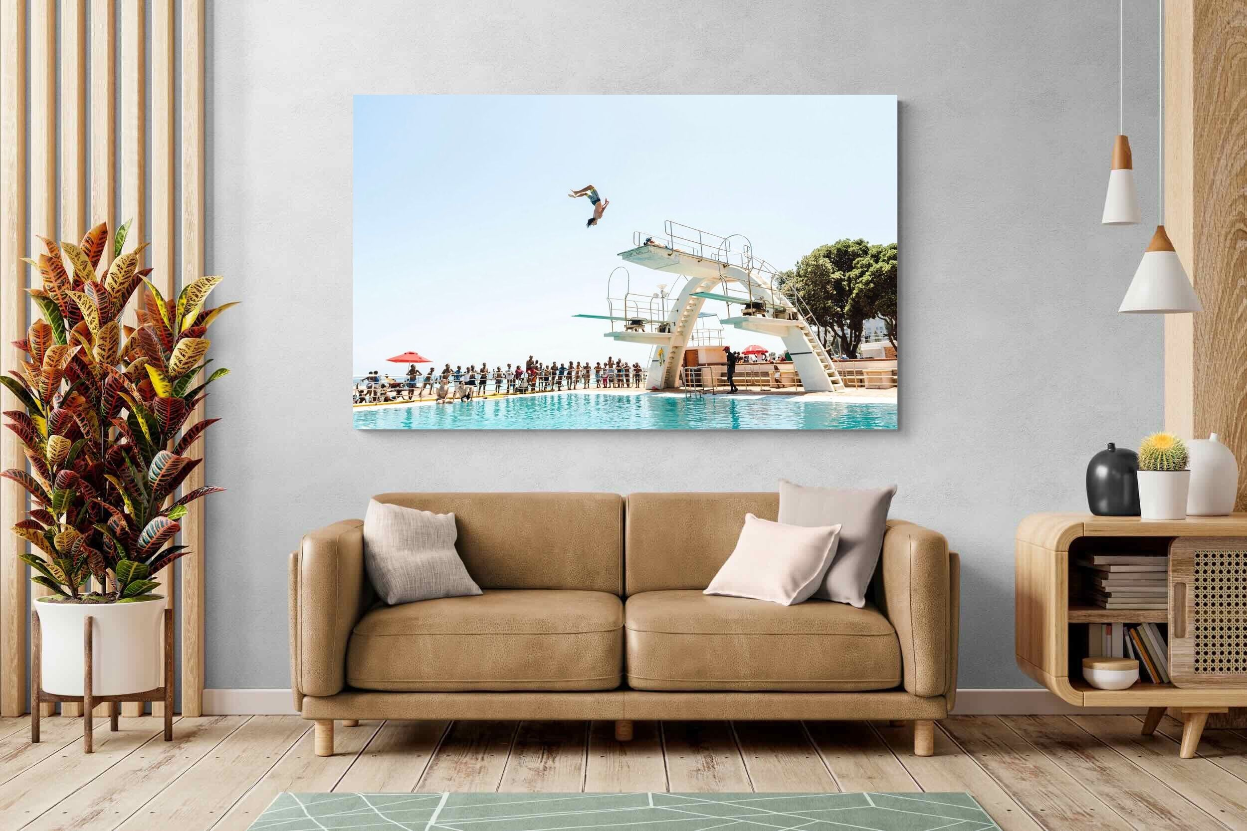 Captured at the Sea Point Pavilion in Cape Town, this vibrant summer scene freezes a diver mid-air above turquoise water. The geometric diving boards and gathered spectators add structure and energy to the composition. Clear skies and crisp light create a fresh, contemporary aesthetic. Perfect for modern homes and lively interiors, this artwork celebrates movement, youth and the unmistakable atmosphere of a Cape Town seaside afternoon.