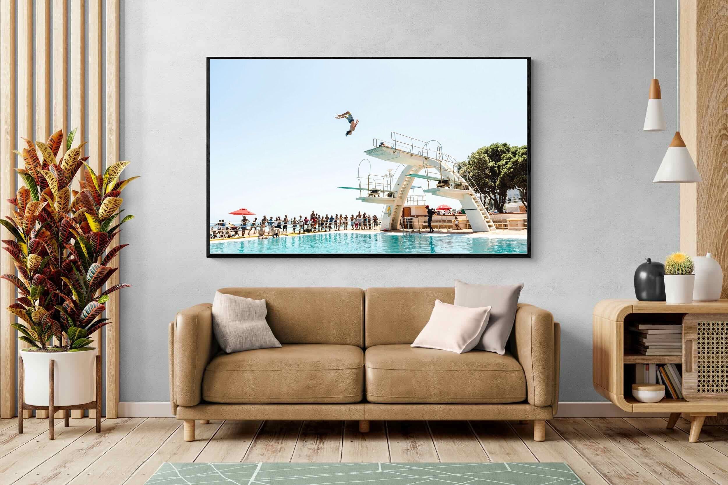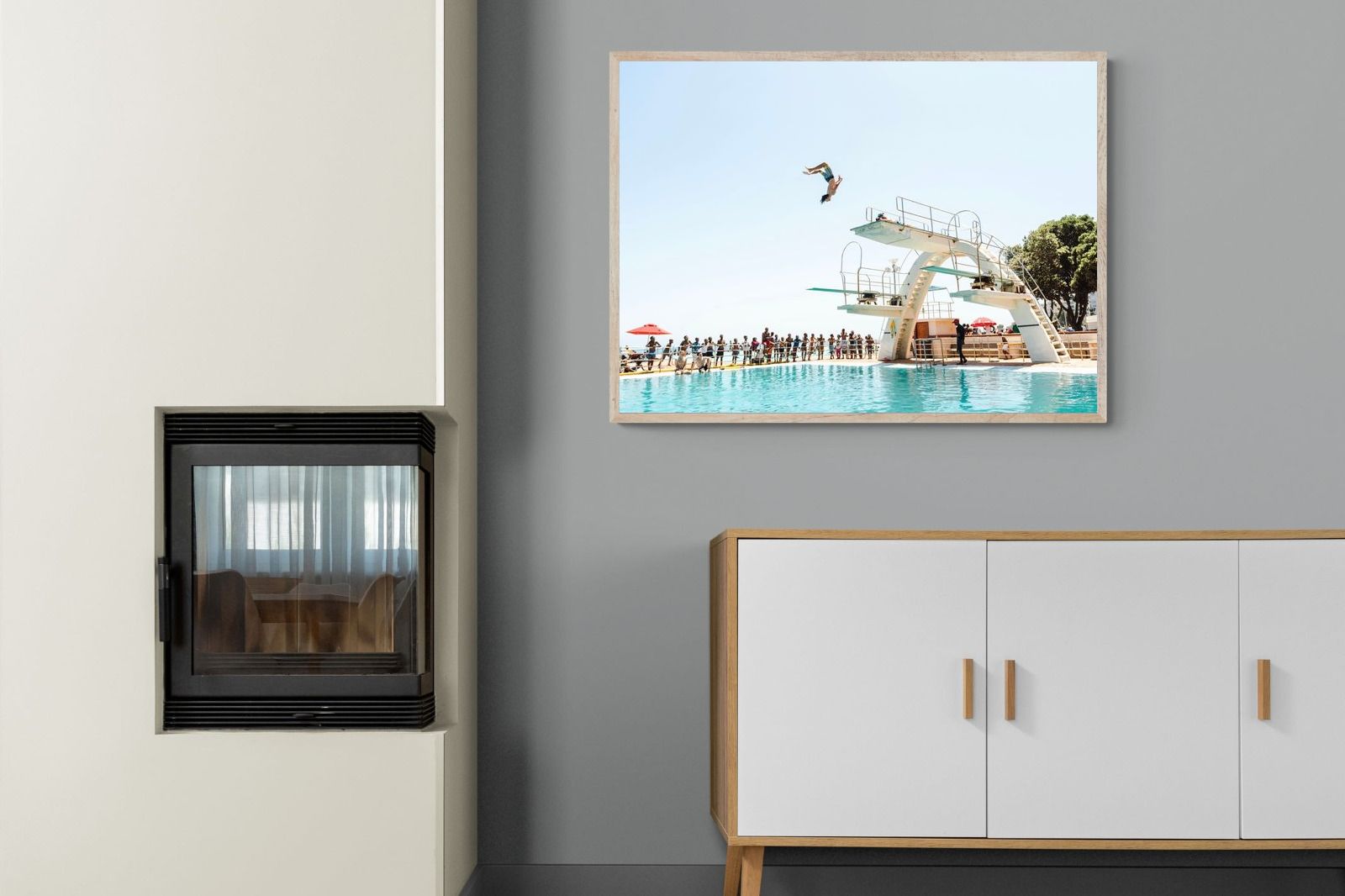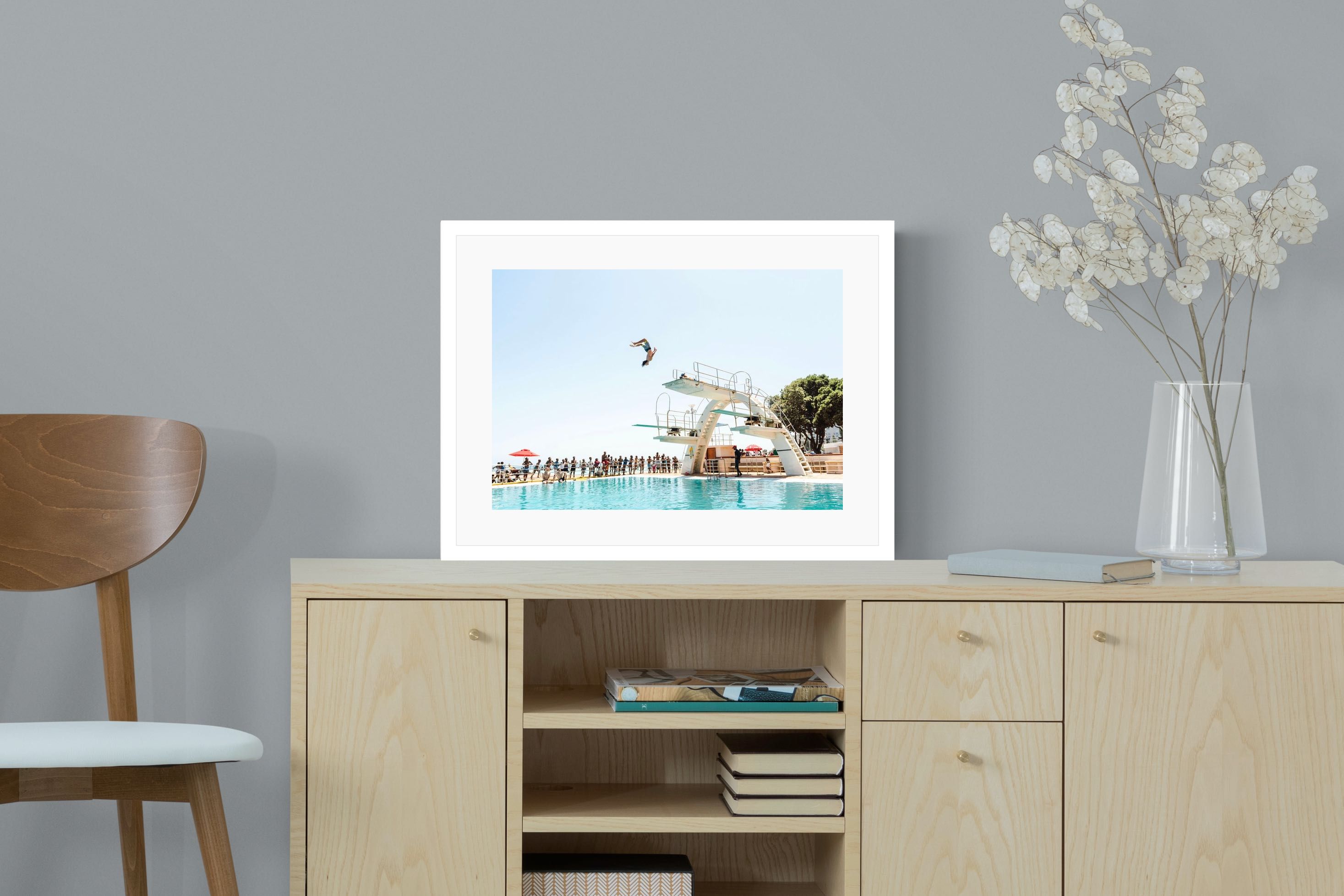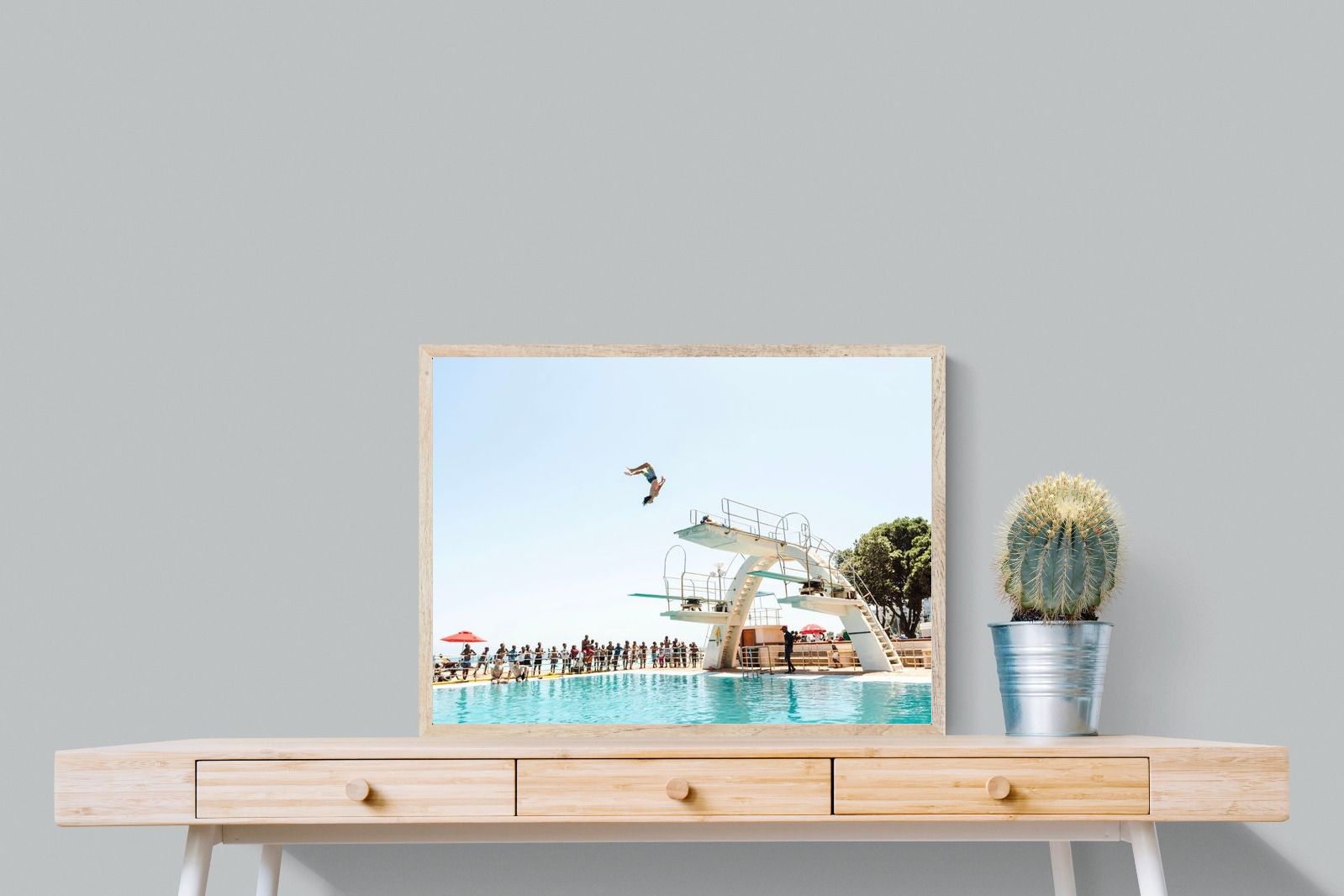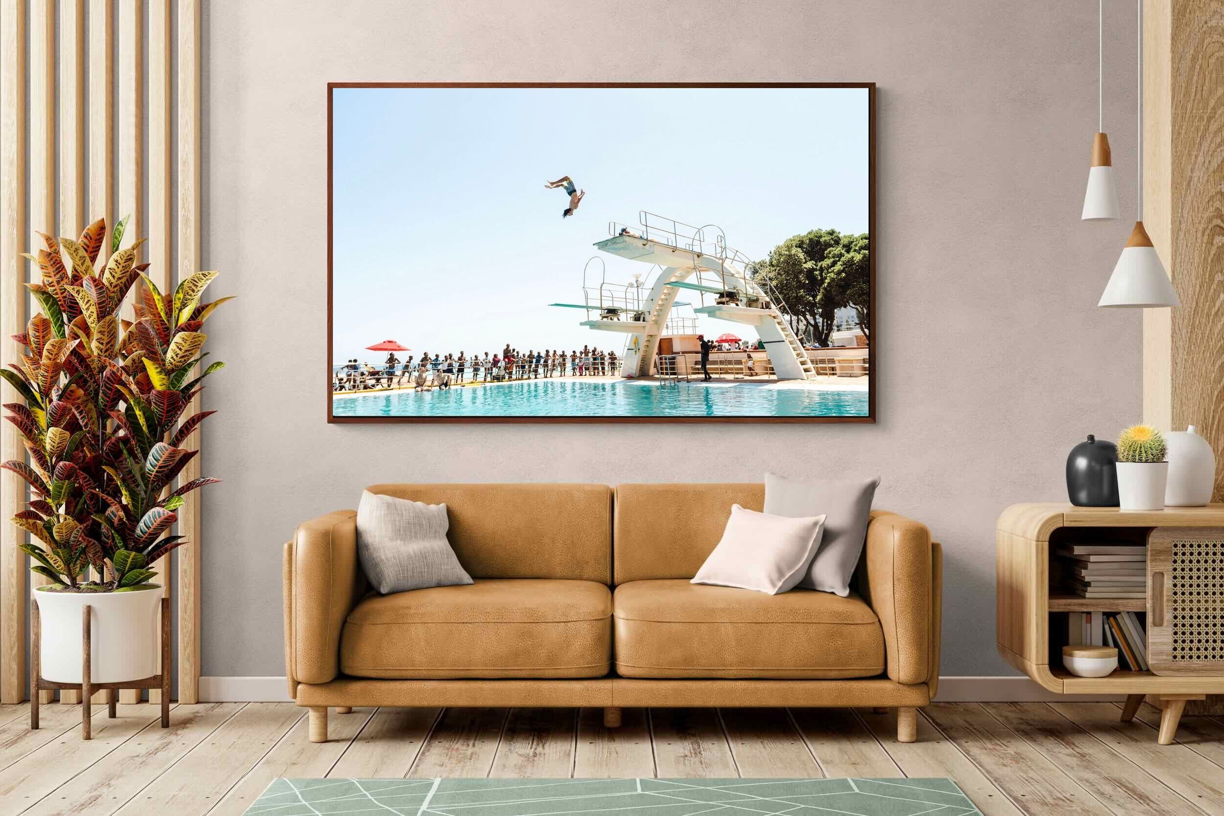 Captured at the Sea Point Pavilion in Cape Town, this vibrant summer scene freezes a diver mid-air above turquoise water. The geometric diving boards and gathered spectators add structure and energy to the composition. Clear skies and crisp light create a fresh, contemporary aesthetic. Perfect for modern homes and lively interiors, this artwork celebrates movement, youth and the unmistakable atmosphere of a Cape Town seaside afternoon.
