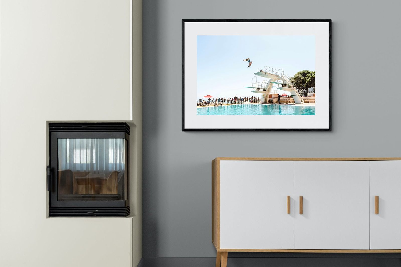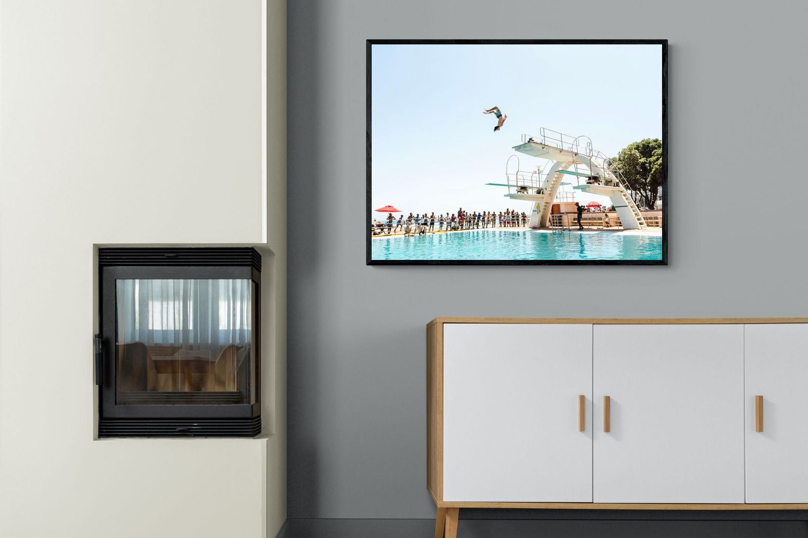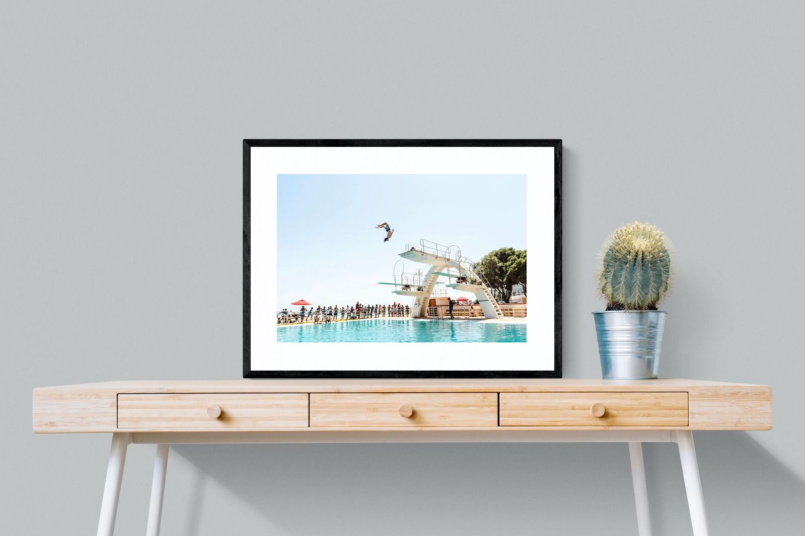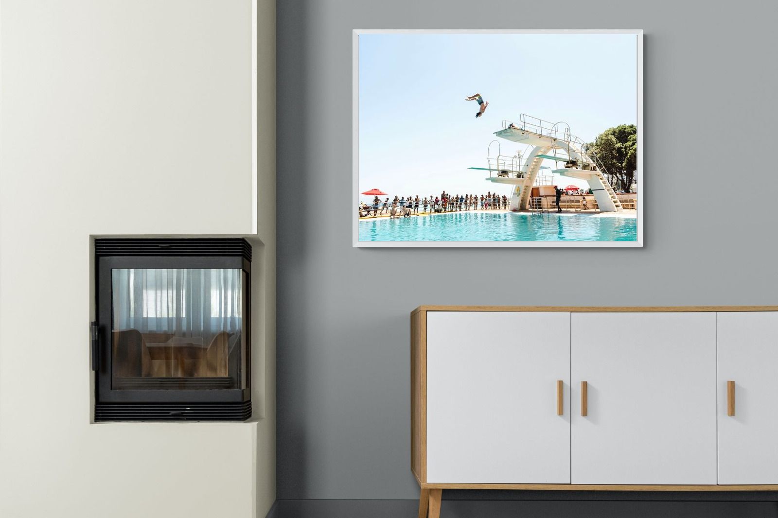 Captured at the Sea Point Pavilion in Cape Town, this vibrant summer scene freezes a diver mid-air above turquoise water. The geometric diving boards and gathered spectators add structure and energy to the composition. Clear skies and crisp light create a fresh, contemporary aesthetic. Perfect for modern homes and lively interiors, this artwork celebrates movement, youth and the unmistakable atmosphere of a Cape Town seaside afternoon.