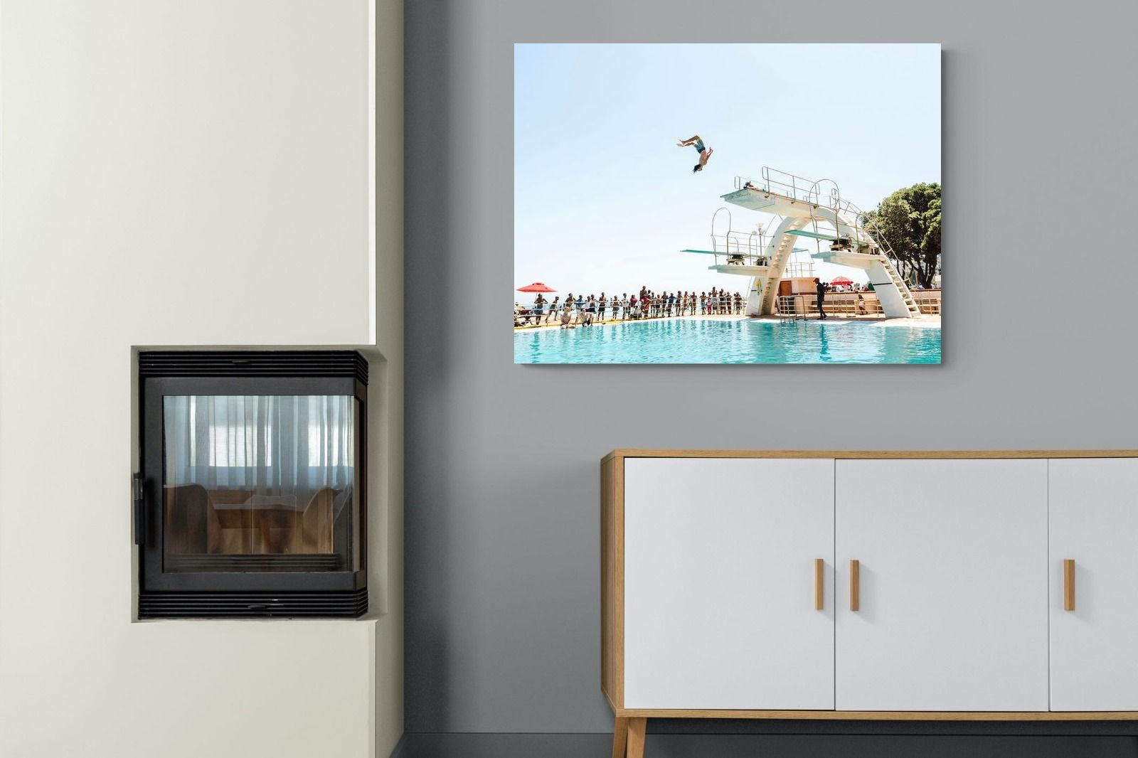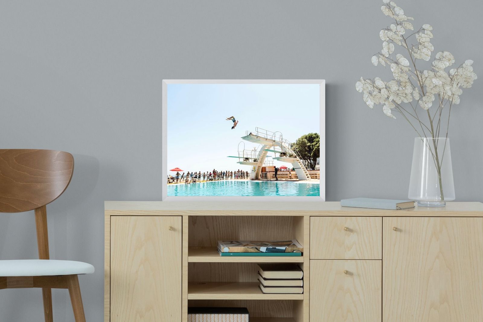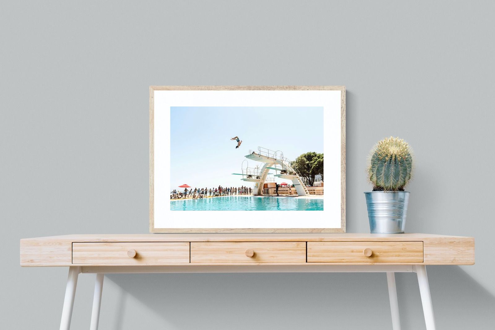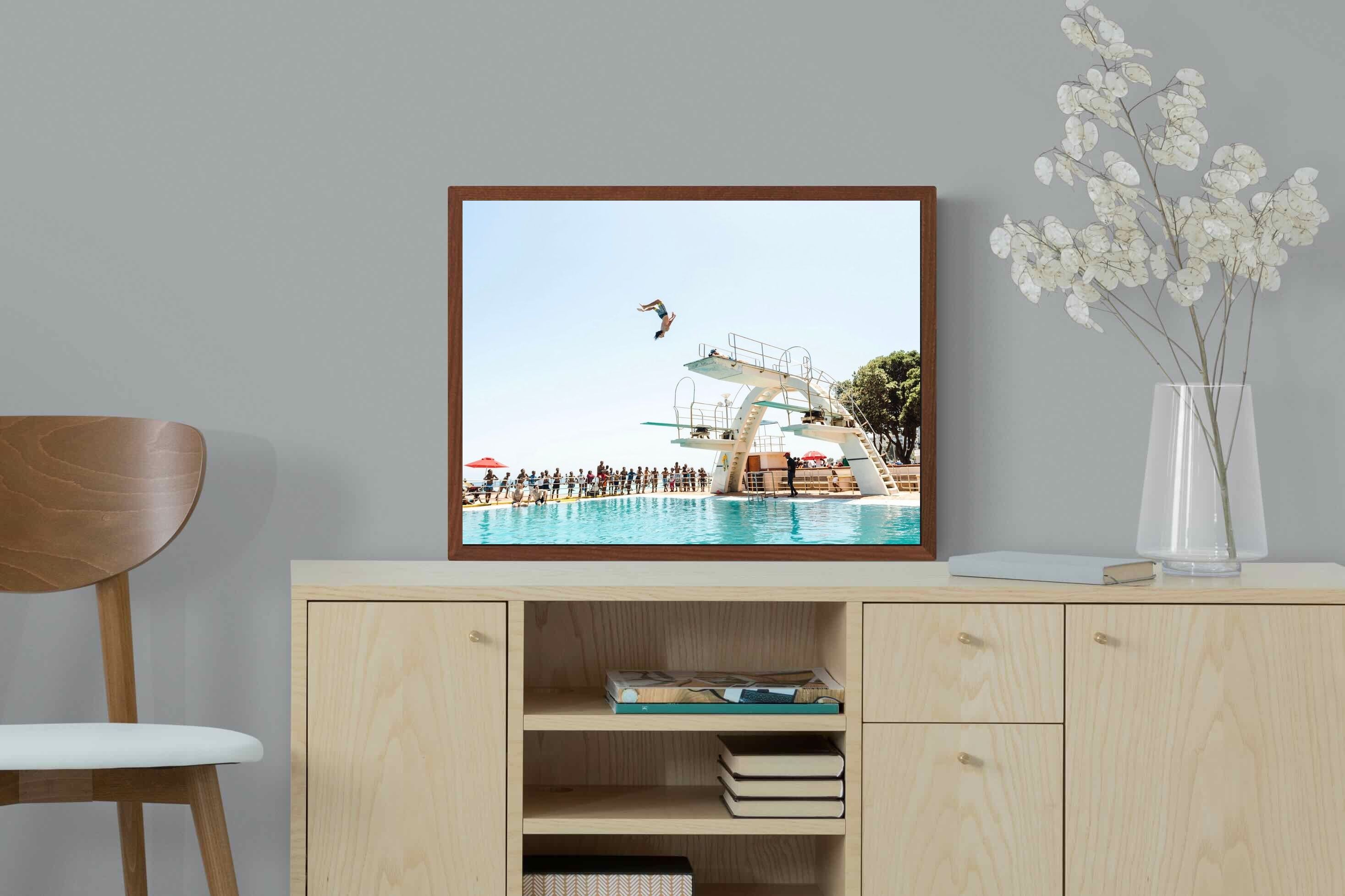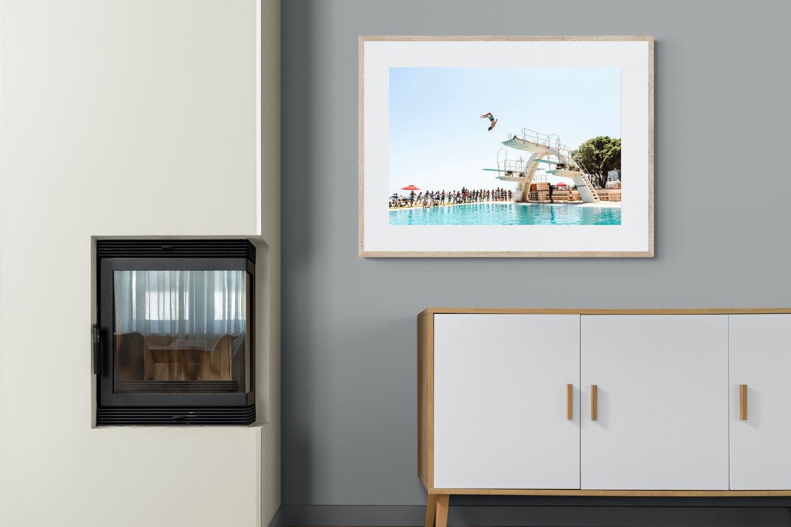 Captured at the Sea Point Pavilion in Cape Town, this vibrant summer scene freezes a diver mid-air above turquoise water. The geometric diving boards and gathered spectators add structure and energy to the composition. Clear skies and crisp light create a fresh, contemporary aesthetic. Perfect for modern homes and lively interiors, this artwork celebrates movement, youth and the unmistakable atmosphere of a Cape Town seaside afternoon.