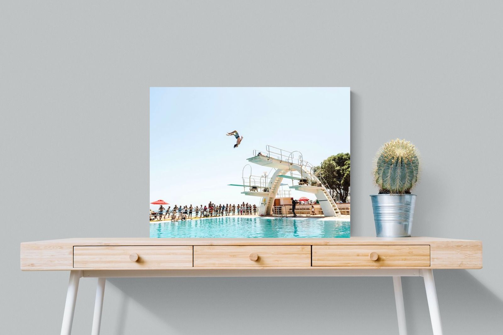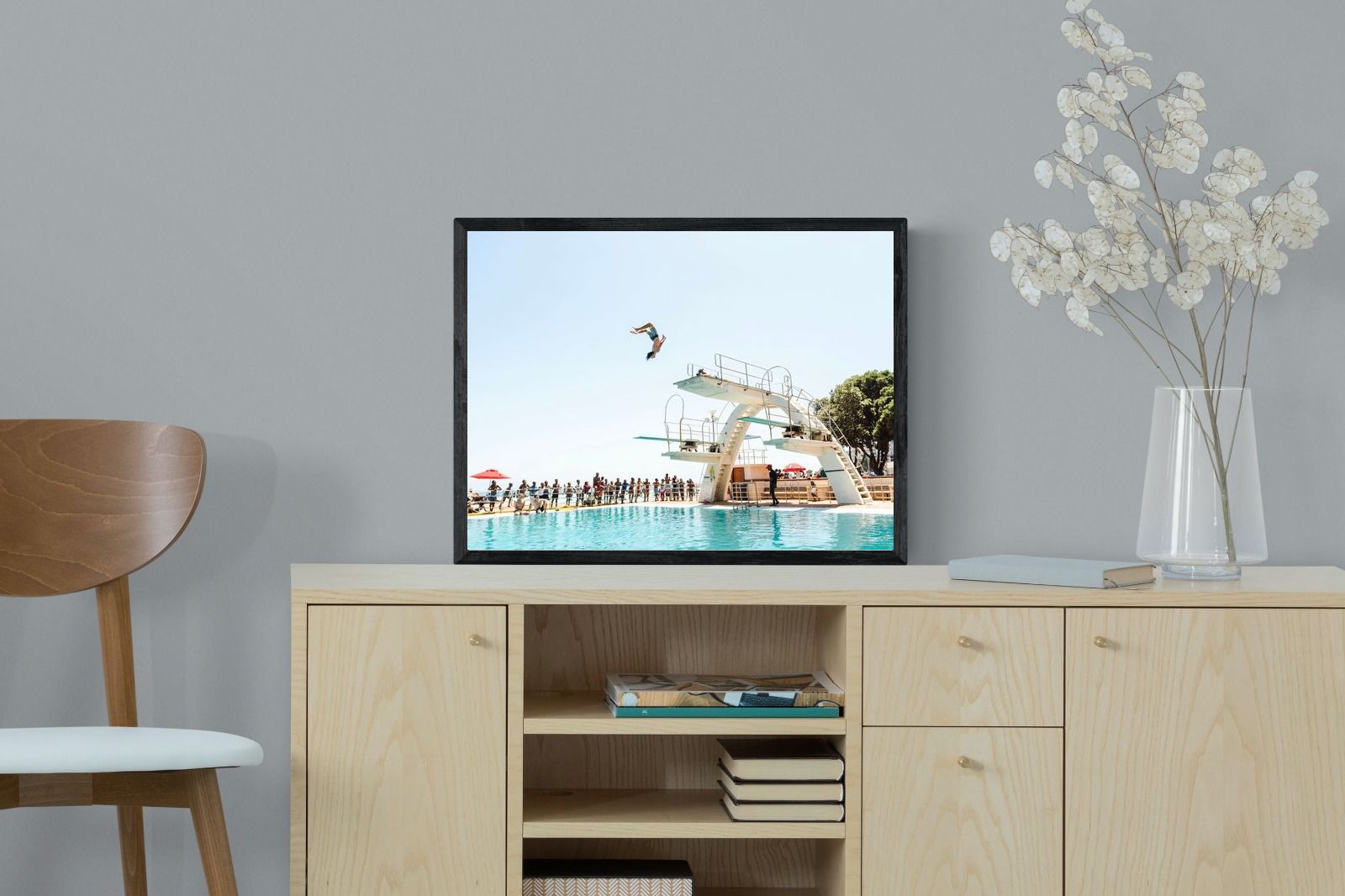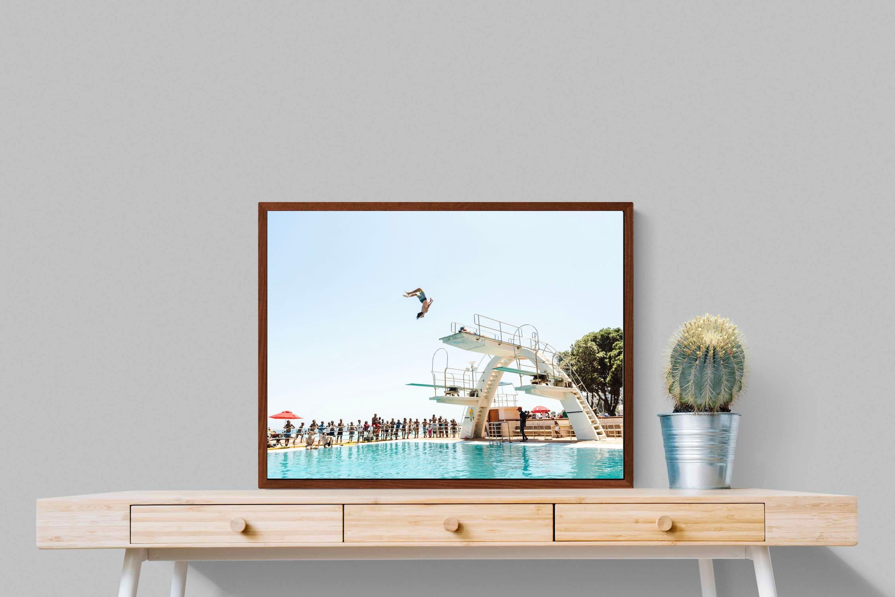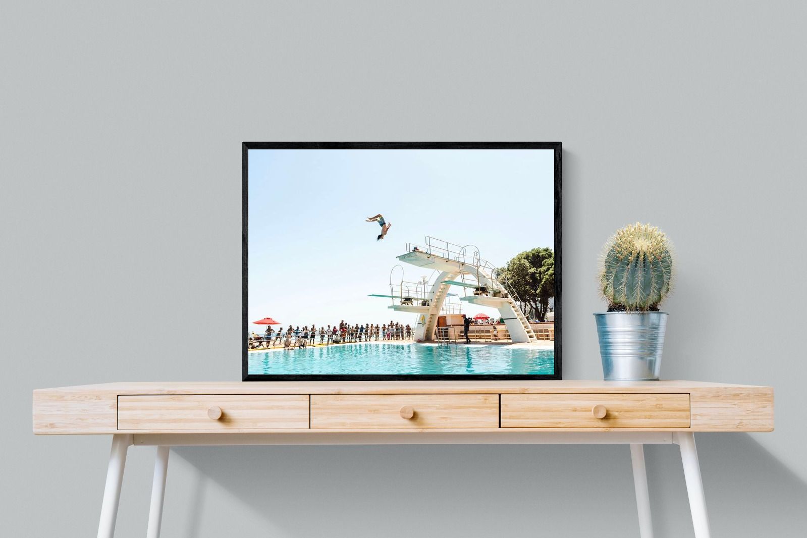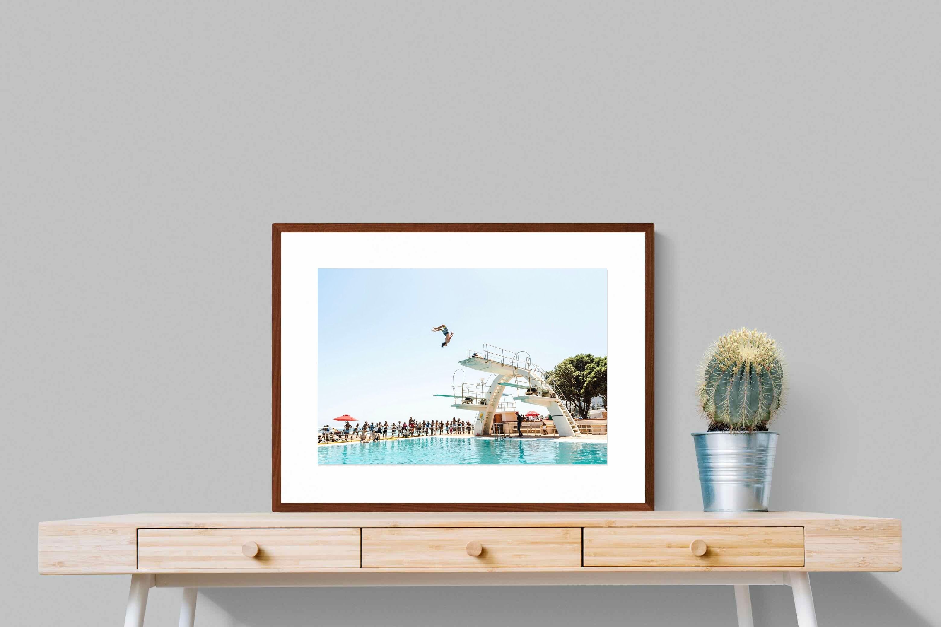 Captured at the Sea Point Pavilion in Cape Town, this vibrant summer scene freezes a diver mid-air above turquoise water. The geometric diving boards and gathered spectators add structure and energy to the composition. Clear skies and crisp light create a fresh, contemporary aesthetic. Perfect for modern homes and lively interiors, this artwork celebrates movement, youth and the unmistakable atmosphere of a Cape Town seaside afternoon.