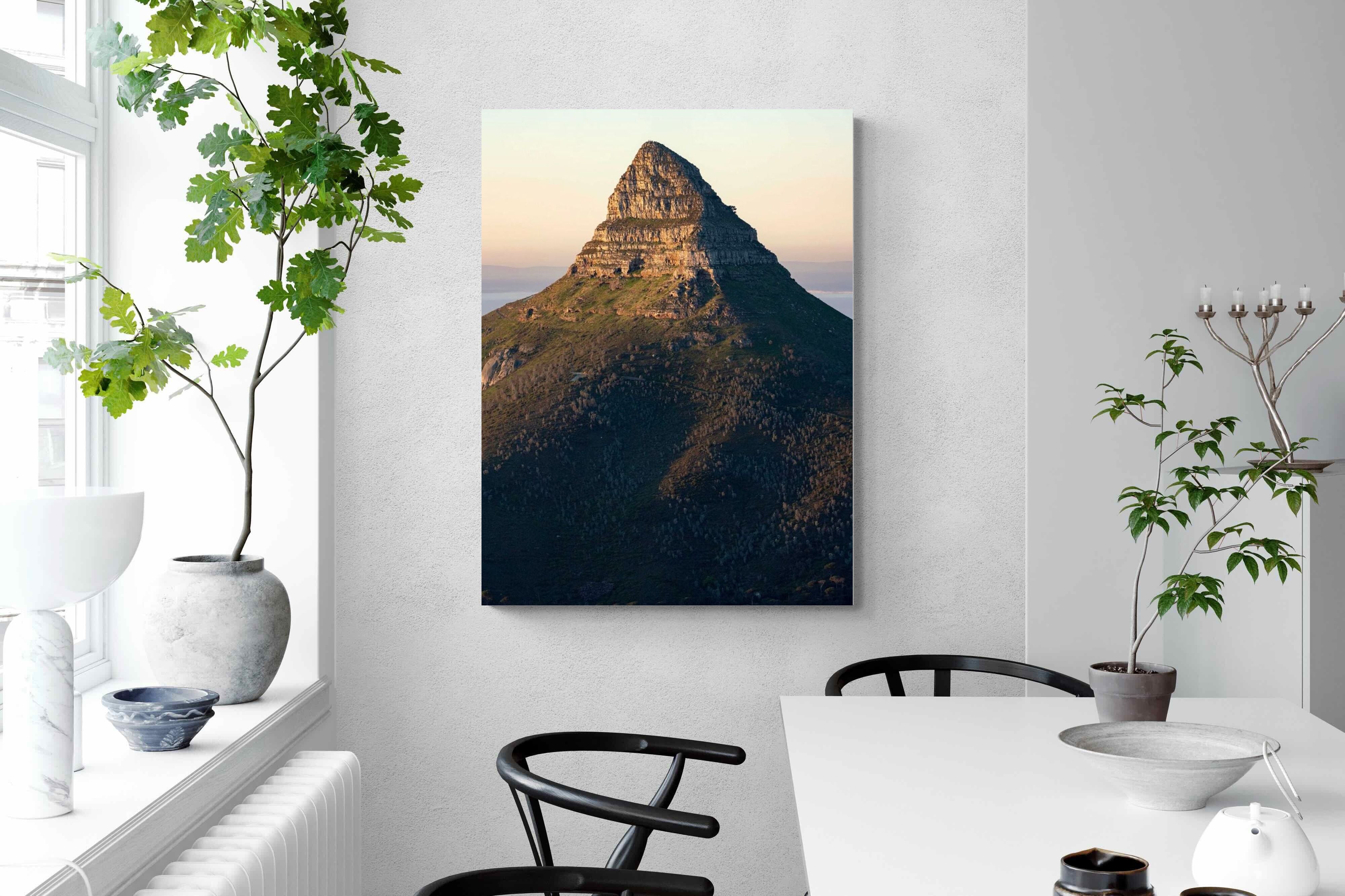 Golden light washes across the distinctive slopes of Lion’s Head, revealing layered rock formations and textured fynbos beneath a soft Cape Town sky. The pyramid-like peak rises with quiet authority, creating a refined and recognisable silhouette. Warm tones and natural detail give the scene depth and presence. Ideal for contemporary interiors or proudly South African spaces, this artwork brings a sense of place, elevation and understated grandeur to any wall.
