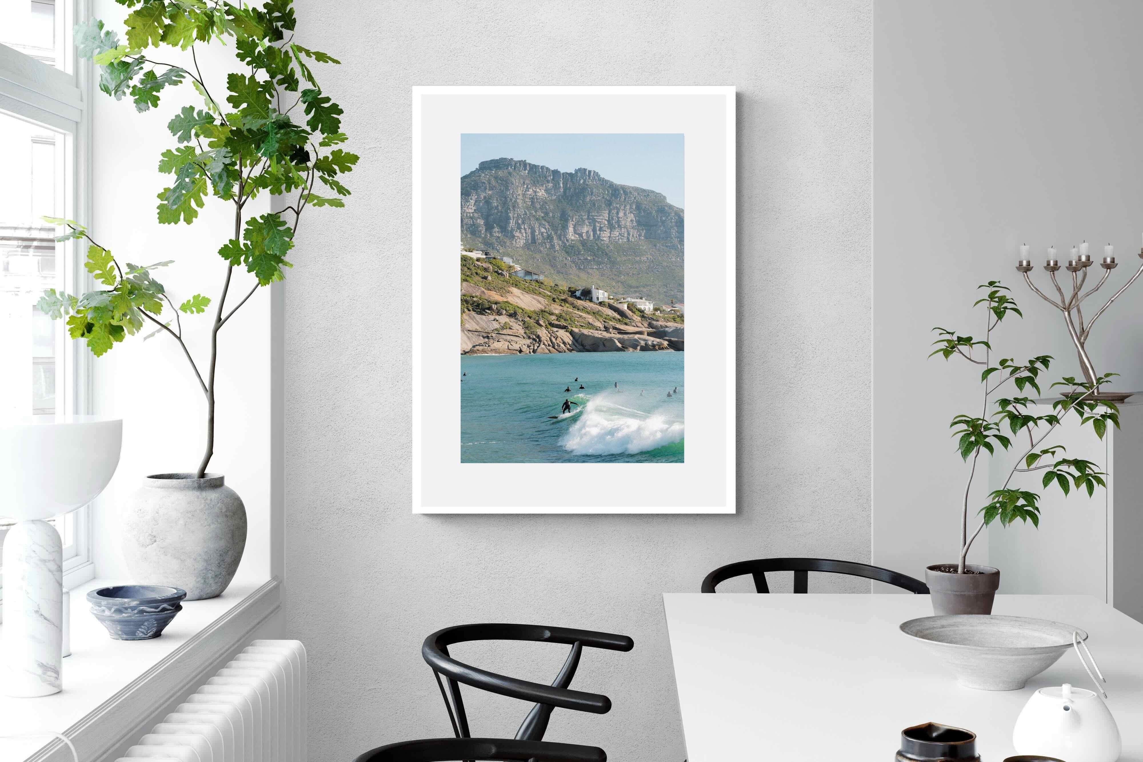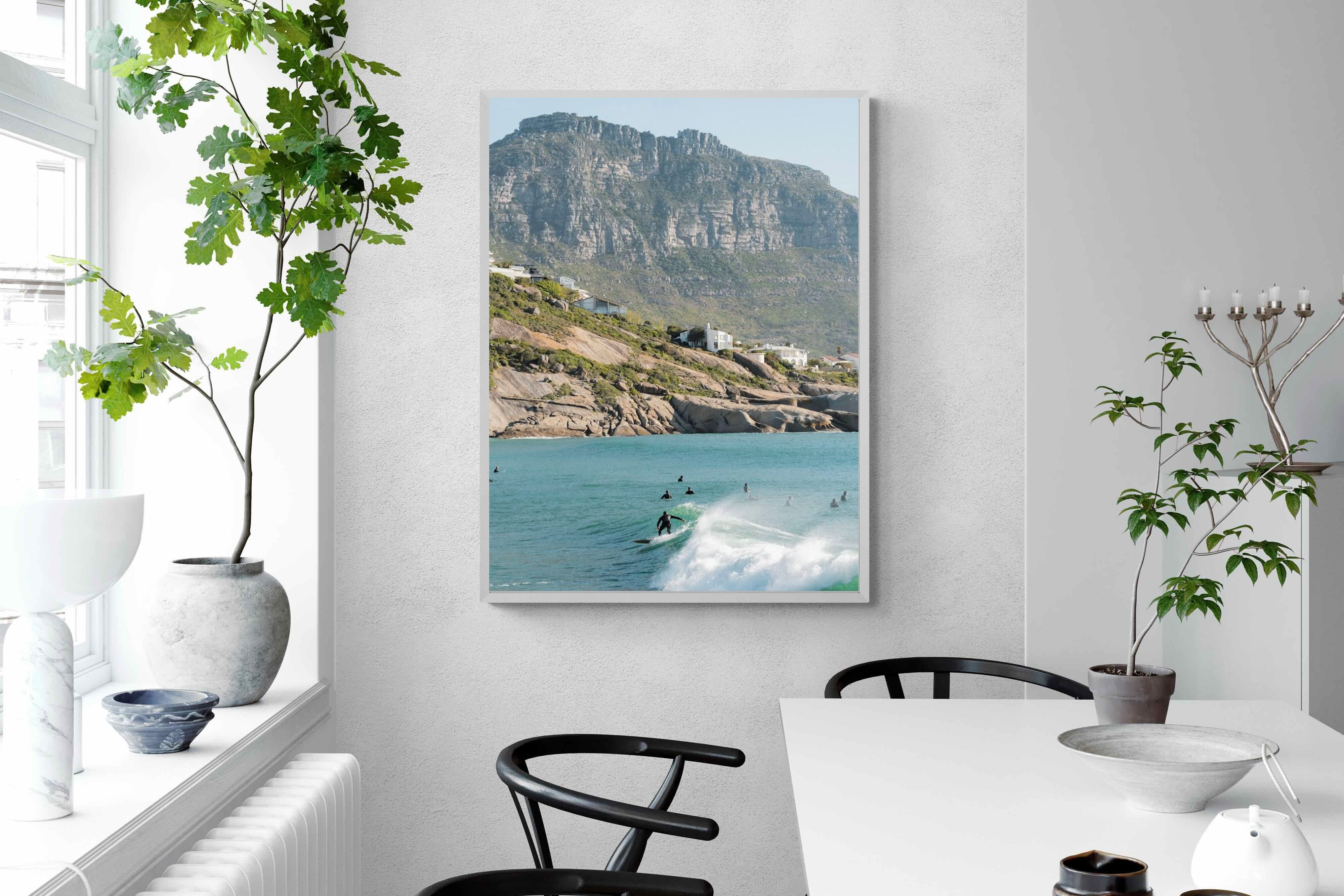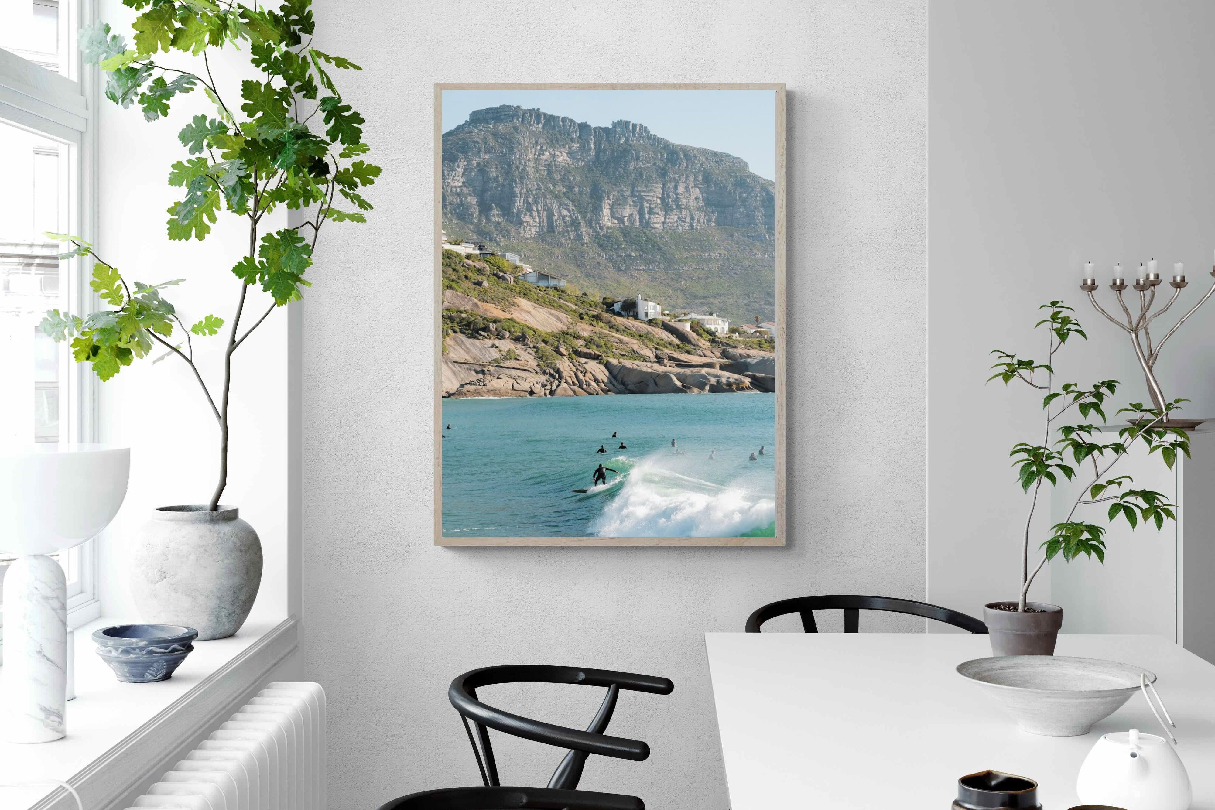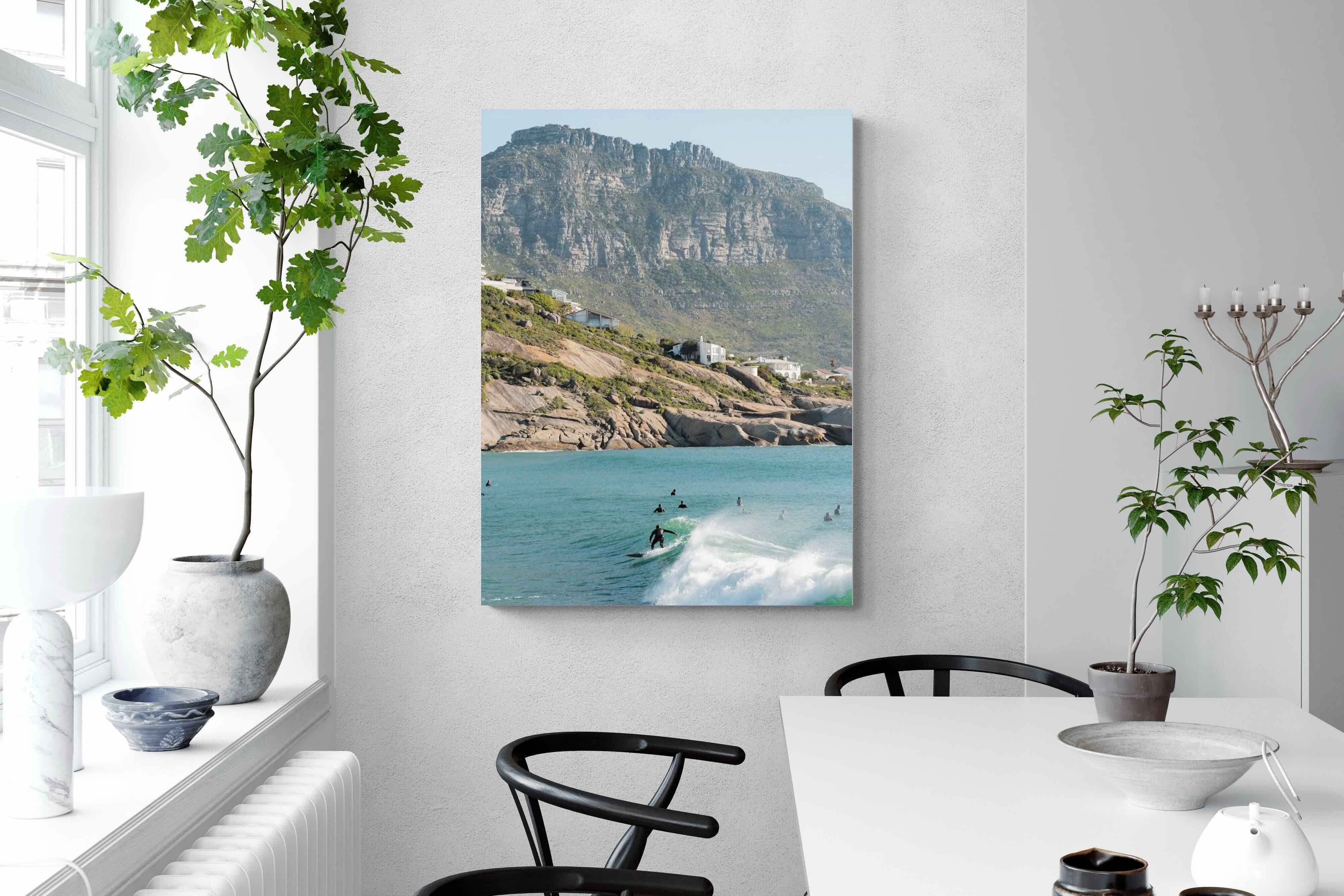 A lone surfer rides a crisp Atlantic wave beneath the towering cliffs of Llandudno. The surrounding lineup and textured spray give the image energy and authenticity, capturing Cape Town’s surf culture at its most natural. Soft coastal light and layered mountain forms create depth behind the motion in the foreground. This photograph works exceptionally well in modern homes, creative studios or hospitality settings seeking dynamic yet elegant coastal artwork.