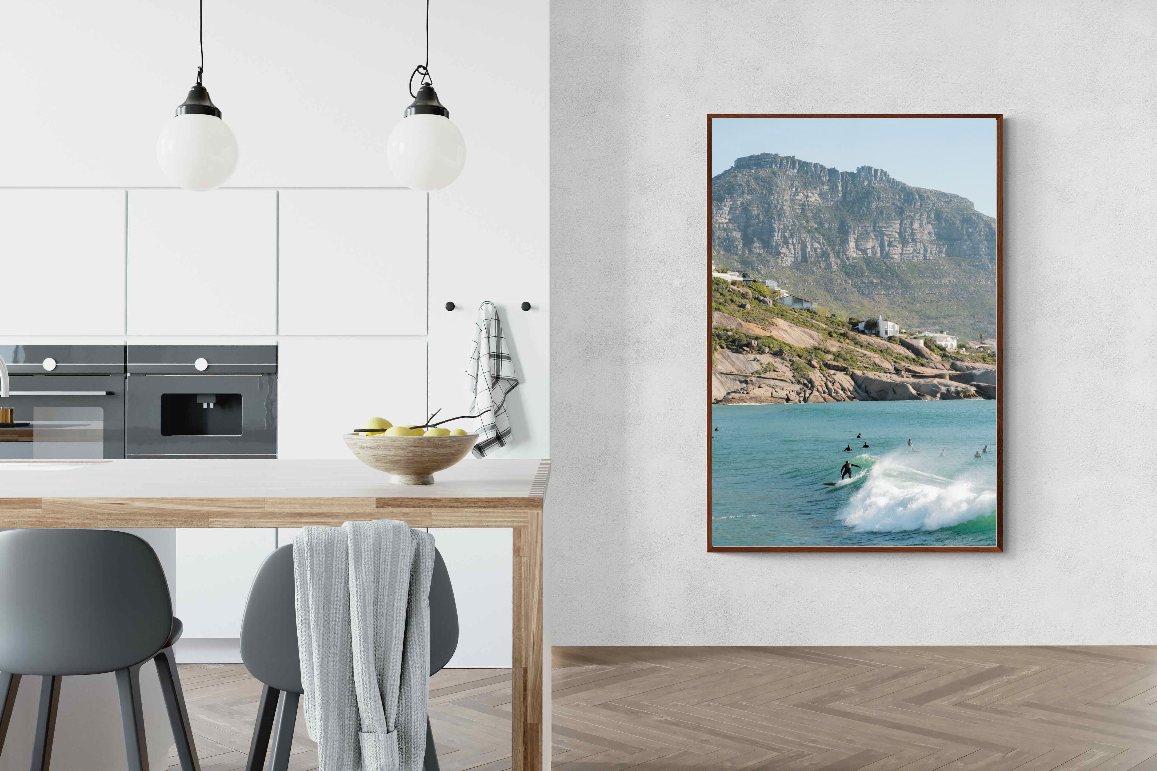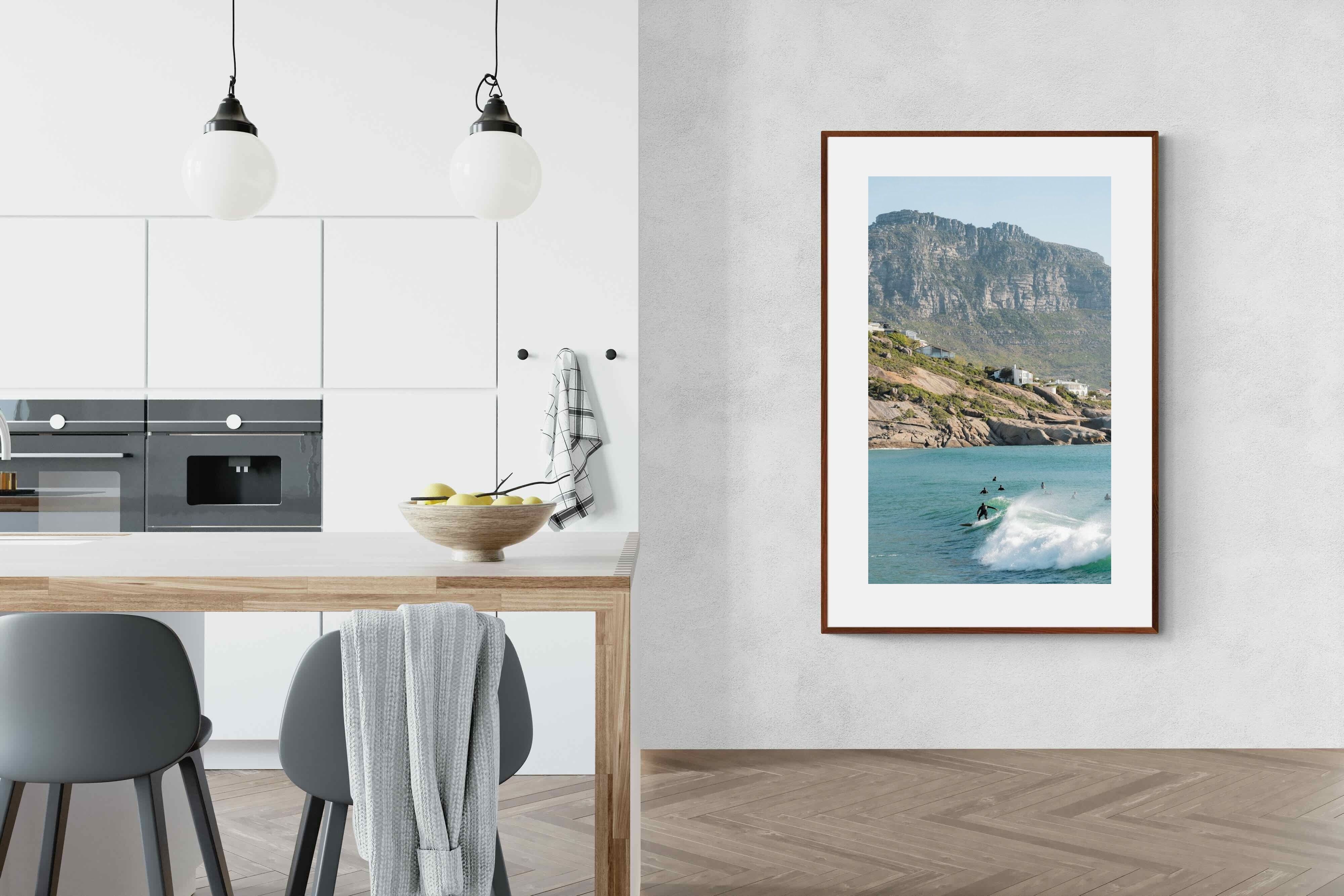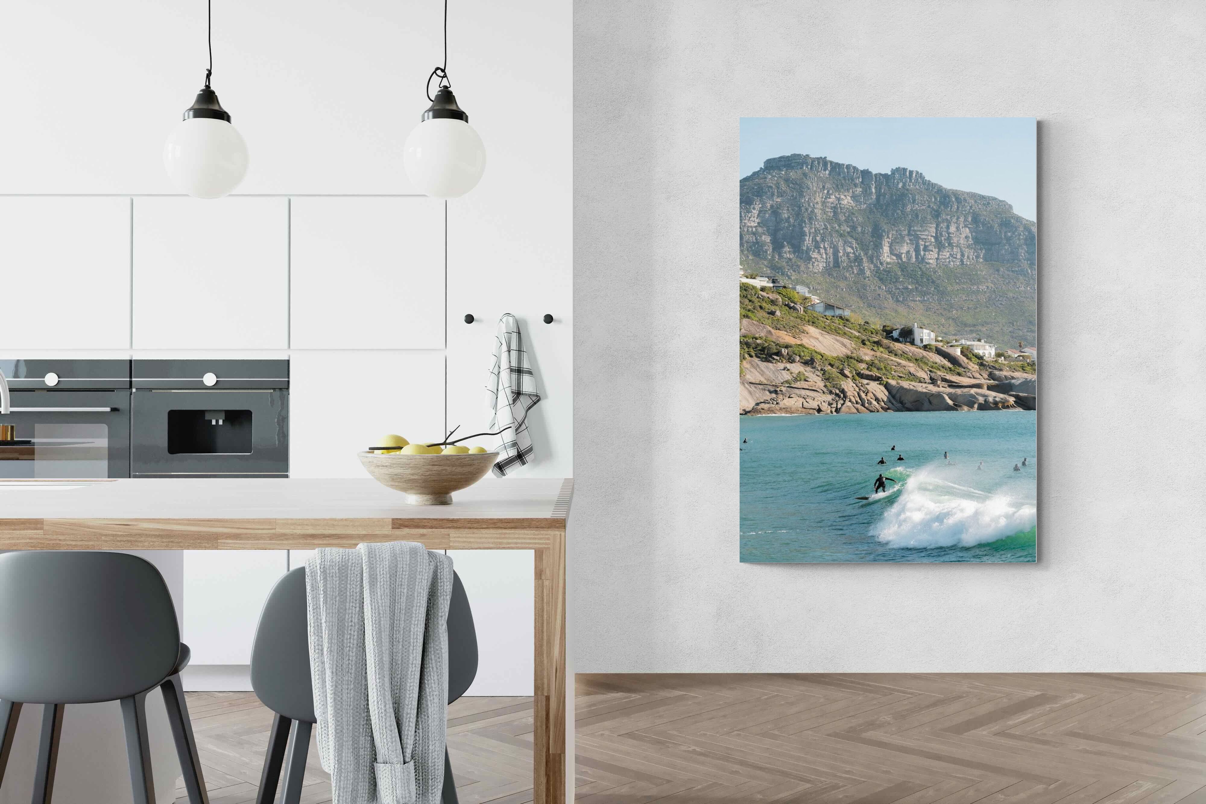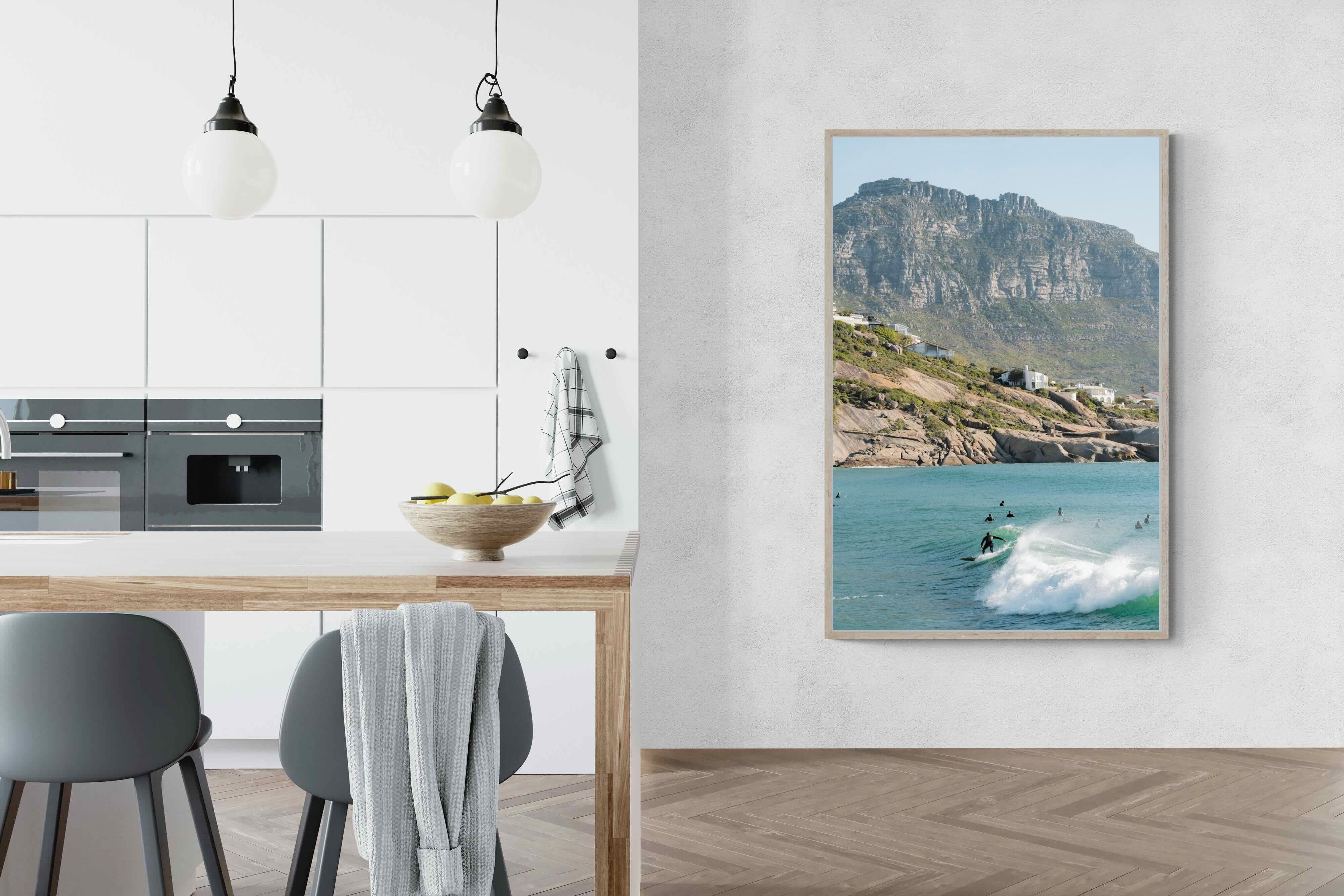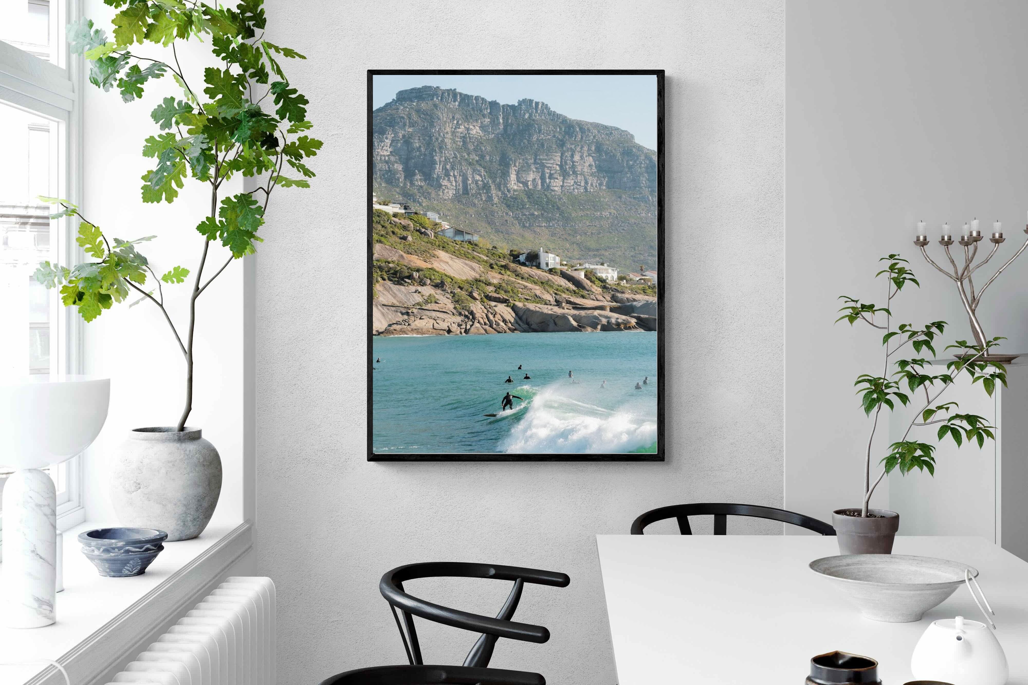A lone surfer rides a crisp Atlantic wave beneath the towering cliffs of Llandudno. The surrounding lineup and textured spray give the image energy and authenticity, capturing Cape Town’s surf culture at its most natural. Soft coastal light and layered mountain forms create depth behind the motion in the foreground. This photograph works exceptionally well in modern homes, creative studios or hospitality settings seeking dynamic yet elegant coastal artwork.