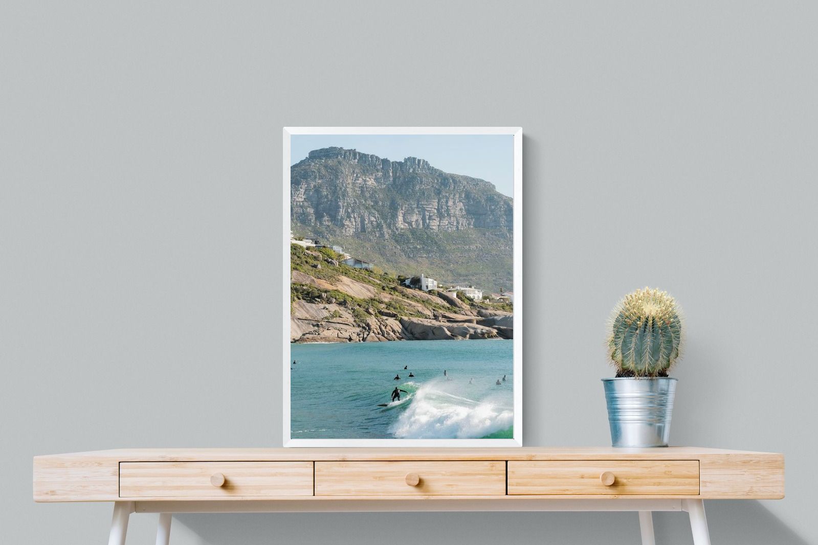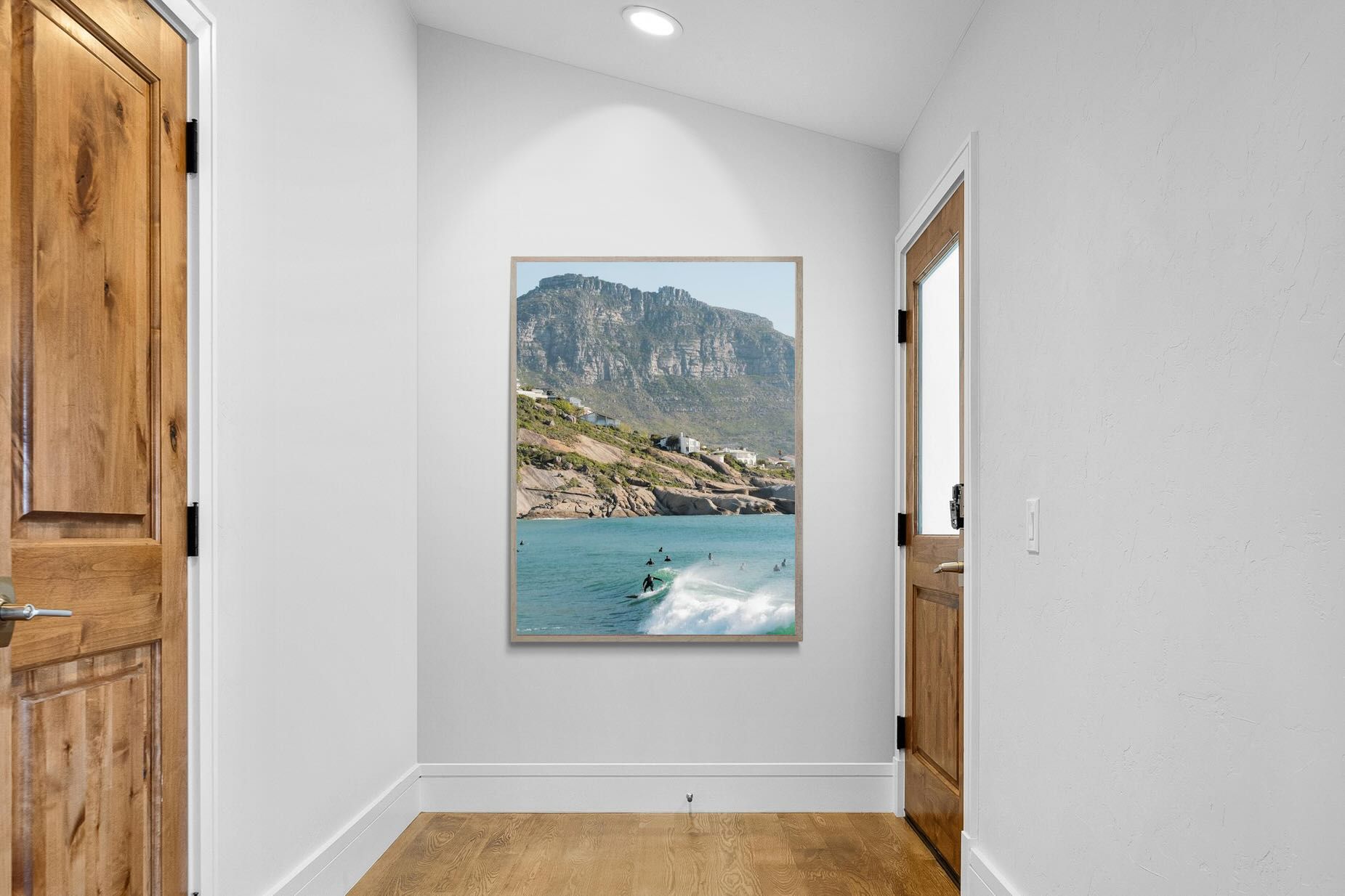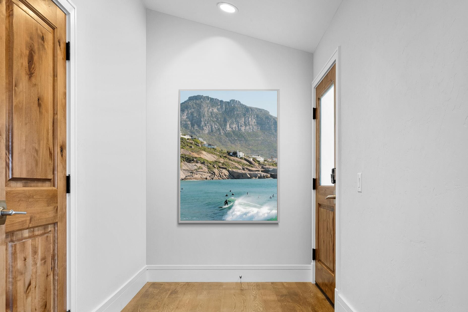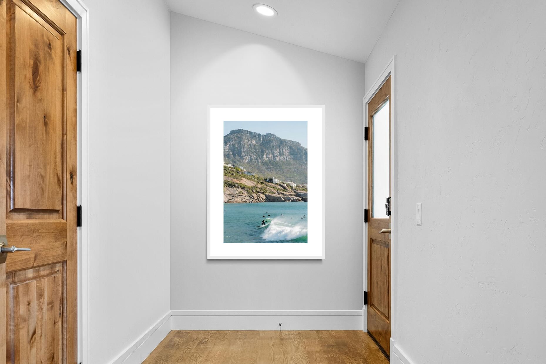 A lone surfer rides a crisp Atlantic wave beneath the towering cliffs of Llandudno. The surrounding lineup and textured spray give the image energy and authenticity, capturing Cape Town’s surf culture at its most natural. Soft coastal light and layered mountain forms create depth behind the motion in the foreground. This photograph works exceptionally well in modern homes, creative studios or hospitality settings seeking dynamic yet elegant coastal artwork.