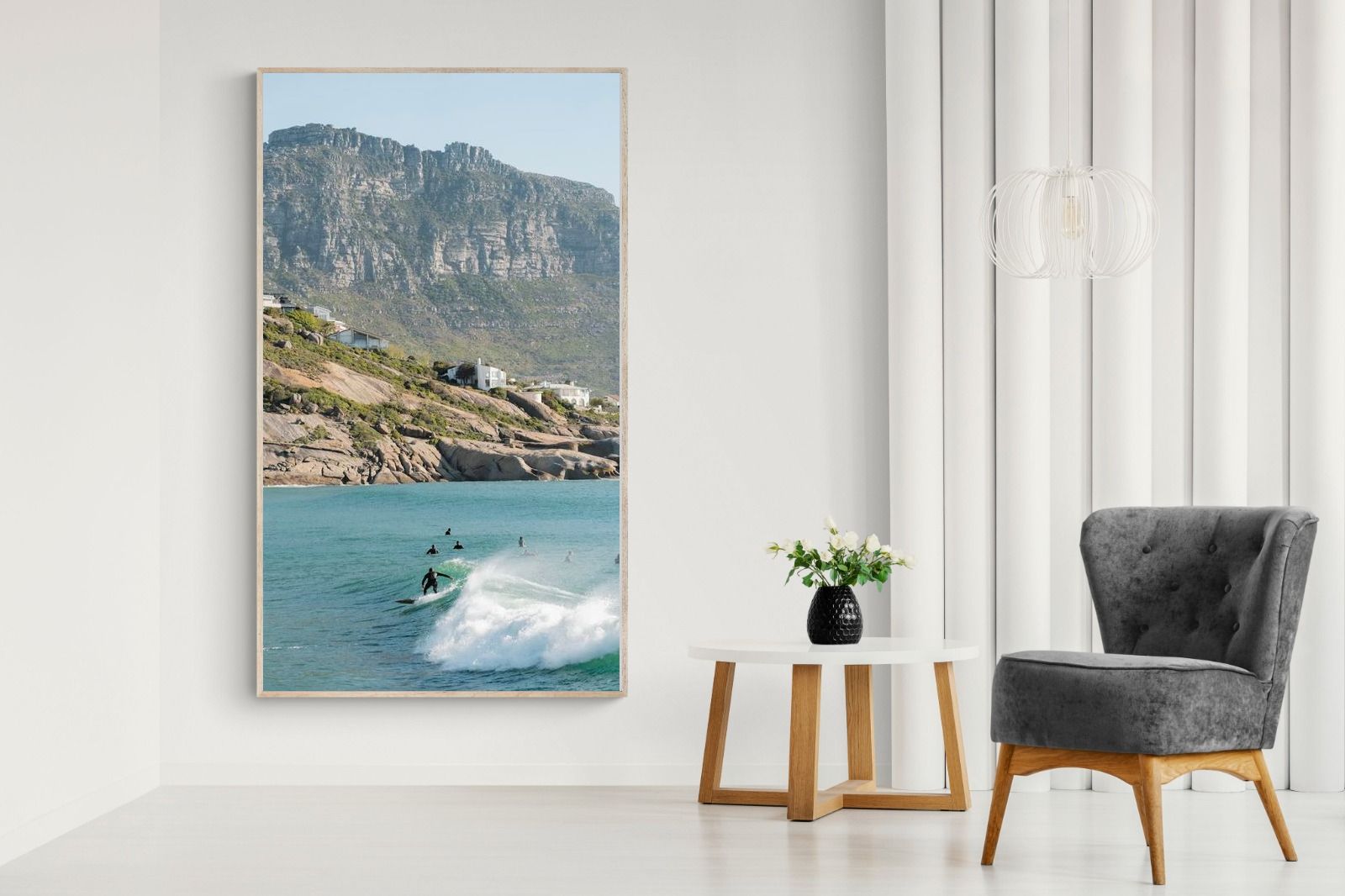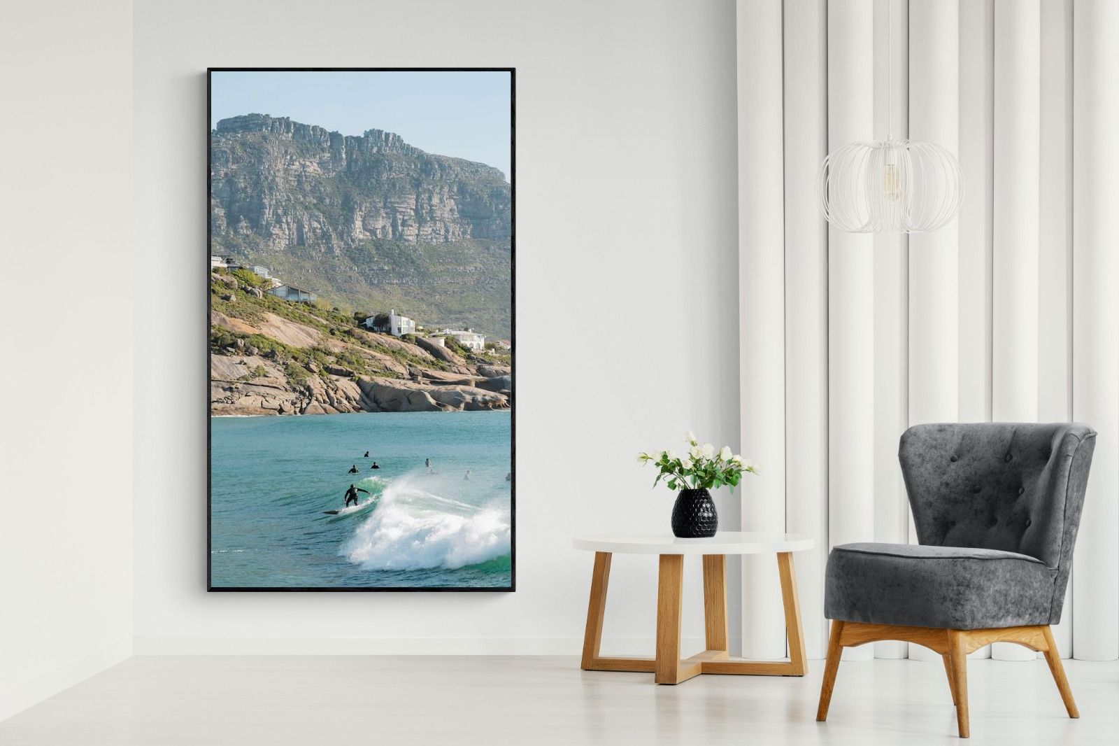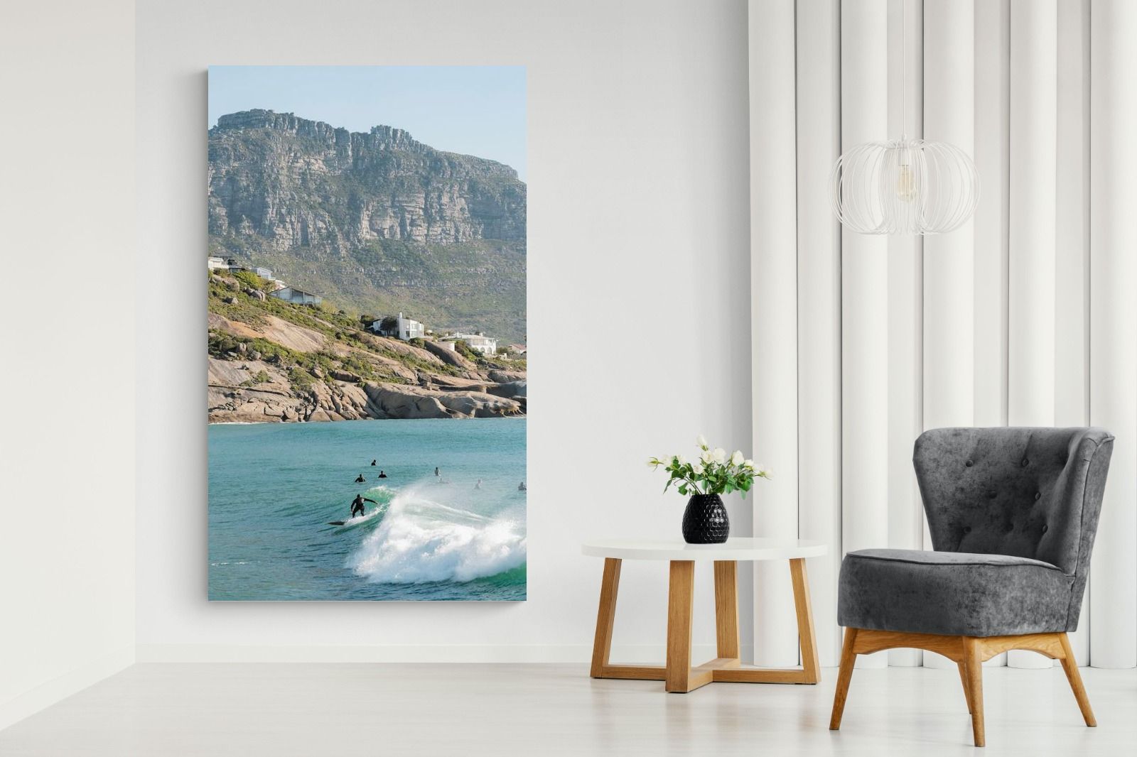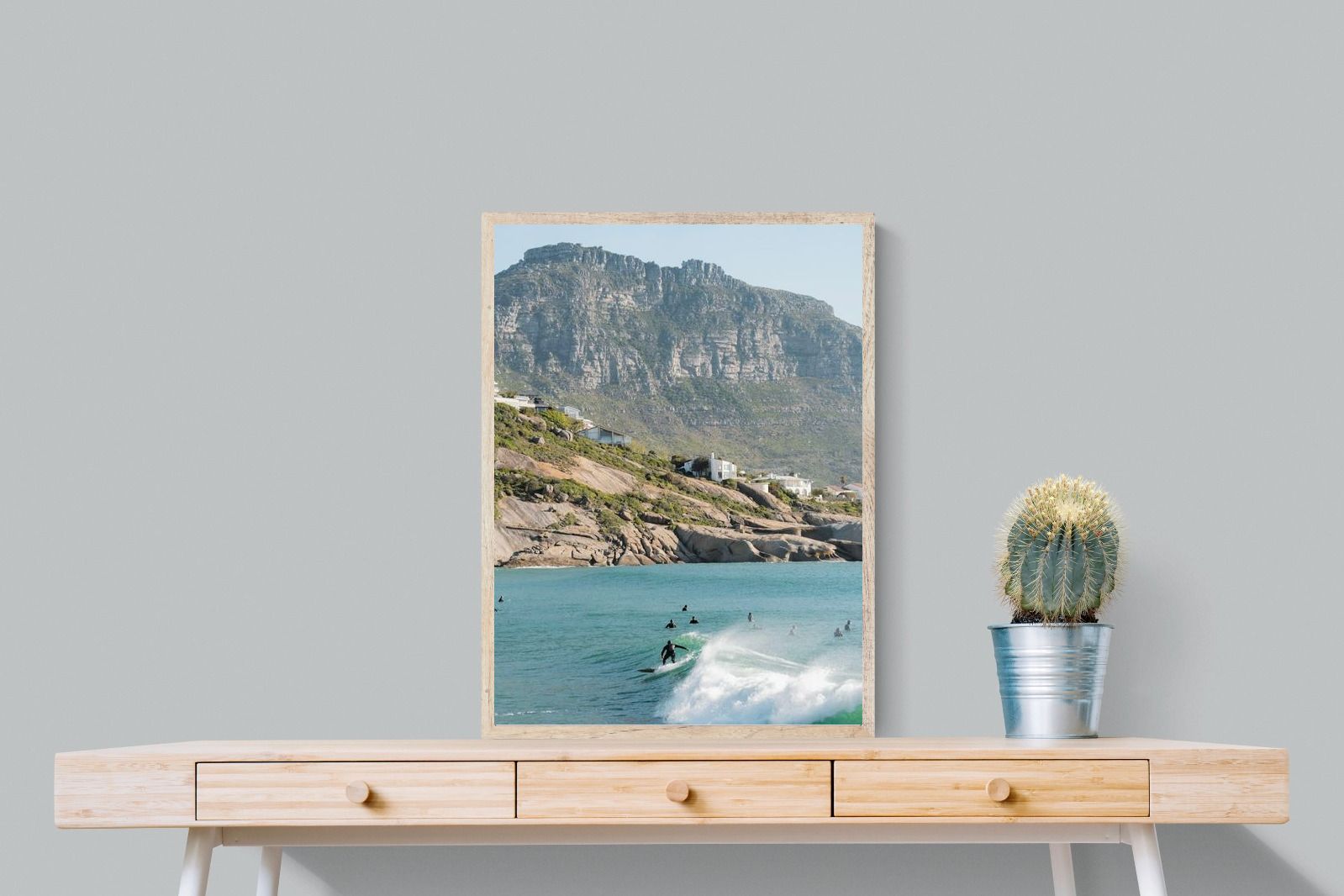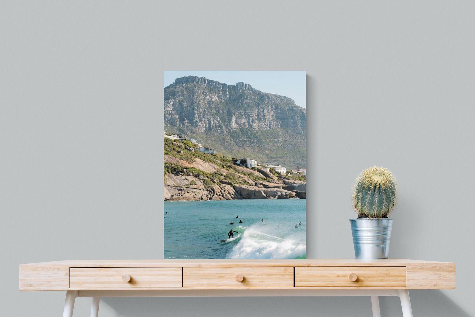 A lone surfer rides a crisp Atlantic wave beneath the towering cliffs of Llandudno. The surrounding lineup and textured spray give the image energy and authenticity, capturing Cape Town’s surf culture at its most natural. Soft coastal light and layered mountain forms create depth behind the motion in the foreground. This photograph works exceptionally well in modern homes, creative studios or hospitality settings seeking dynamic yet elegant coastal artwork.