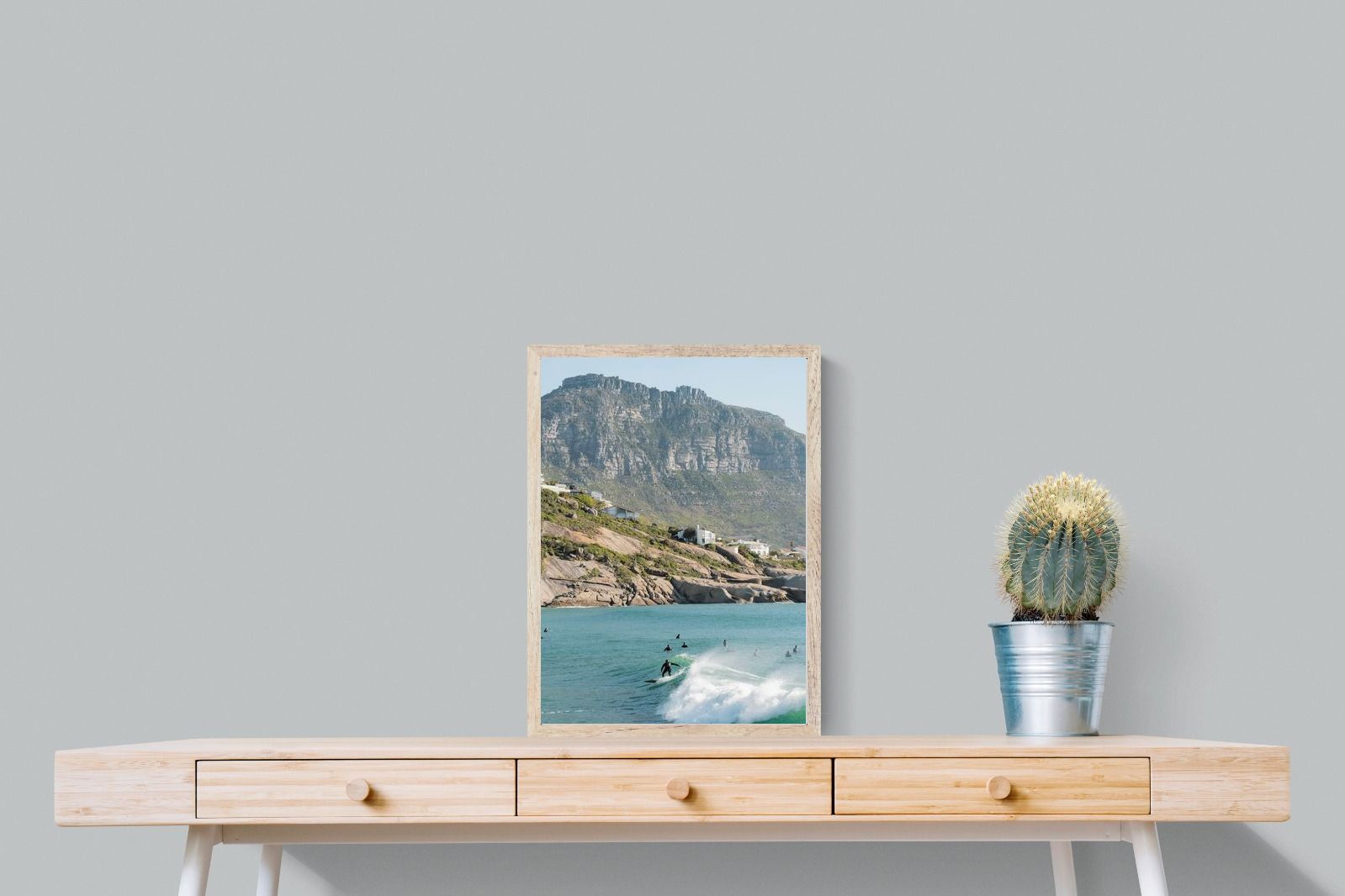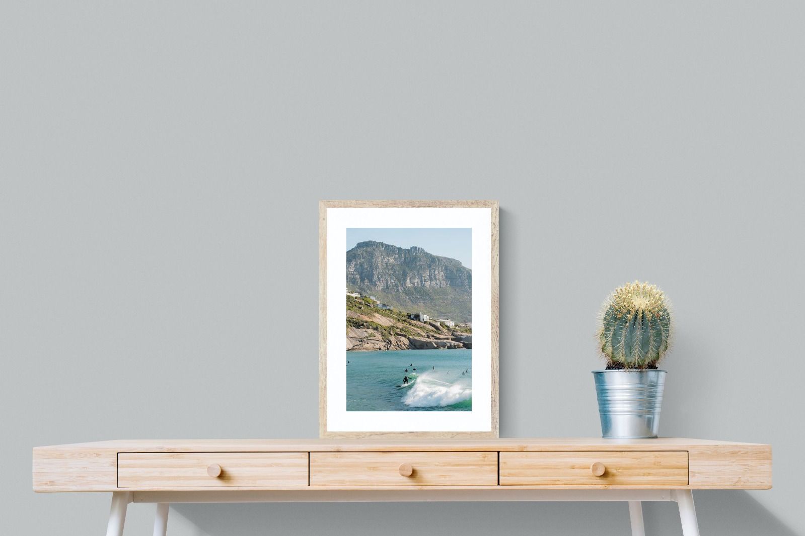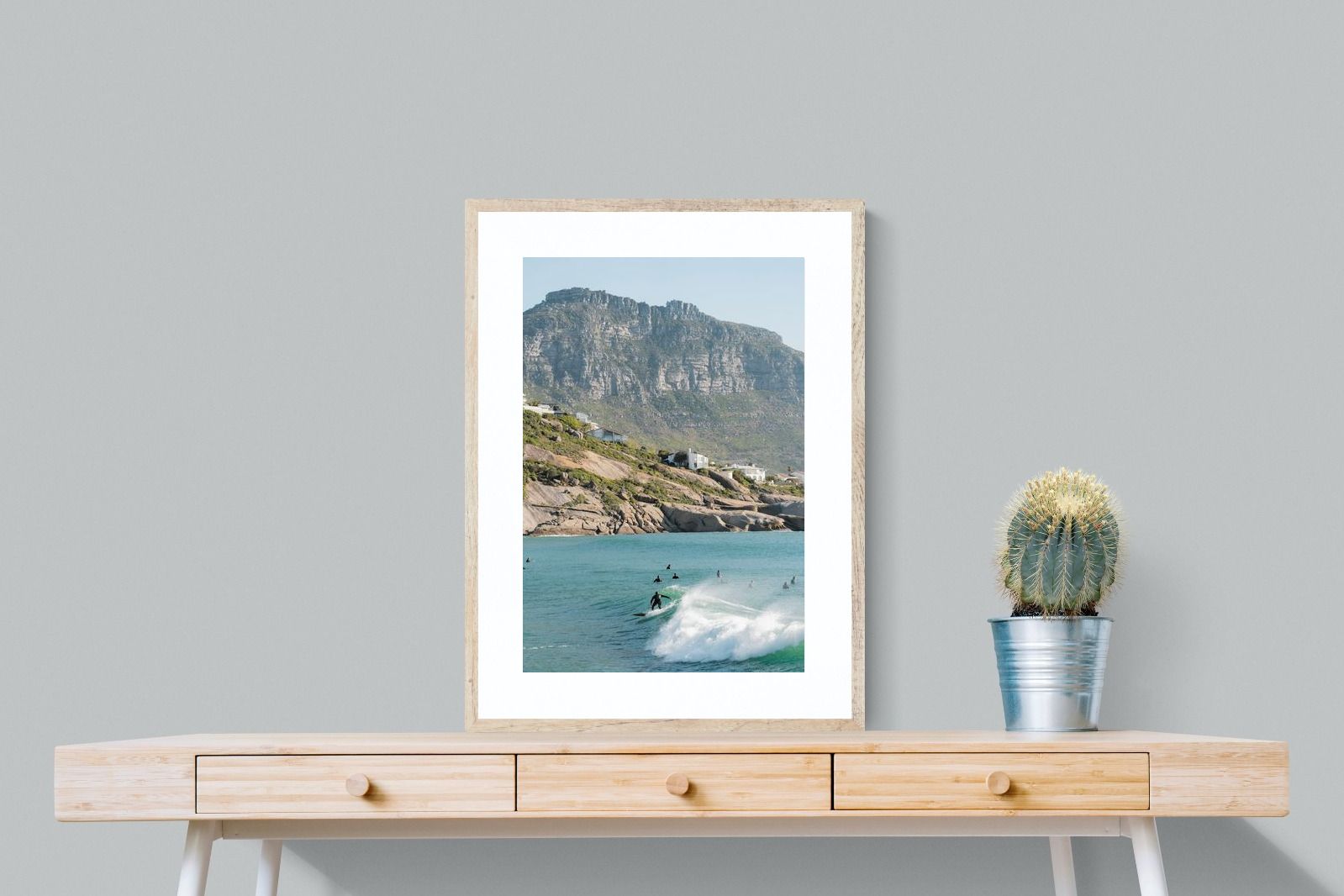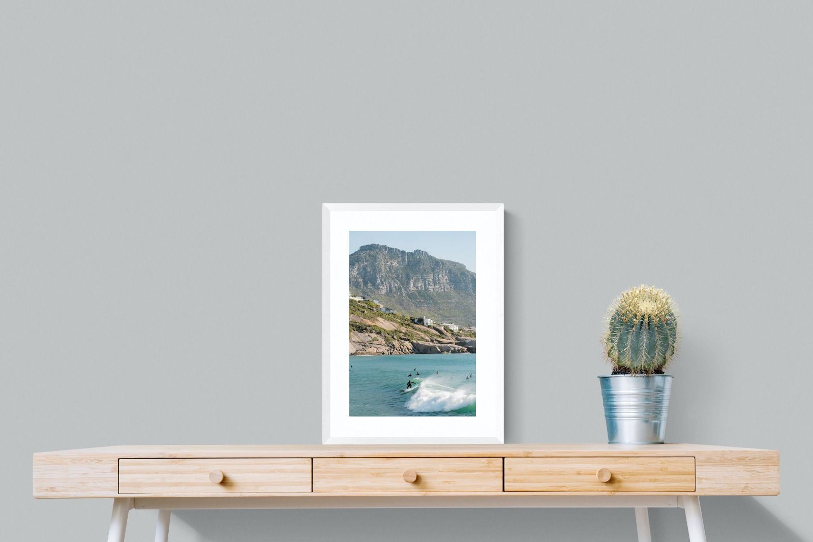 A lone surfer rides a crisp Atlantic wave beneath the towering cliffs of Llandudno. The surrounding lineup and textured spray give the image energy and authenticity, capturing Cape Town’s surf culture at its most natural. Soft coastal light and layered mountain forms create depth behind the motion in the foreground. This photograph works exceptionally well in modern homes, creative studios or hospitality settings seeking dynamic yet elegant coastal artwork.