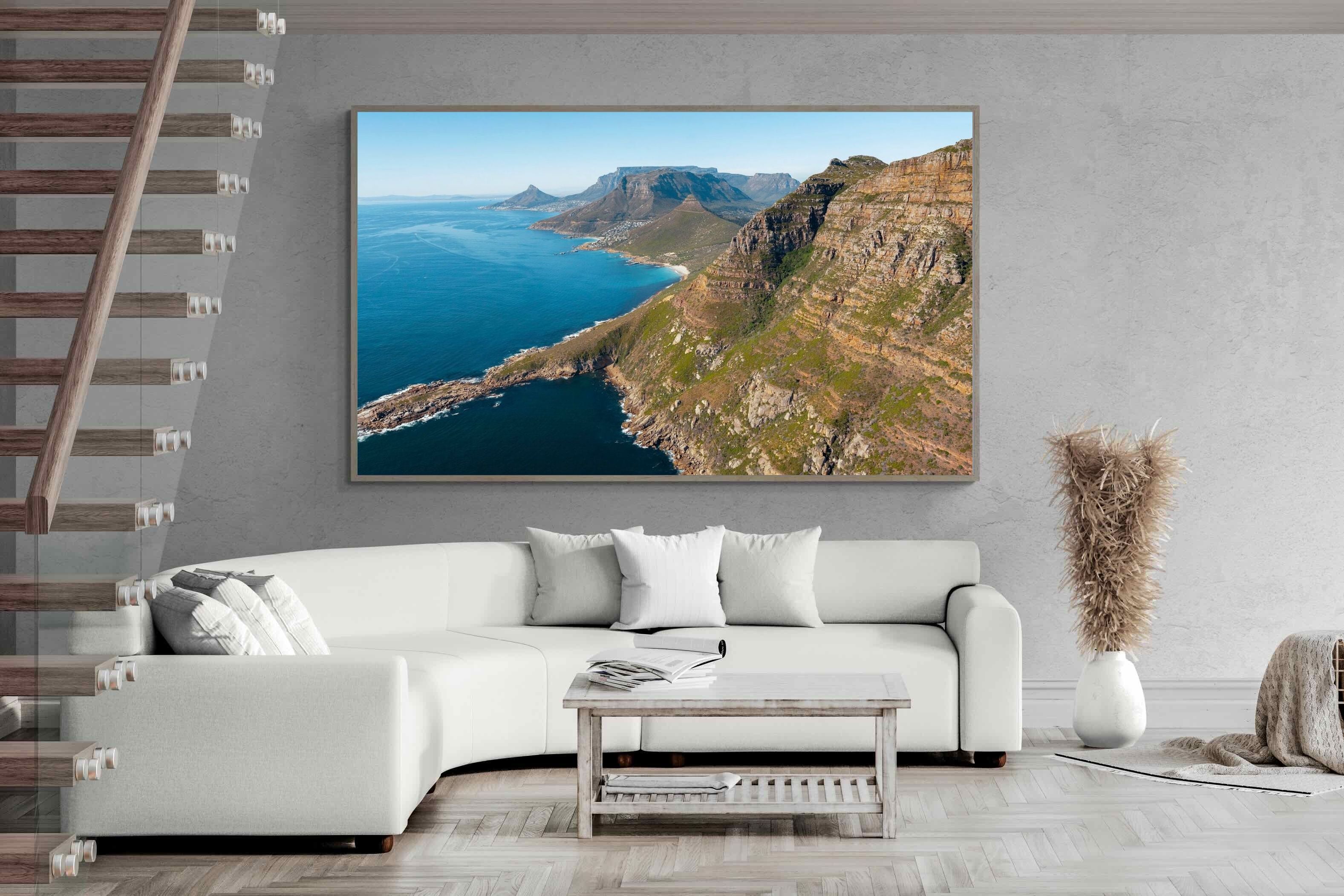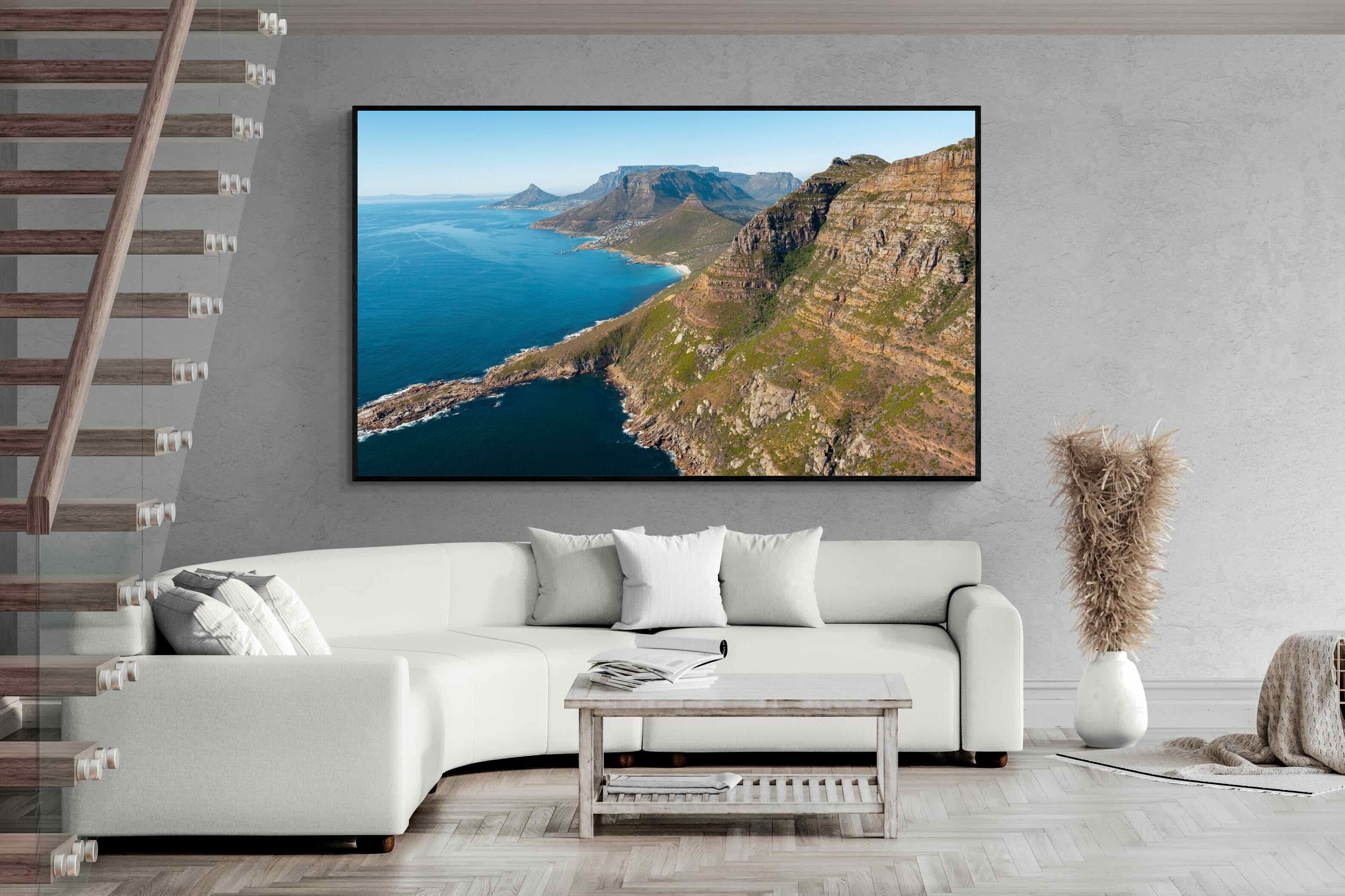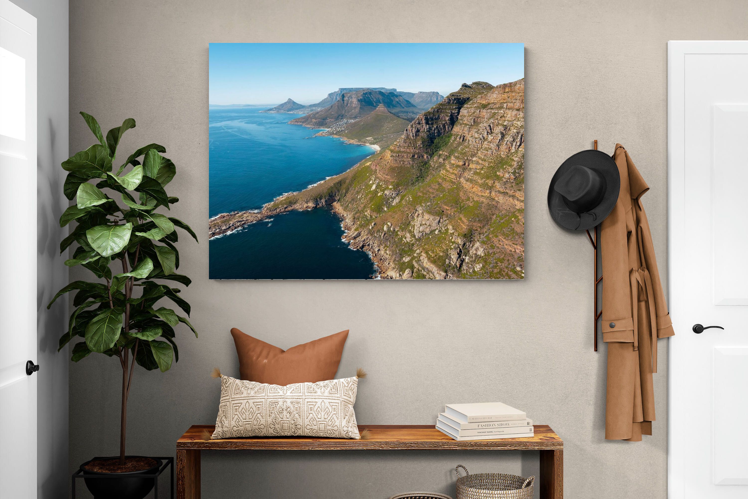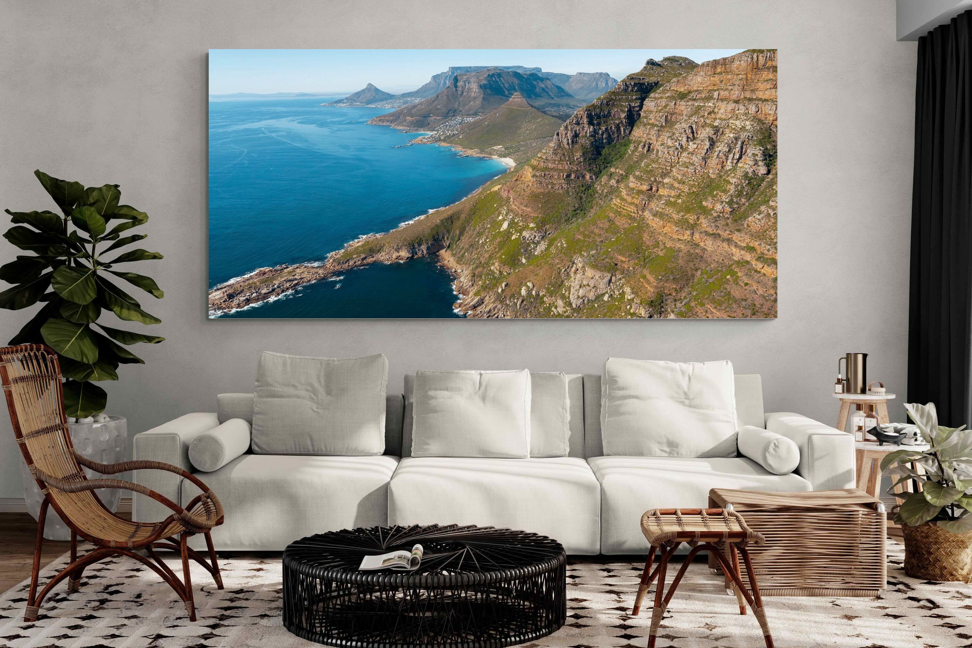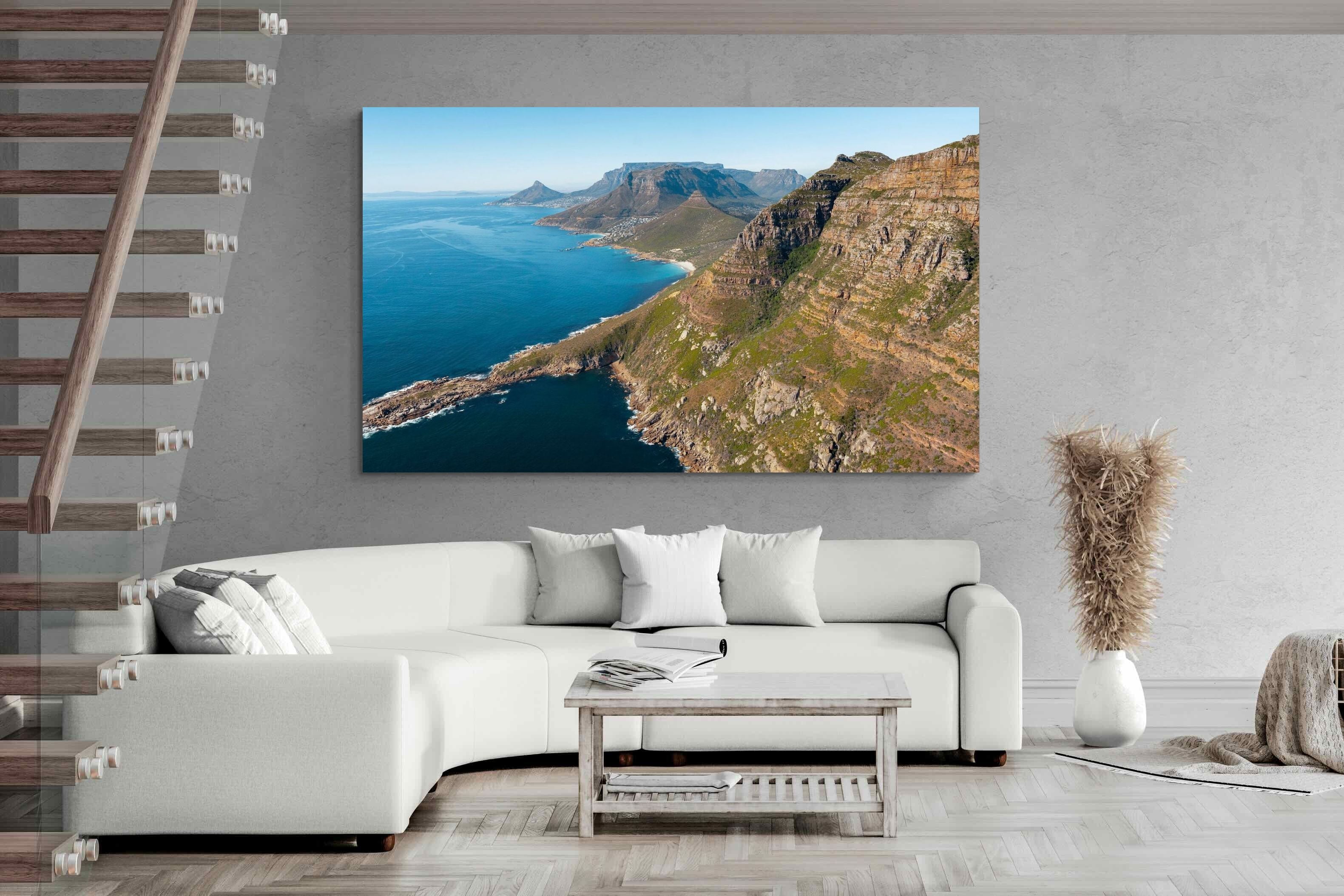 From high above the Atlantic, Cape Town’s coastline unfolds in dramatic layers of cliff, sea and distant mountains. The composition captures the immensity of the ocean against textured rock faces and scattered coastal settlements. Deep cobalt water contrasts with sunlit stone, creating a commanding visual presence. Perfect for large statement walls, this piece suits executive offices, architectural homes or hospitality environments looking to showcase the scale and beauty of the Cape Peninsula.