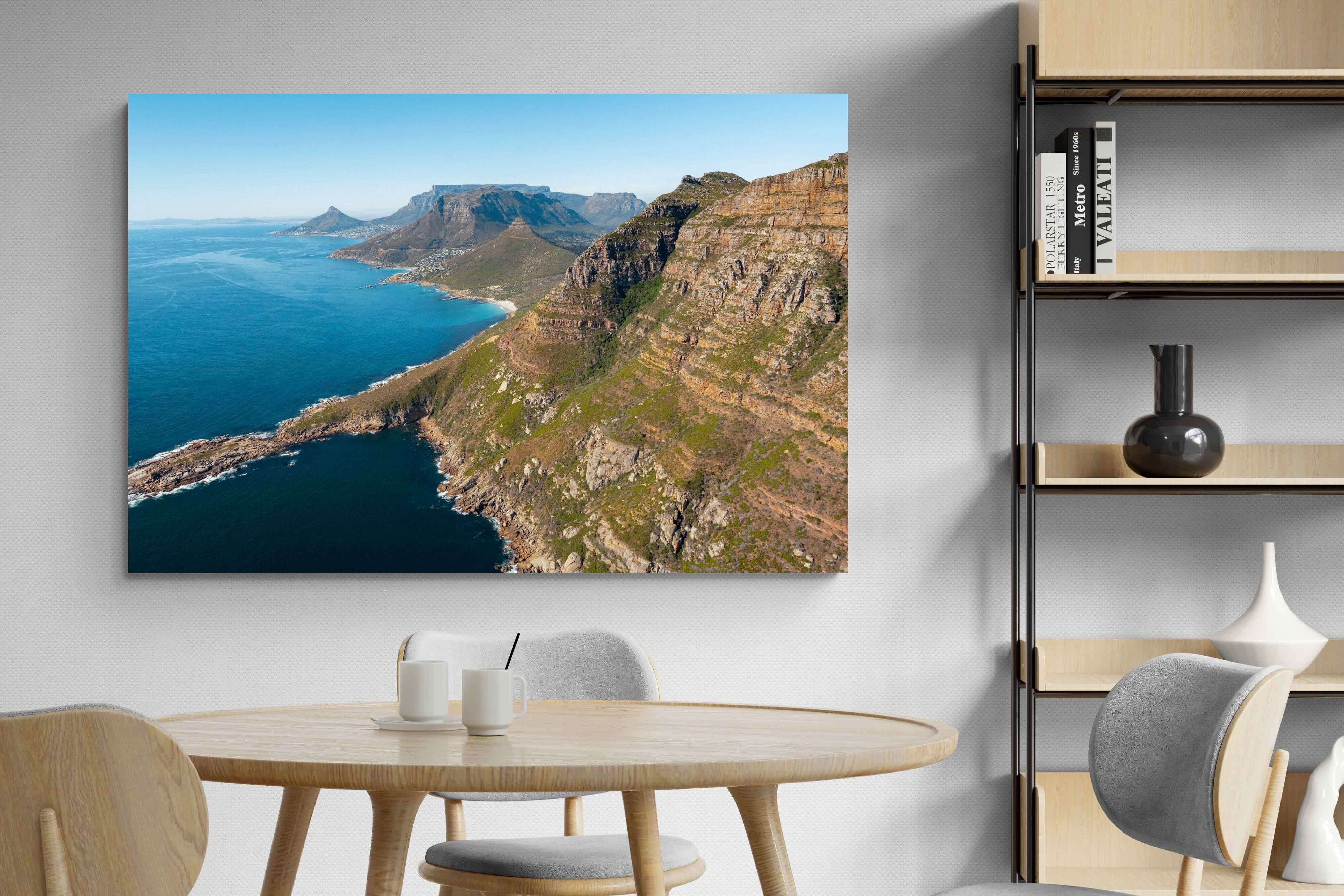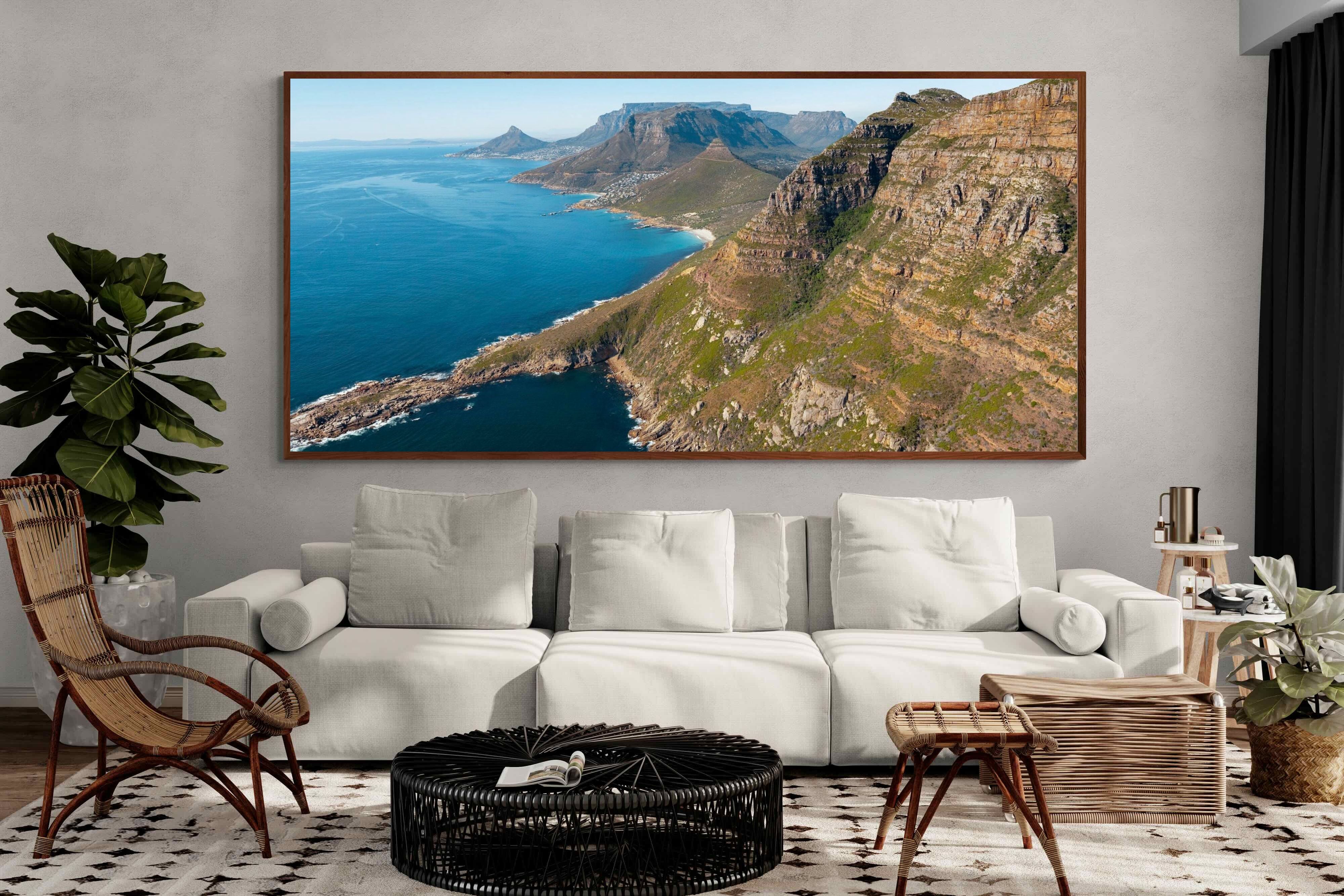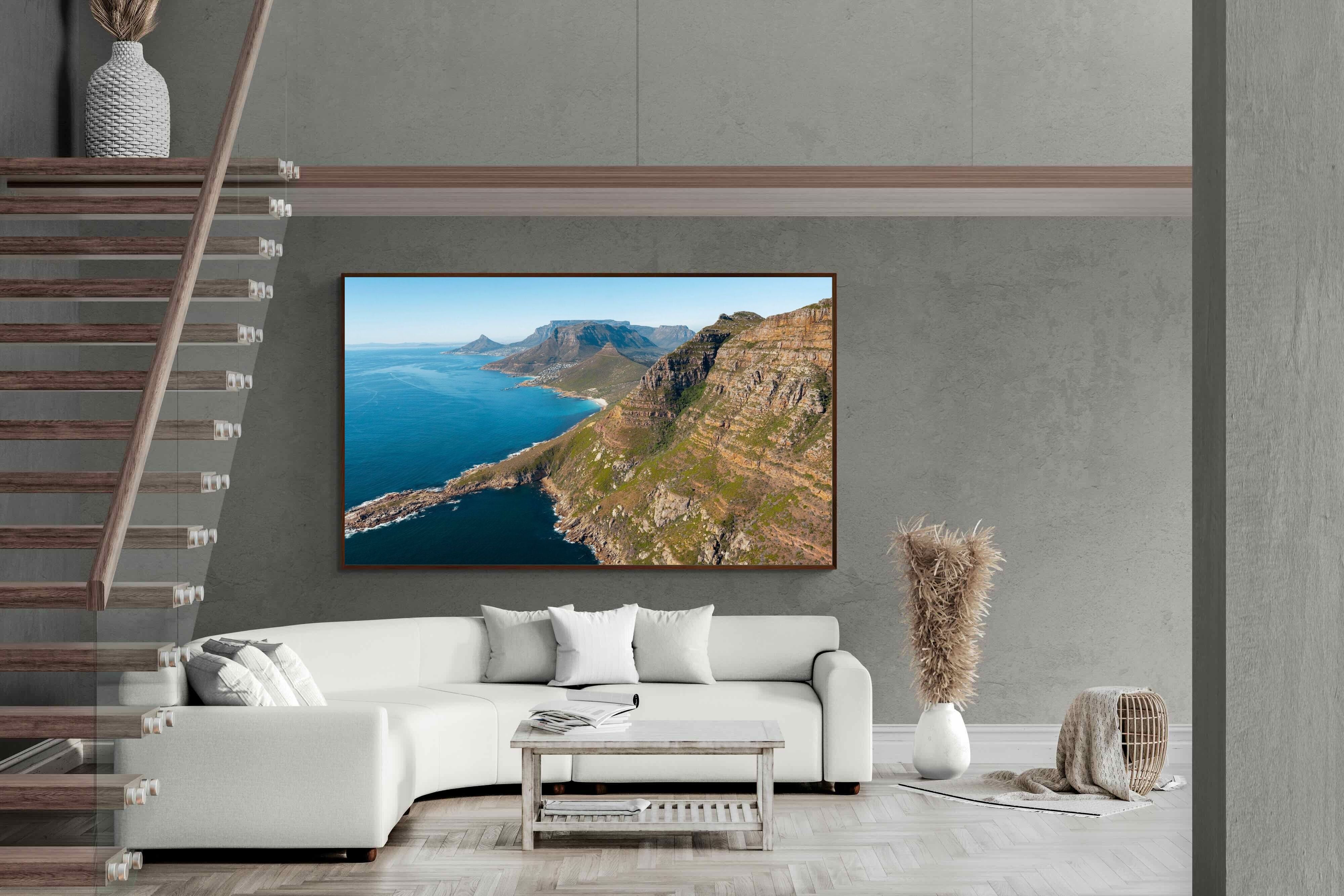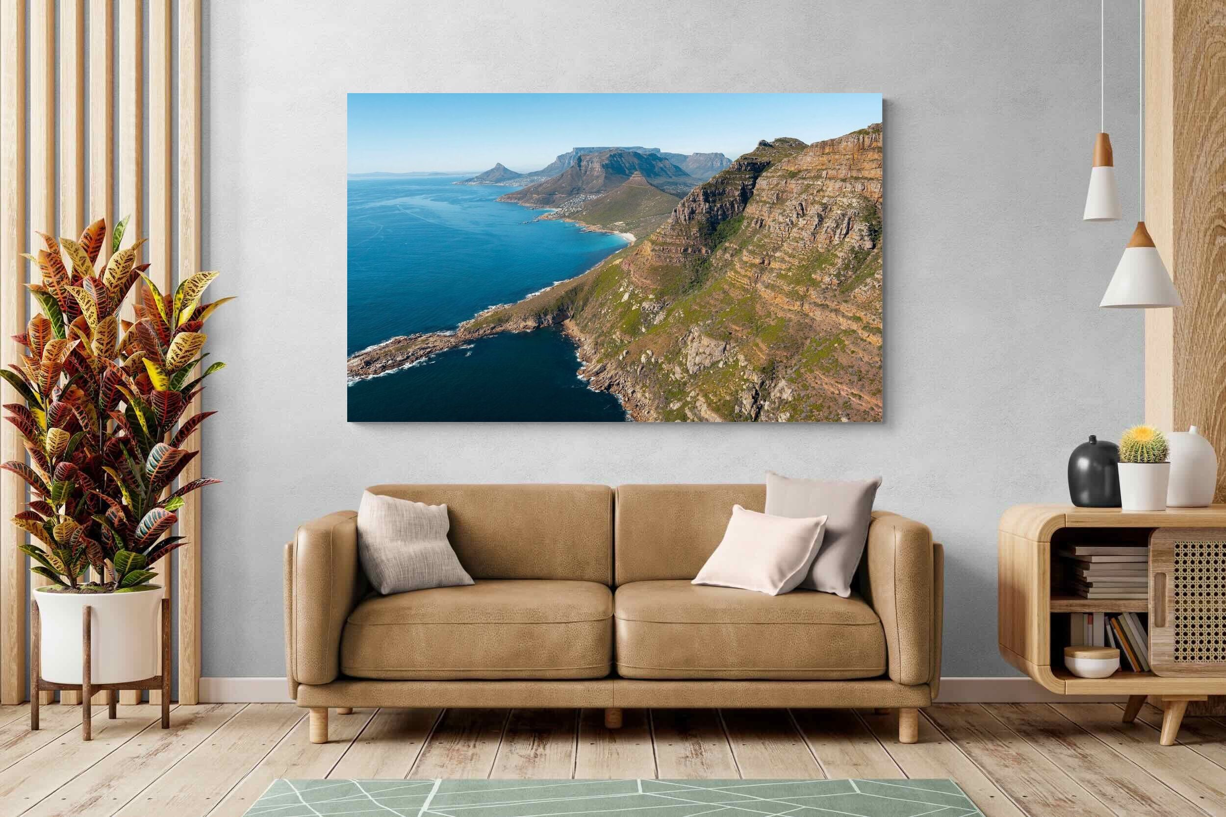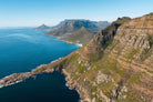 From high above the Atlantic, Cape Town’s coastline unfolds in dramatic layers of cliff, sea and distant mountains. The composition captures the immensity of the ocean against textured rock faces and scattered coastal settlements. Deep cobalt water contrasts with sunlit stone, creating a commanding visual presence. Perfect for large statement walls, this piece suits executive offices, architectural homes or hospitality environments looking to showcase the scale and beauty of the Cape Peninsula.