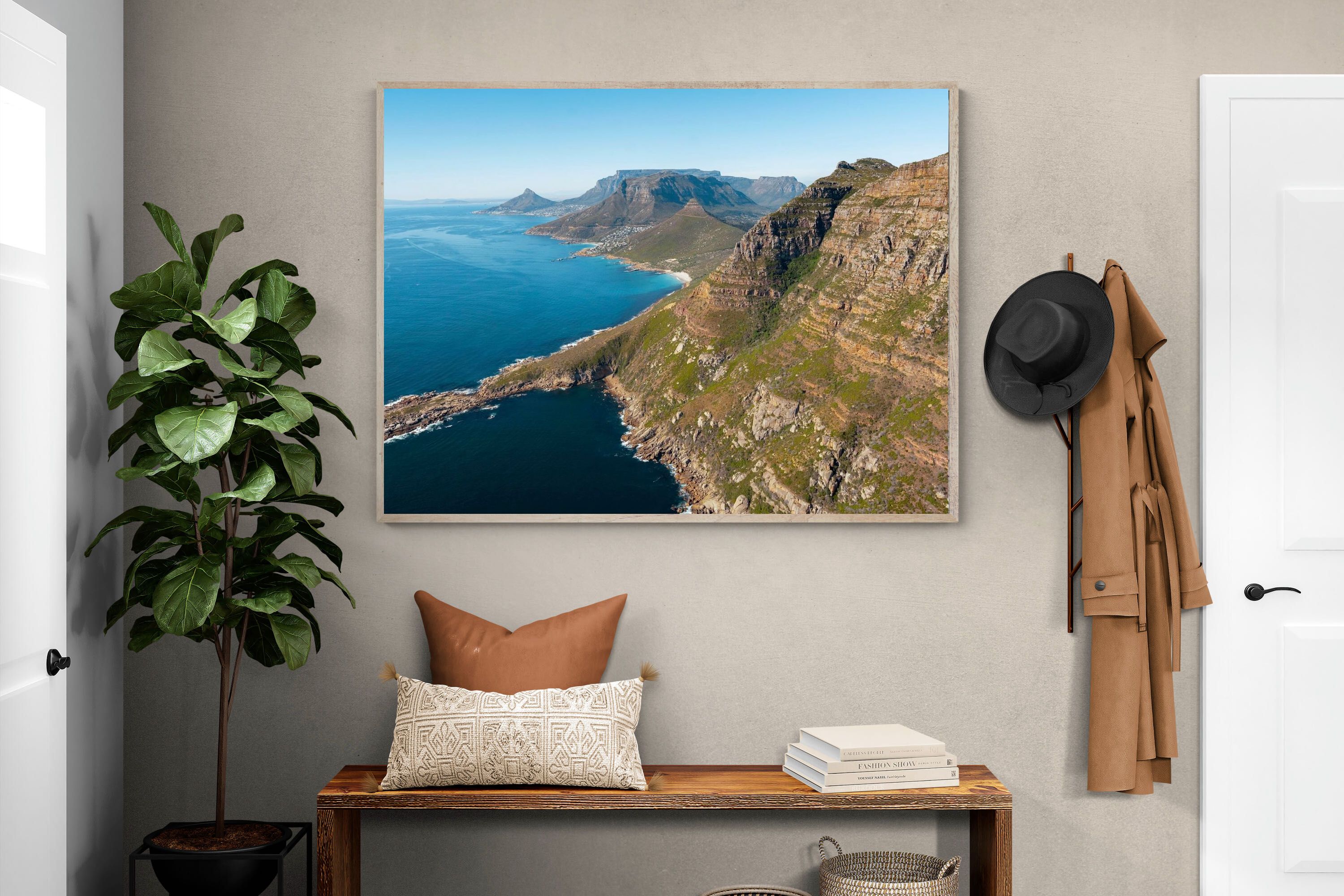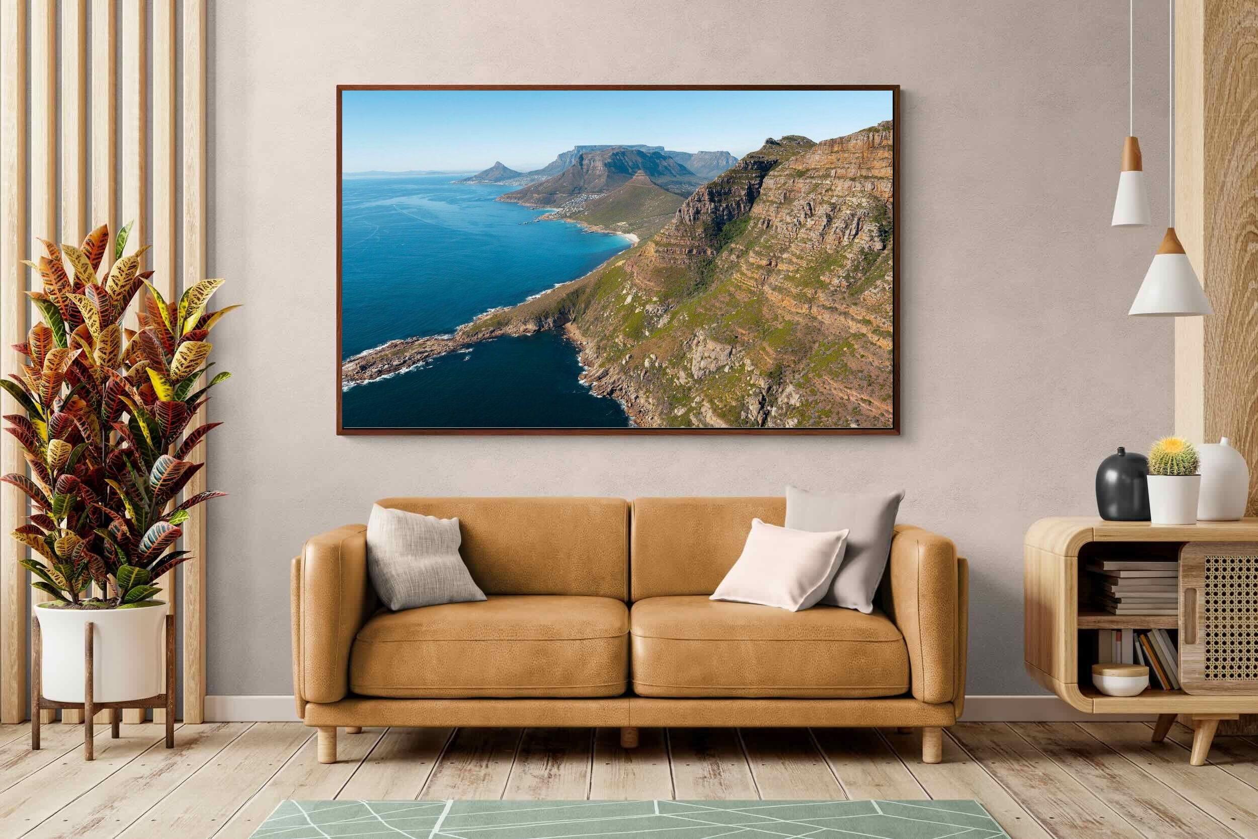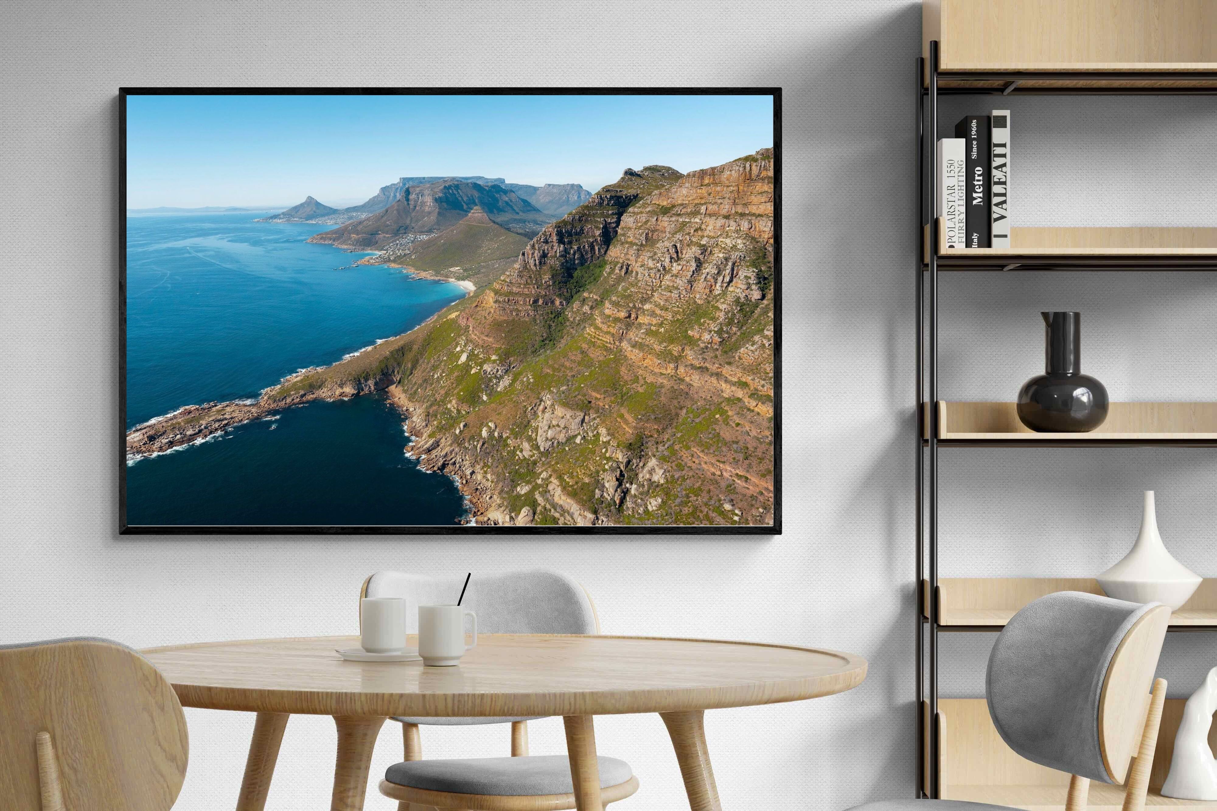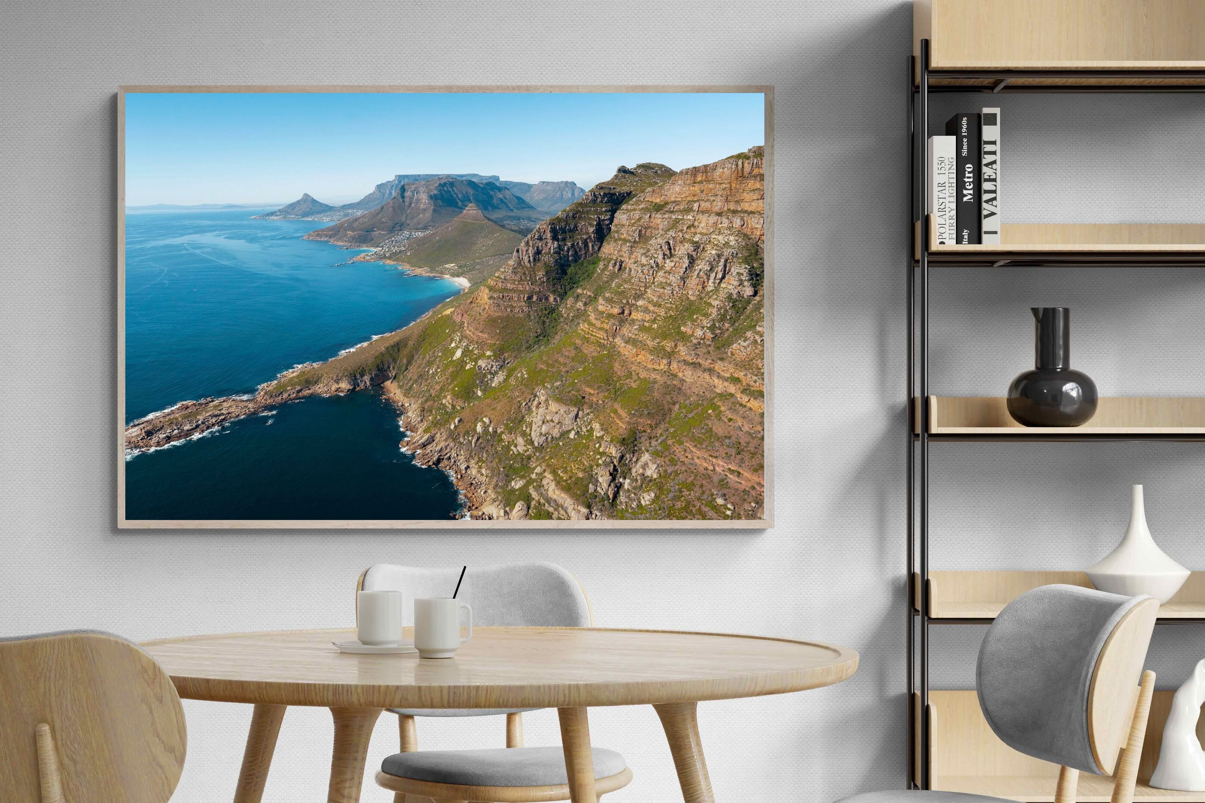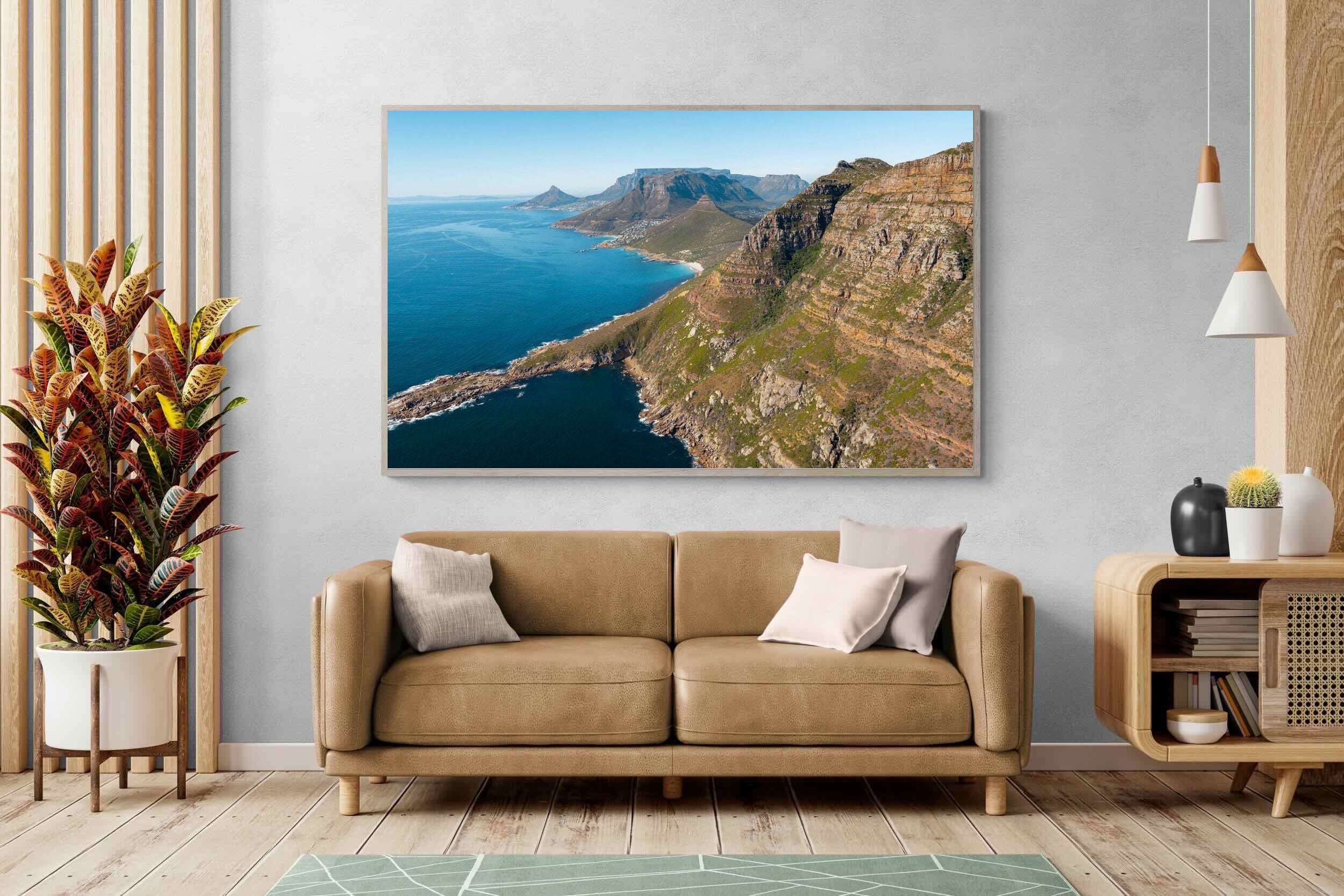 From high above the Atlantic, Cape Town’s coastline unfolds in dramatic layers of cliff, sea and distant mountains. The composition captures the immensity of the ocean against textured rock faces and scattered coastal settlements. Deep cobalt water contrasts with sunlit stone, creating a commanding visual presence. Perfect for large statement walls, this piece suits executive offices, architectural homes or hospitality environments looking to showcase the scale and beauty of the Cape Peninsula.