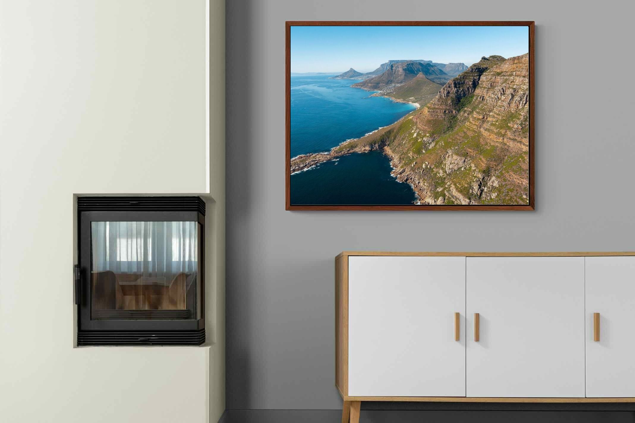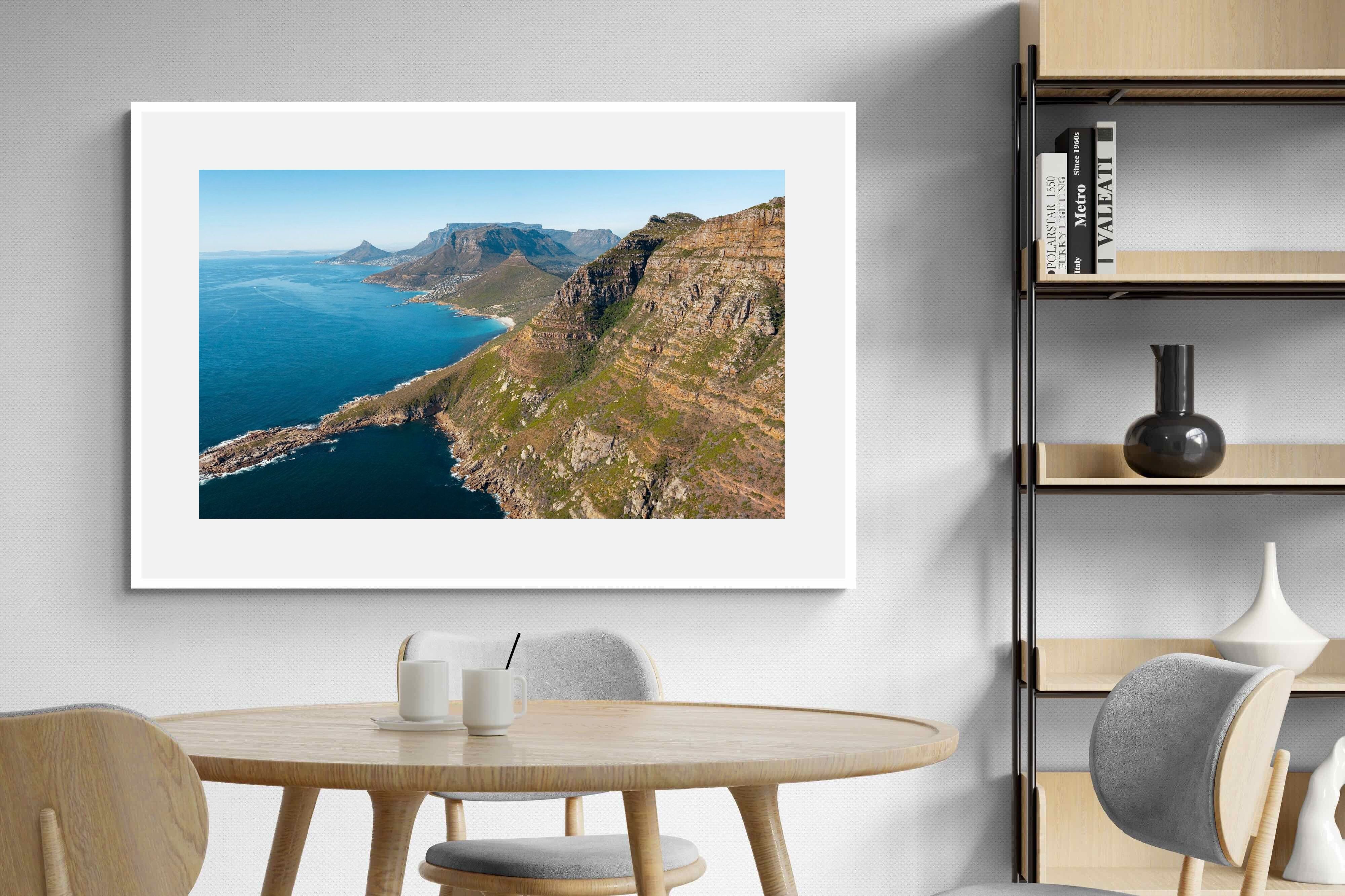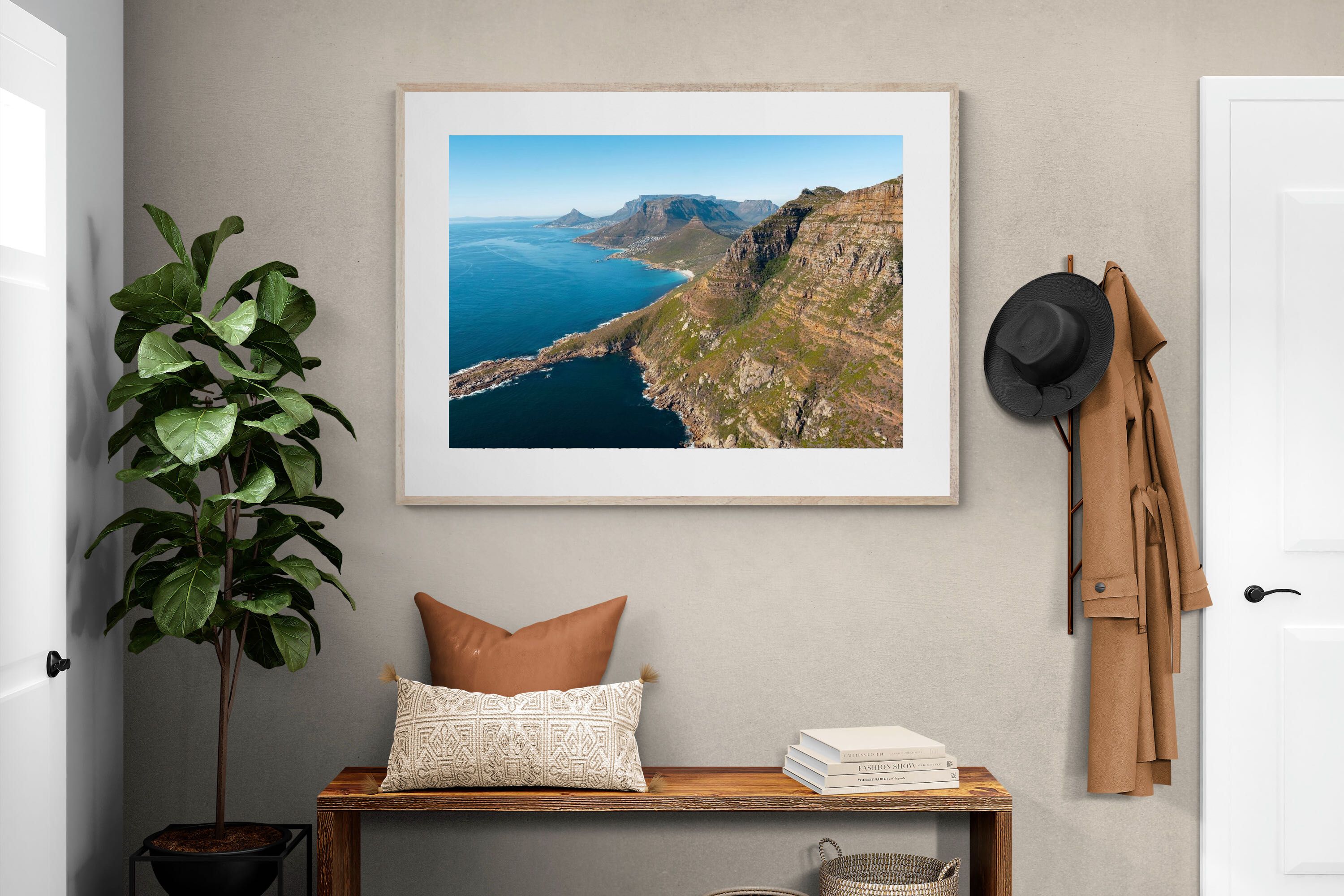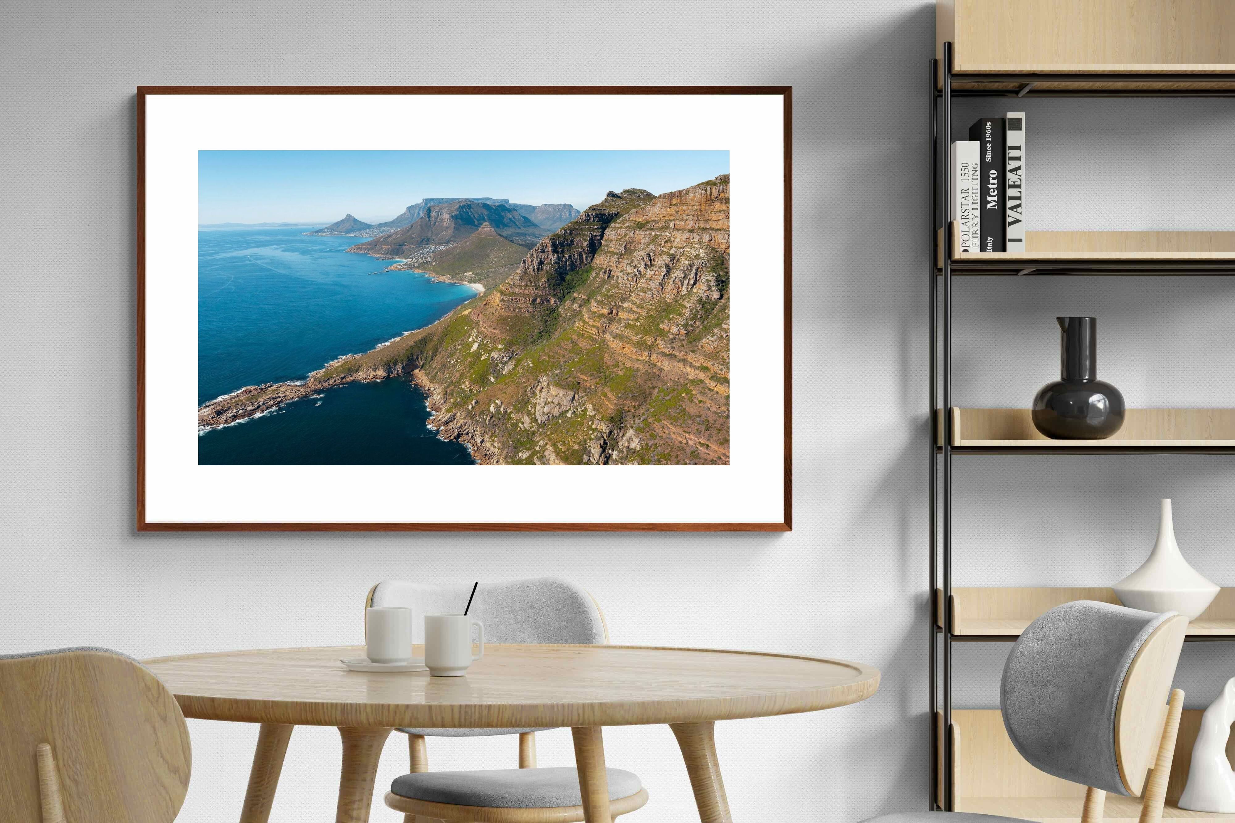 From high above the Atlantic, Cape Town’s coastline unfolds in dramatic layers of cliff, sea and distant mountains. The composition captures the immensity of the ocean against textured rock faces and scattered coastal settlements. Deep cobalt water contrasts with sunlit stone, creating a commanding visual presence. Perfect for large statement walls, this piece suits executive offices, architectural homes or hospitality environments looking to showcase the scale and beauty of the Cape Peninsula.
