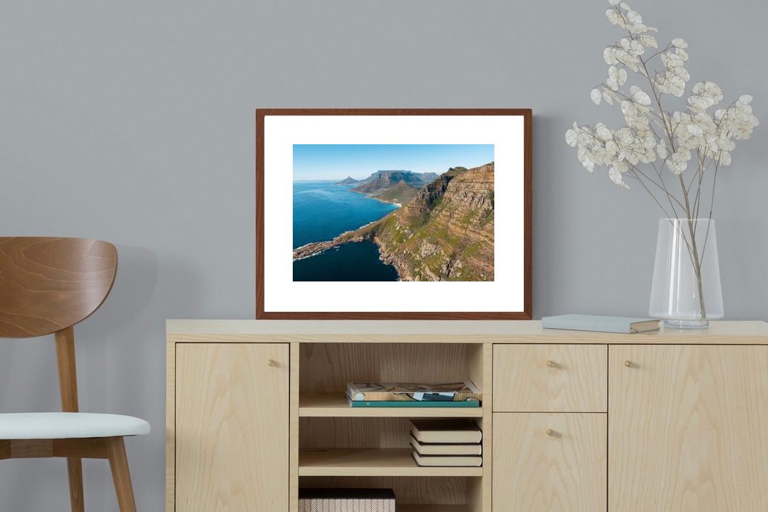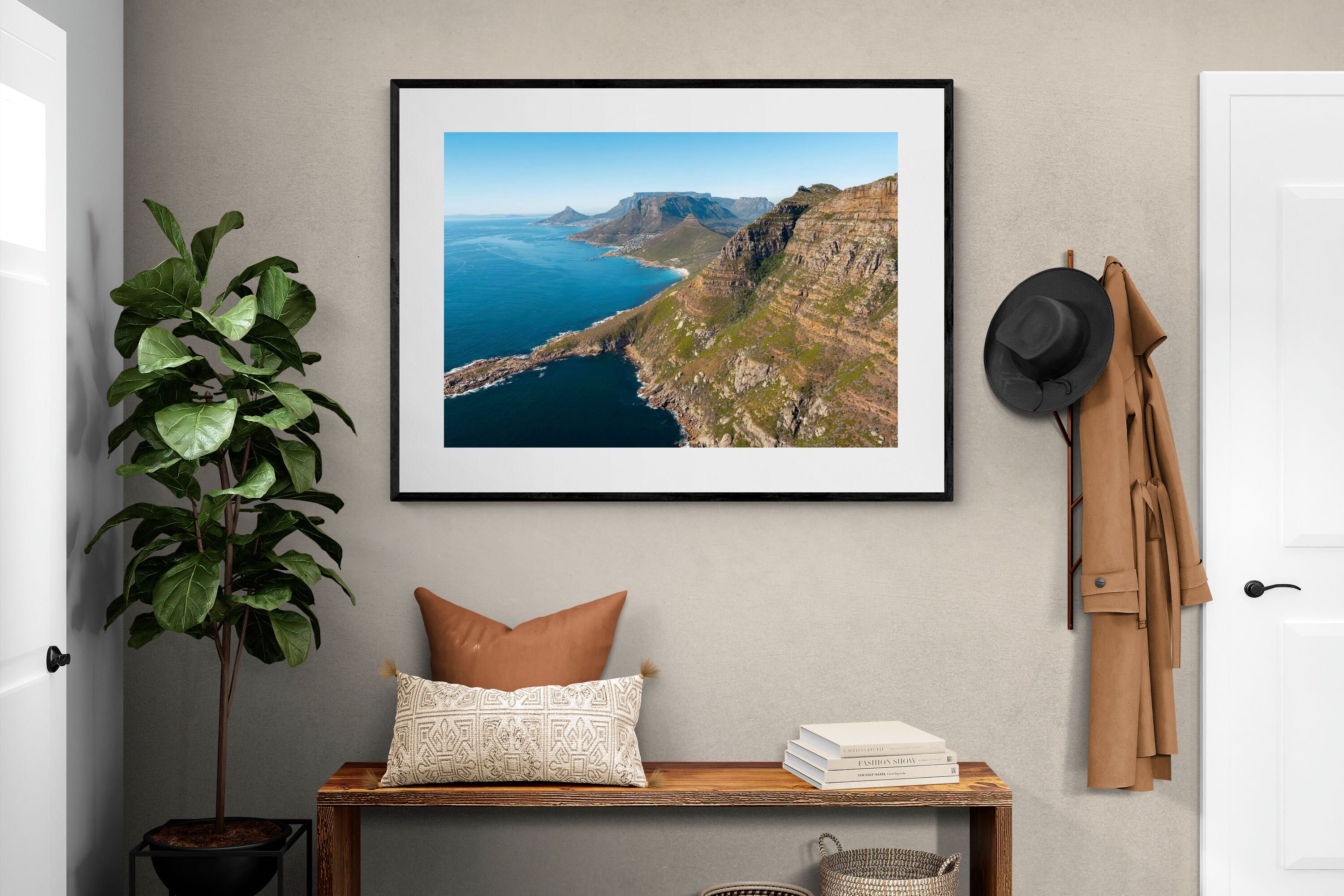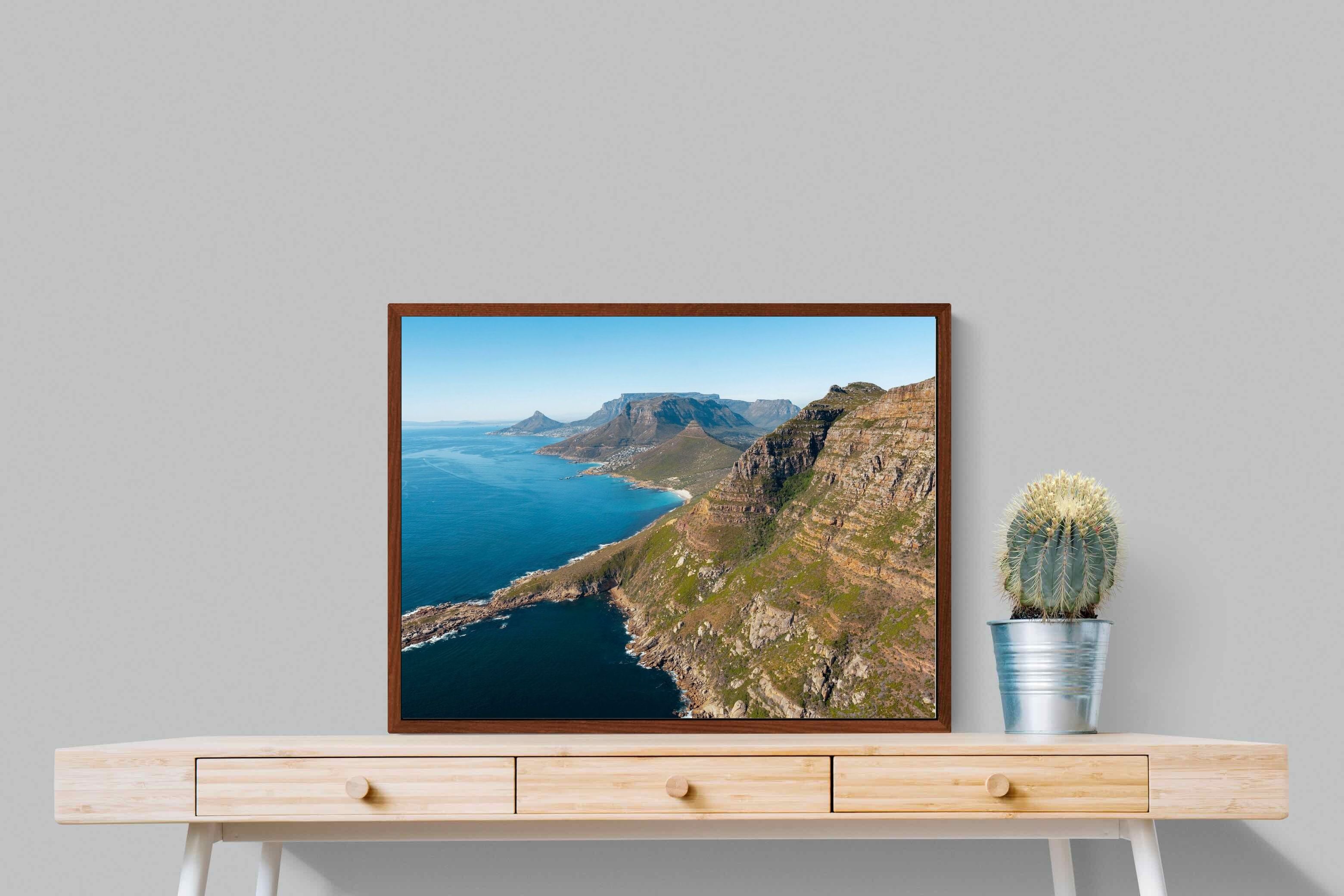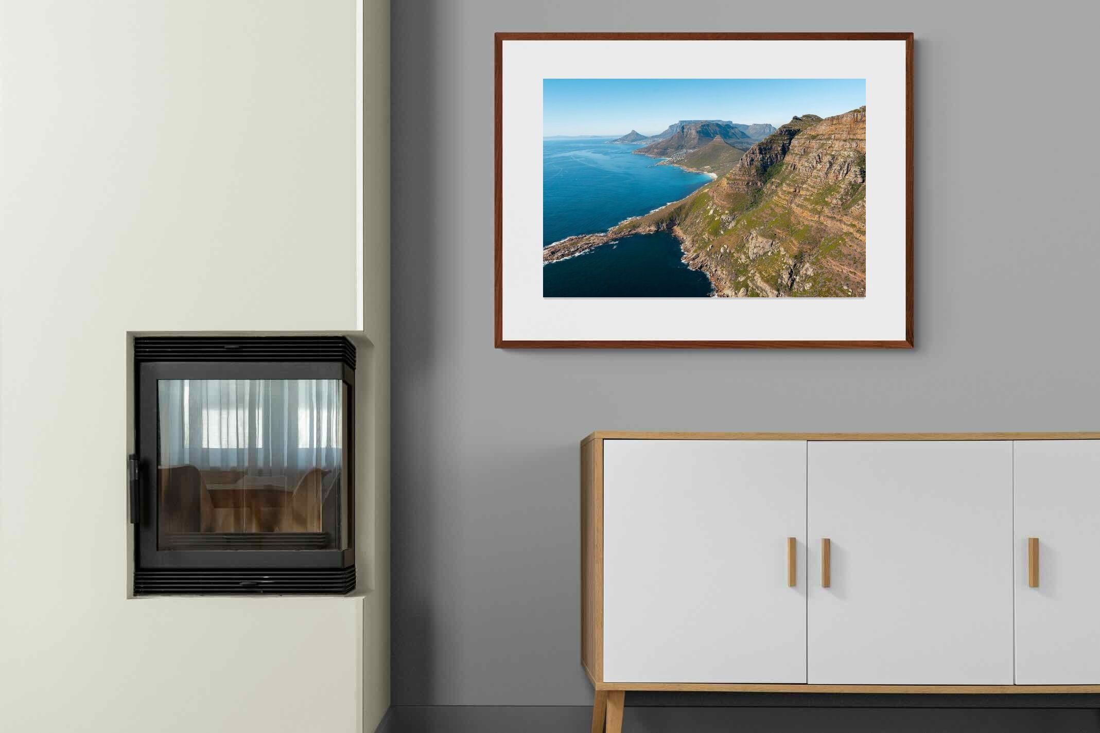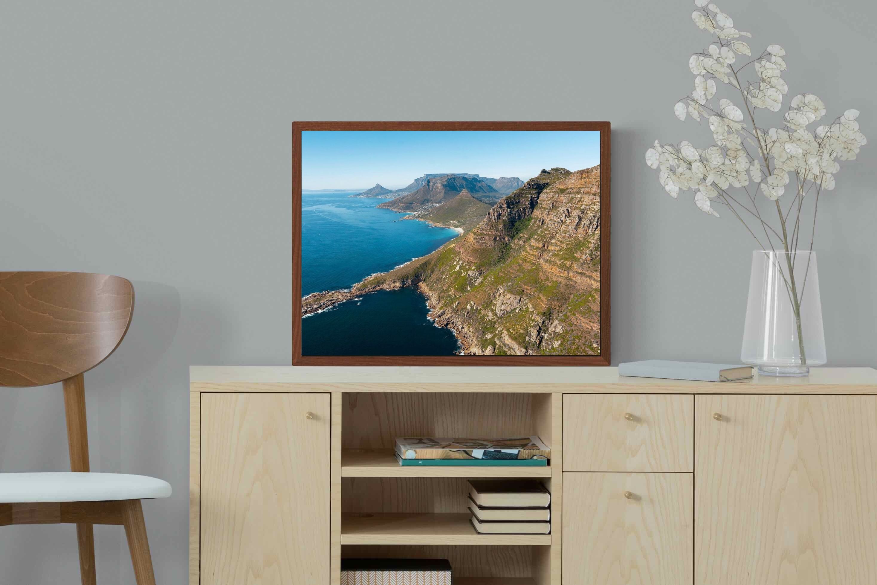 From high above the Atlantic, Cape Town’s coastline unfolds in dramatic layers of cliff, sea and distant mountains. The composition captures the immensity of the ocean against textured rock faces and scattered coastal settlements. Deep cobalt water contrasts with sunlit stone, creating a commanding visual presence. Perfect for large statement walls, this piece suits executive offices, architectural homes or hospitality environments looking to showcase the scale and beauty of the Cape Peninsula.