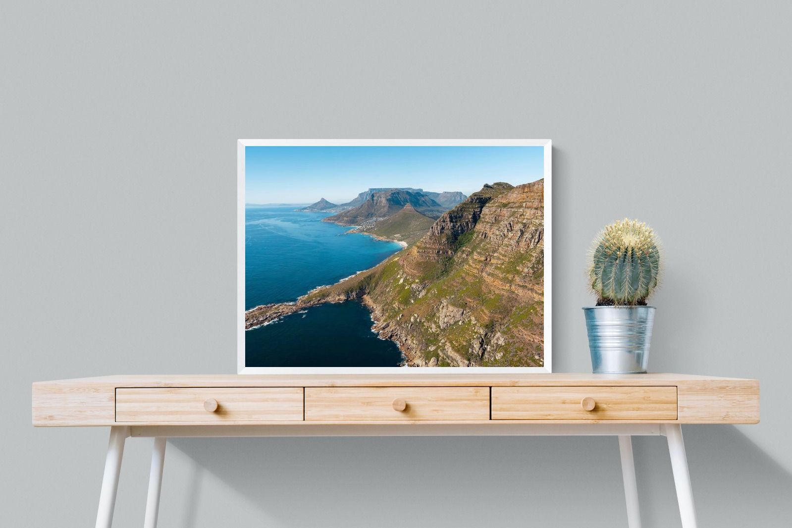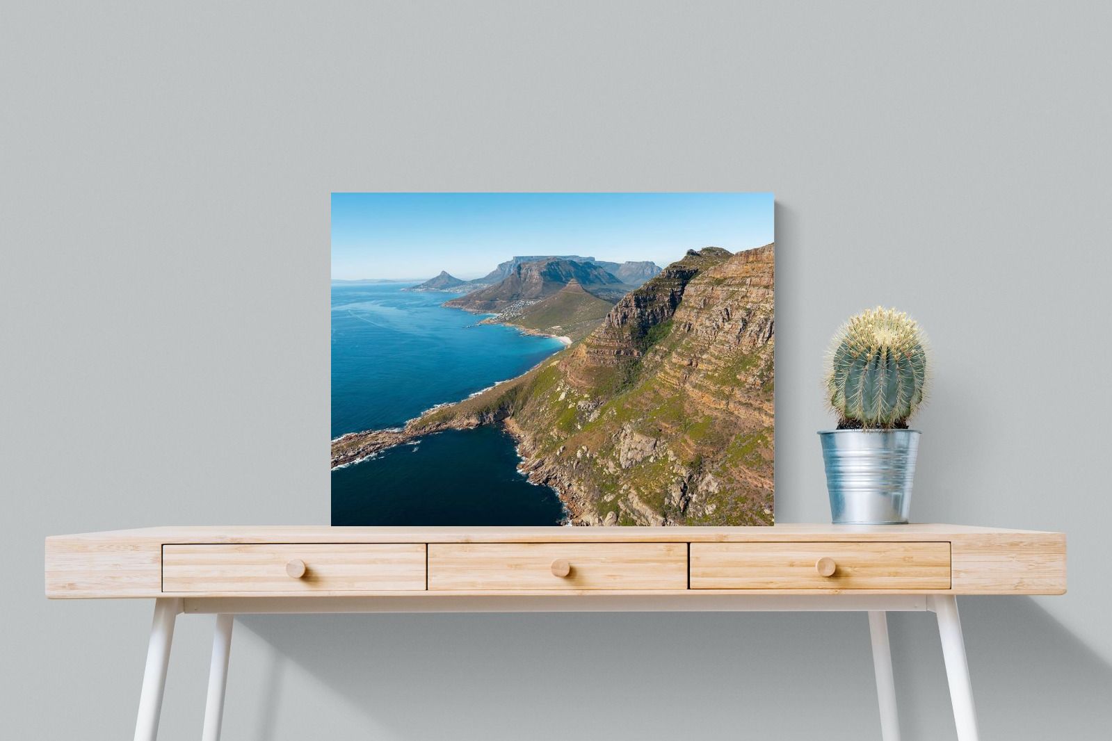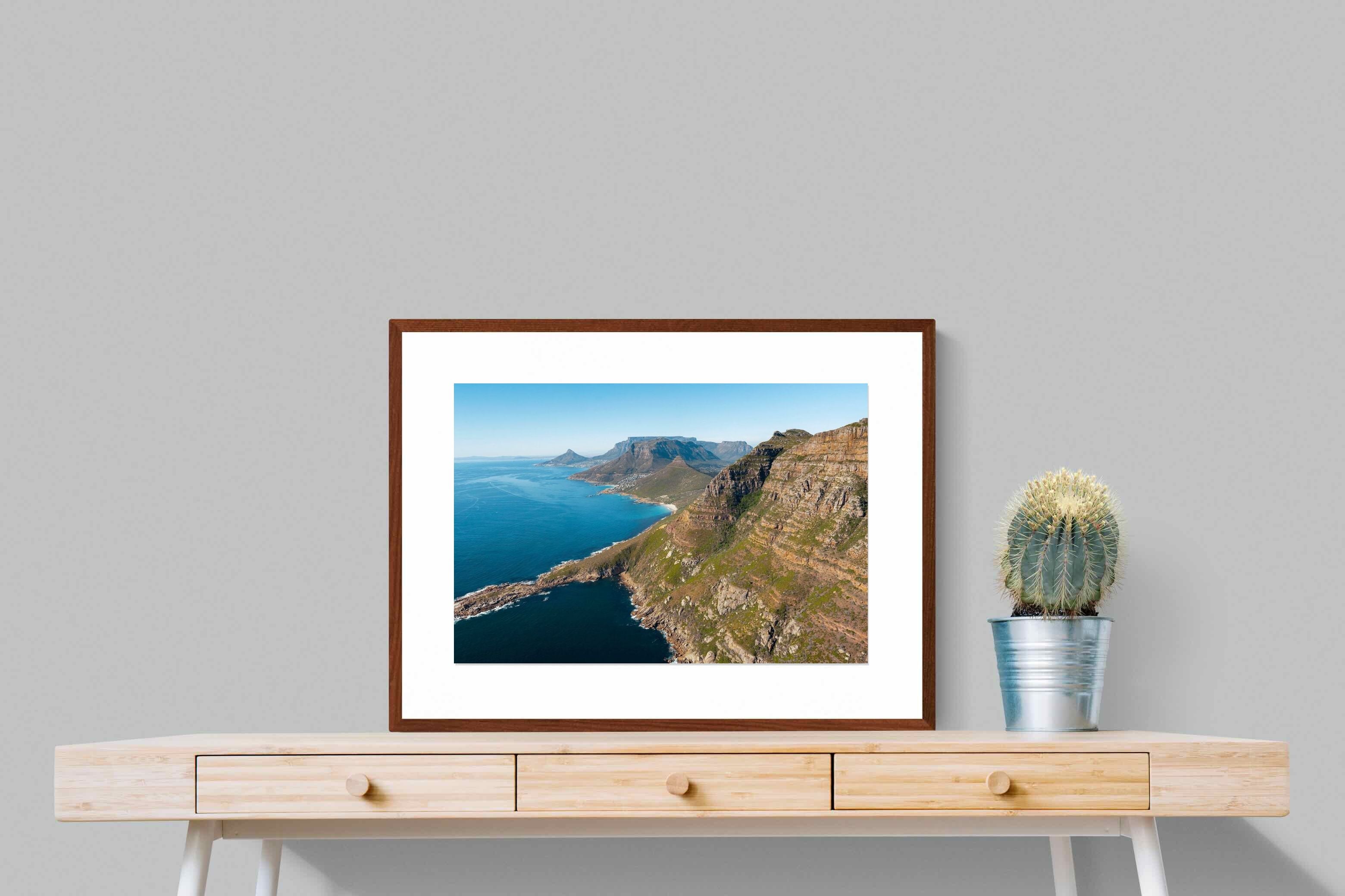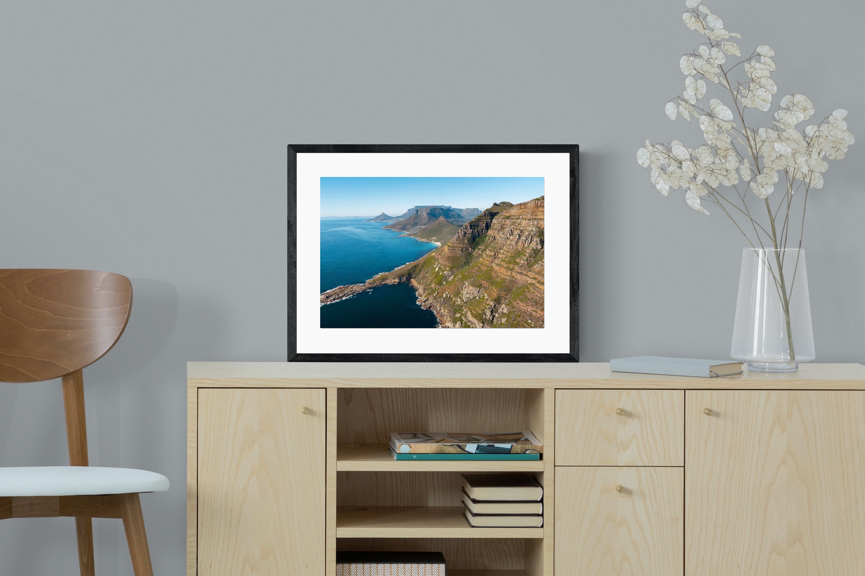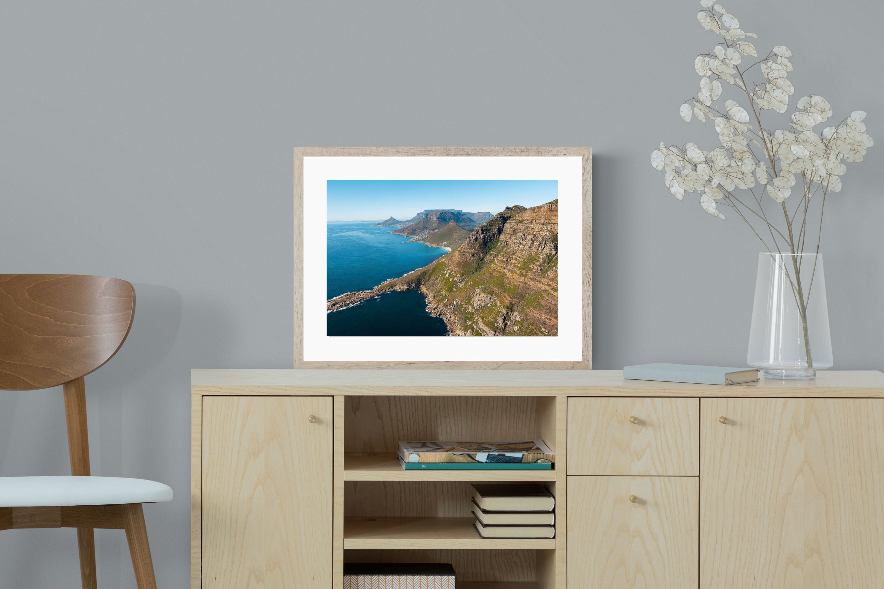 From high above the Atlantic, Cape Town’s coastline unfolds in dramatic layers of cliff, sea and distant mountains. The composition captures the immensity of the ocean against textured rock faces and scattered coastal settlements. Deep cobalt water contrasts with sunlit stone, creating a commanding visual presence. Perfect for large statement walls, this piece suits executive offices, architectural homes or hospitality environments looking to showcase the scale and beauty of the Cape Peninsula.