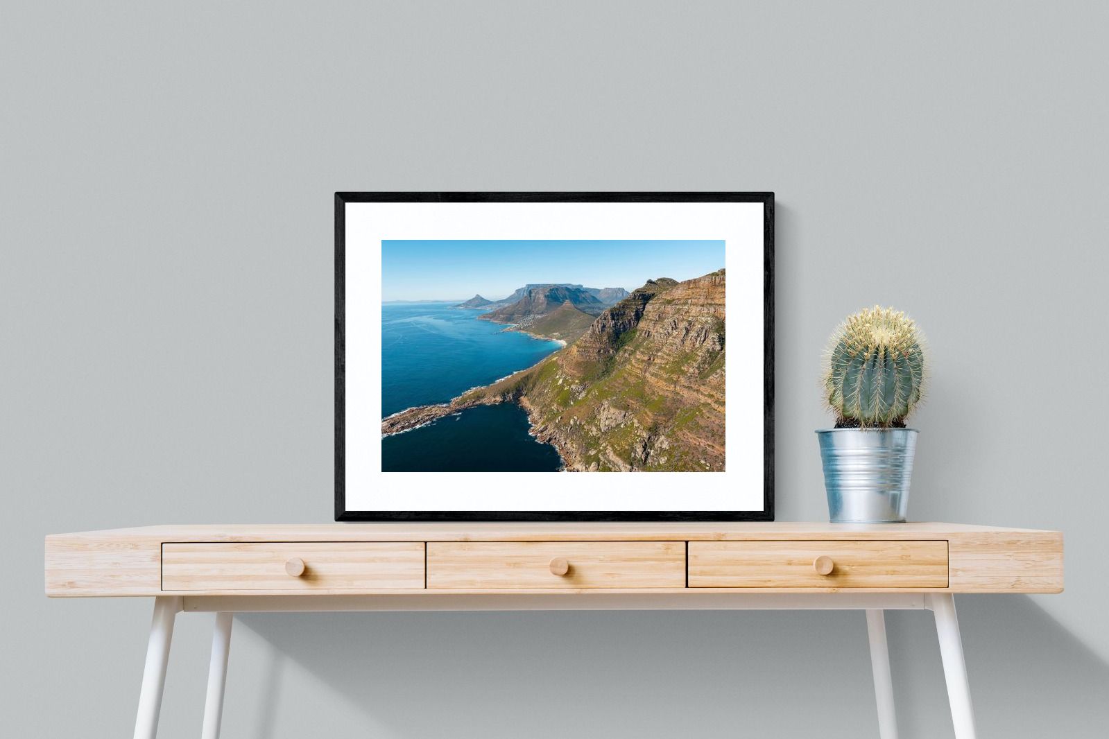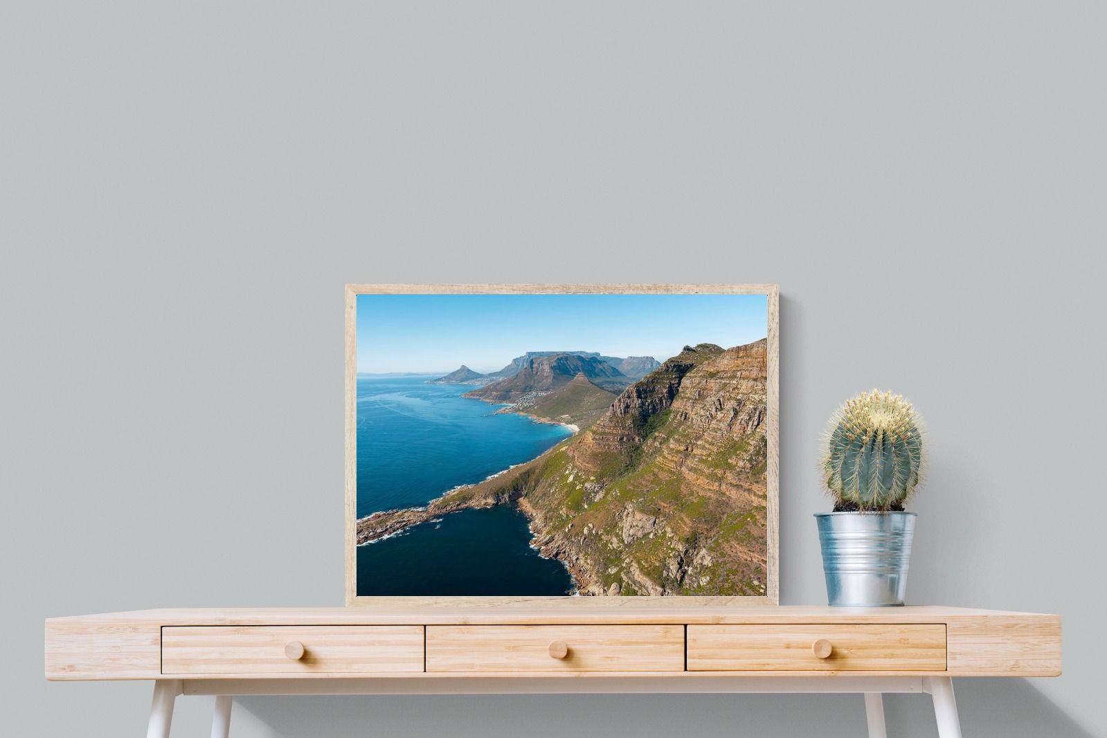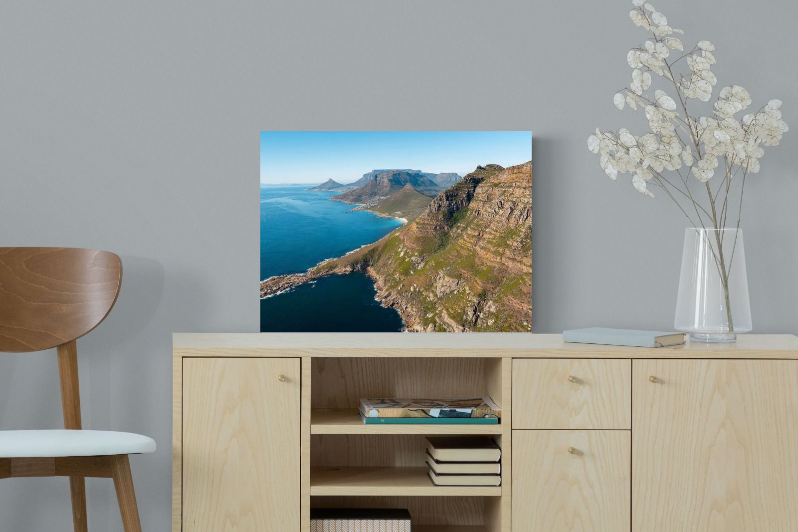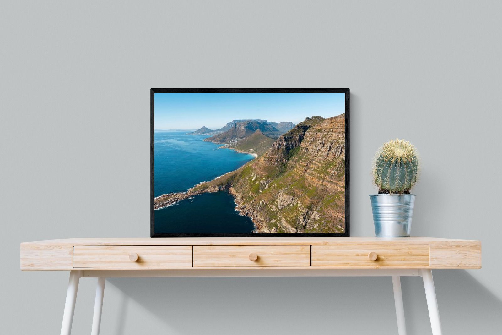 From high above the Atlantic, Cape Town’s coastline unfolds in dramatic layers of cliff, sea and distant mountains. The composition captures the immensity of the ocean against textured rock faces and scattered coastal settlements. Deep cobalt water contrasts with sunlit stone, creating a commanding visual presence. Perfect for large statement walls, this piece suits executive offices, architectural homes or hospitality environments looking to showcase the scale and beauty of the Cape Peninsula.