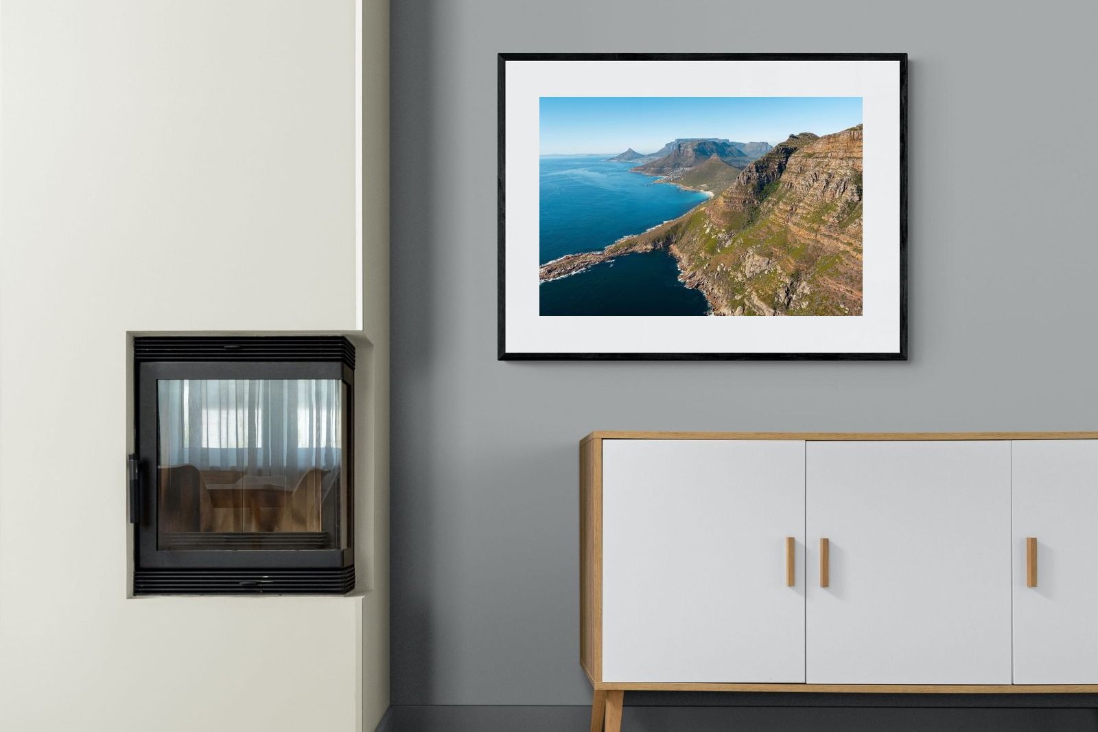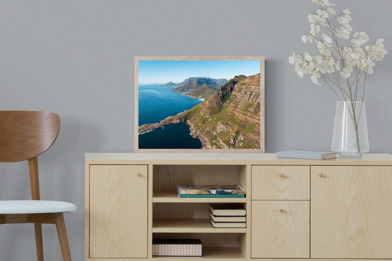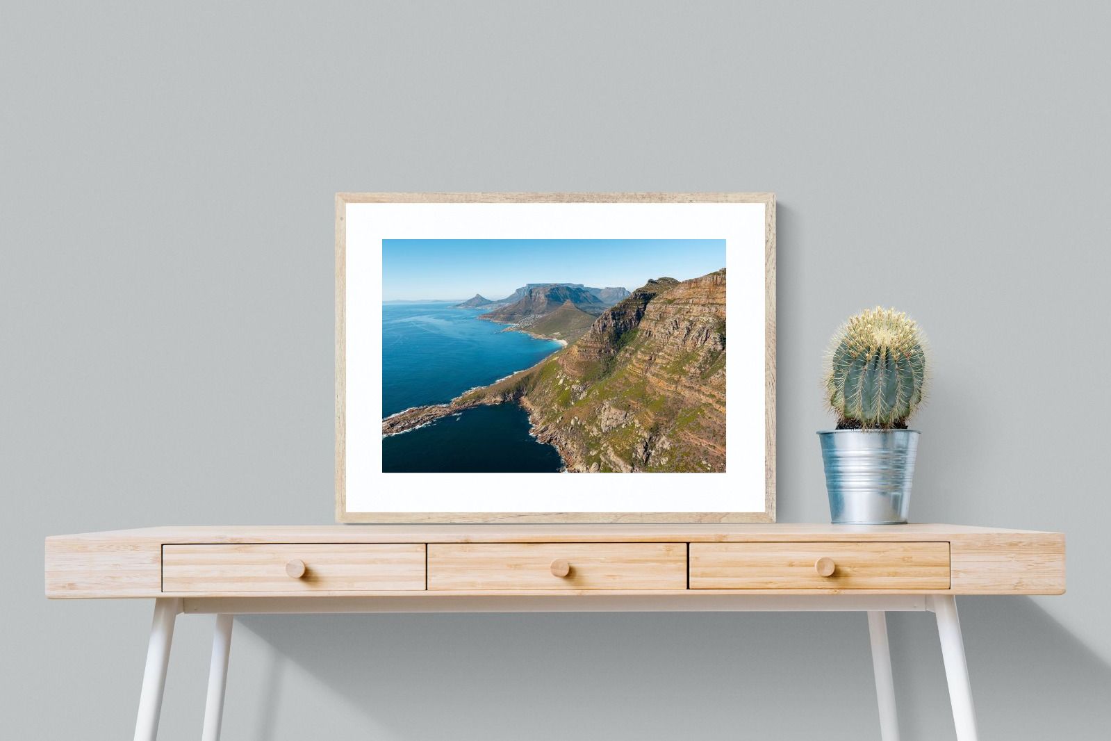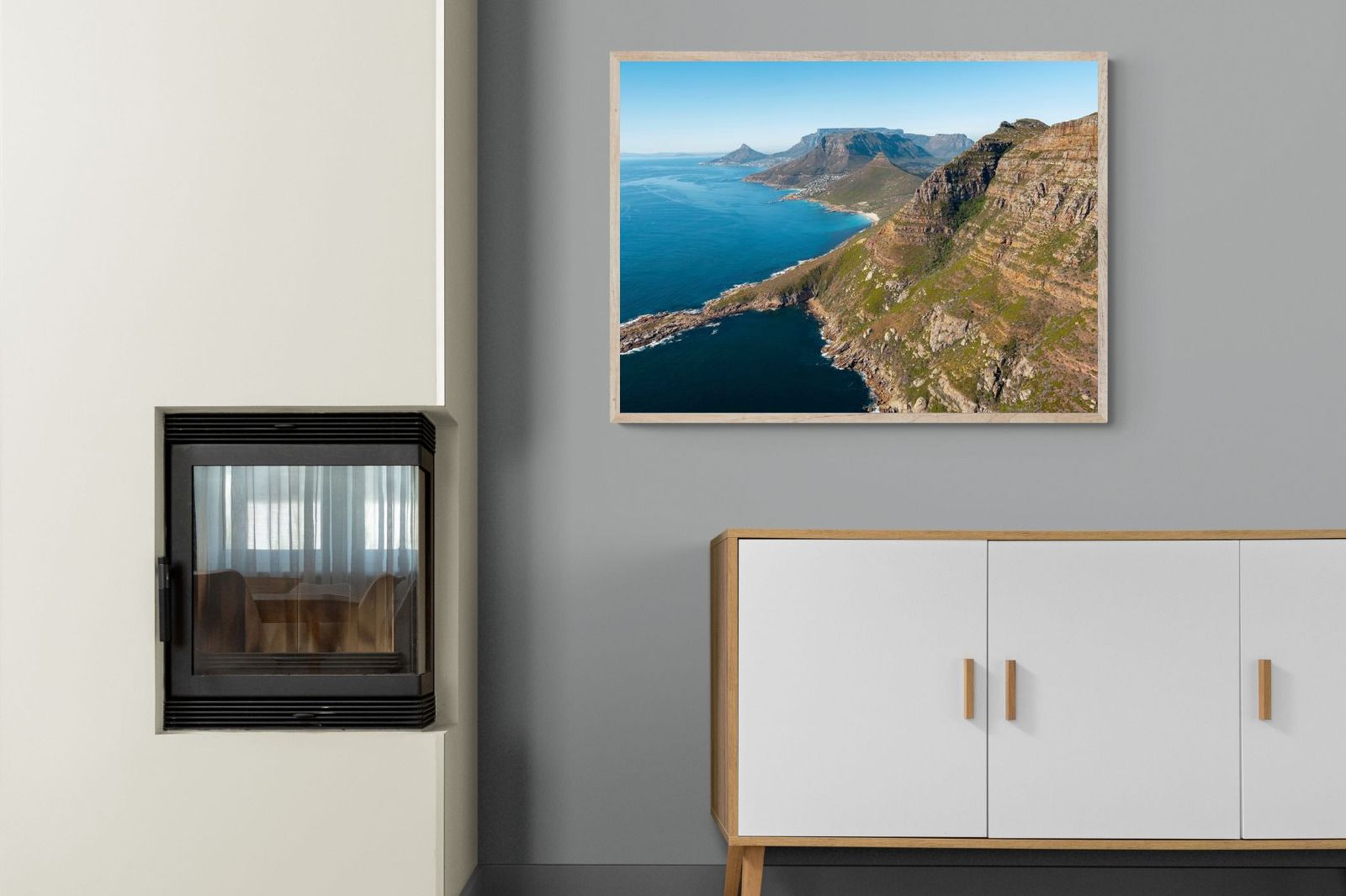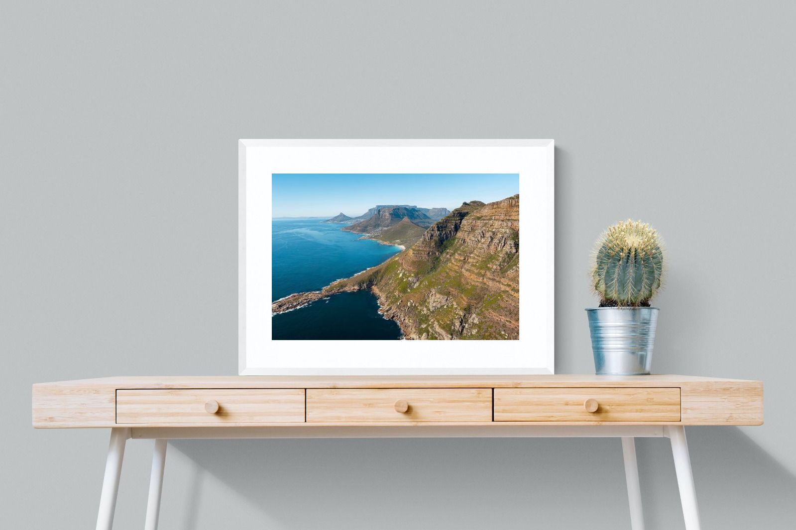 From high above the Atlantic, Cape Town’s coastline unfolds in dramatic layers of cliff, sea and distant mountains. The composition captures the immensity of the ocean against textured rock faces and scattered coastal settlements. Deep cobalt water contrasts with sunlit stone, creating a commanding visual presence. Perfect for large statement walls, this piece suits executive offices, architectural homes or hospitality environments looking to showcase the scale and beauty of the Cape Peninsula.