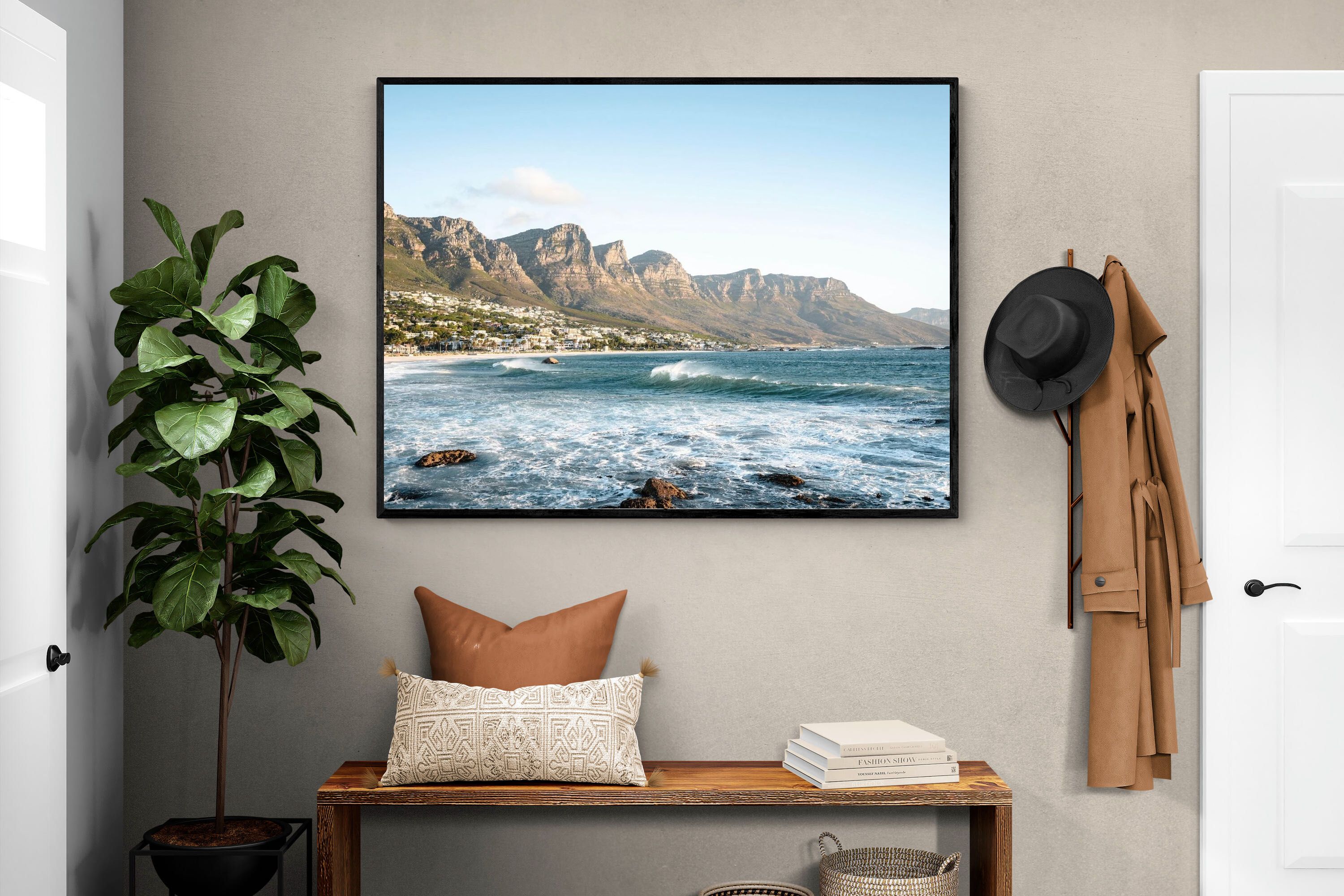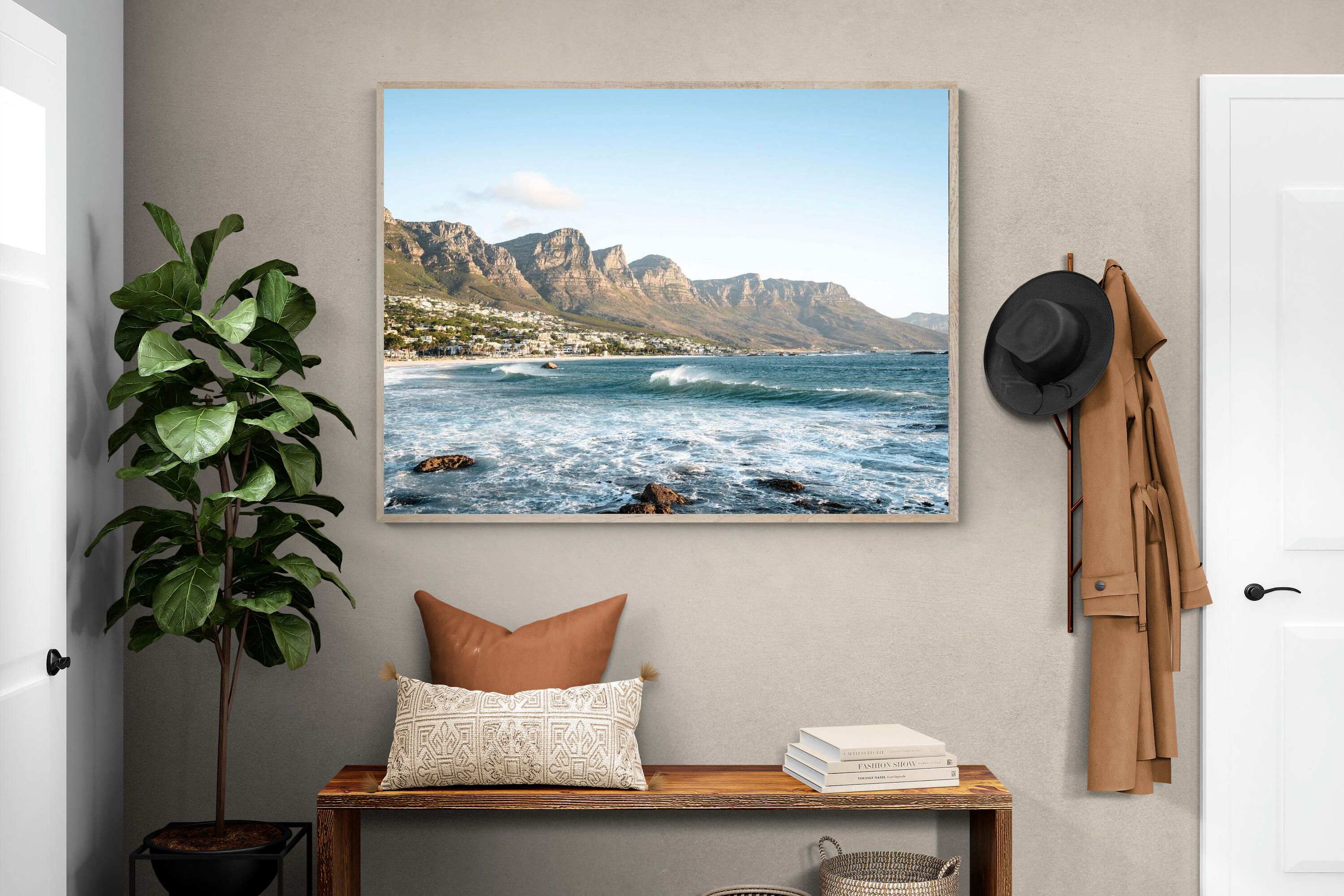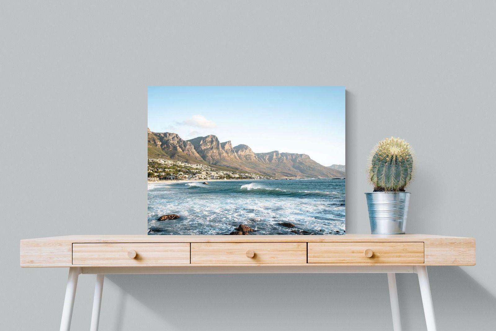 Waves roll in under the watch of the Twelve Apostles as the South Easter sweeps across Camps Bay. The energy of the Atlantic contrasts beautifully with the ordered line of beachfront homes, capturing Cape Town’s dynamic coastal identity. Crisp blues and textured white surf create movement within the frame, making it a powerful feature piece for contemporary interiors. This artwork celebrates the elemental side of the city – bold, invigorating and unmistakably South African.