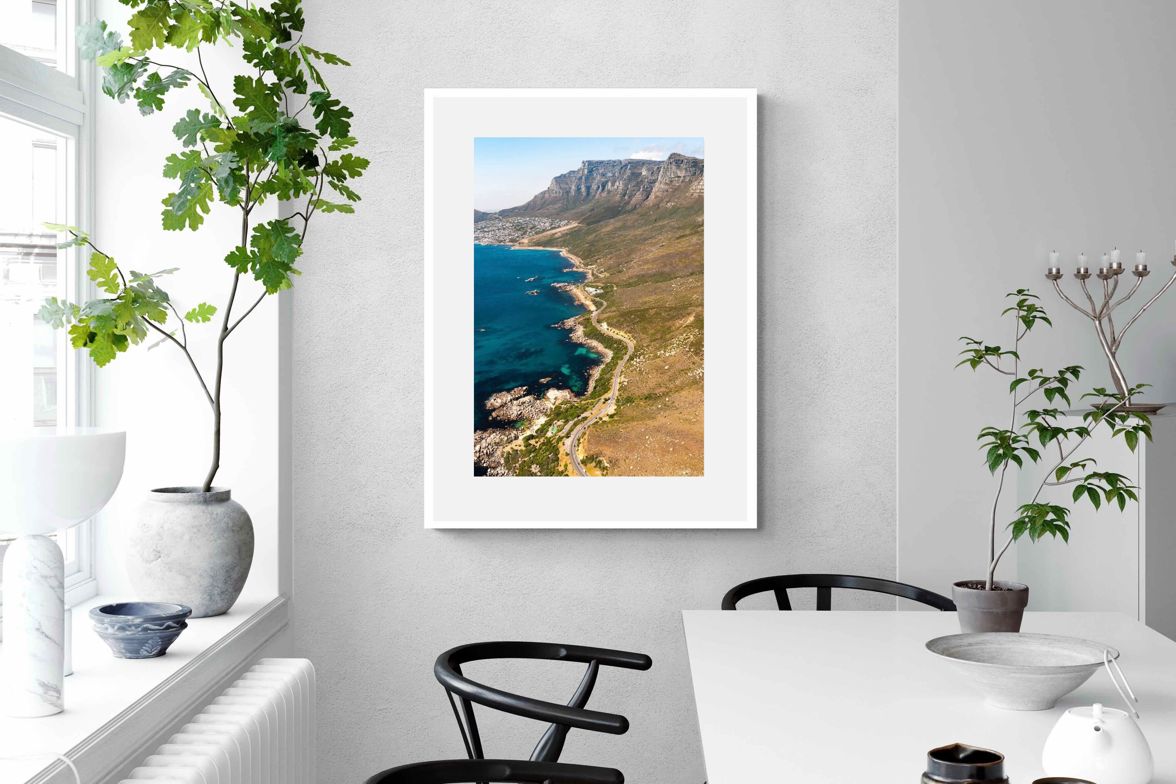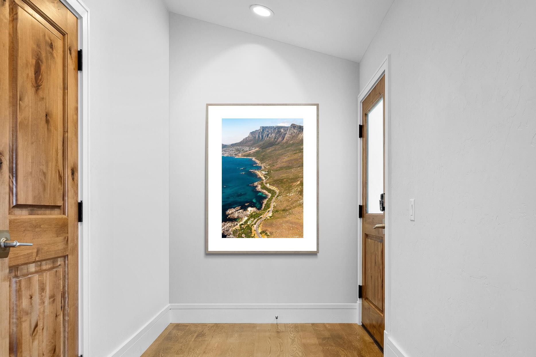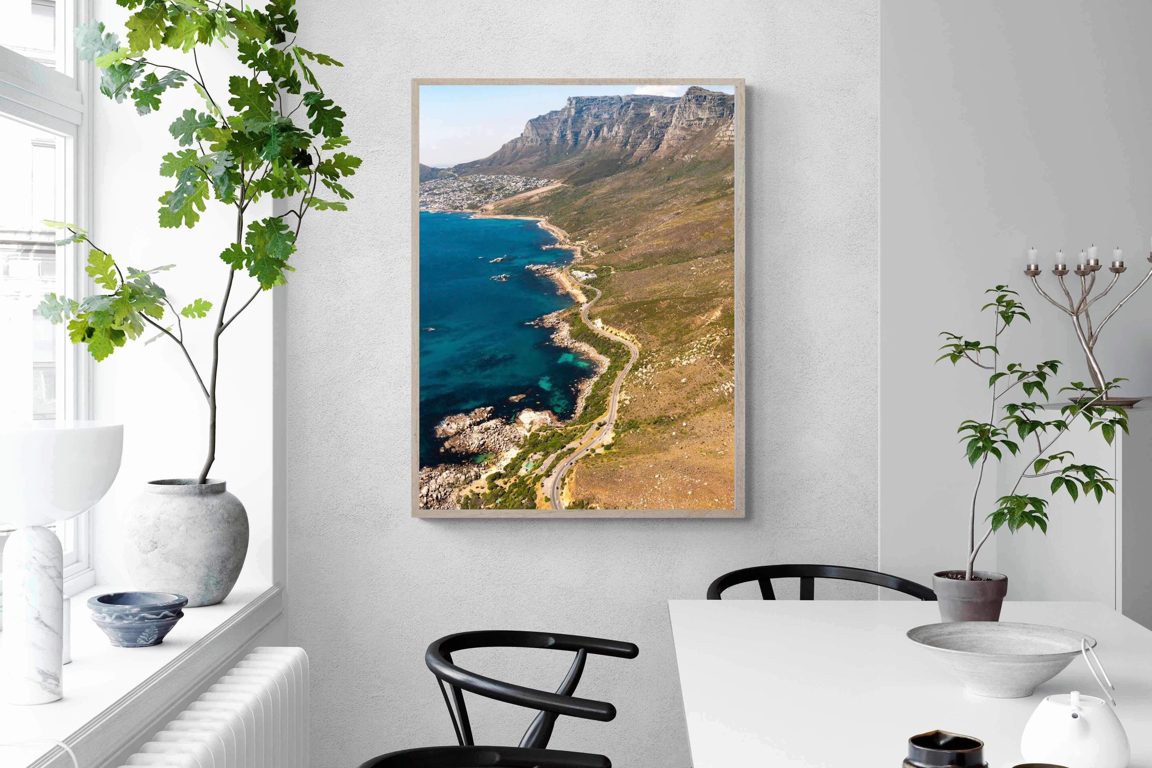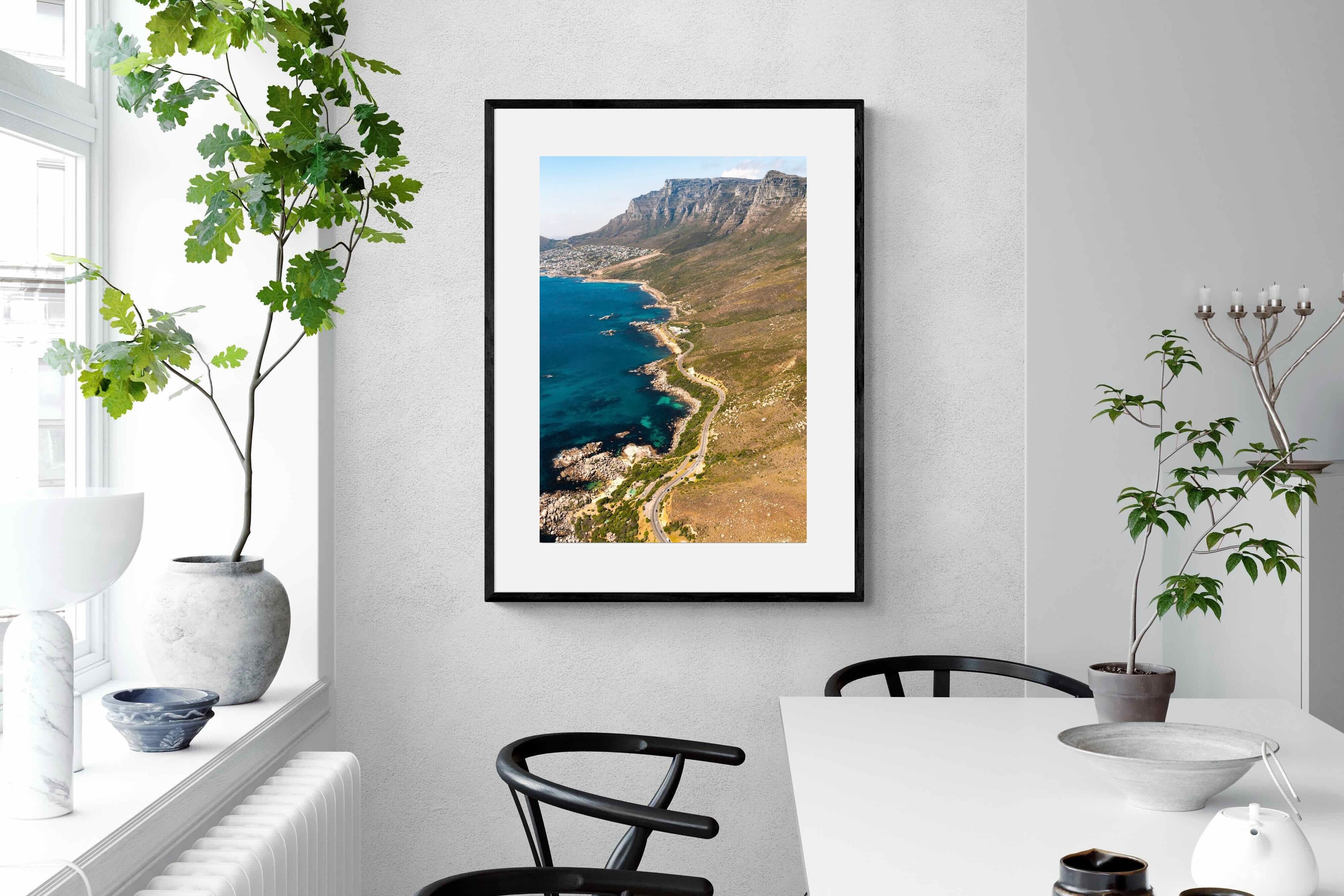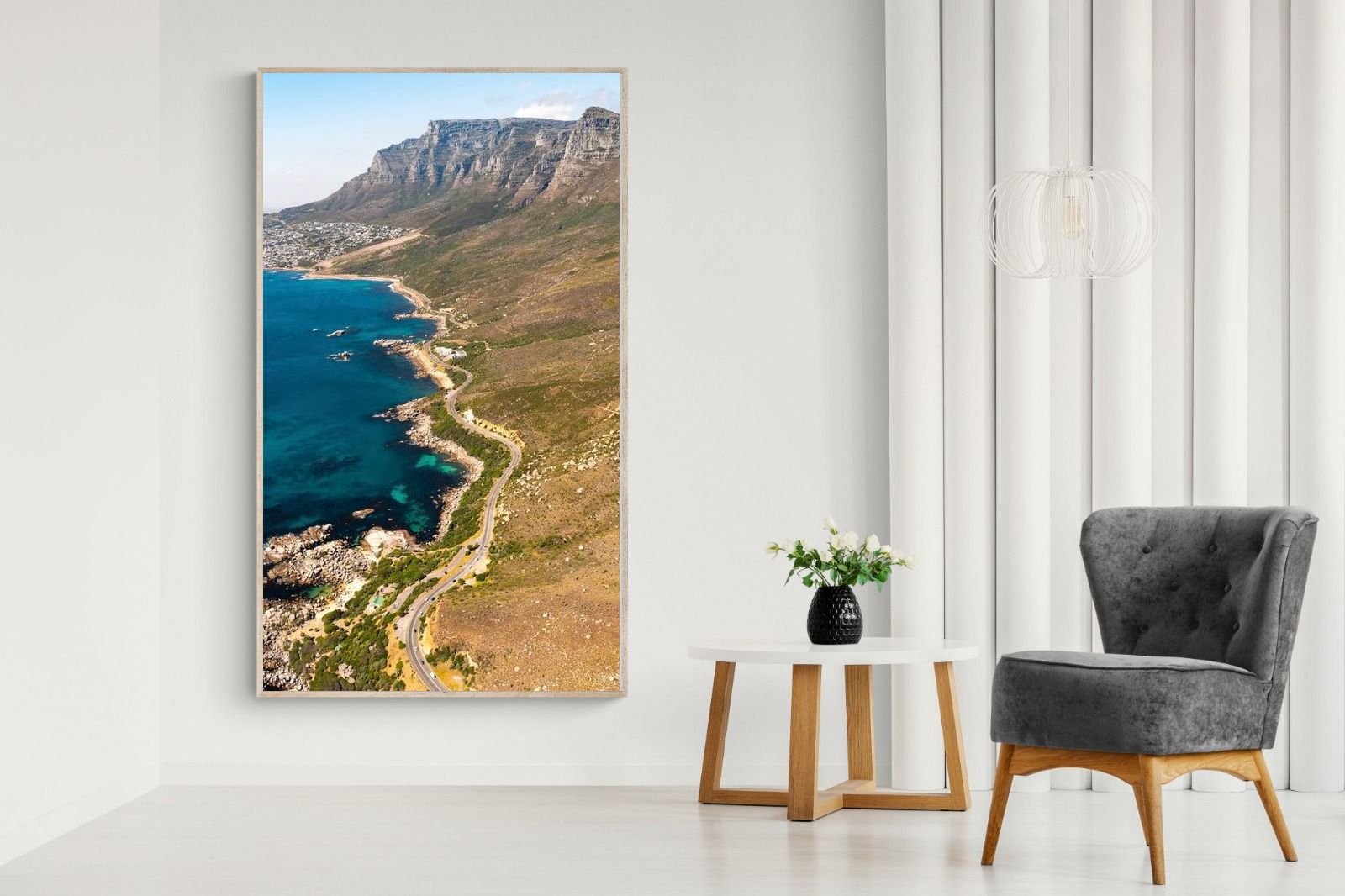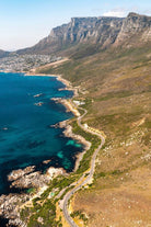 The winding coastal road between Llandudno and Camps Bay traces the dramatic Atlantic Seaboard, where turquoise water meets rugged mountain slopes. This elevated perspective reveals the raw scale of Cape Town’s geography – vast ocean, granite outcrops and layered cliffs. The interplay of deep blues and sun-baked terrain gives the image both vibrancy and depth. Ideal for large-format wall art, this photograph delivers impact in modern offices, luxury homes or design-led commercial spaces.