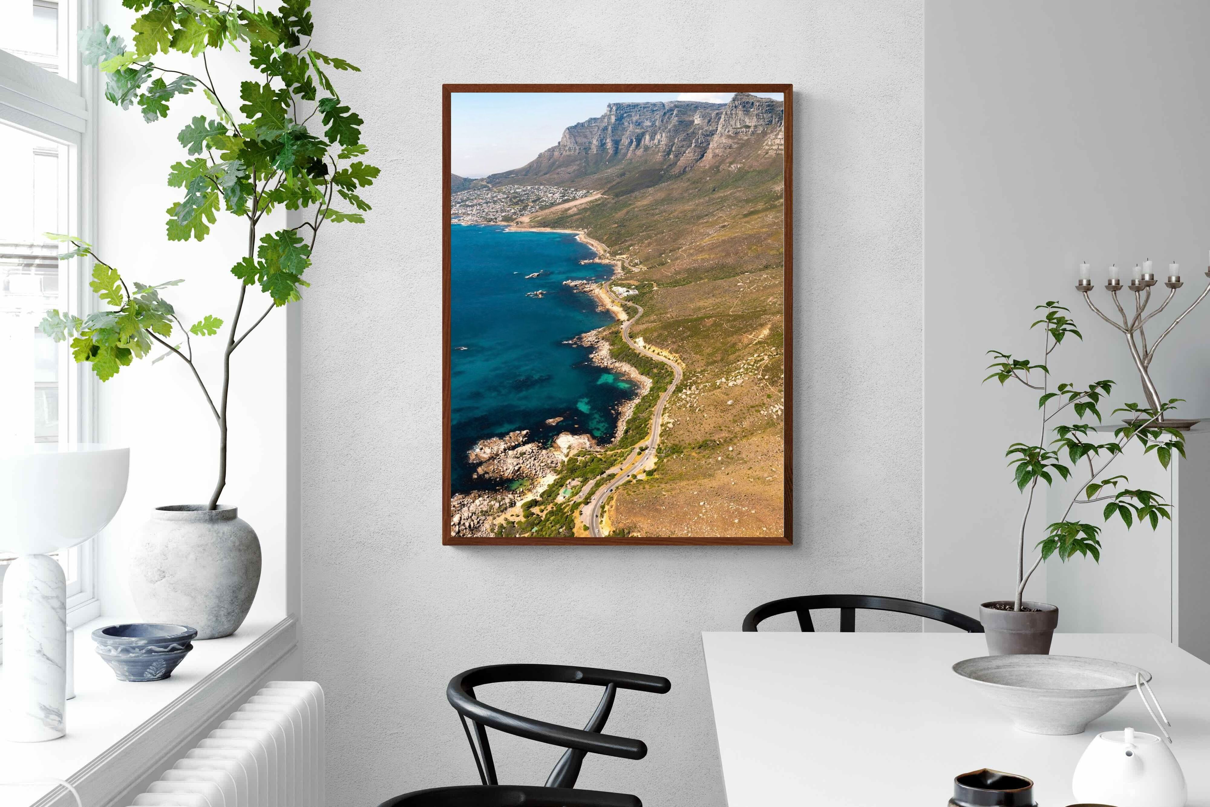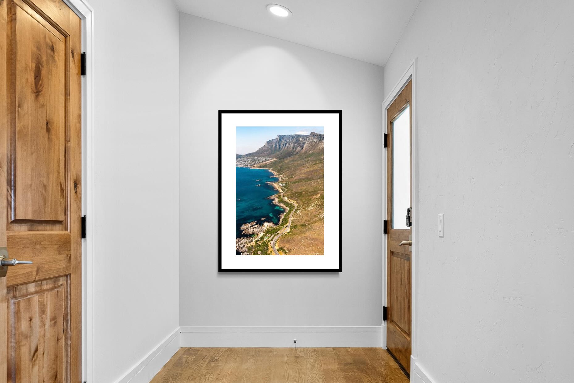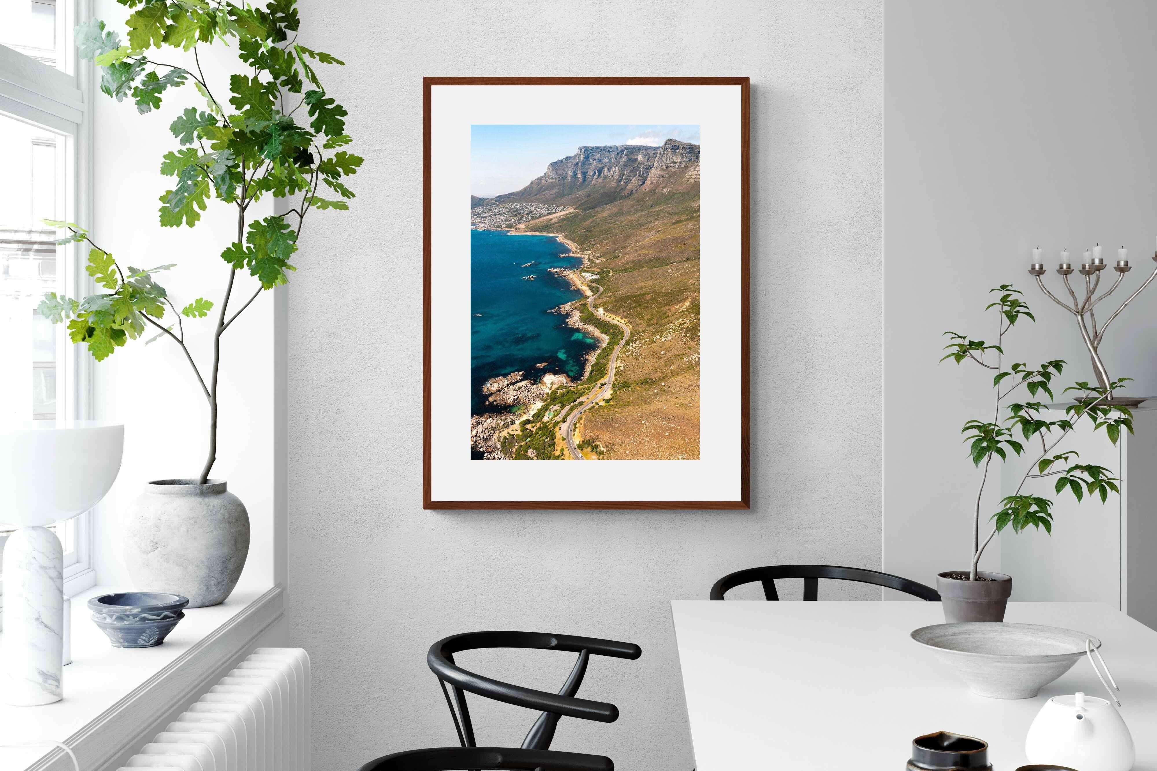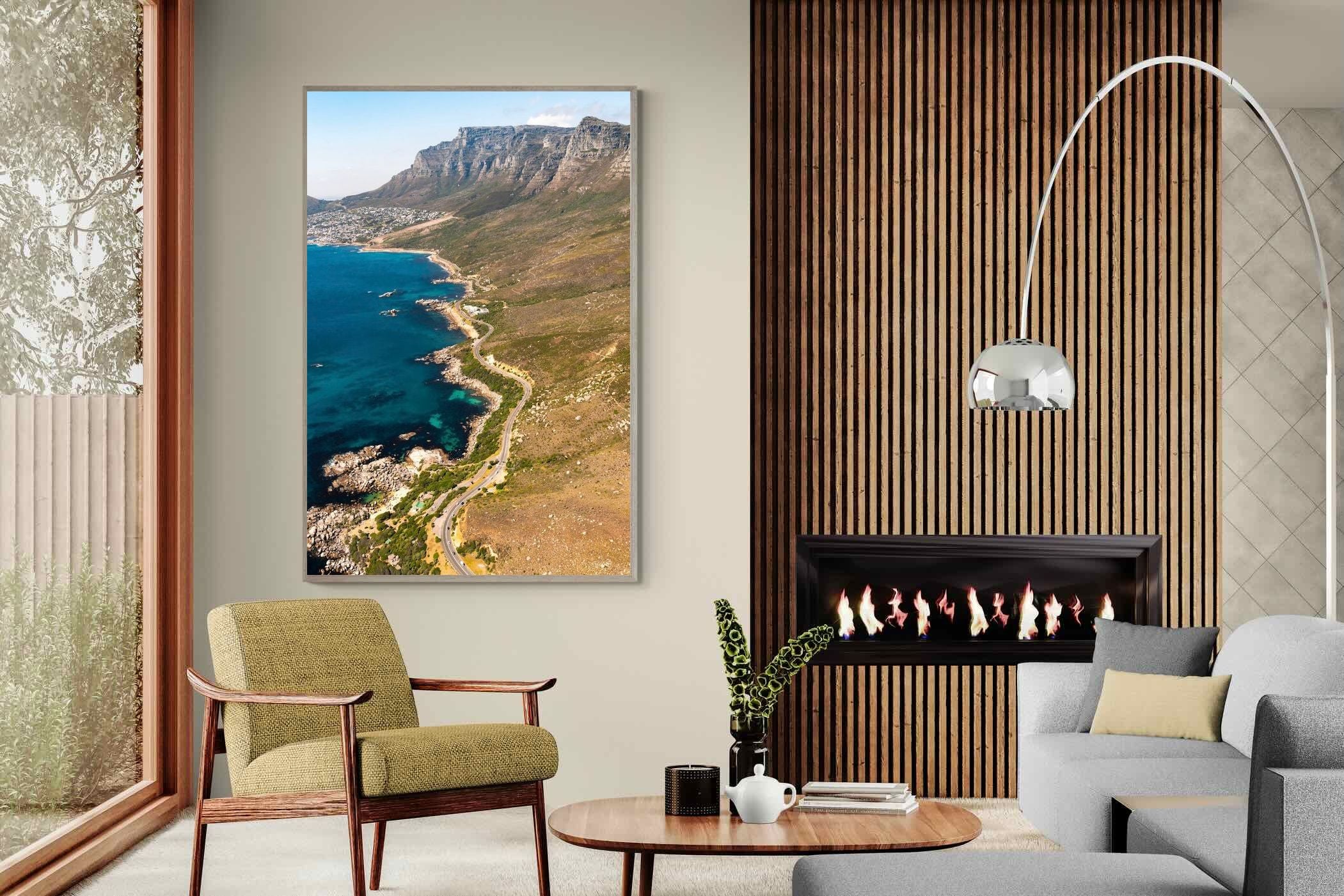 The winding coastal road between Llandudno and Camps Bay traces the dramatic Atlantic Seaboard, where turquoise water meets rugged mountain slopes. This elevated perspective reveals the raw scale of Cape Town’s geography – vast ocean, granite outcrops and layered cliffs. The interplay of deep blues and sun-baked terrain gives the image both vibrancy and depth. Ideal for large-format wall art, this photograph delivers impact in modern offices, luxury homes or design-led commercial spaces.