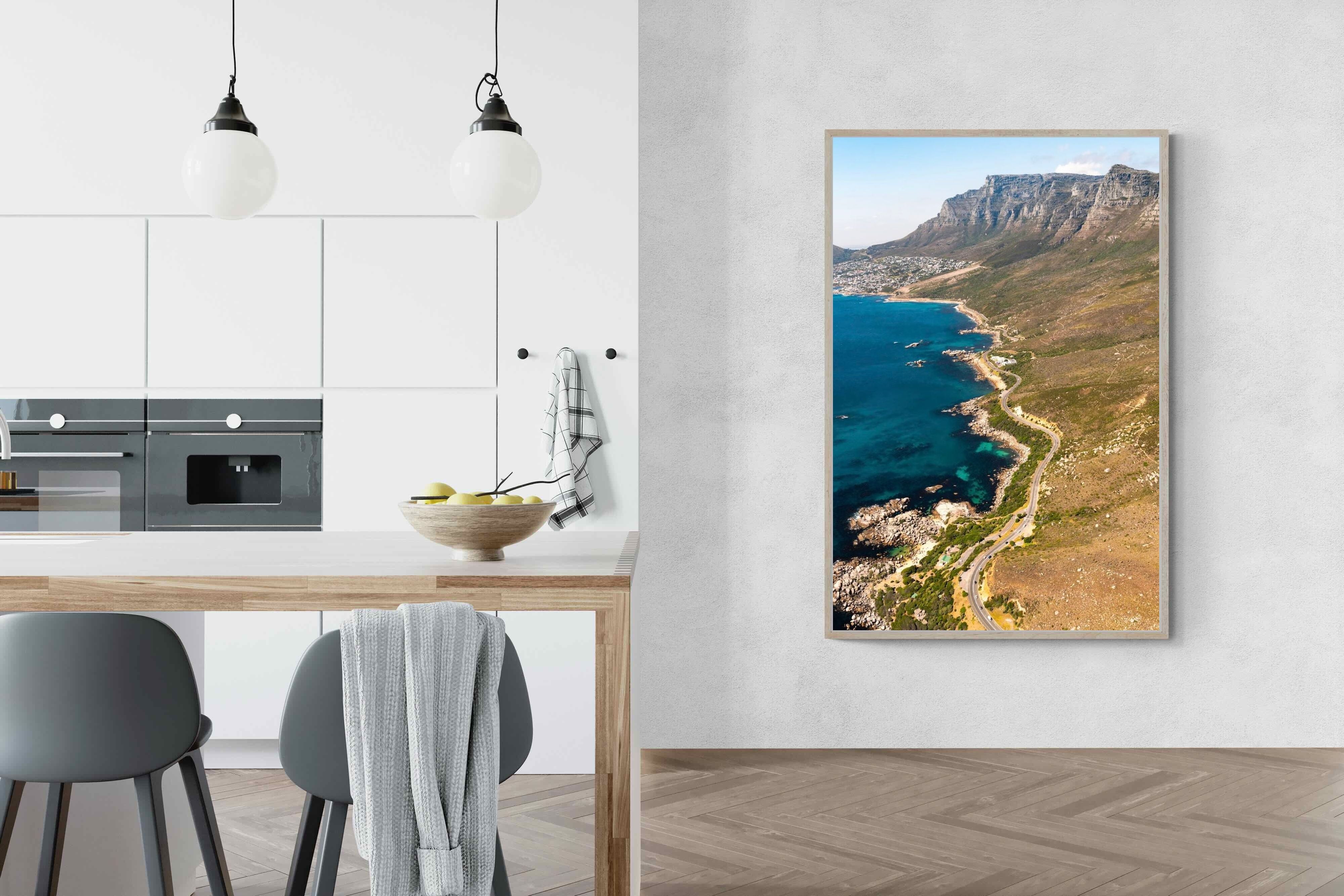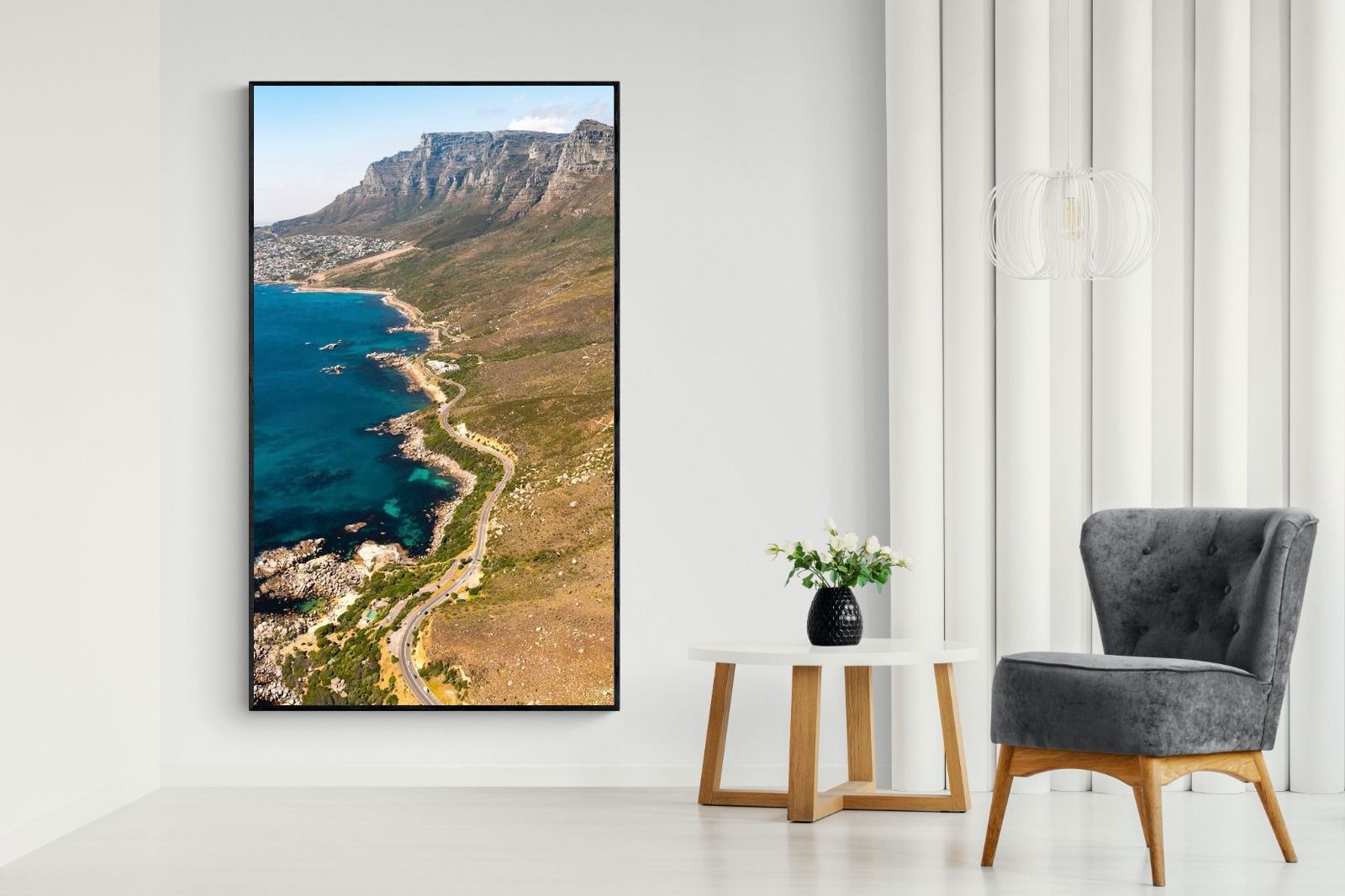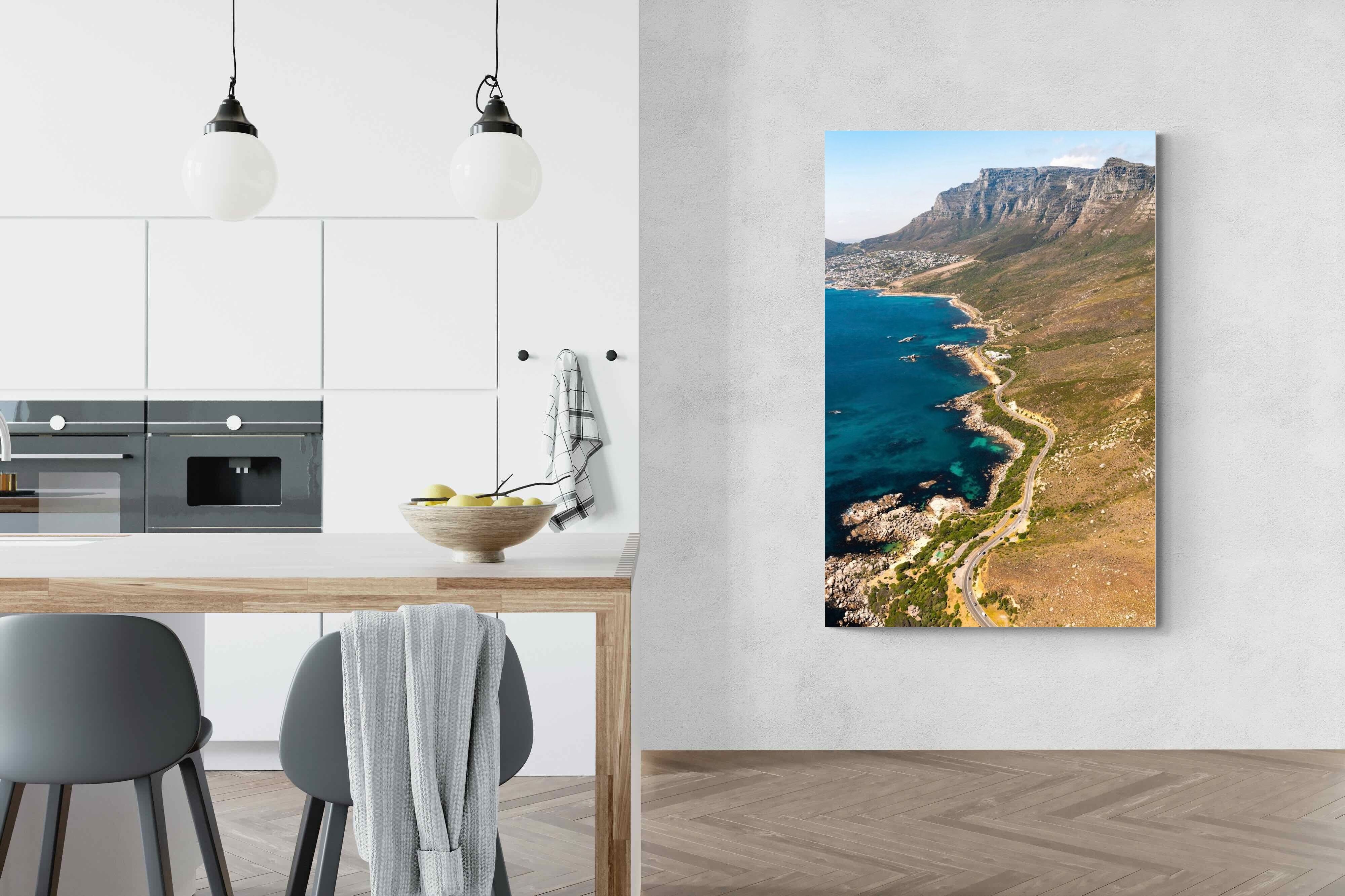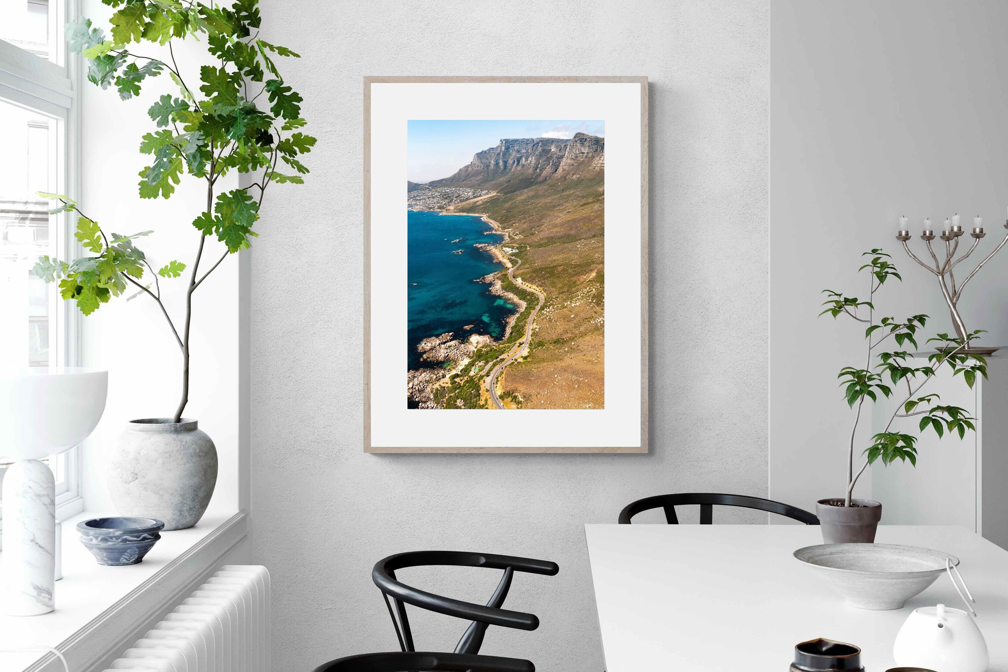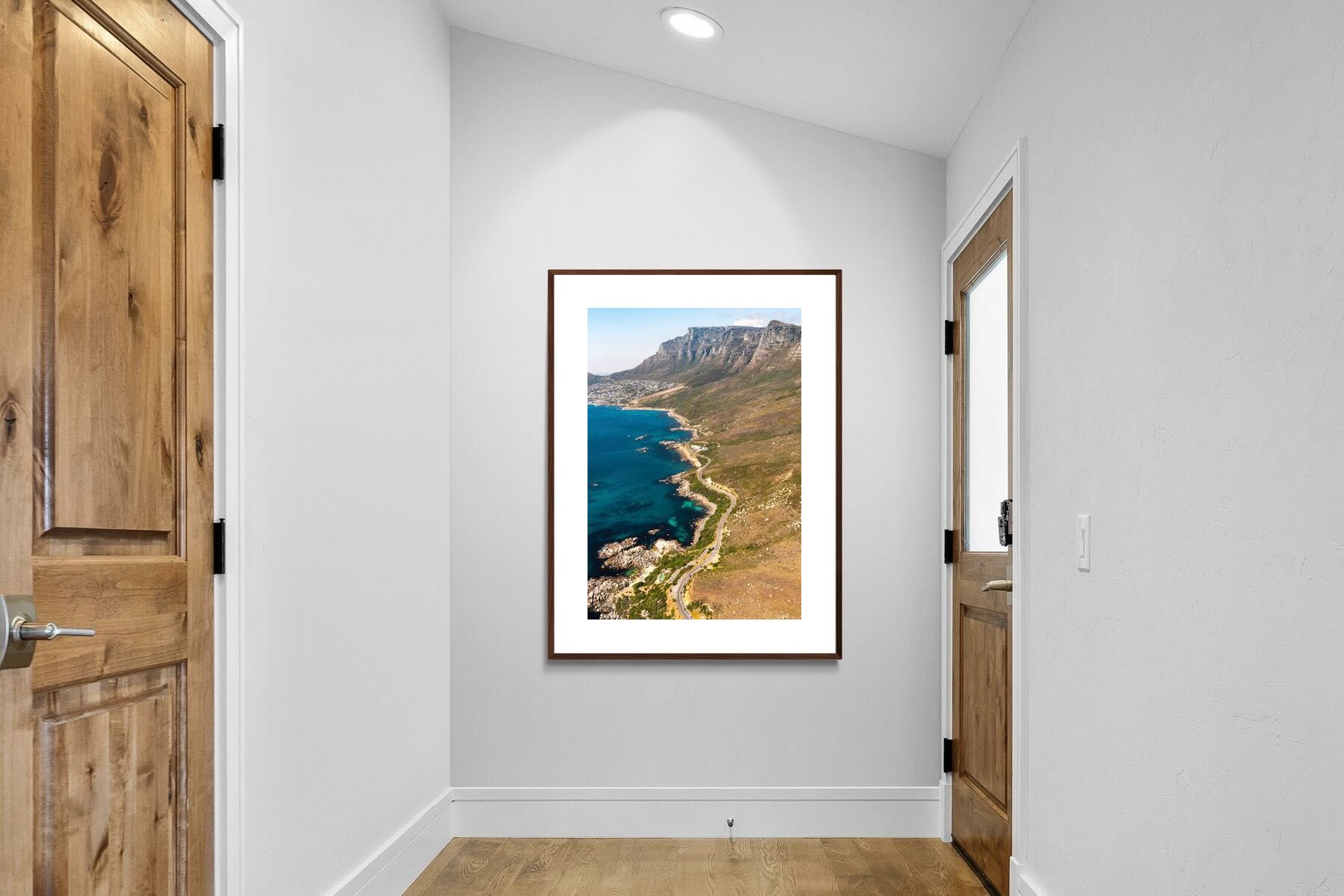 The winding coastal road between Llandudno and Camps Bay traces the dramatic Atlantic Seaboard, where turquoise water meets rugged mountain slopes. This elevated perspective reveals the raw scale of Cape Town’s geography – vast ocean, granite outcrops and layered cliffs. The interplay of deep blues and sun-baked terrain gives the image both vibrancy and depth. Ideal for large-format wall art, this photograph delivers impact in modern offices, luxury homes or design-led commercial spaces.