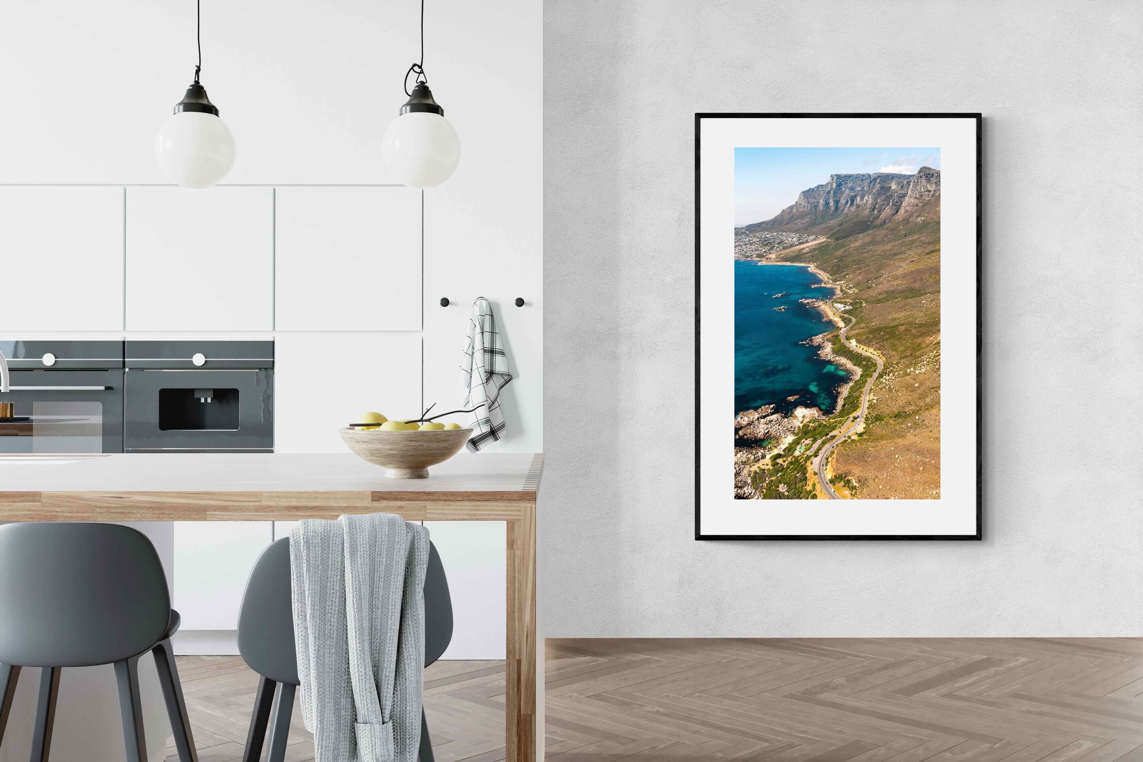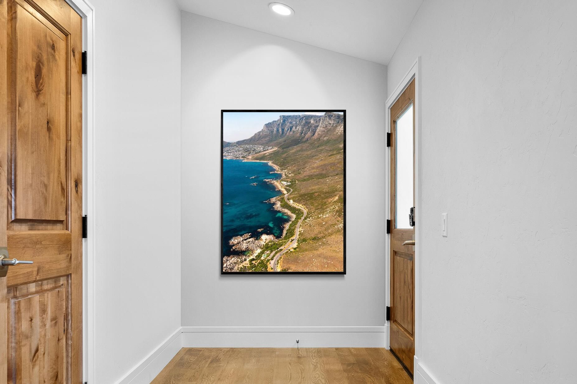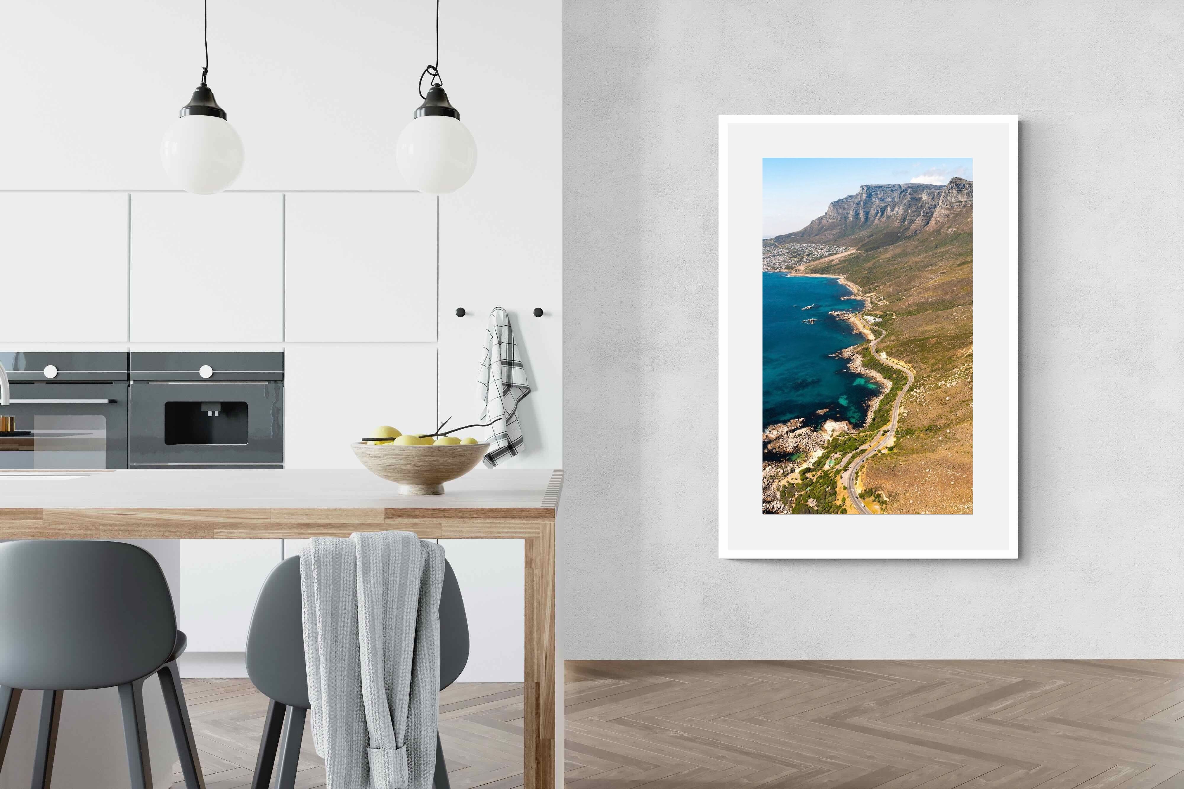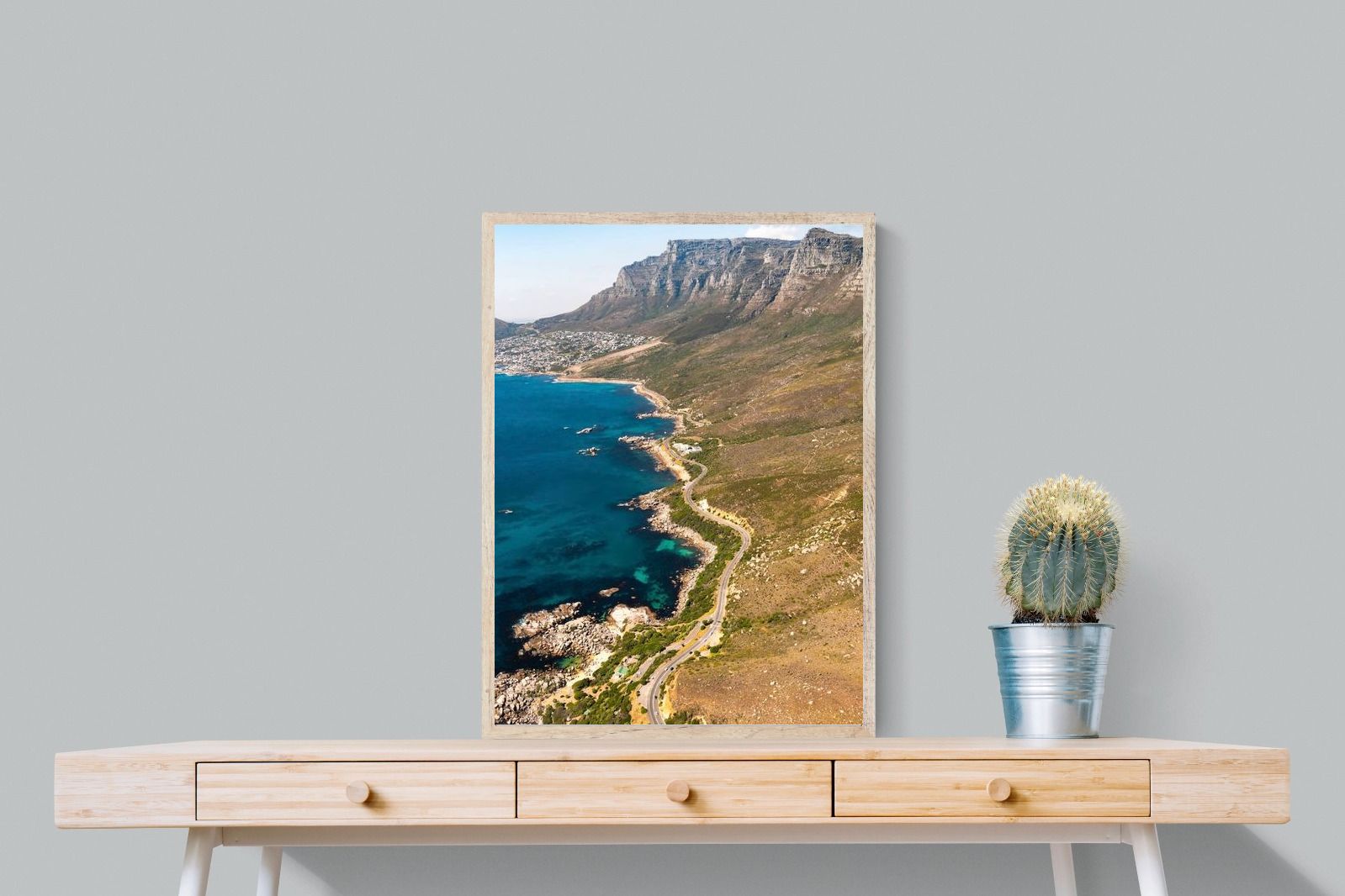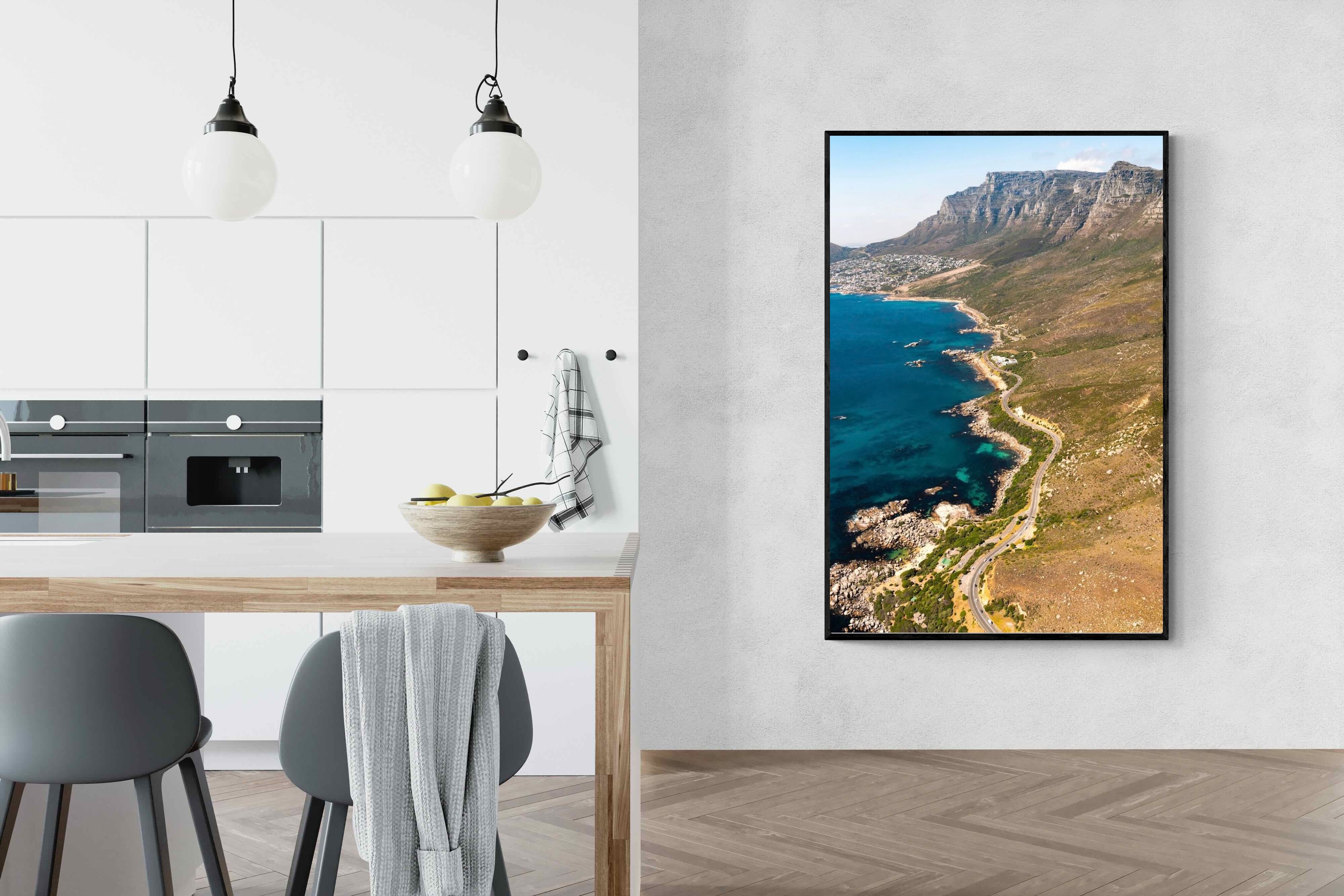 The winding coastal road between Llandudno and Camps Bay traces the dramatic Atlantic Seaboard, where turquoise water meets rugged mountain slopes. This elevated perspective reveals the raw scale of Cape Town’s geography – vast ocean, granite outcrops and layered cliffs. The interplay of deep blues and sun-baked terrain gives the image both vibrancy and depth. Ideal for large-format wall art, this photograph delivers impact in modern offices, luxury homes or design-led commercial spaces.