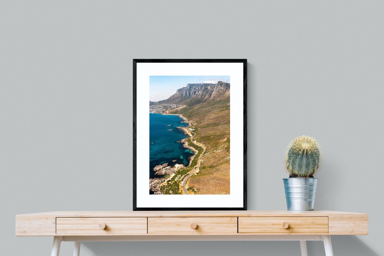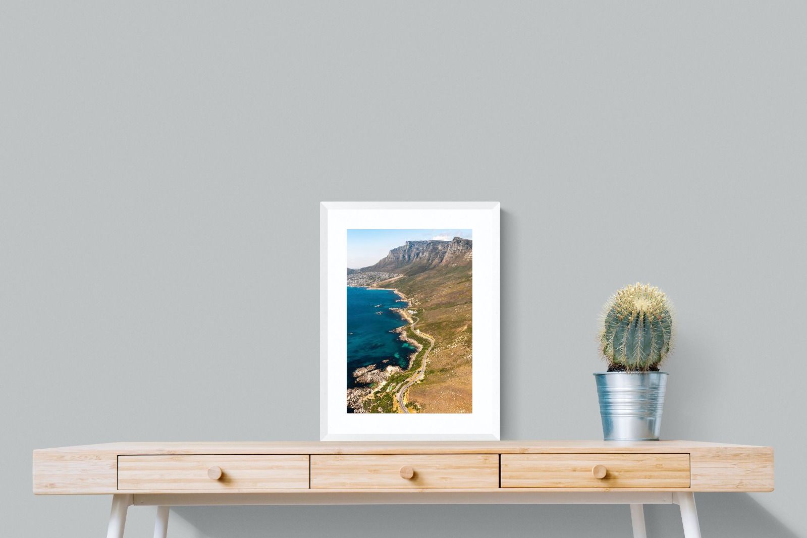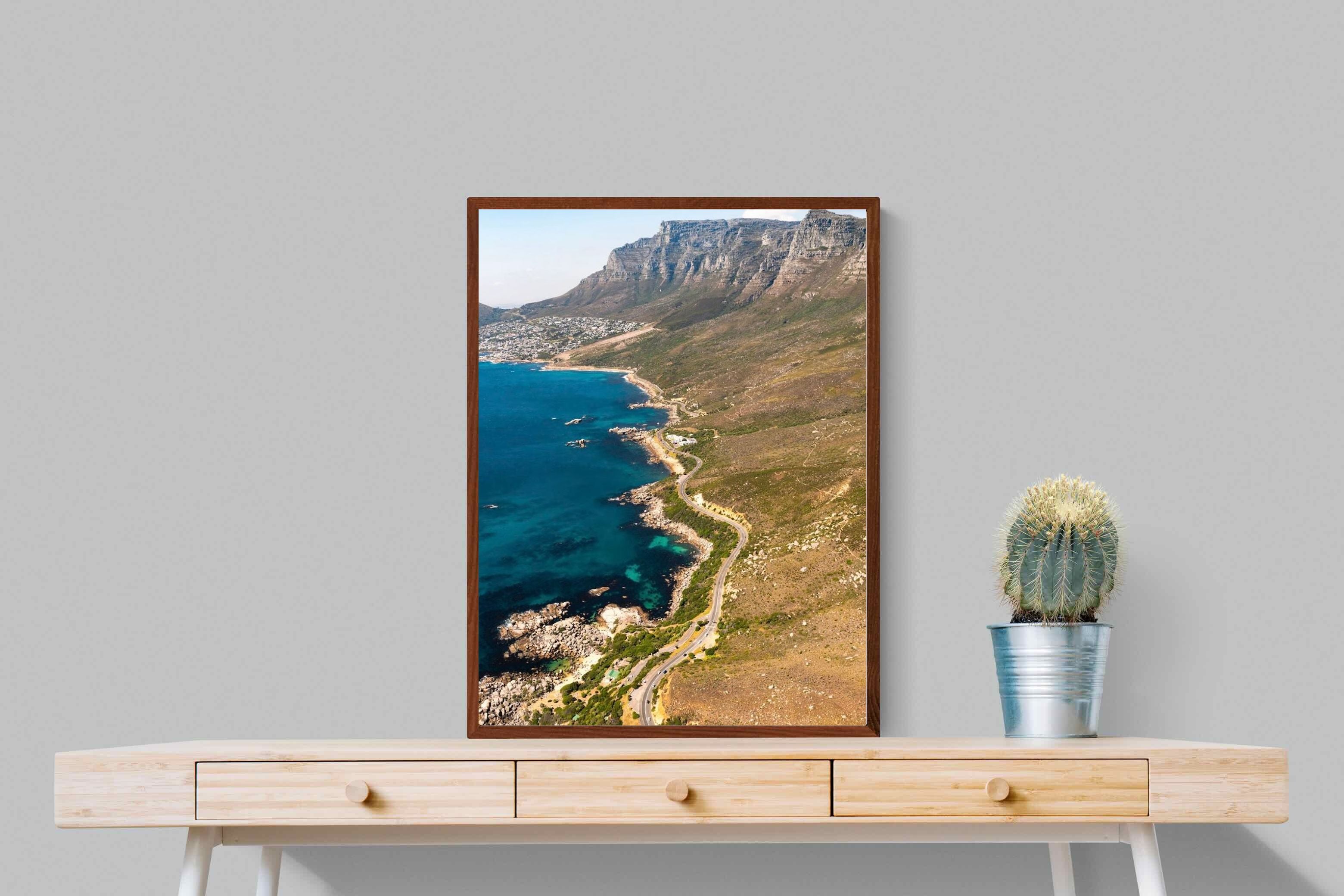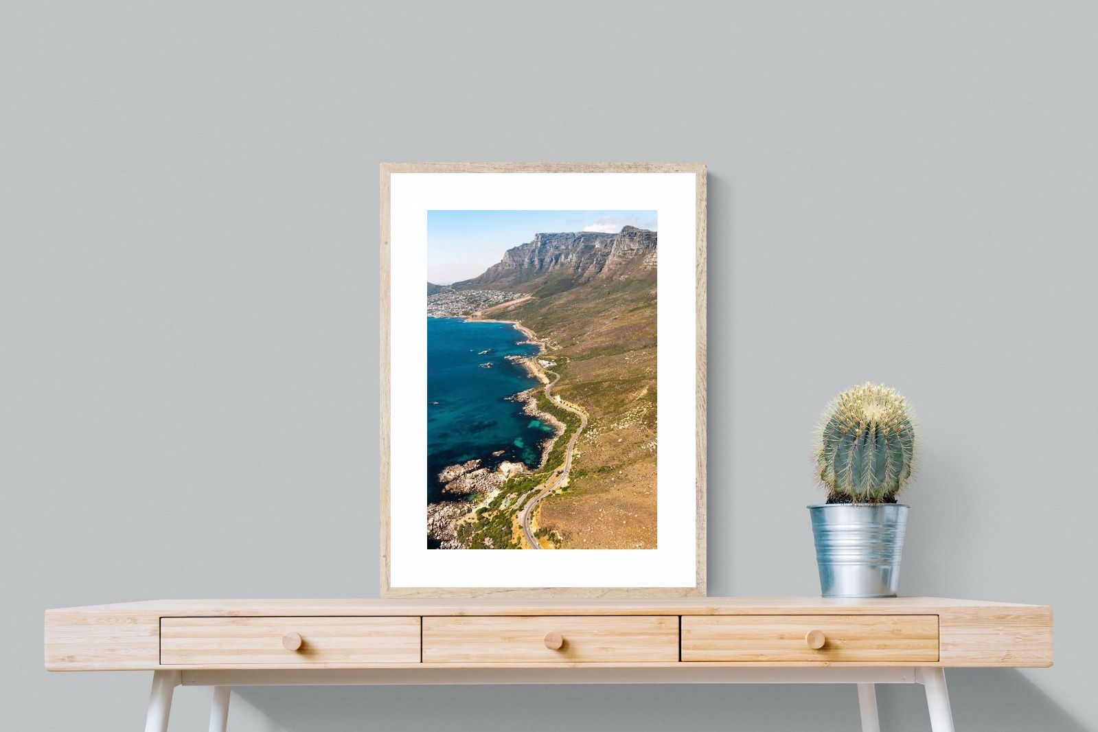 The winding coastal road between Llandudno and Camps Bay traces the dramatic Atlantic Seaboard, where turquoise water meets rugged mountain slopes. This elevated perspective reveals the raw scale of Cape Town’s geography – vast ocean, granite outcrops and layered cliffs. The interplay of deep blues and sun-baked terrain gives the image both vibrancy and depth. Ideal for large-format wall art, this photograph delivers impact in modern offices, luxury homes or design-led commercial spaces.