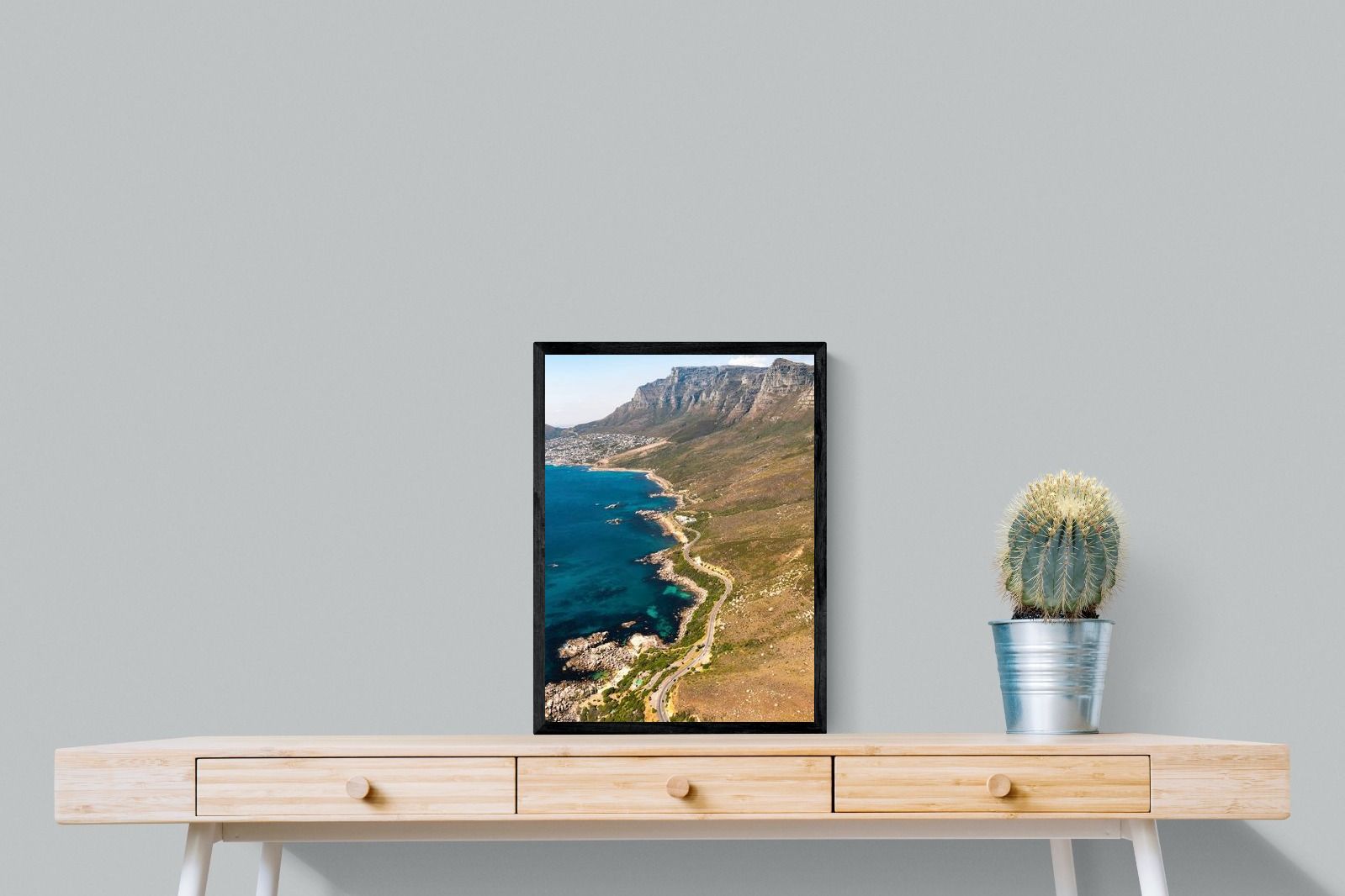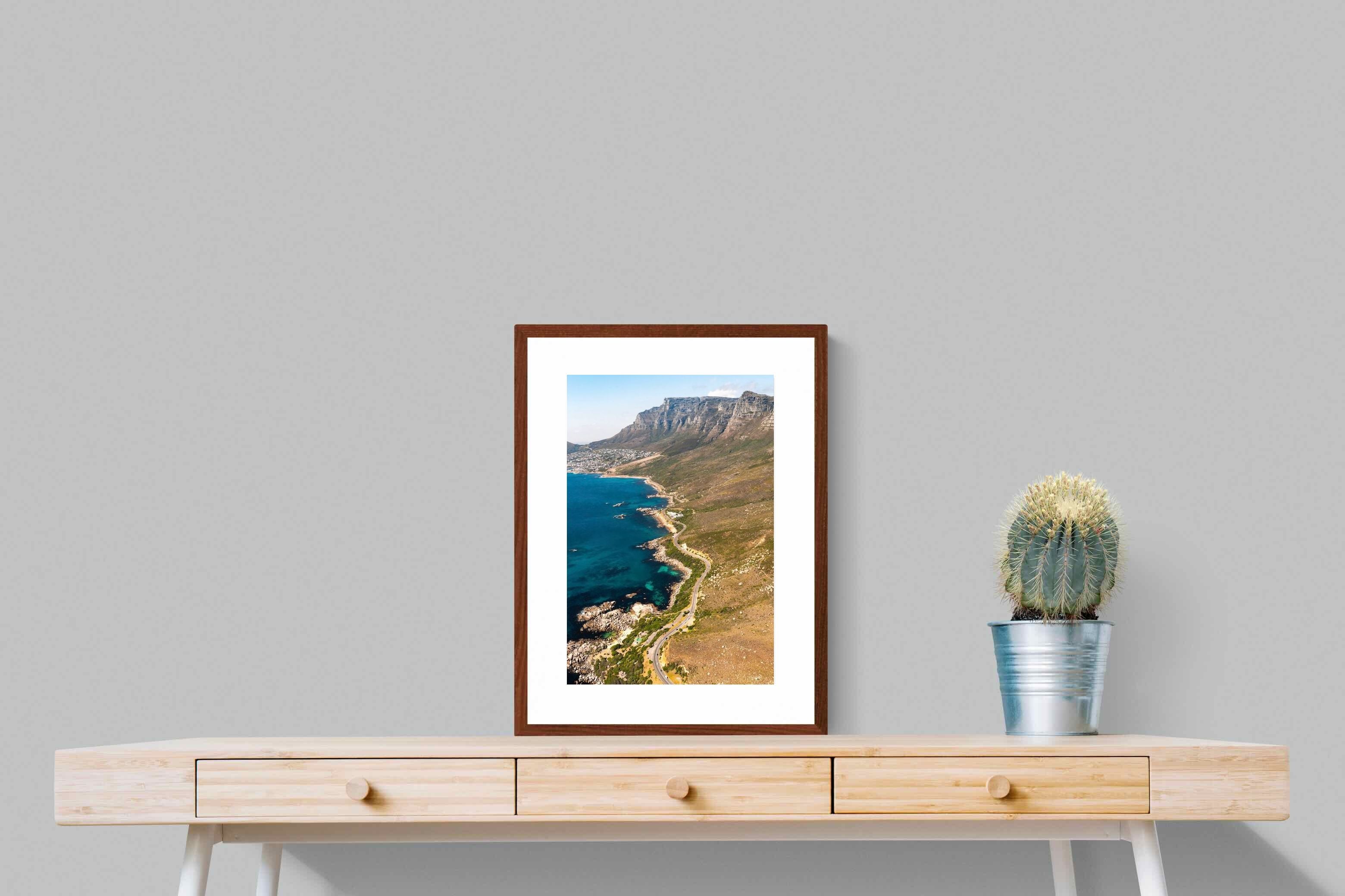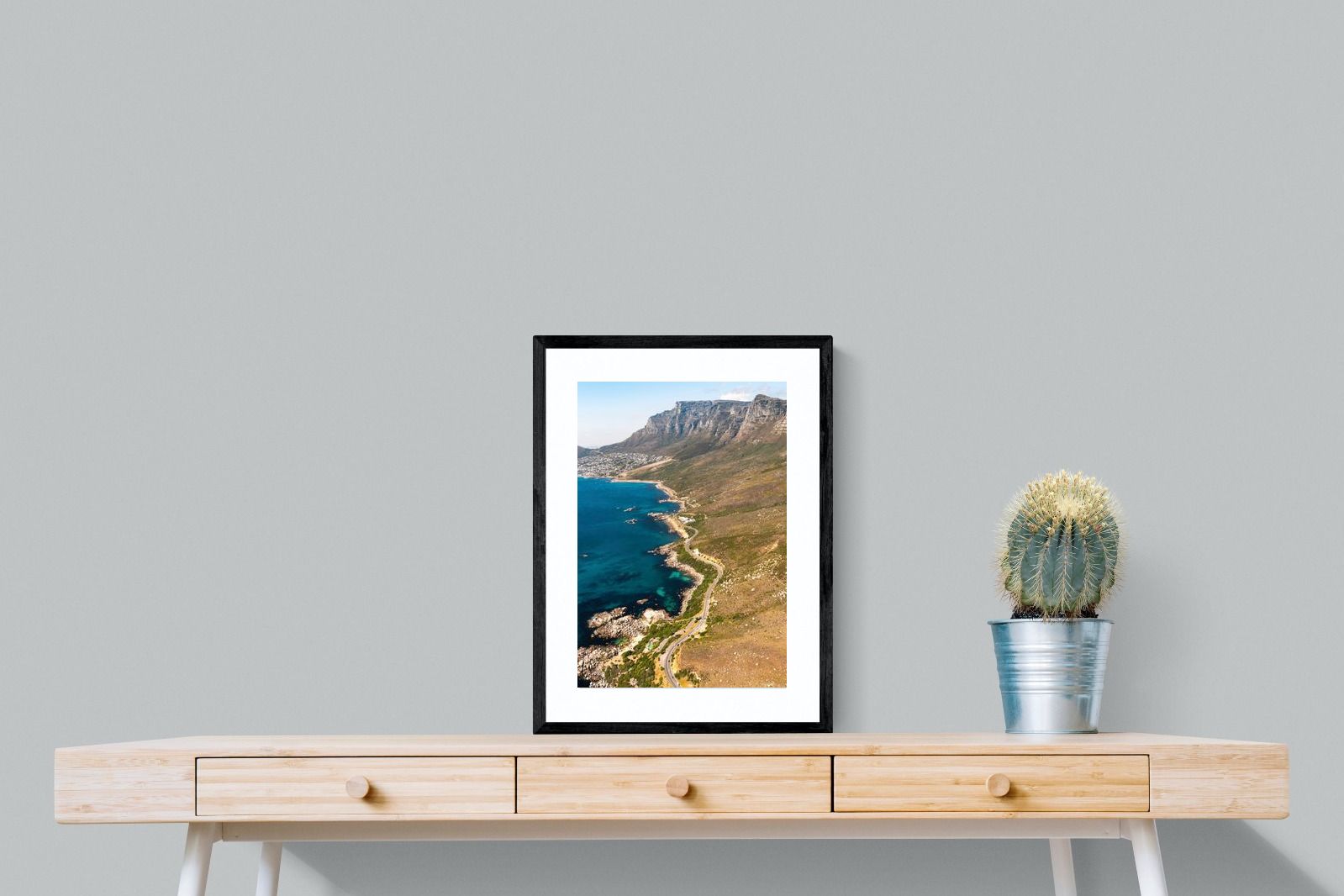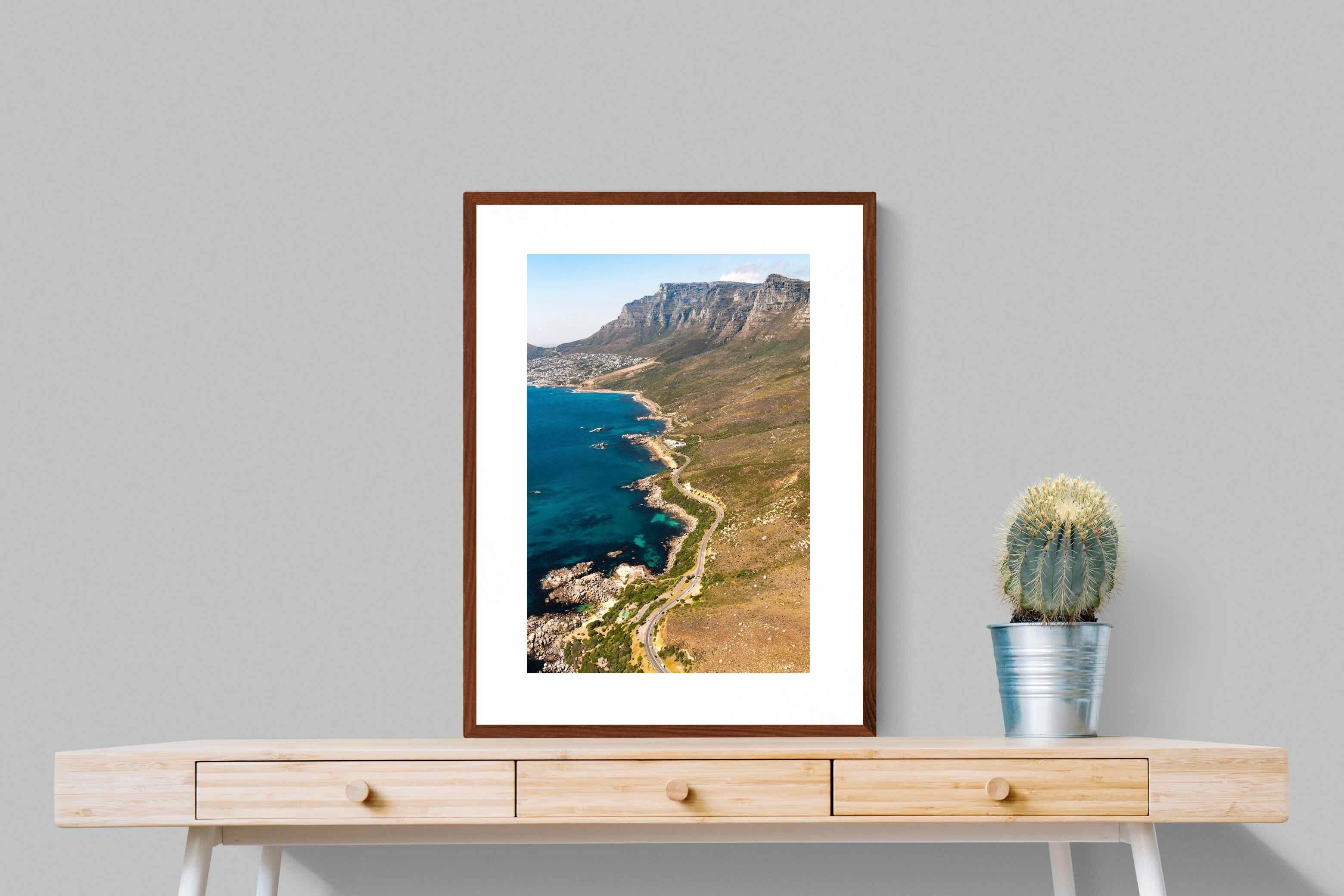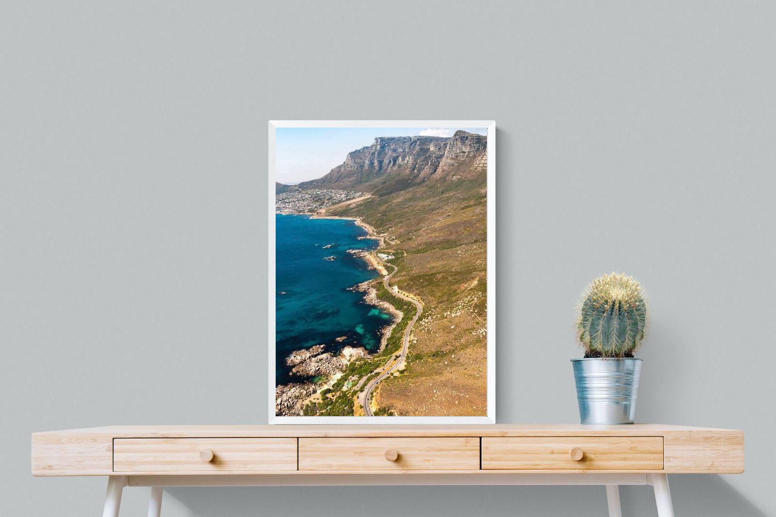 The winding coastal road between Llandudno and Camps Bay traces the dramatic Atlantic Seaboard, where turquoise water meets rugged mountain slopes. This elevated perspective reveals the raw scale of Cape Town’s geography – vast ocean, granite outcrops and layered cliffs. The interplay of deep blues and sun-baked terrain gives the image both vibrancy and depth. Ideal for large-format wall art, this photograph delivers impact in modern offices, luxury homes or design-led commercial spaces.