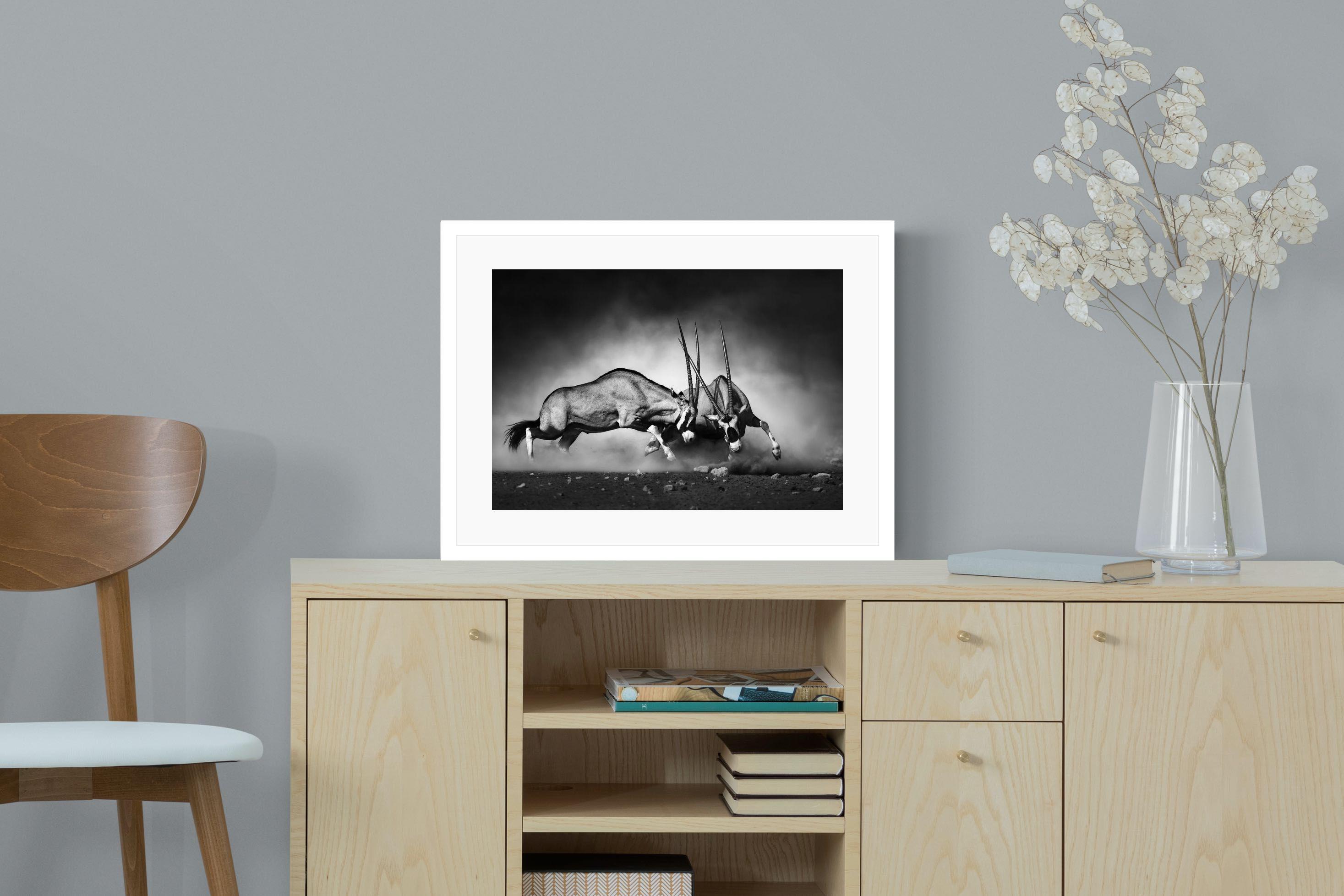 Dramatic Black & White Photograph of Two Oryx Sparring - Wall Art for Contemporary African Homes