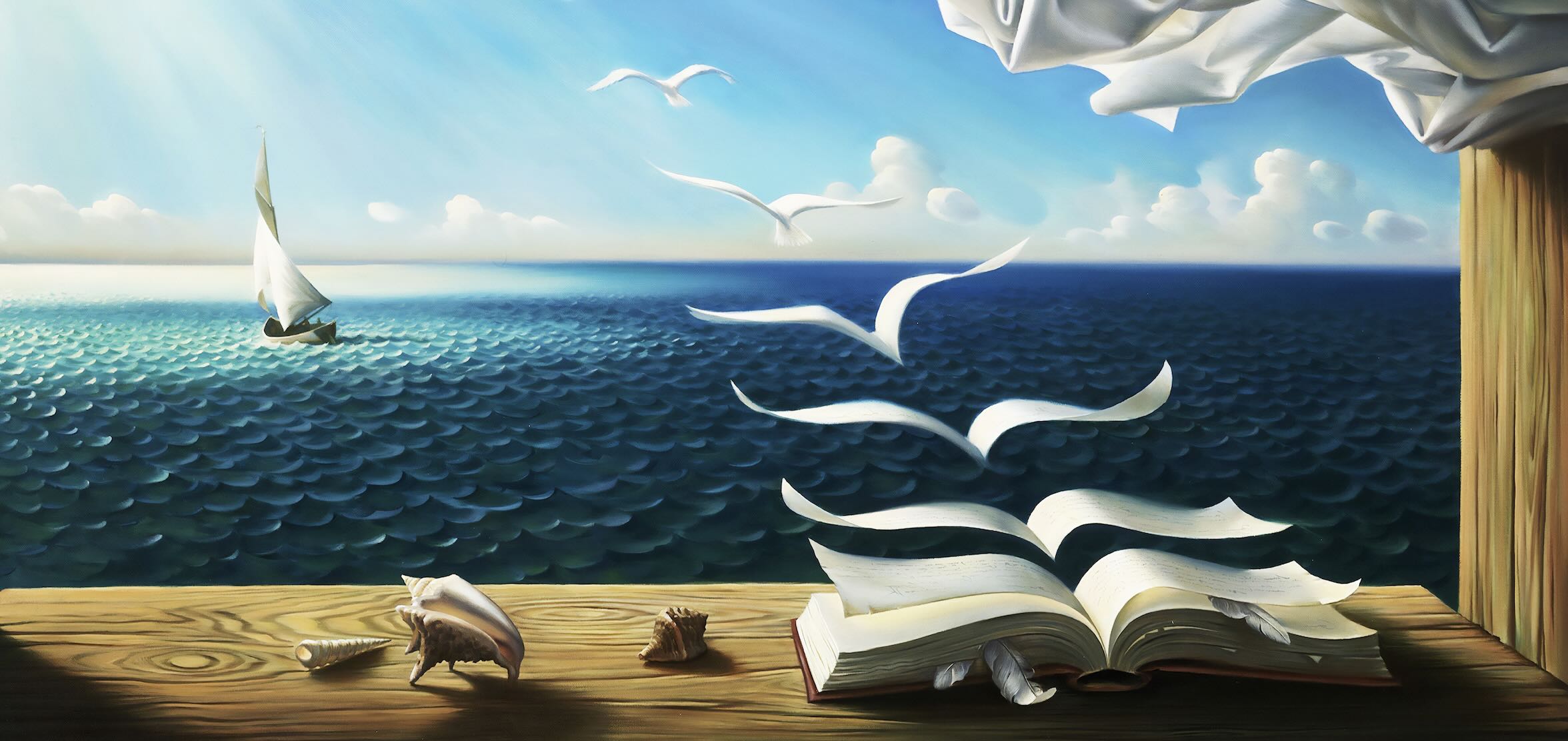An open book rests beside the sea, its pages lifting and transforming into birds that glide into the sky. This surreal scene symbolises imagination escaping the confines of the mind, where knowledge and stories take flight into possibility. The calm ocean and soft light evoke introspection, while the flowing fabric suggests movement between reality and dreams, capturing the quiet power of creativity, freedom, and the boundless nature of human thought.