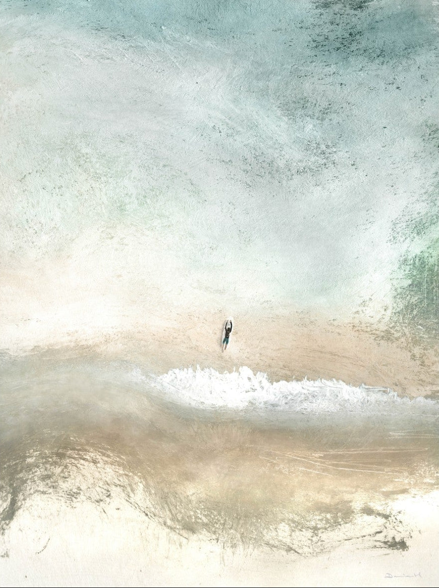 Introducing the "Lone Surfer" Wall Art, an enchanting painting by artist Dan Hobday. This artwork provides an aerial perspective of a surfer paddling out from the golden sandy shore into the turquoise surf, captivating the viewer with its sense of solitude and tranquillity. Available as wall art on canvas, framed behind glass, or wallpaper, this artwork's texture and brush strokes shine through beautifully, making it a splendid addition to any space.