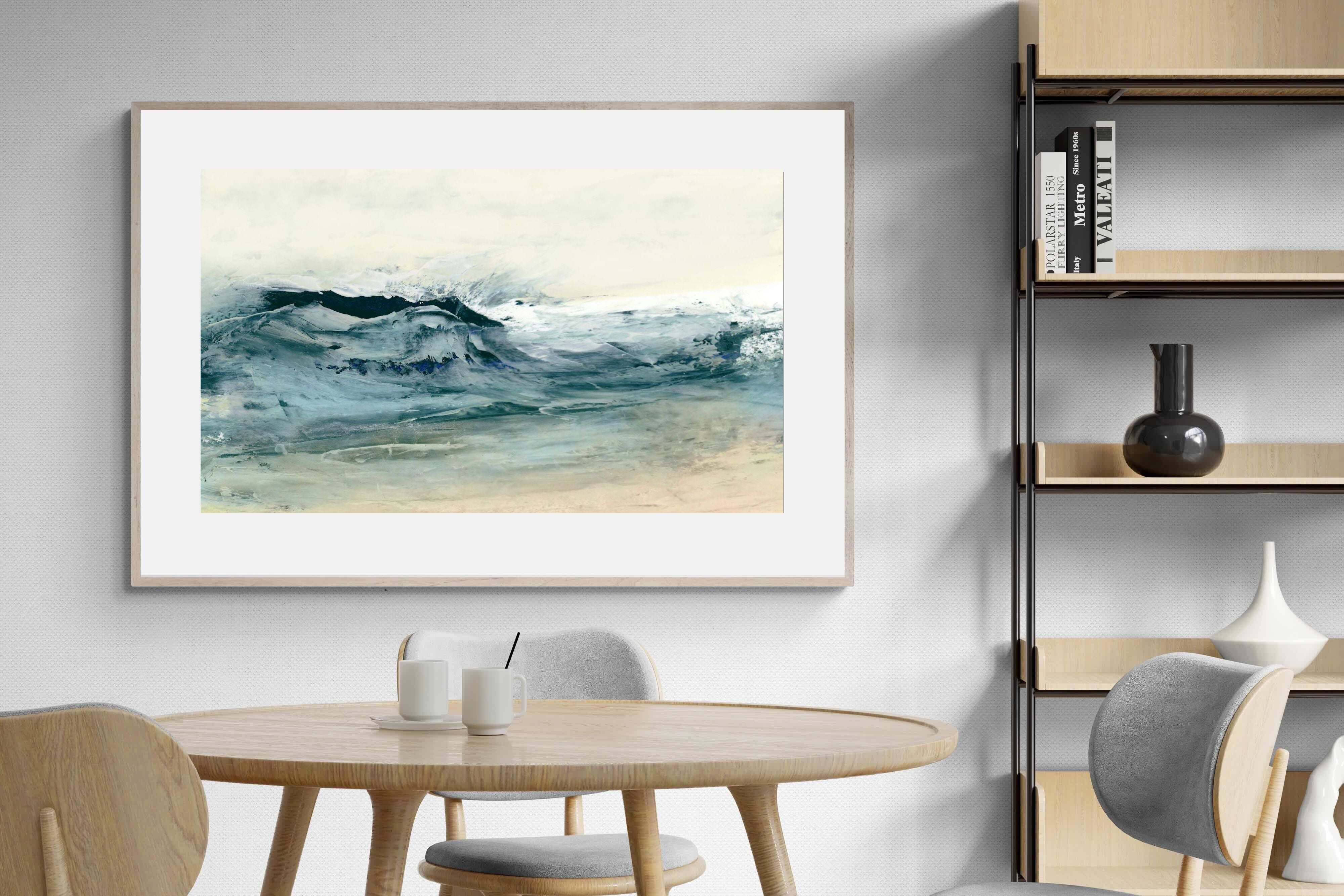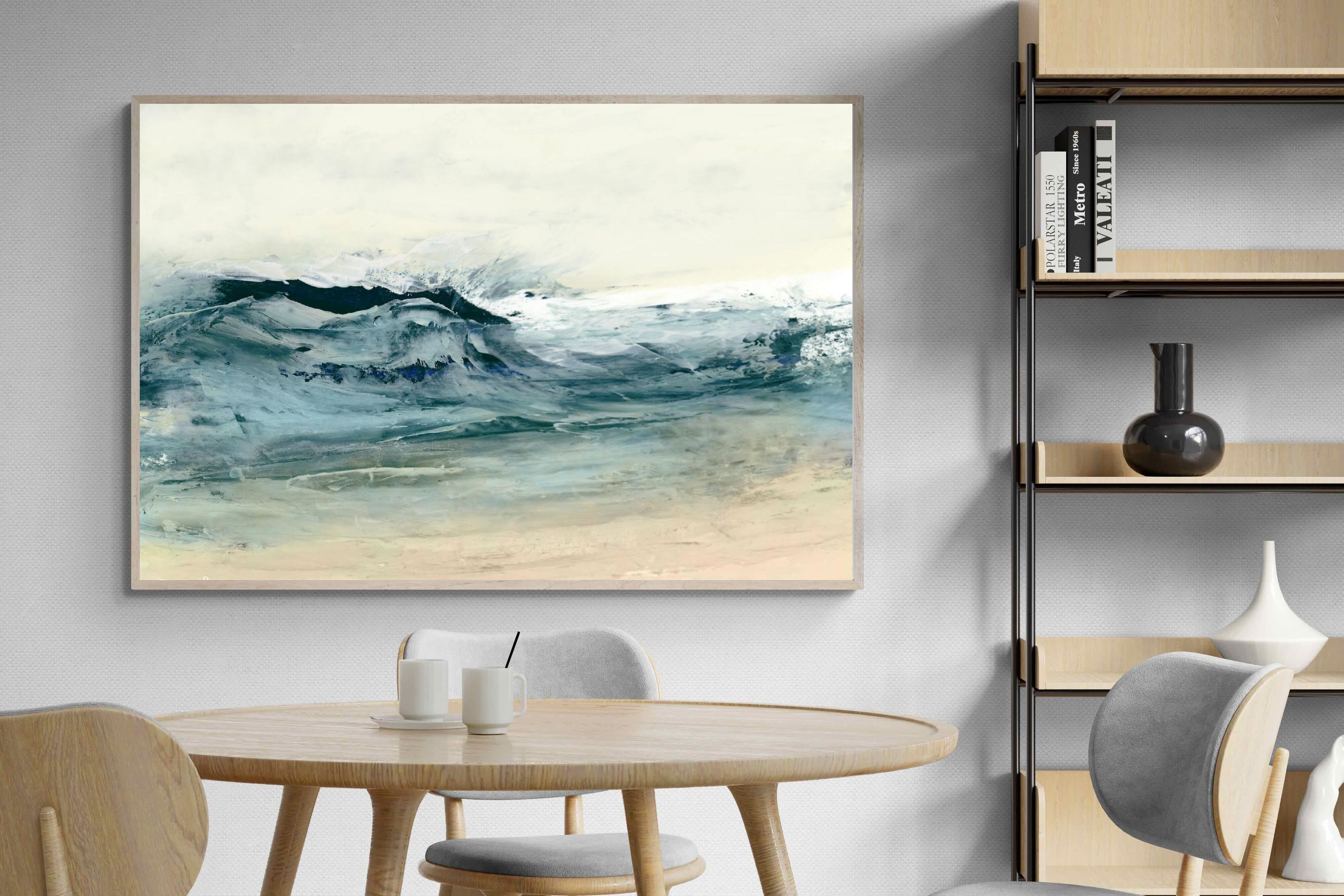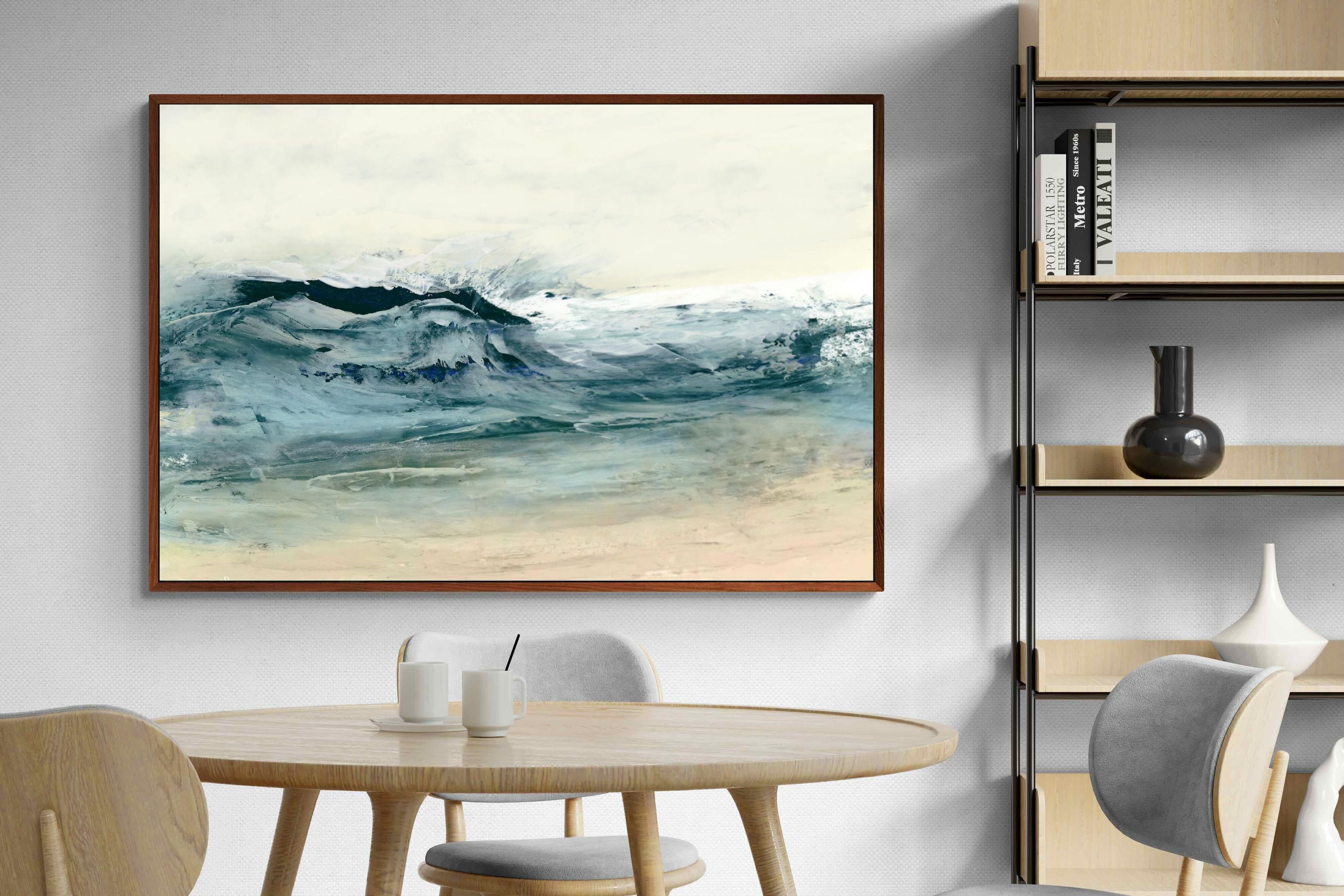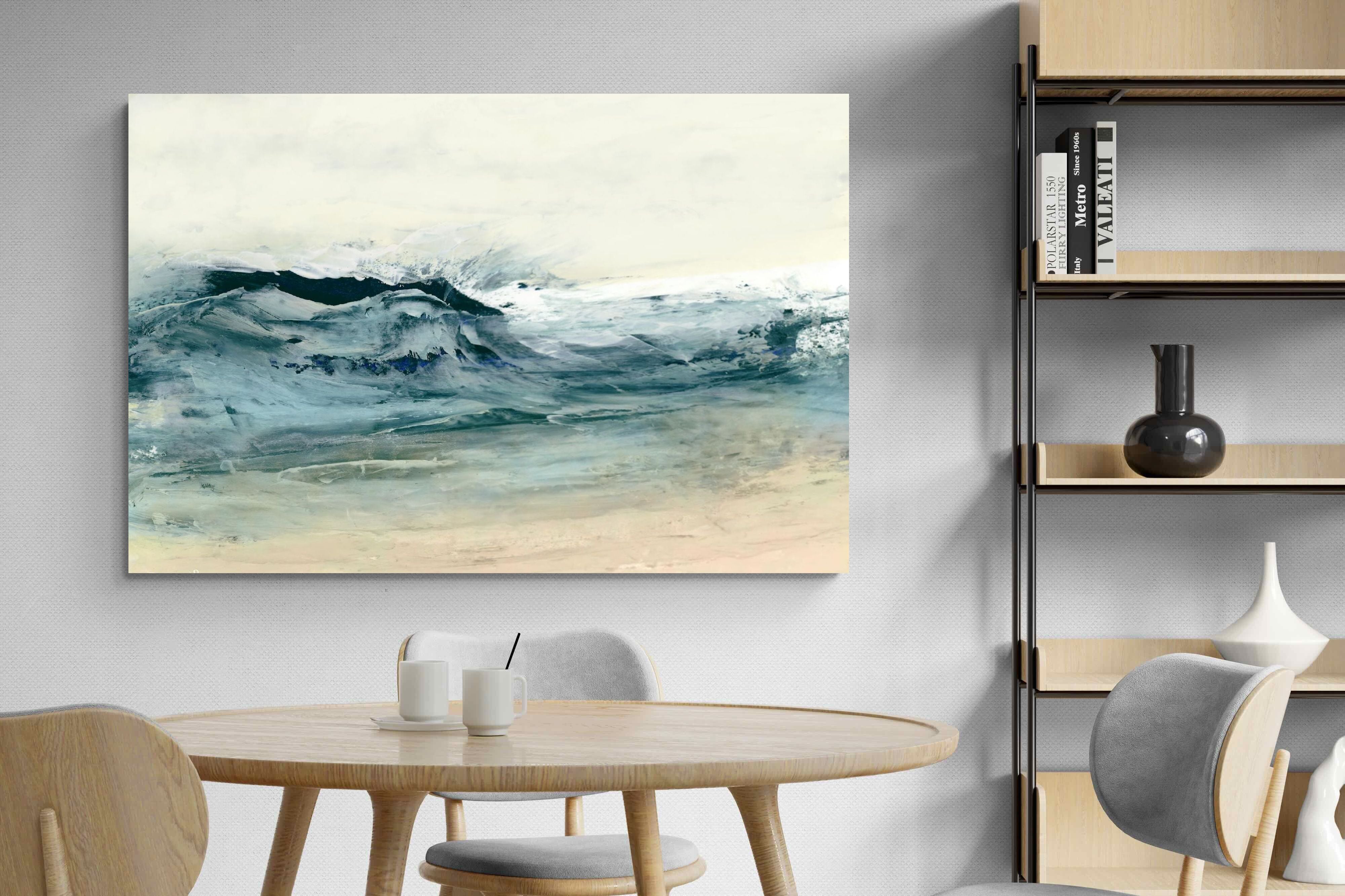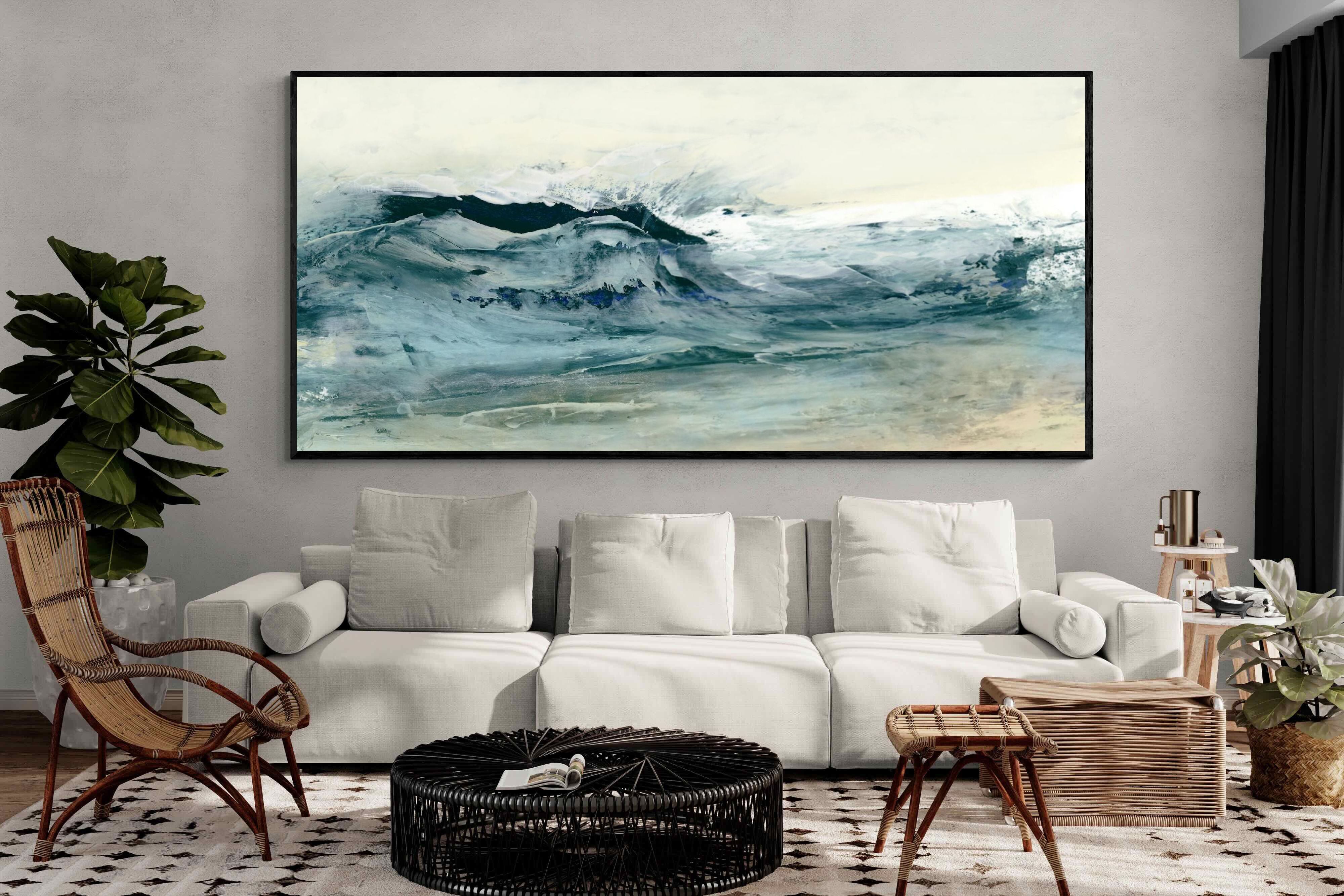 This painting portrays the dynamic movement of ocean waves with a blend of blues, whites, and hints of green. The textured layers and fluid brushstrokes convey the energy and power of the sea. This artwork would make a stunning addition to a contemporary home, adding a touch of nature's raw beauty and movement. Its vibrant yet calming colours can enhance the ambiance of a living room or bedroom.