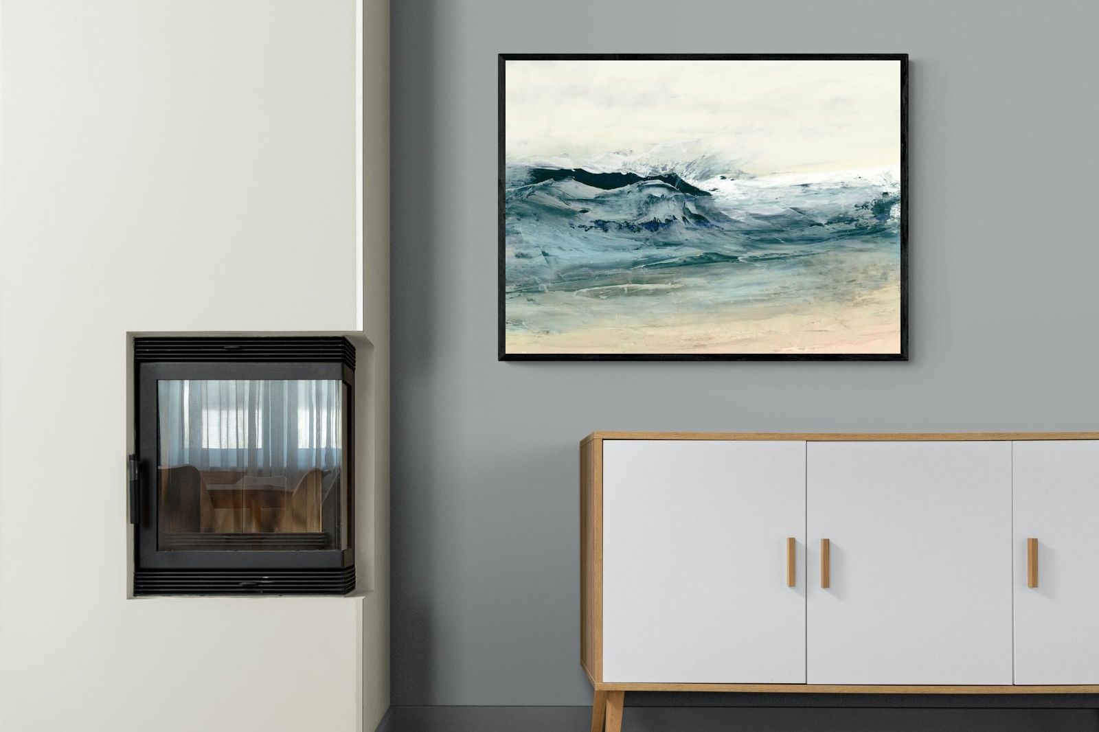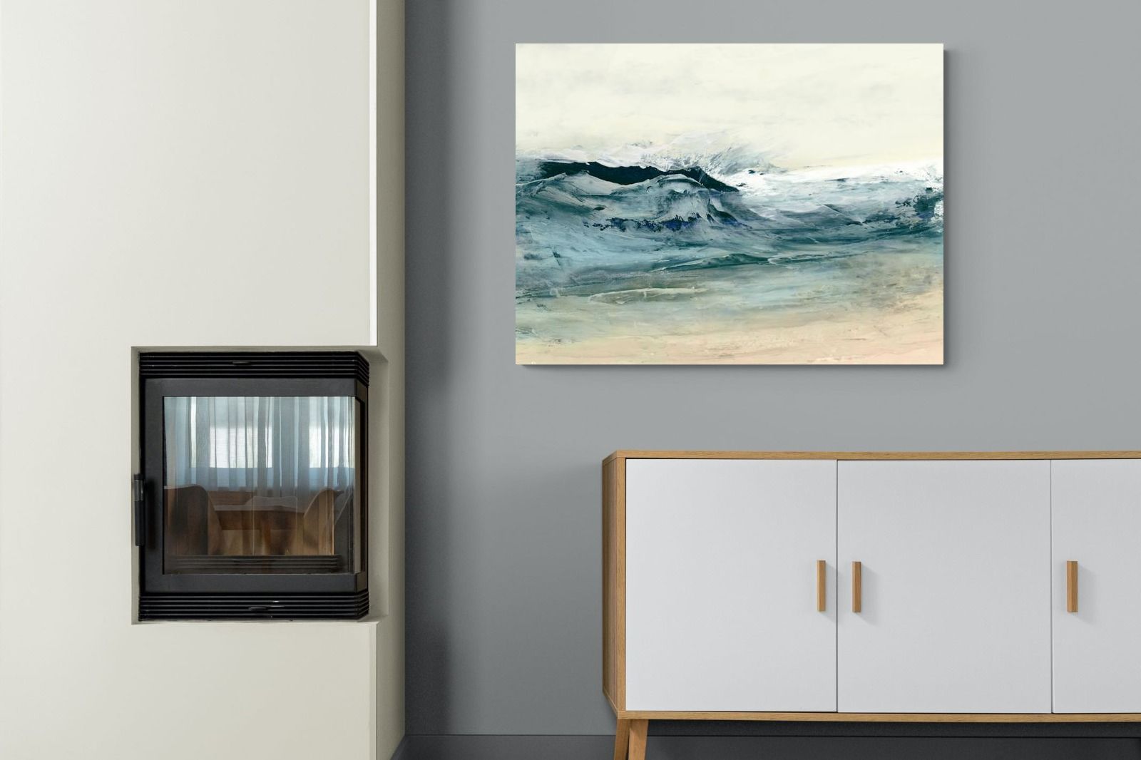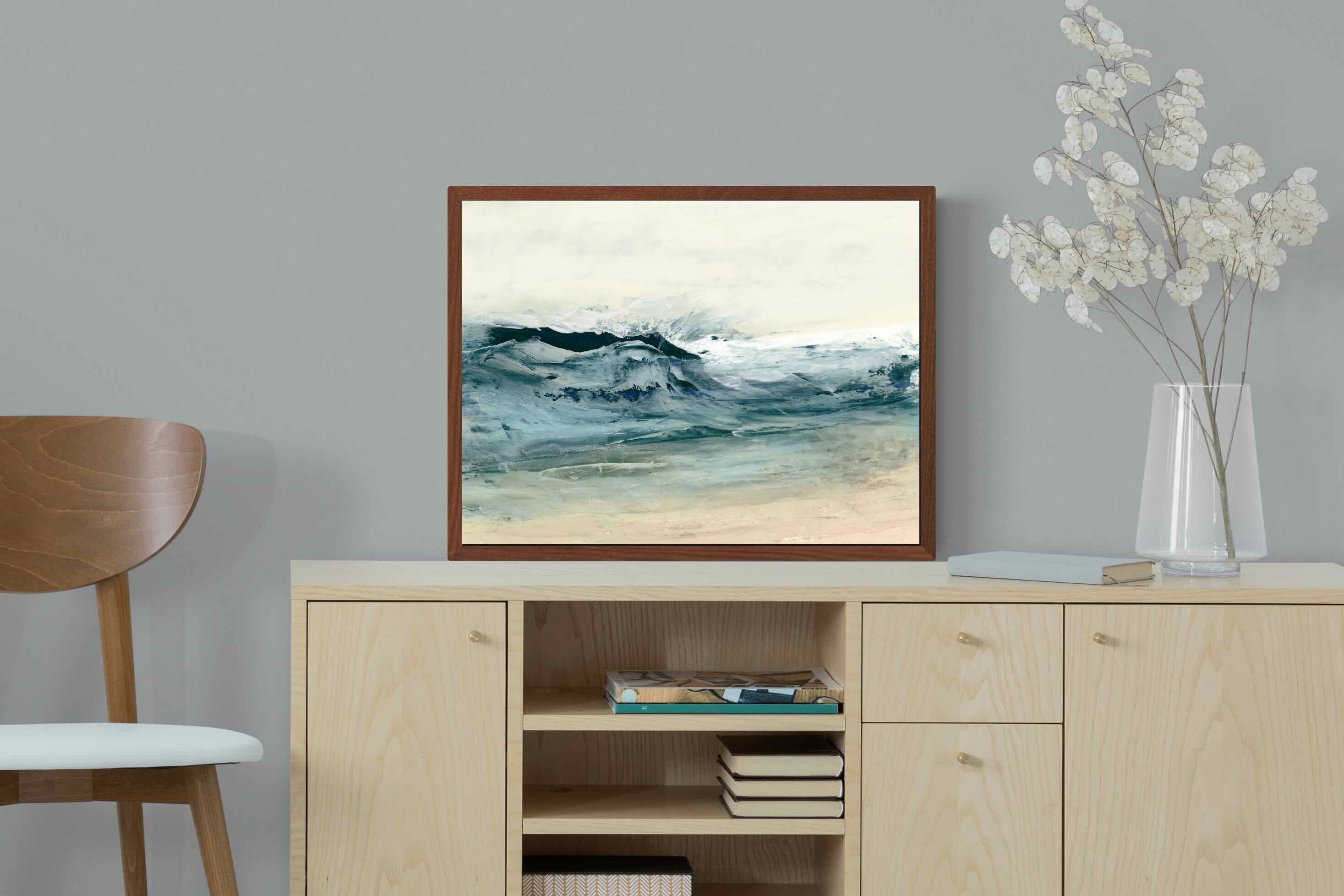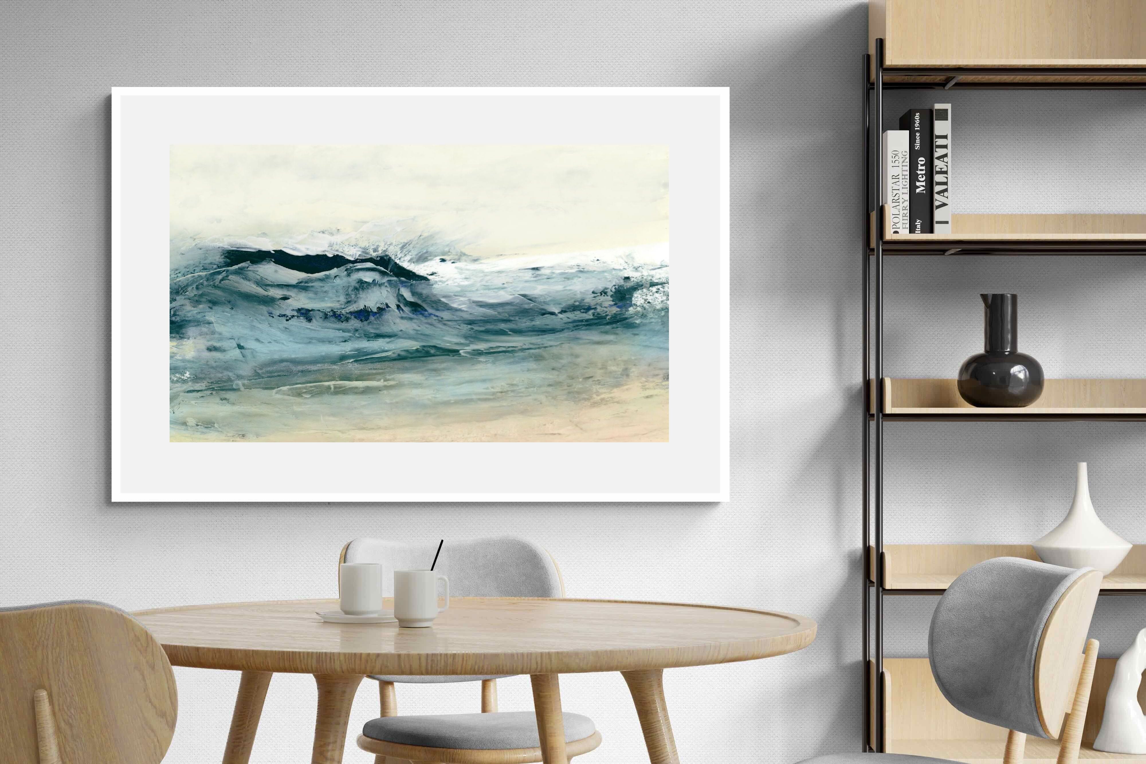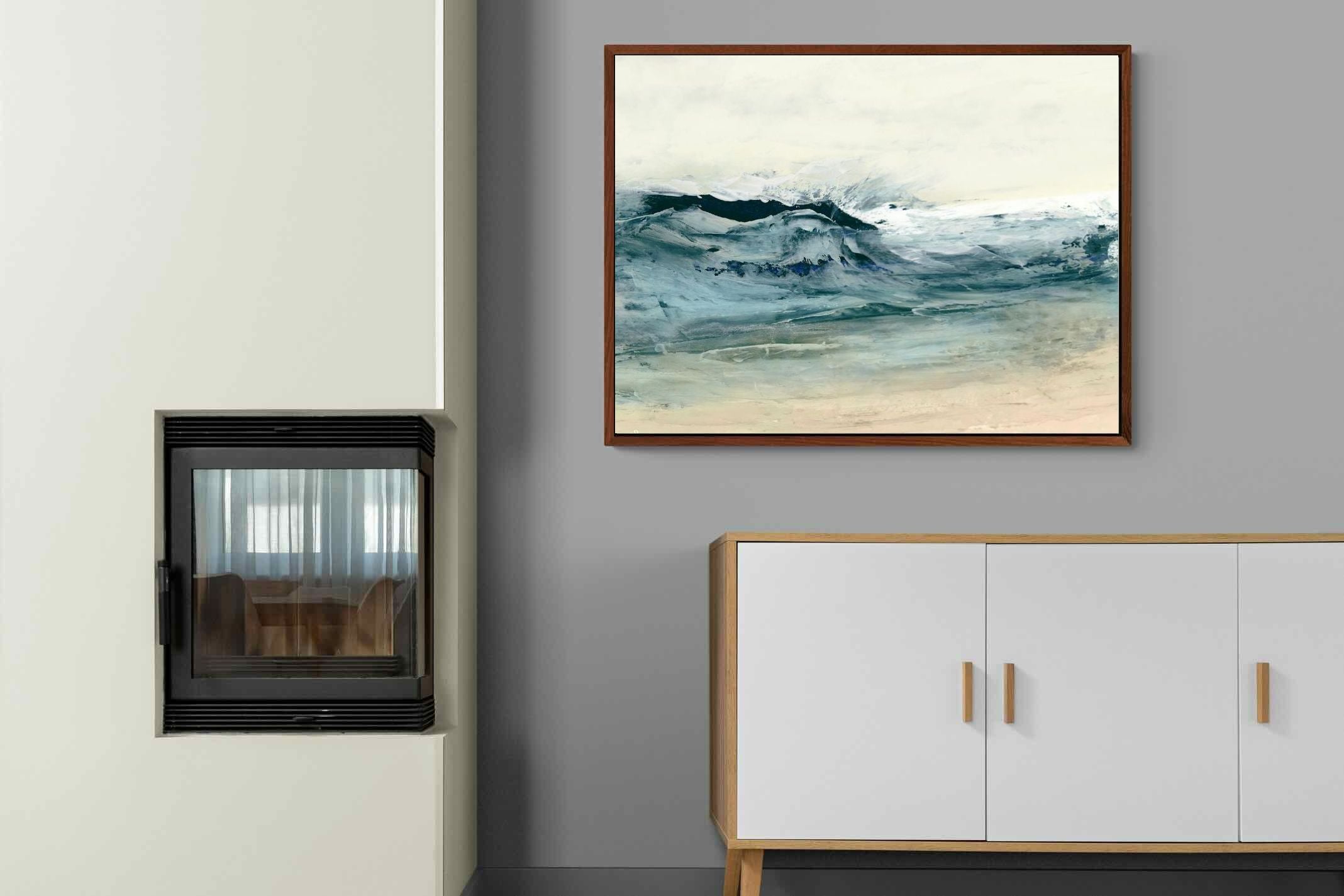 This painting portrays the dynamic movement of ocean waves with a blend of blues, whites, and hints of green. The textured layers and fluid brushstrokes convey the energy and power of the sea. This artwork would make a stunning addition to a contemporary home, adding a touch of nature's raw beauty and movement. Its vibrant yet calming colours can enhance the ambiance of a living room or bedroom.
