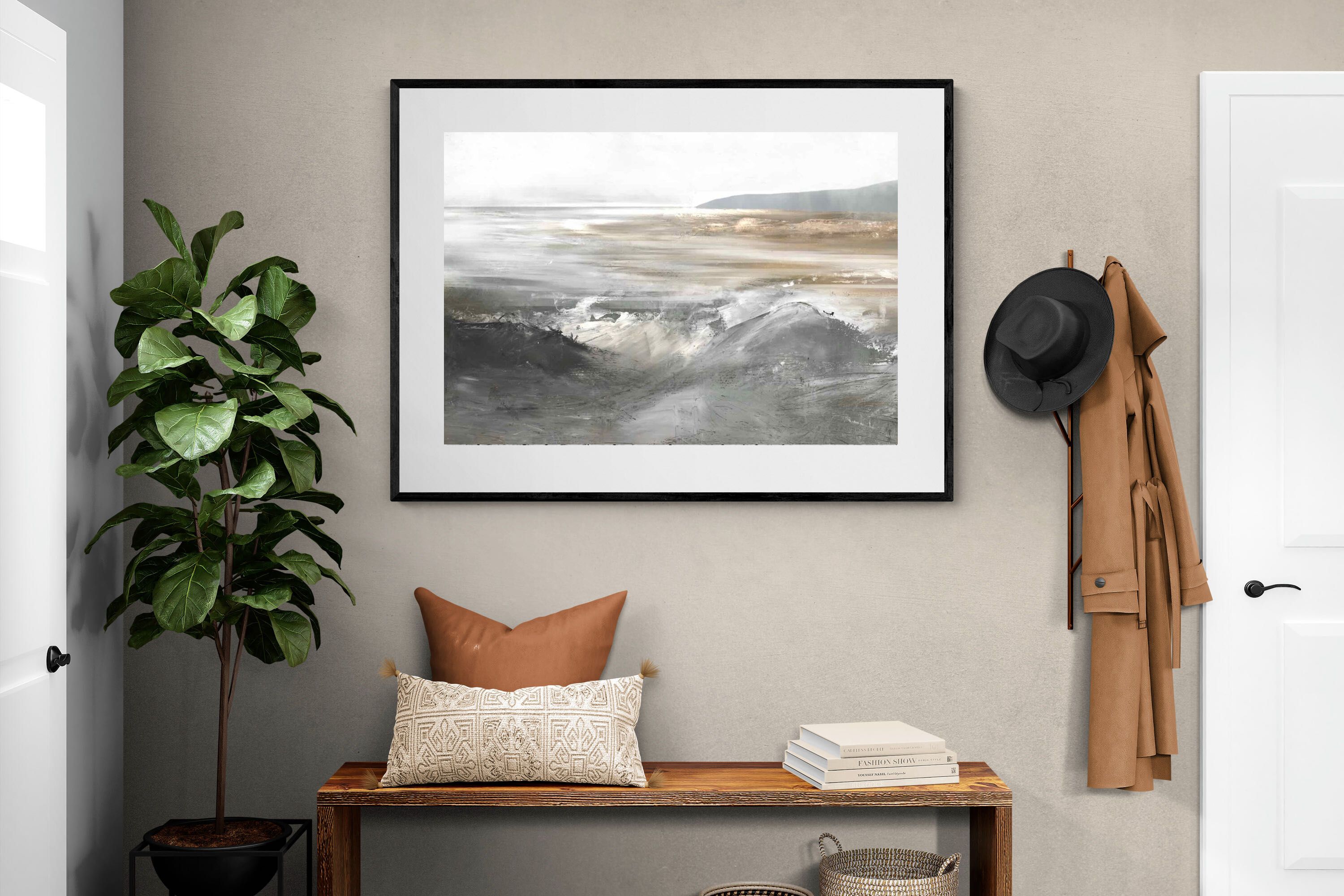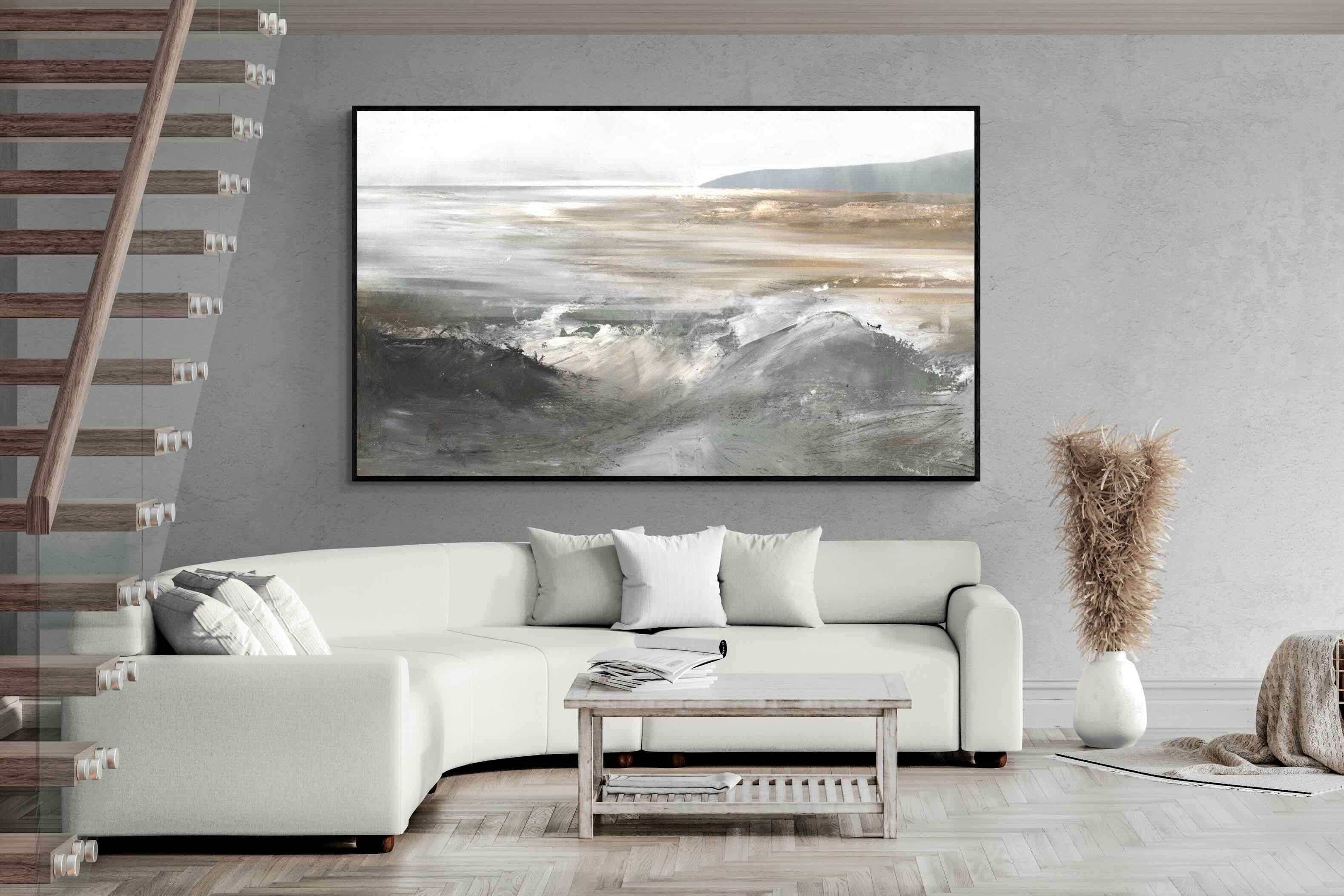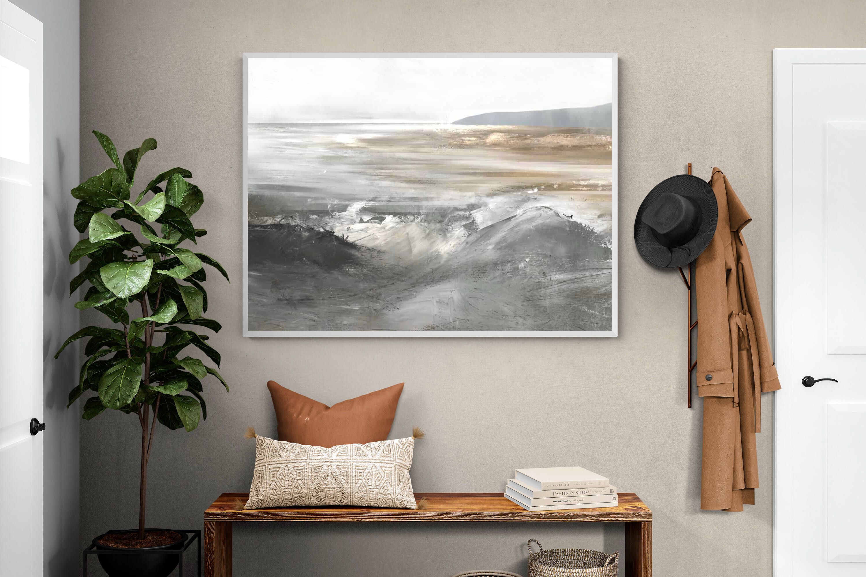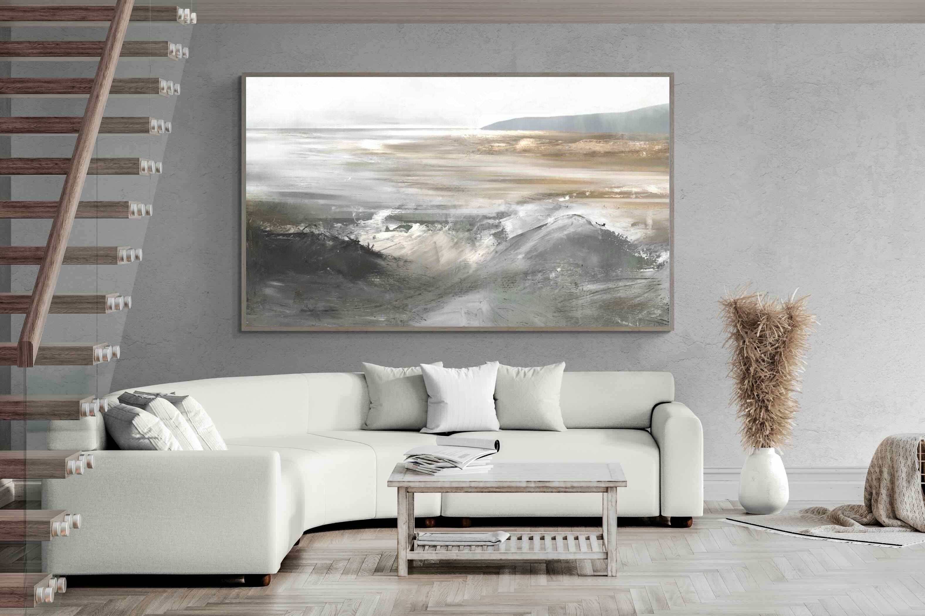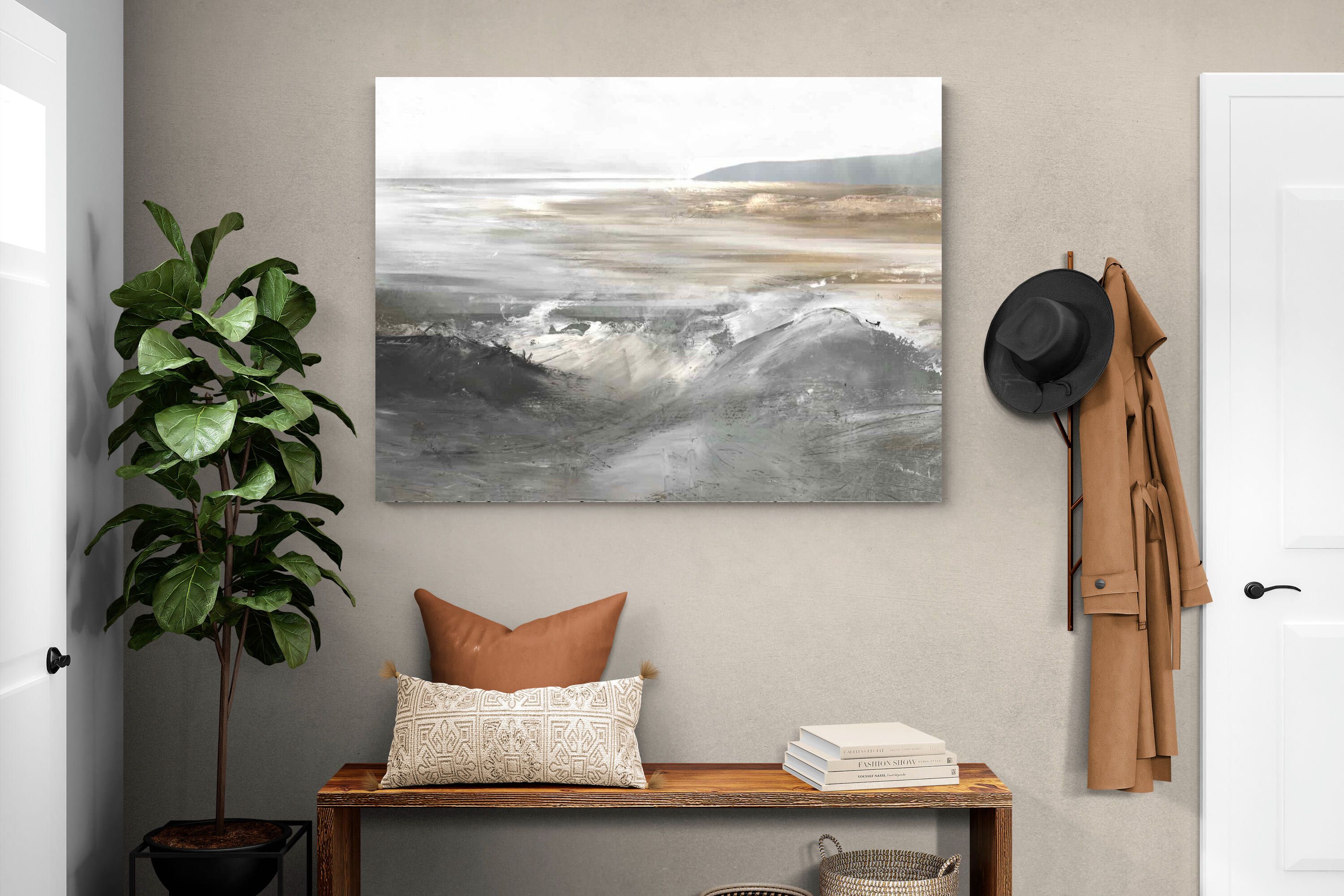 Evoking the feeling of a coastal landscape, this artwork uses soft gradients and a restrained colour palette to depict the interaction between land and sea. The impressionistic style and gentle transitions of colour suggest the calm of a distant shore. Its subtlety and abstract quality make it a versatile addition to contemporary homes, providing a serene and reflective atmosphere suitable for a variety of spaces.
