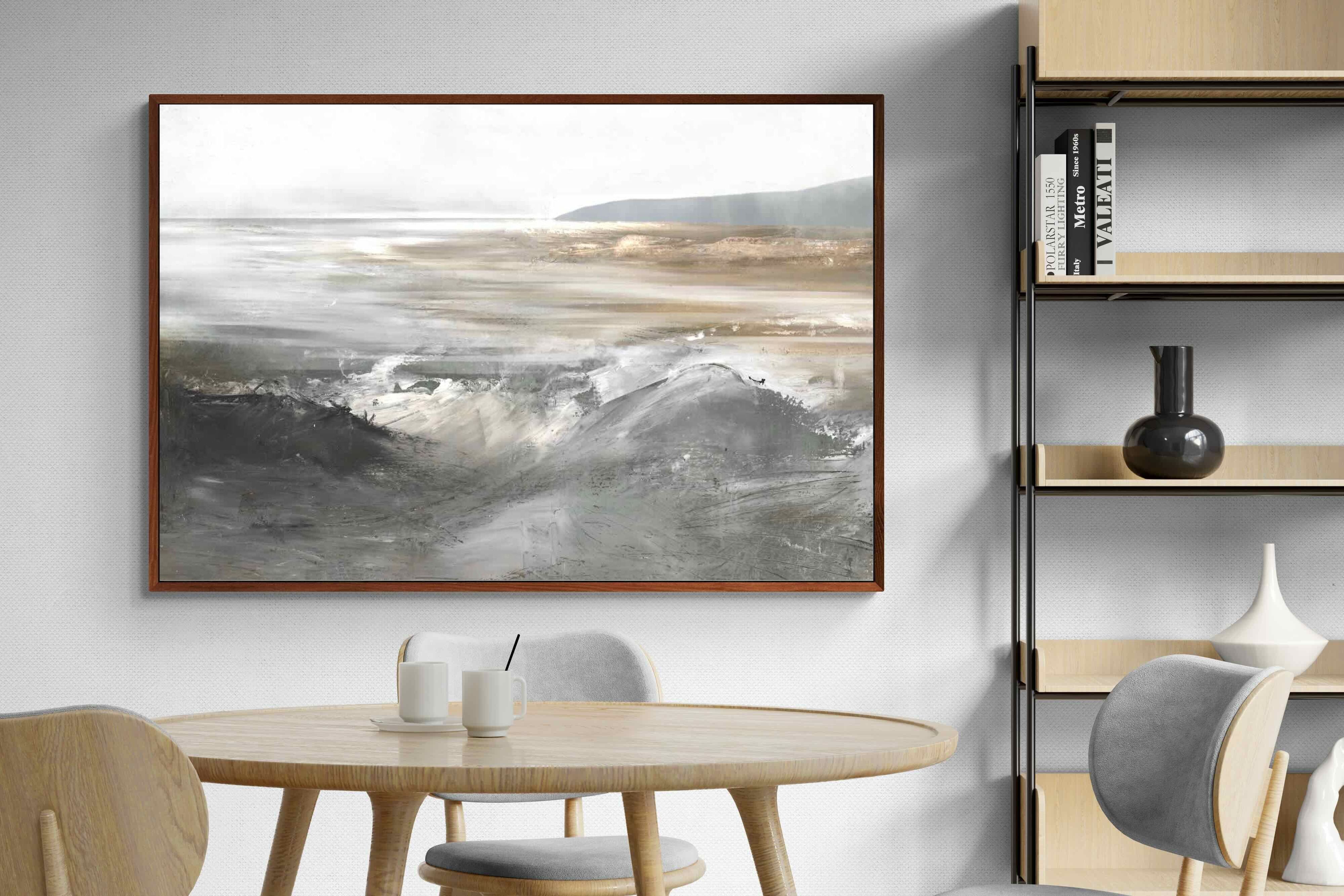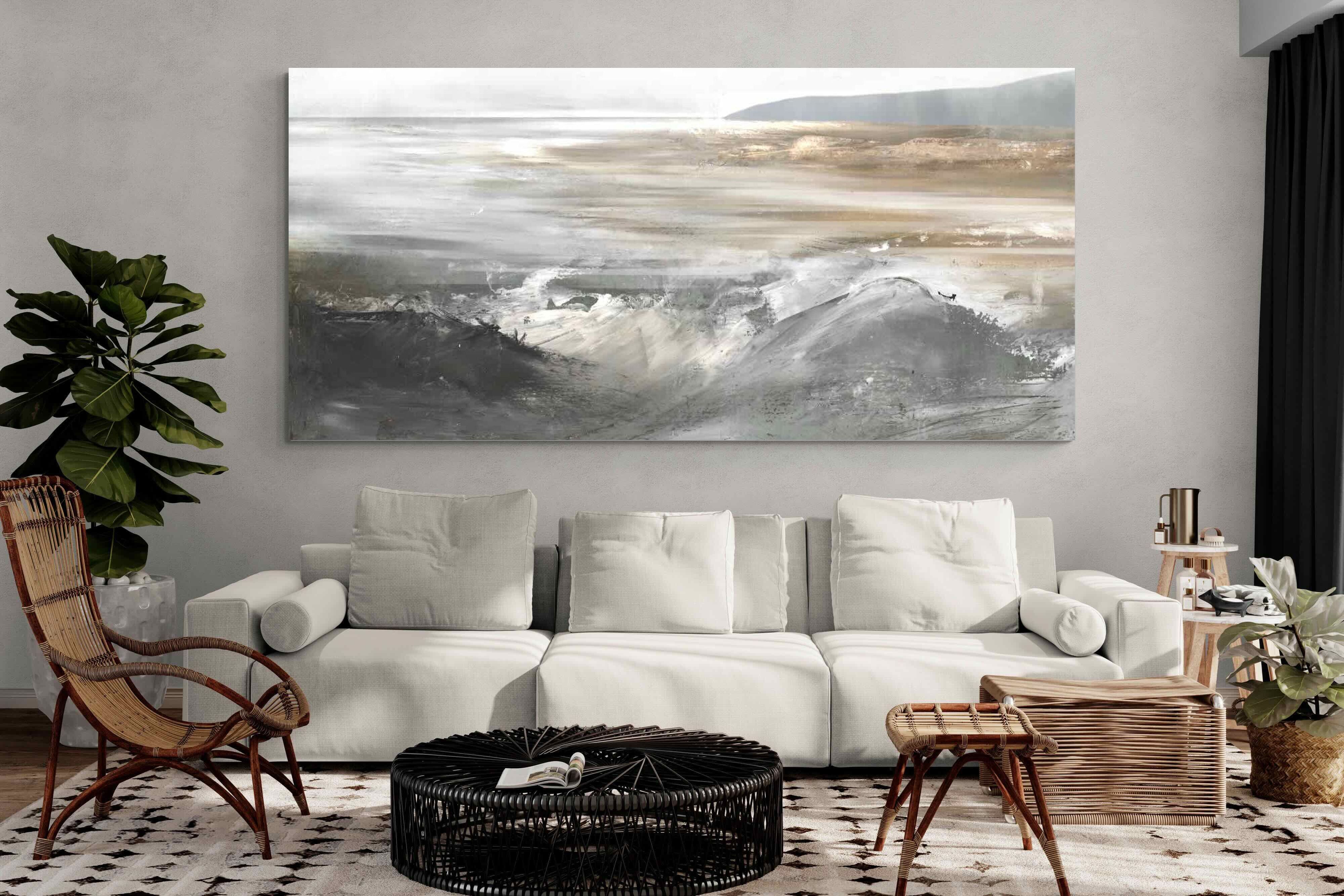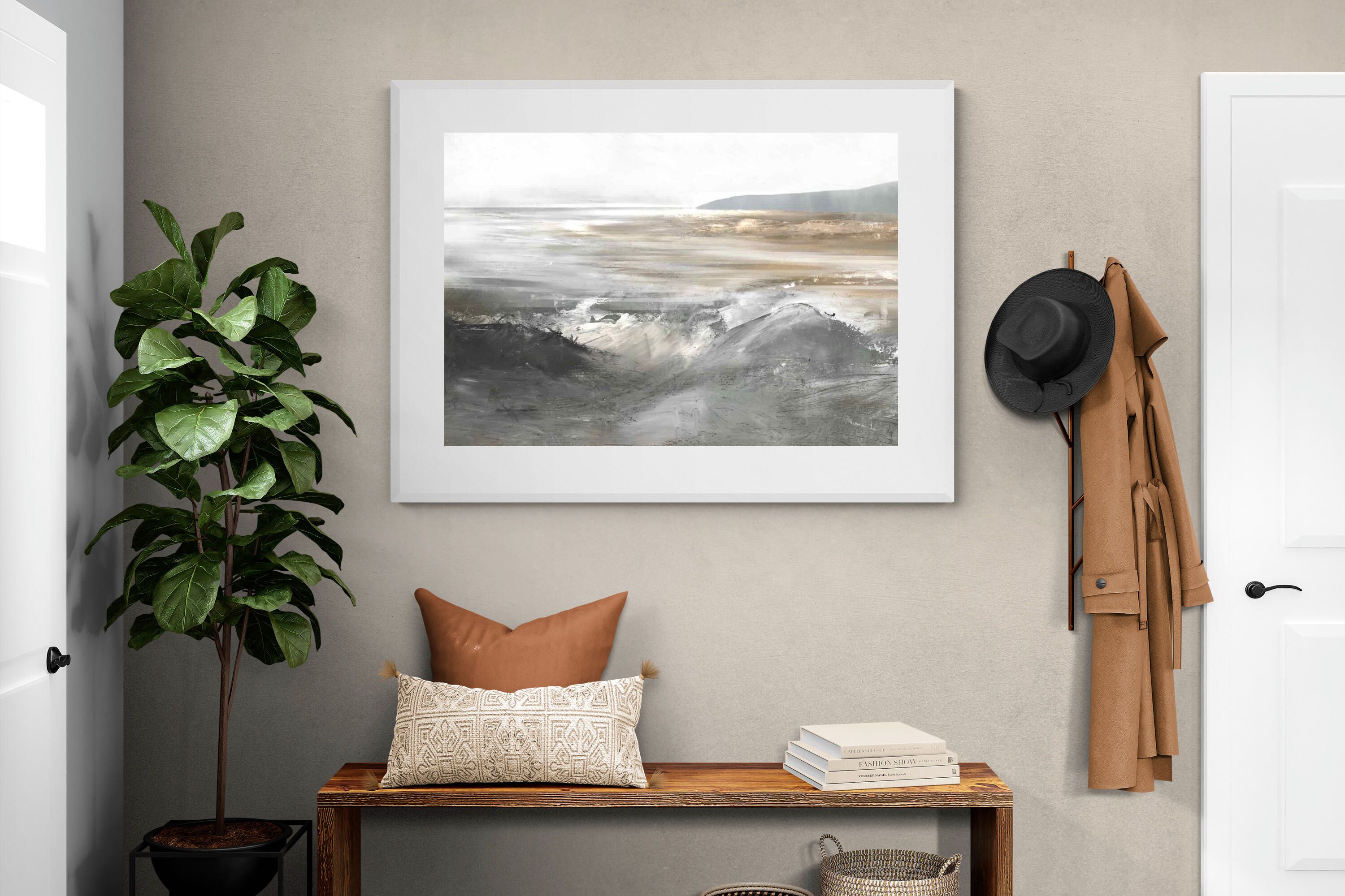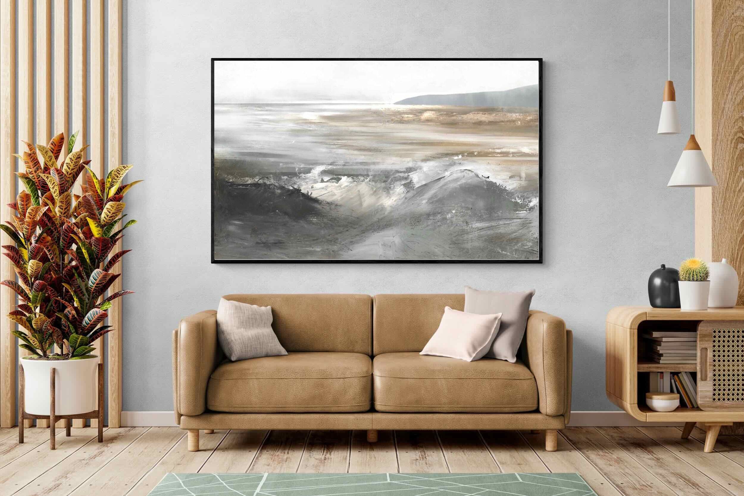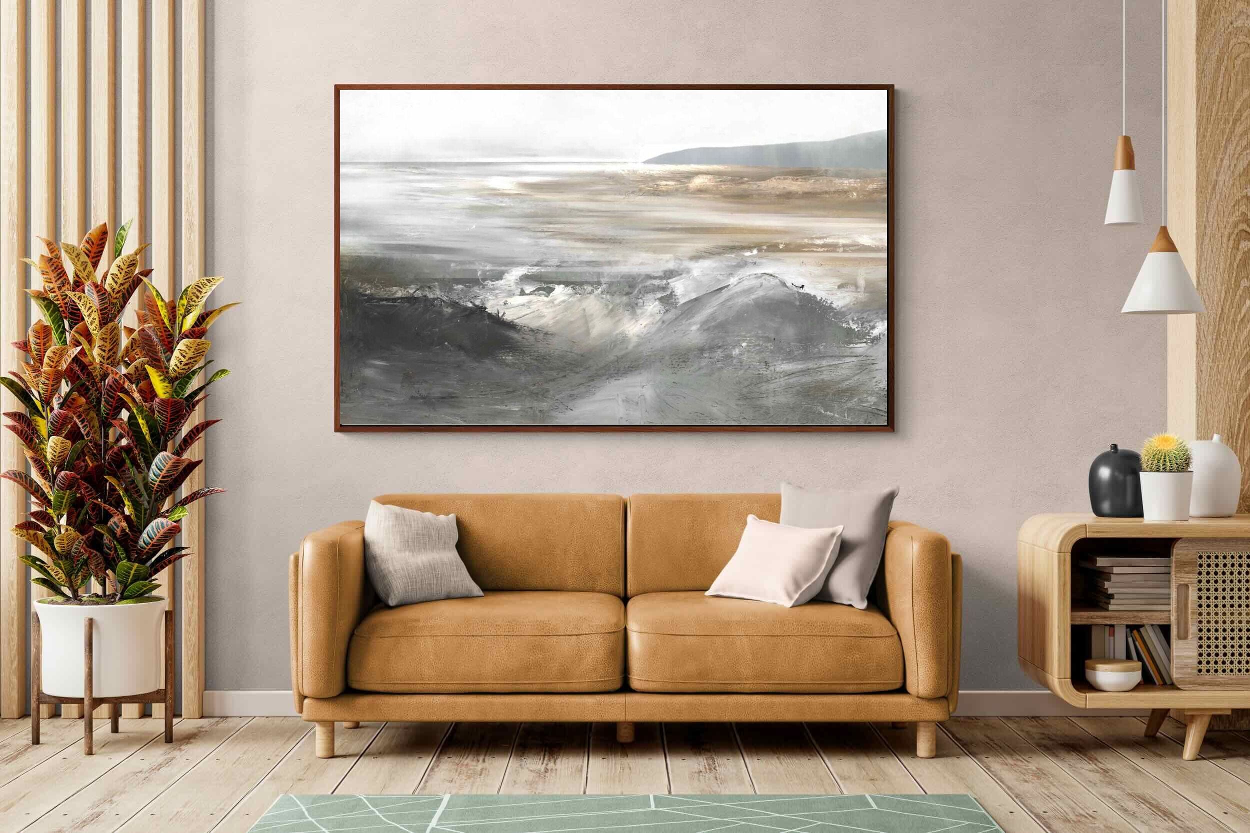 Evoking the feeling of a coastal landscape, this artwork uses soft gradients and a restrained colour palette to depict the interaction between land and sea. The impressionistic style and gentle transitions of colour suggest the calm of a distant shore. Its subtlety and abstract quality make it a versatile addition to contemporary homes, providing a serene and reflective atmosphere suitable for a variety of spaces.