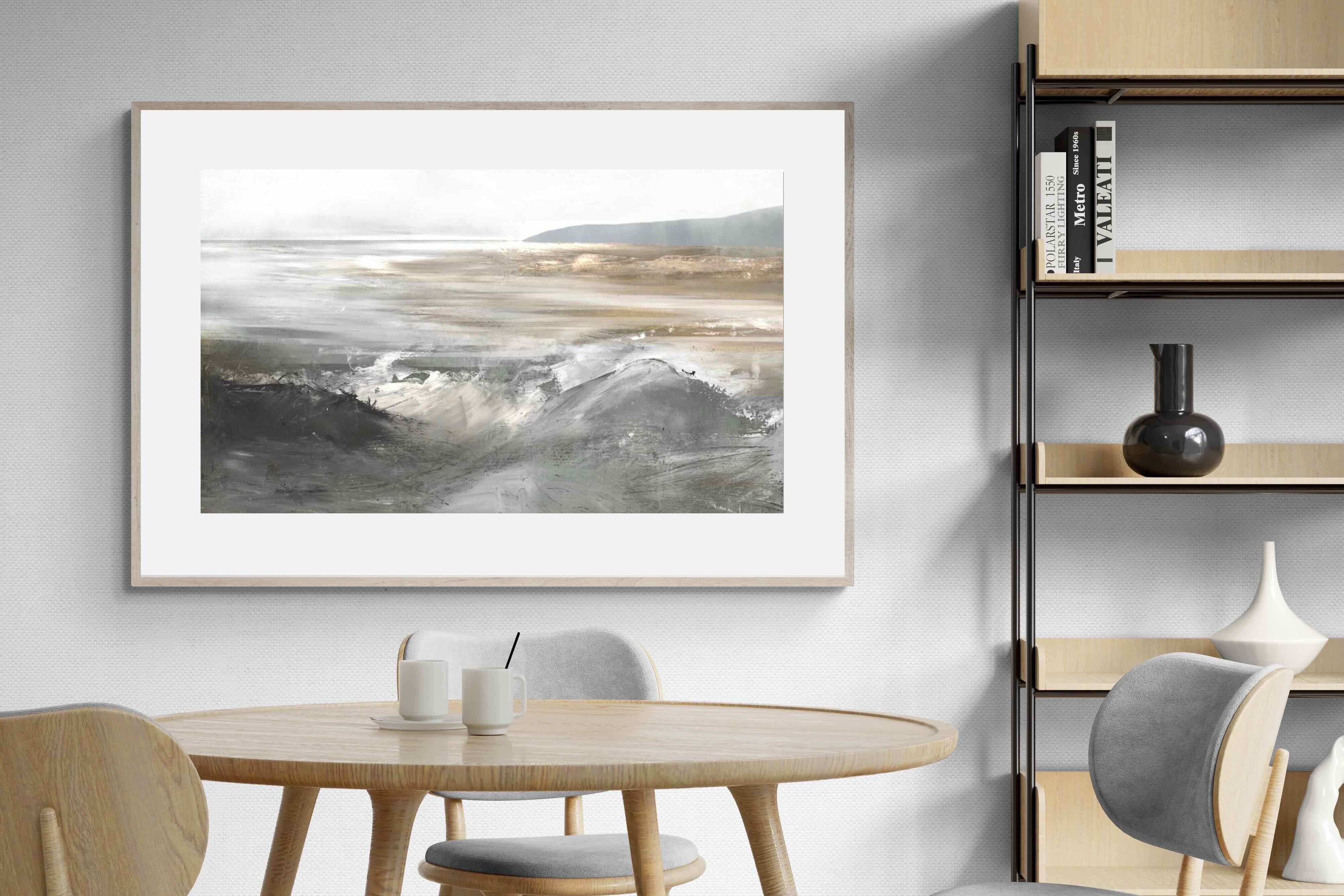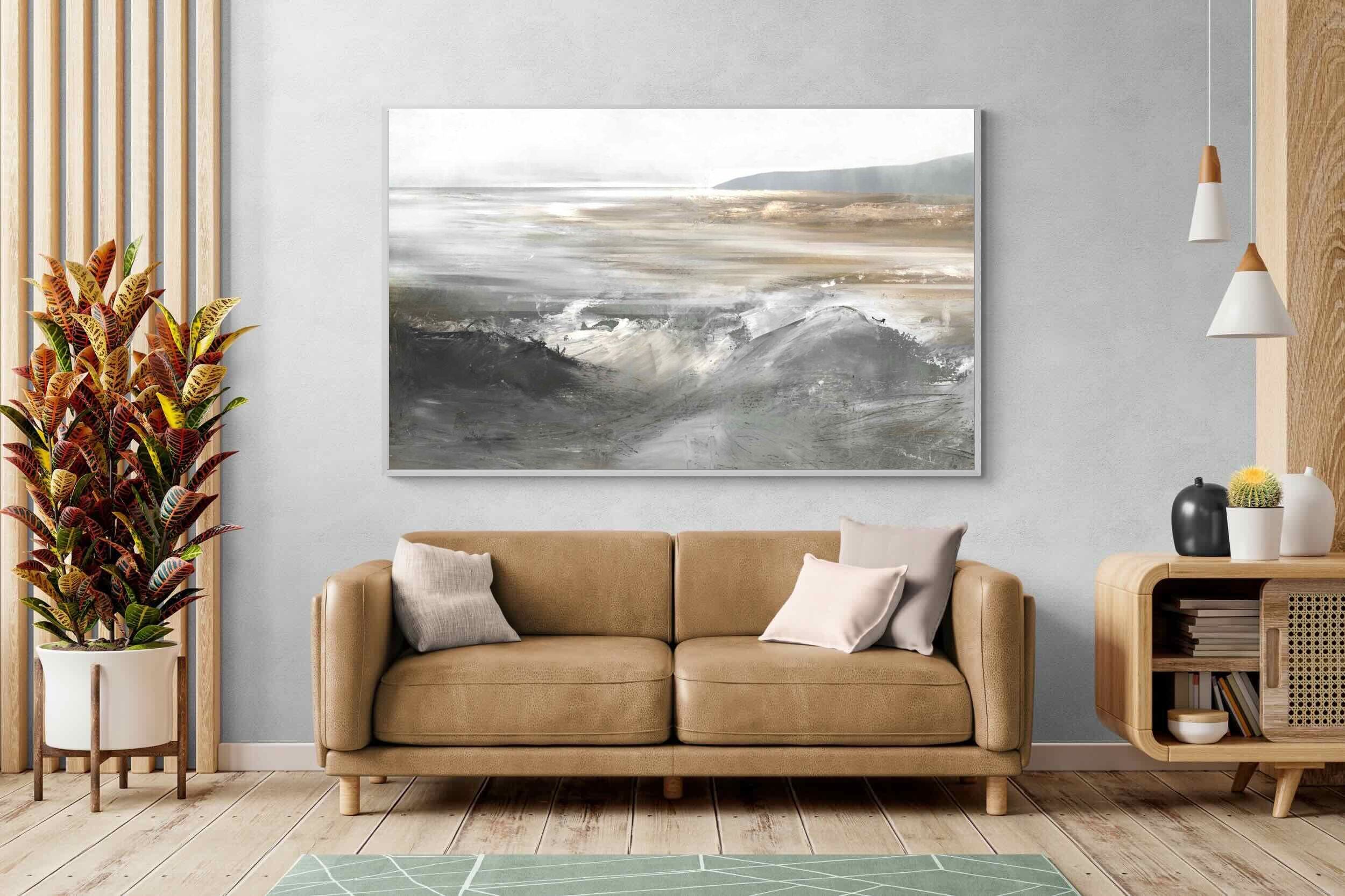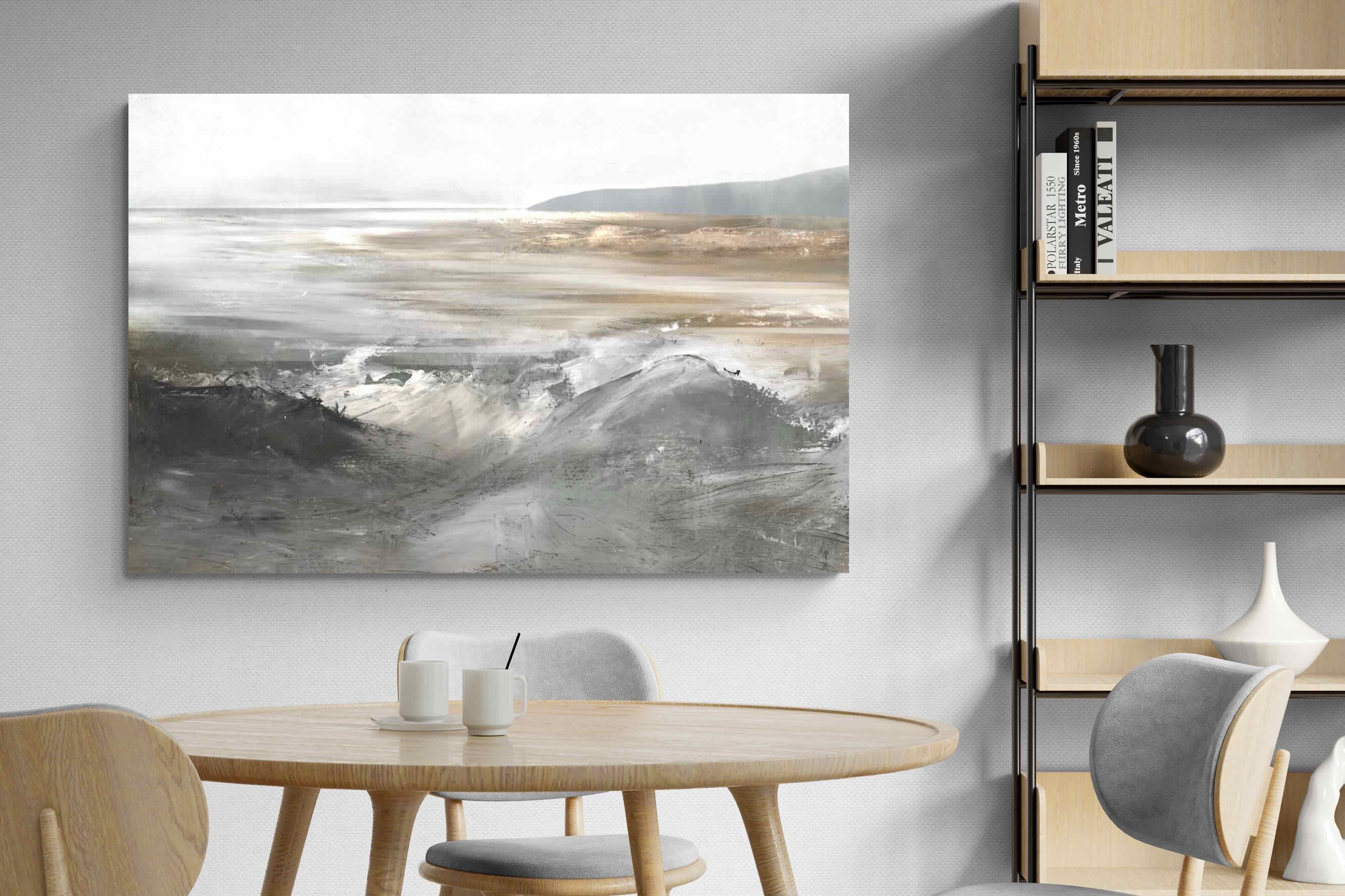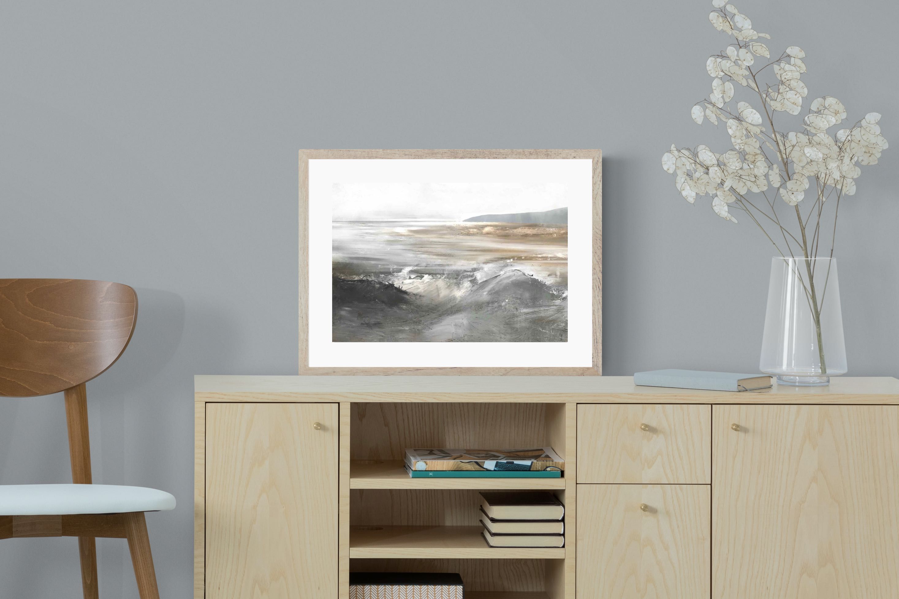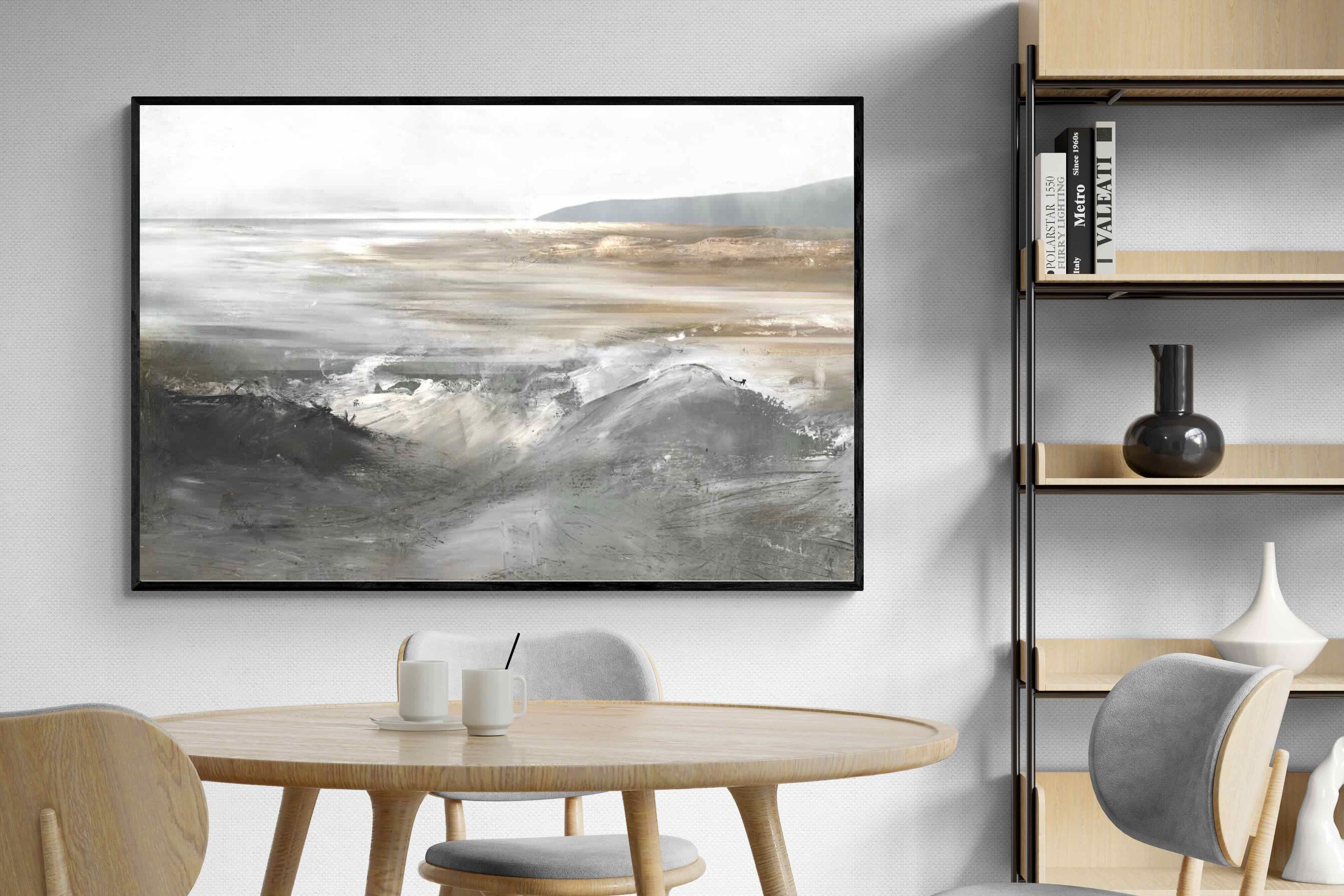 Evoking the feeling of a coastal landscape, this artwork uses soft gradients and a restrained colour palette to depict the interaction between land and sea. The impressionistic style and gentle transitions of colour suggest the calm of a distant shore. Its subtlety and abstract quality make it a versatile addition to contemporary homes, providing a serene and reflective atmosphere suitable for a variety of spaces.