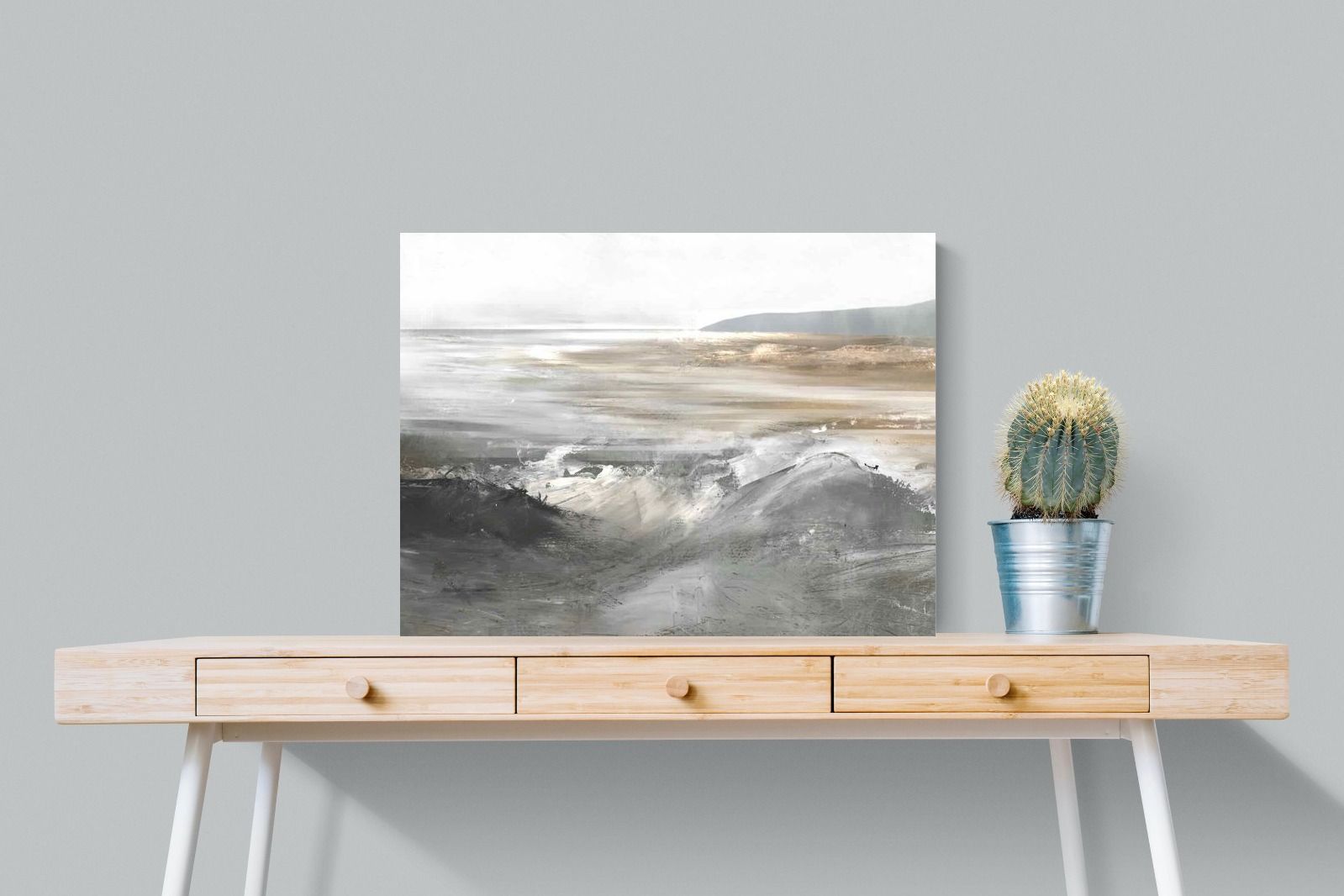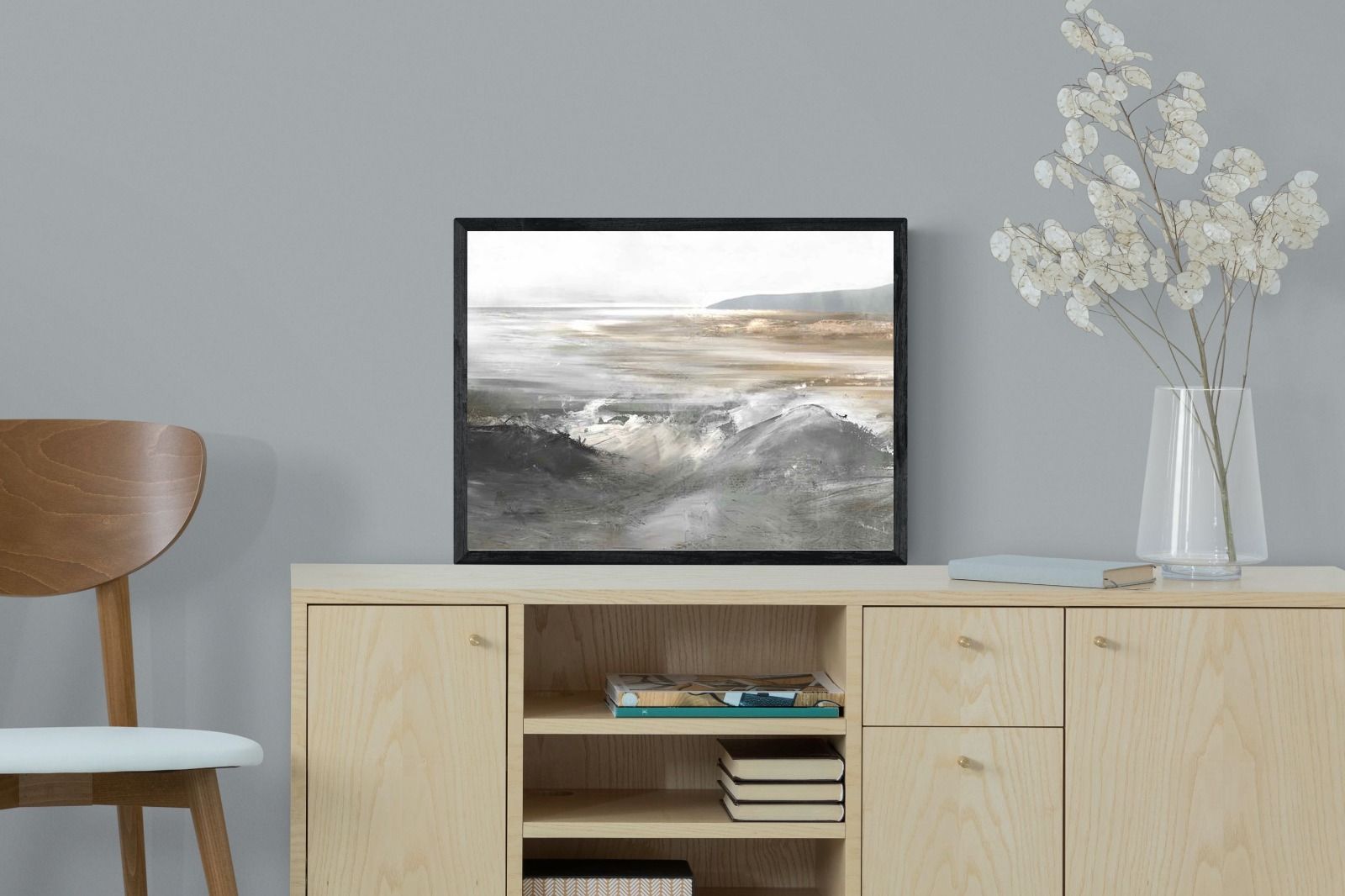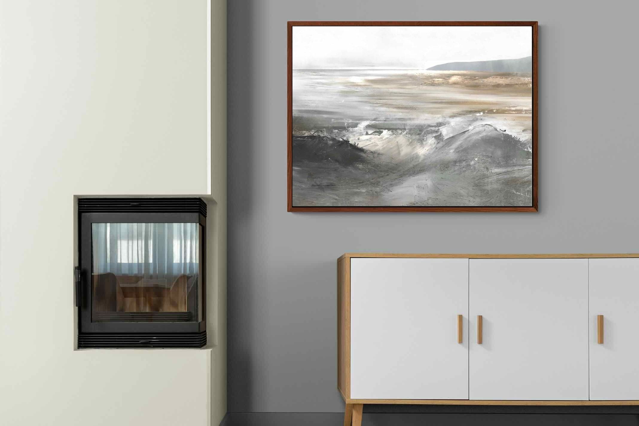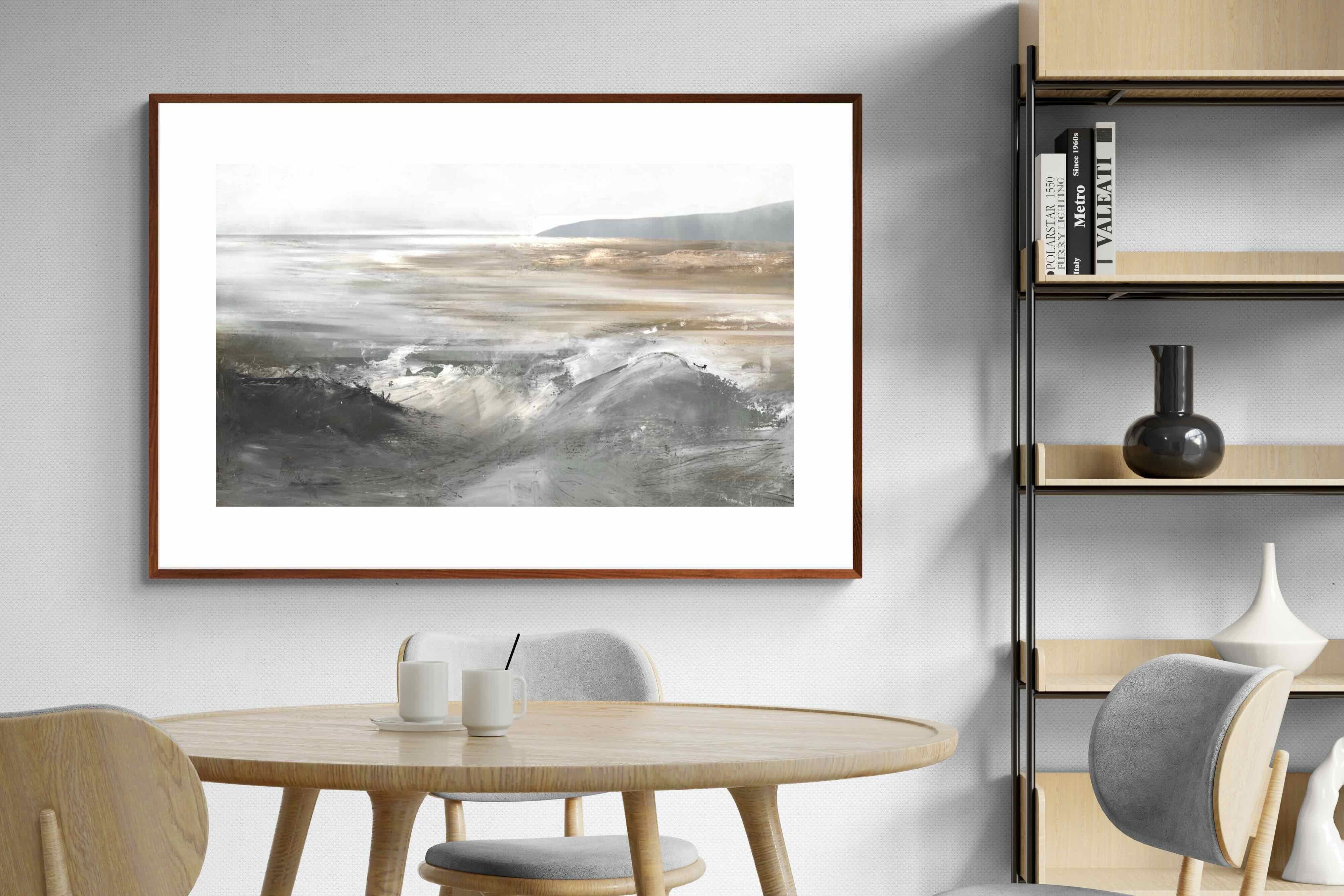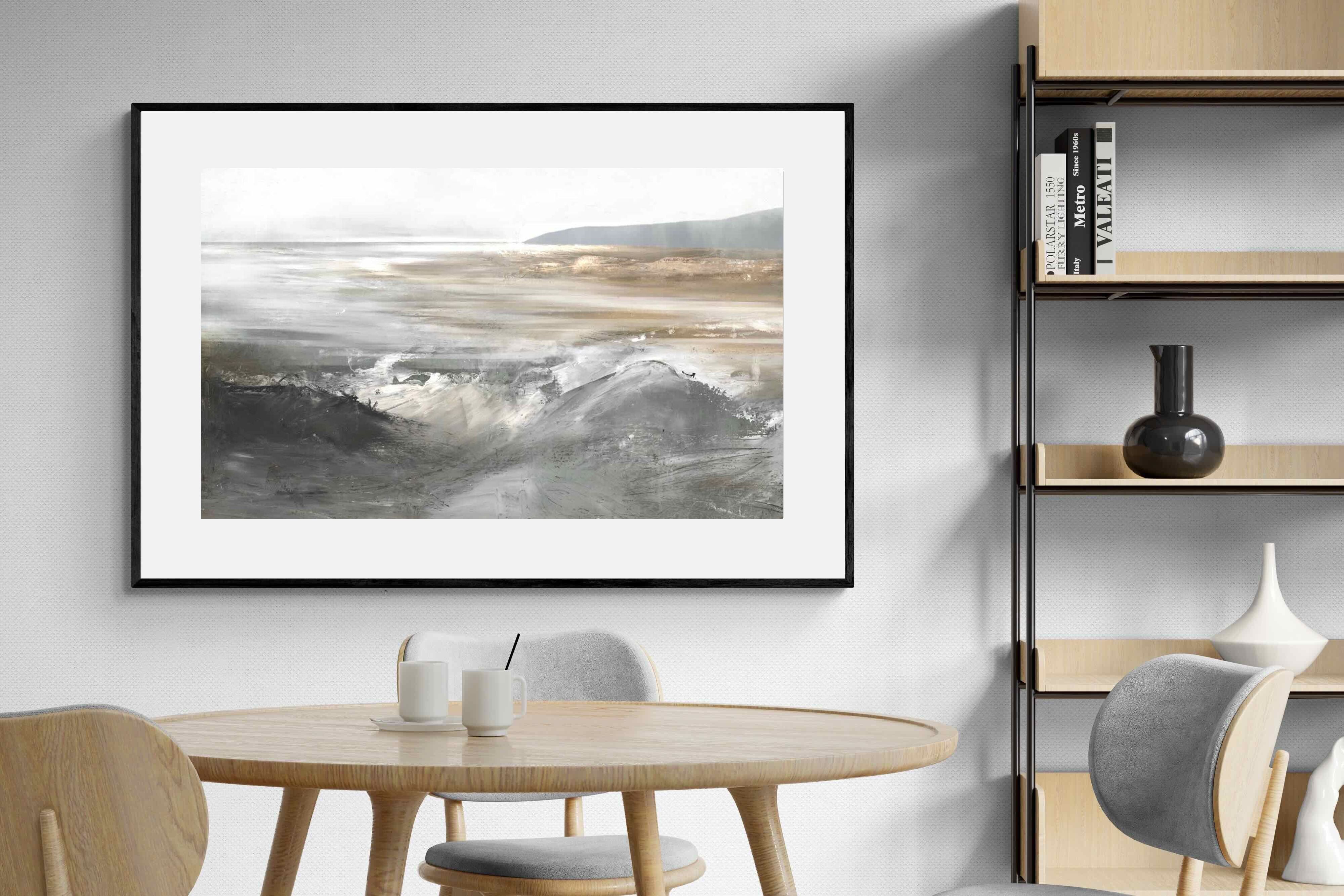 Evoking the feeling of a coastal landscape, this artwork uses soft gradients and a restrained colour palette to depict the interaction between land and sea. The impressionistic style and gentle transitions of colour suggest the calm of a distant shore. Its subtlety and abstract quality make it a versatile addition to contemporary homes, providing a serene and reflective atmosphere suitable for a variety of spaces.