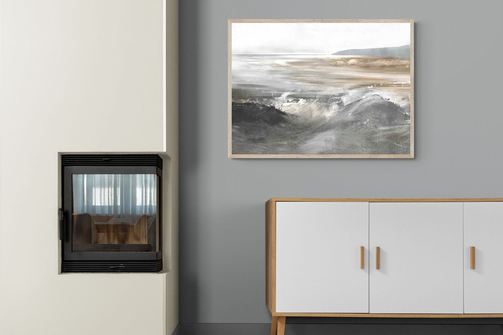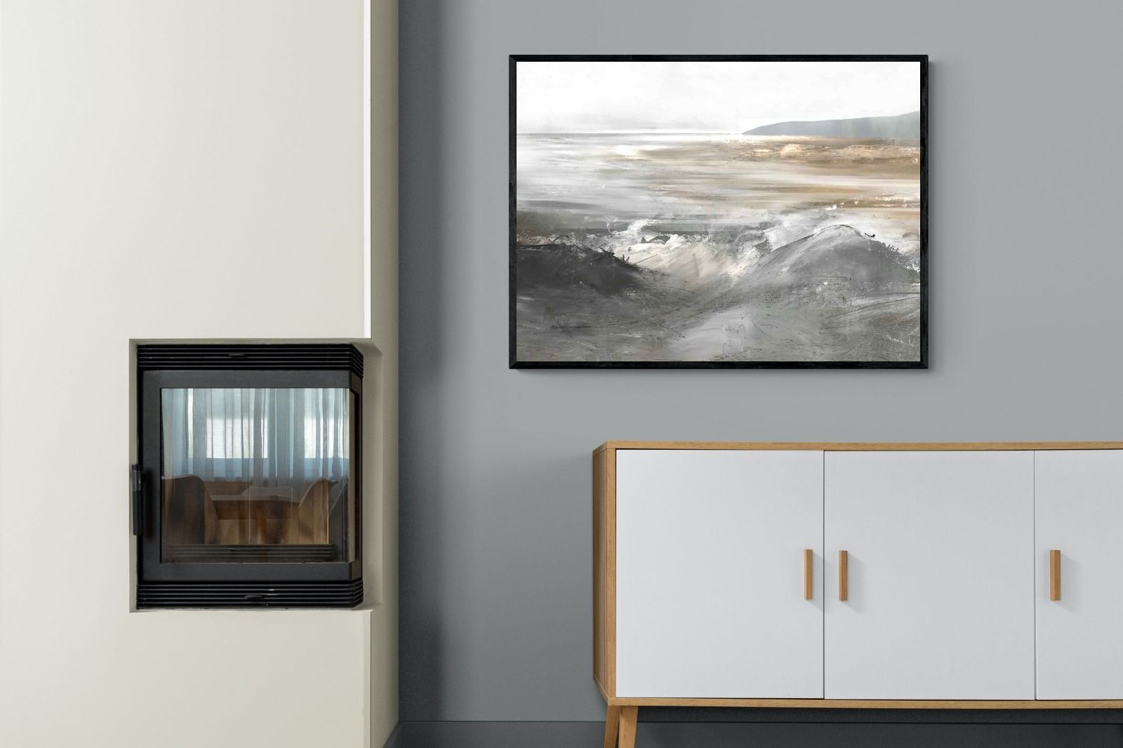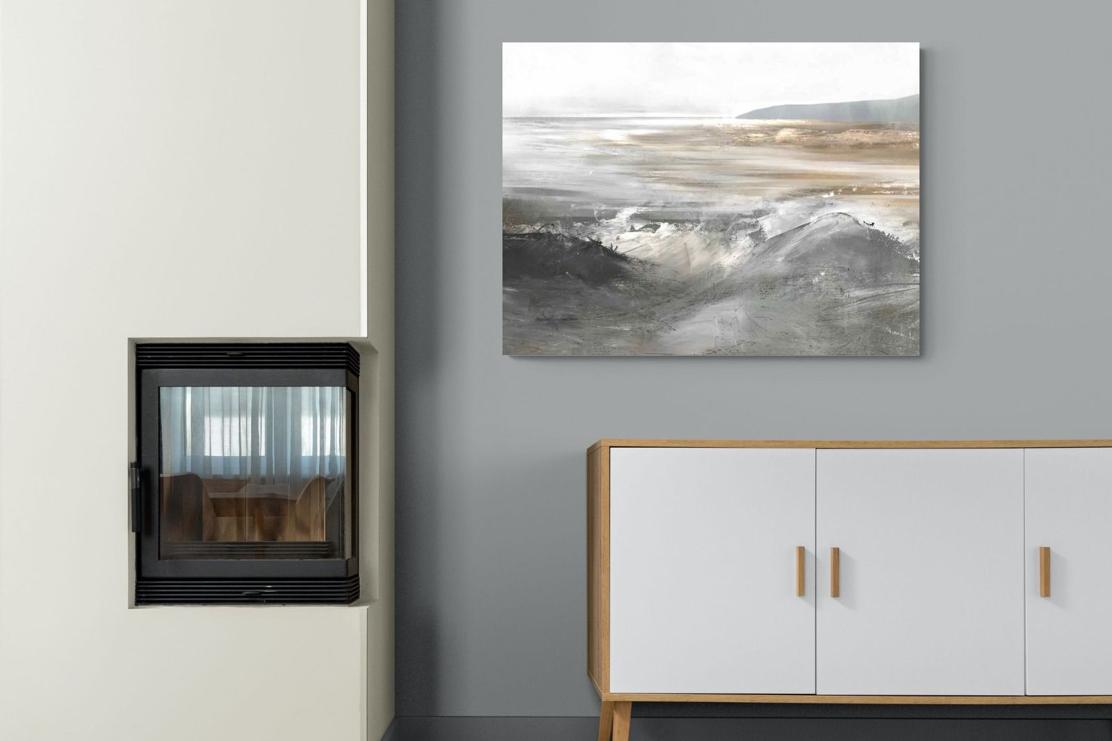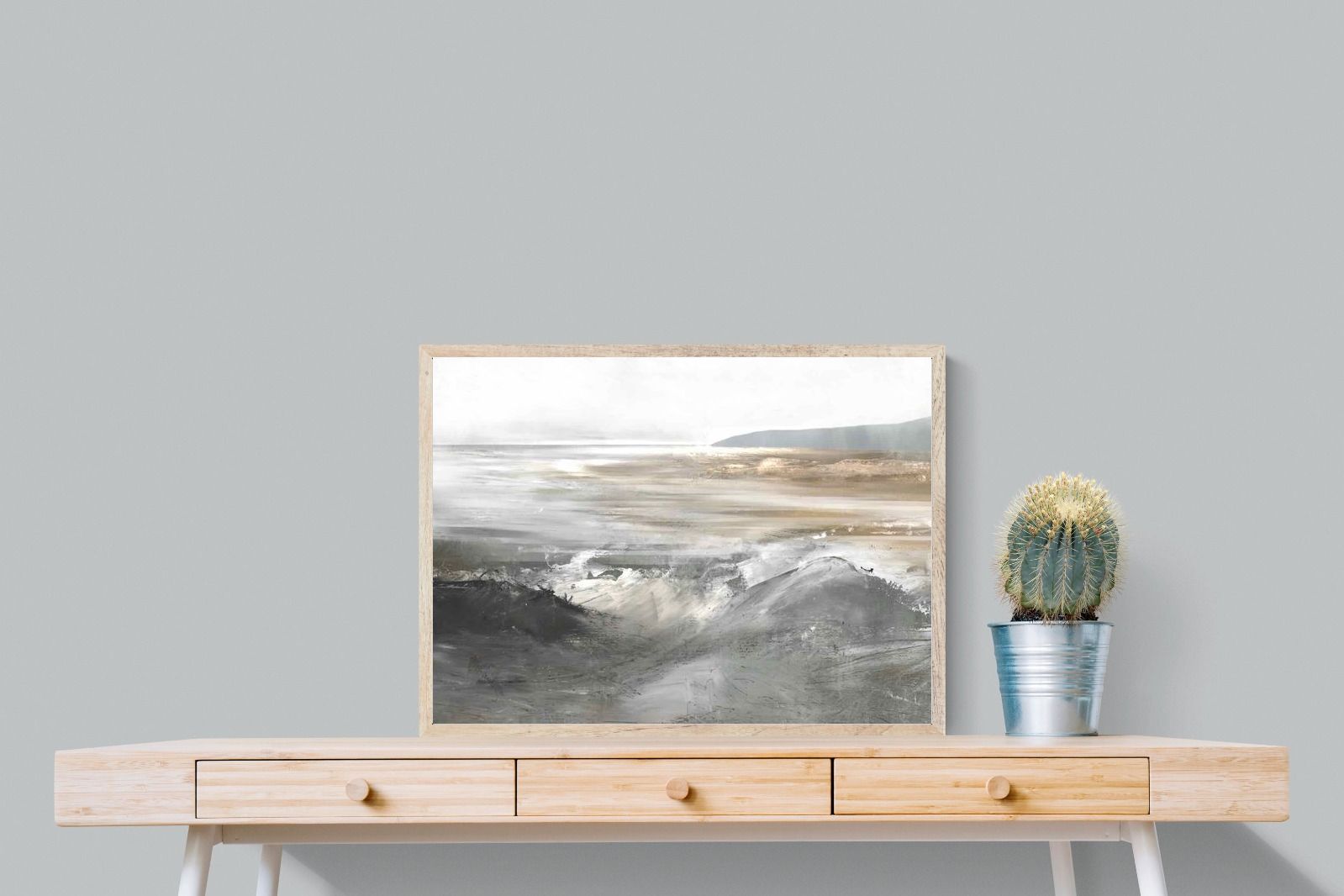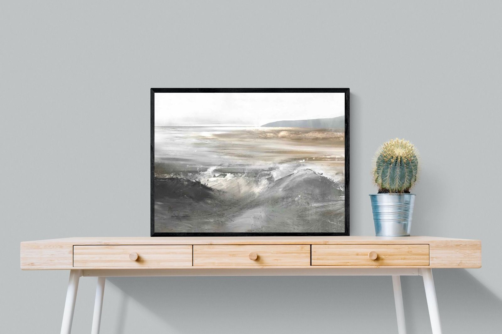 Evoking the feeling of a coastal landscape, this artwork uses soft gradients and a restrained colour palette to depict the interaction between land and sea. The impressionistic style and gentle transitions of colour suggest the calm of a distant shore. Its subtlety and abstract quality make it a versatile addition to contemporary homes, providing a serene and reflective atmosphere suitable for a variety of spaces.