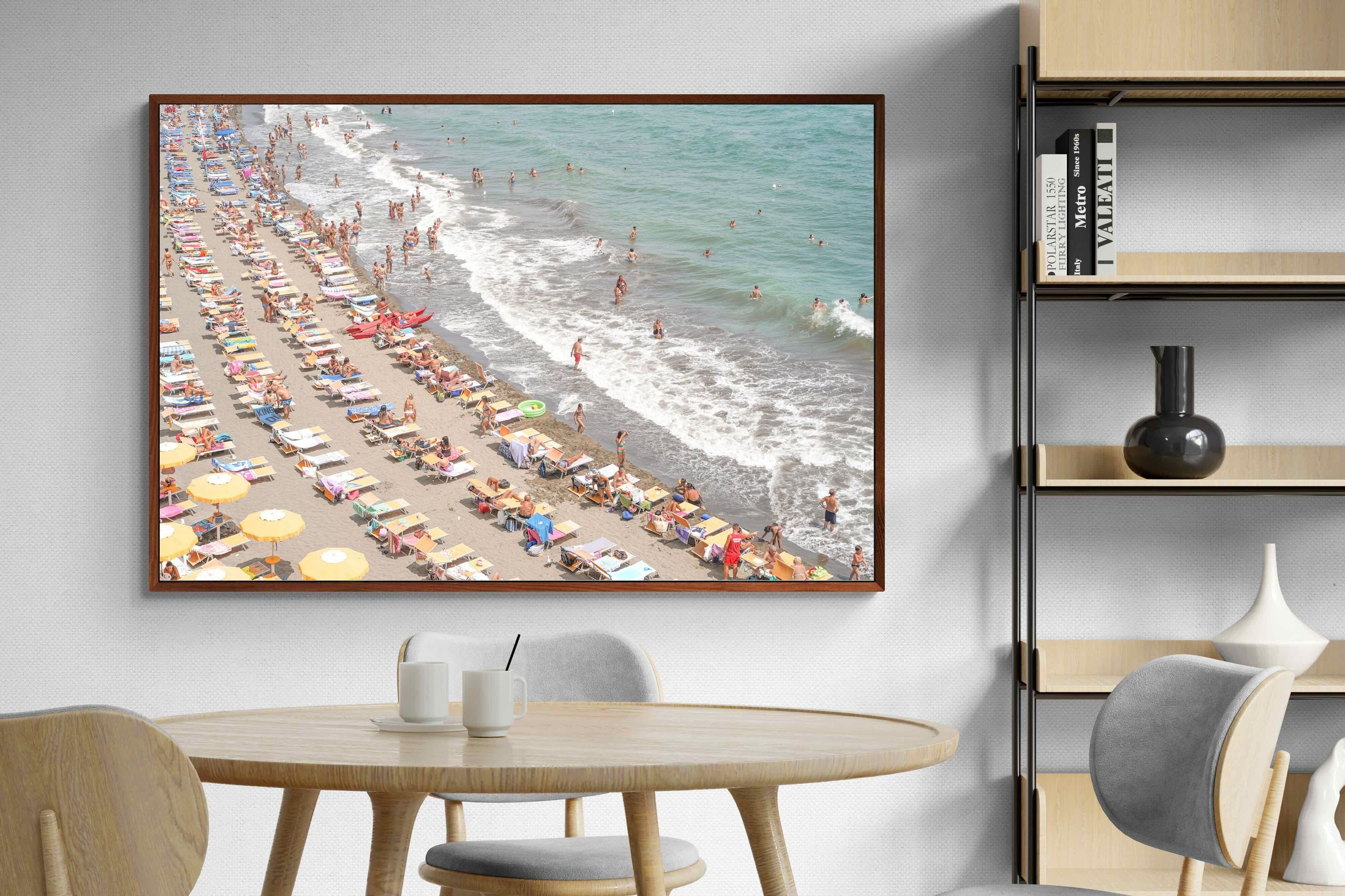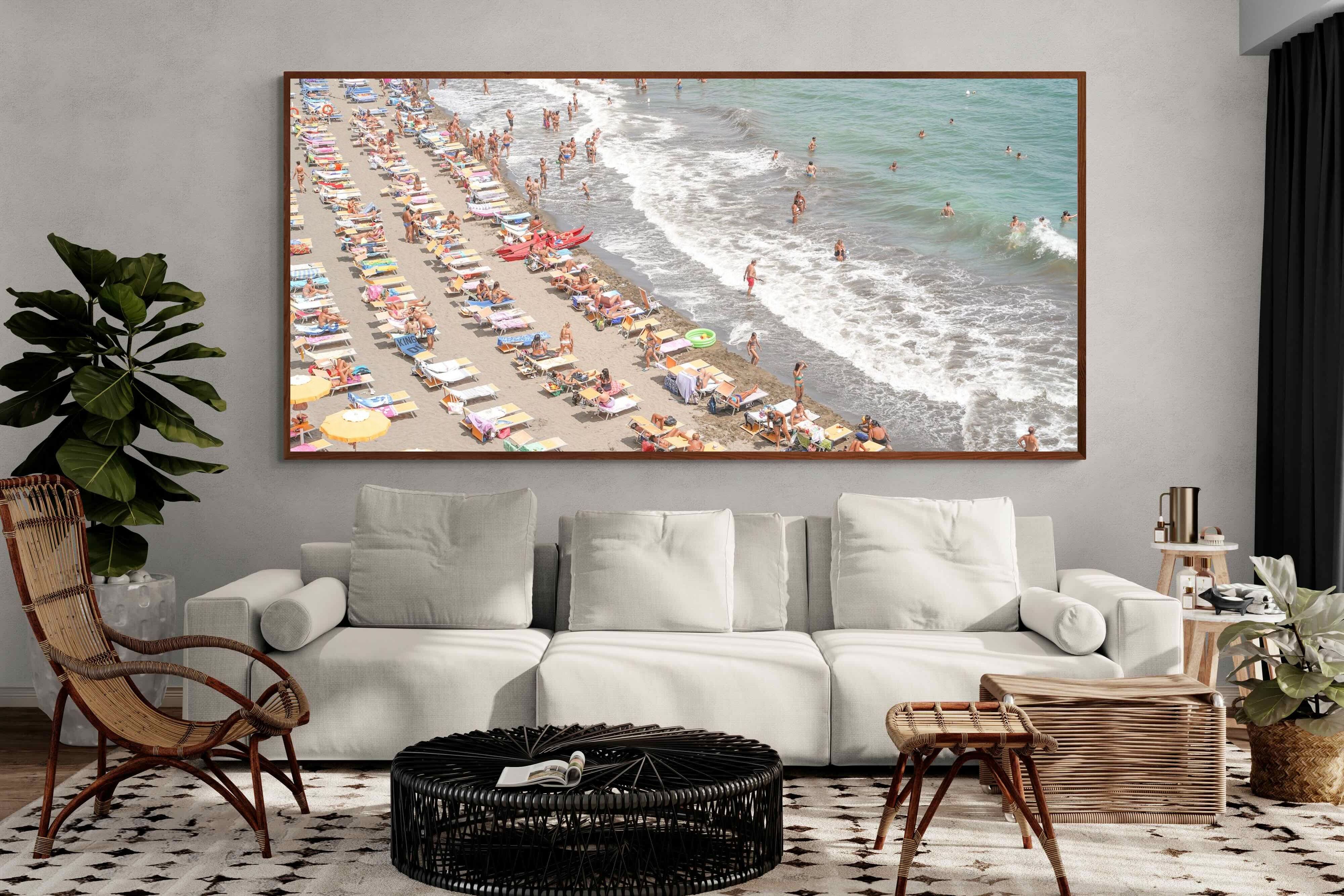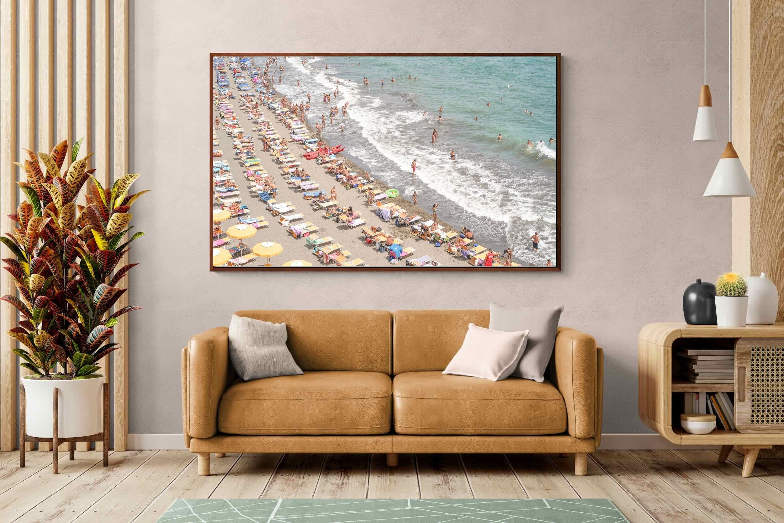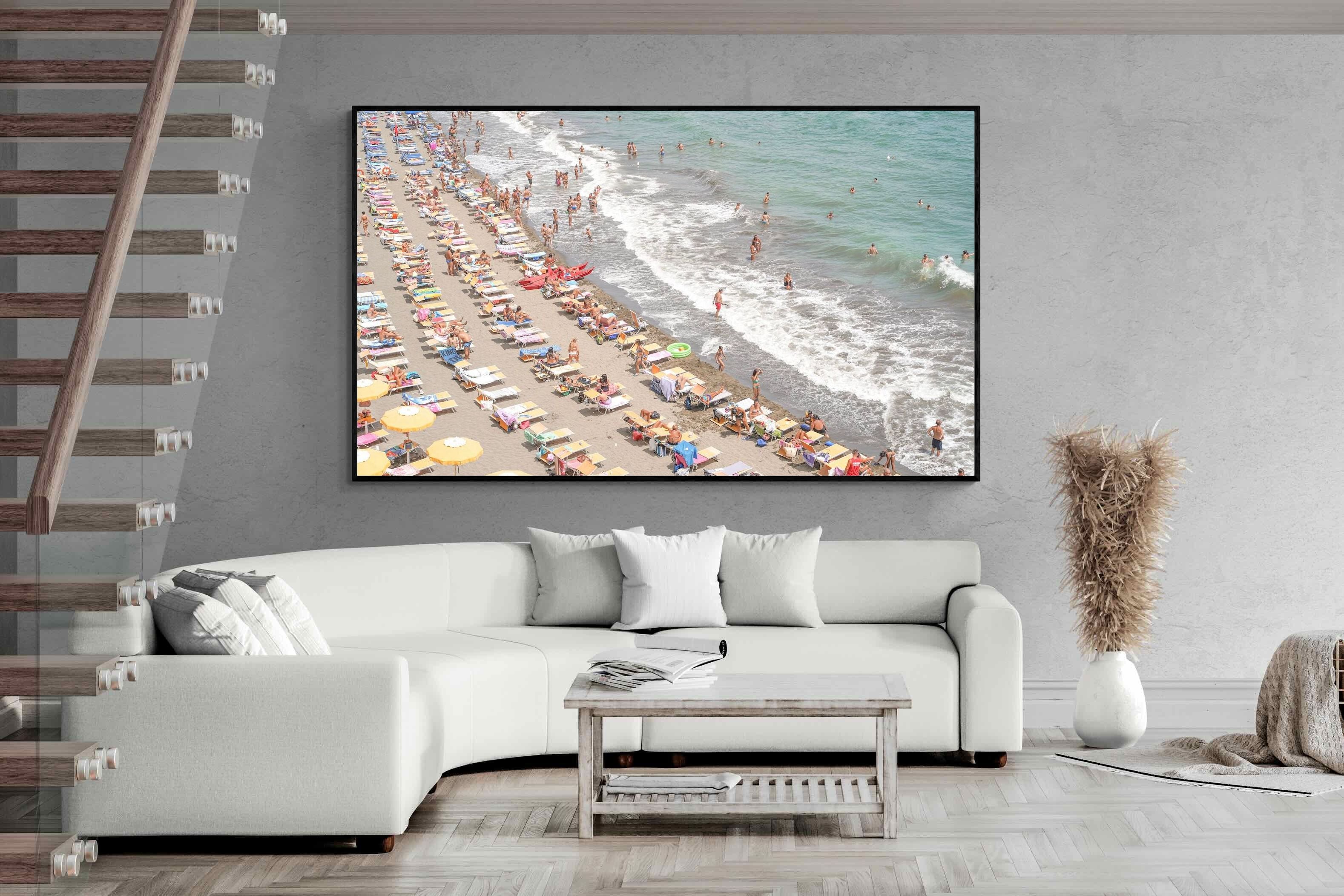 Rows of pastel loungers line the shoreline as waves fold gently onto the sand, capturing the lively rhythm of an Italian summer afternoon. The soft, sun-washed tones balance colour with refinement, preventing the scene from feeling chaotic. Ideal for relaxed living rooms, holiday homes or vibrant coastal interiors, this artwork introduces movement and warmth while maintaining a curated, editorial finish.