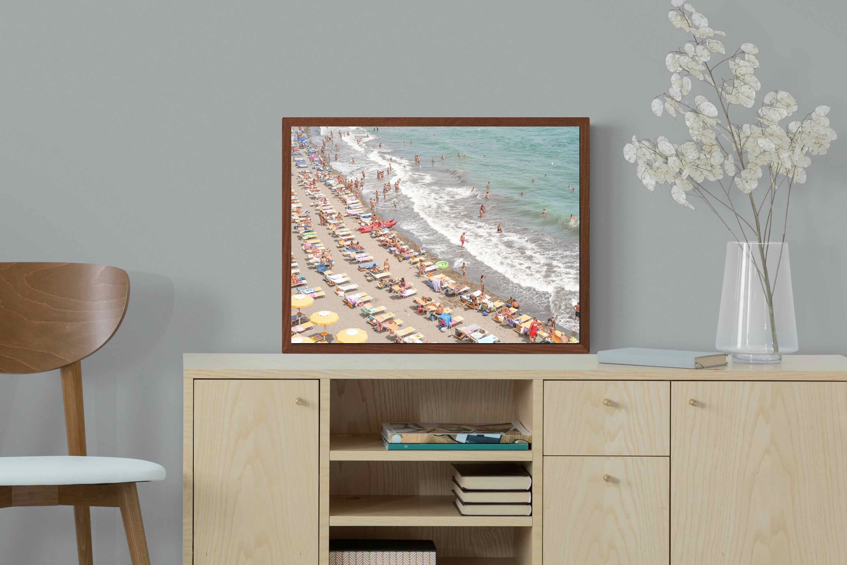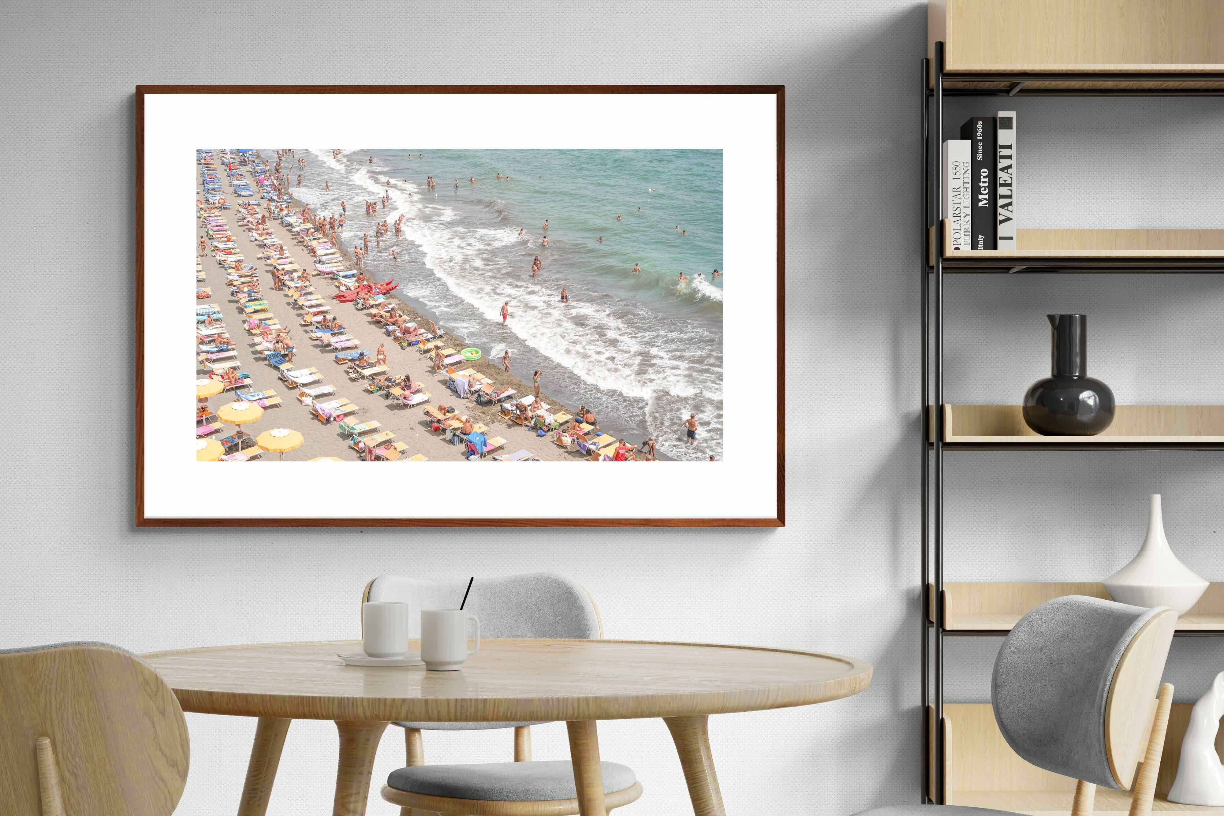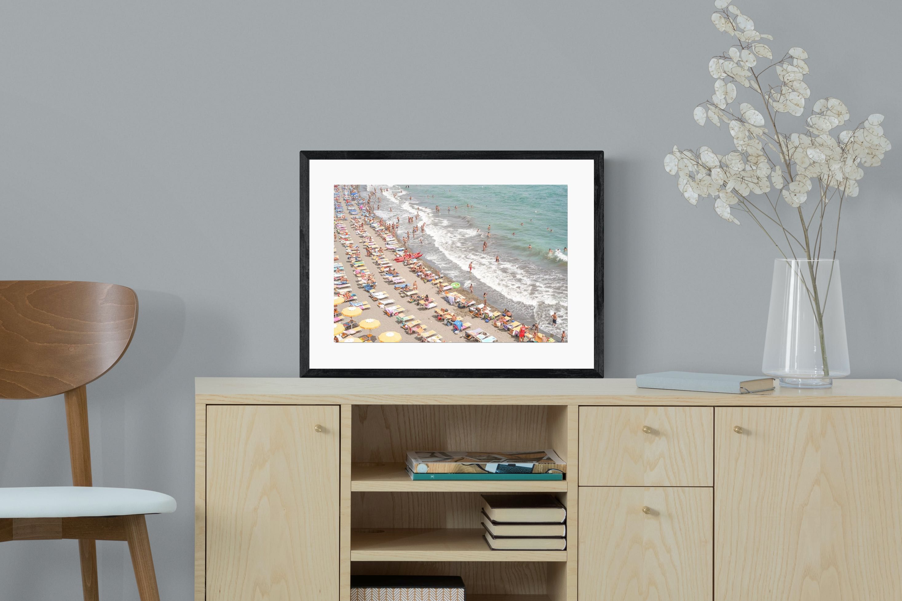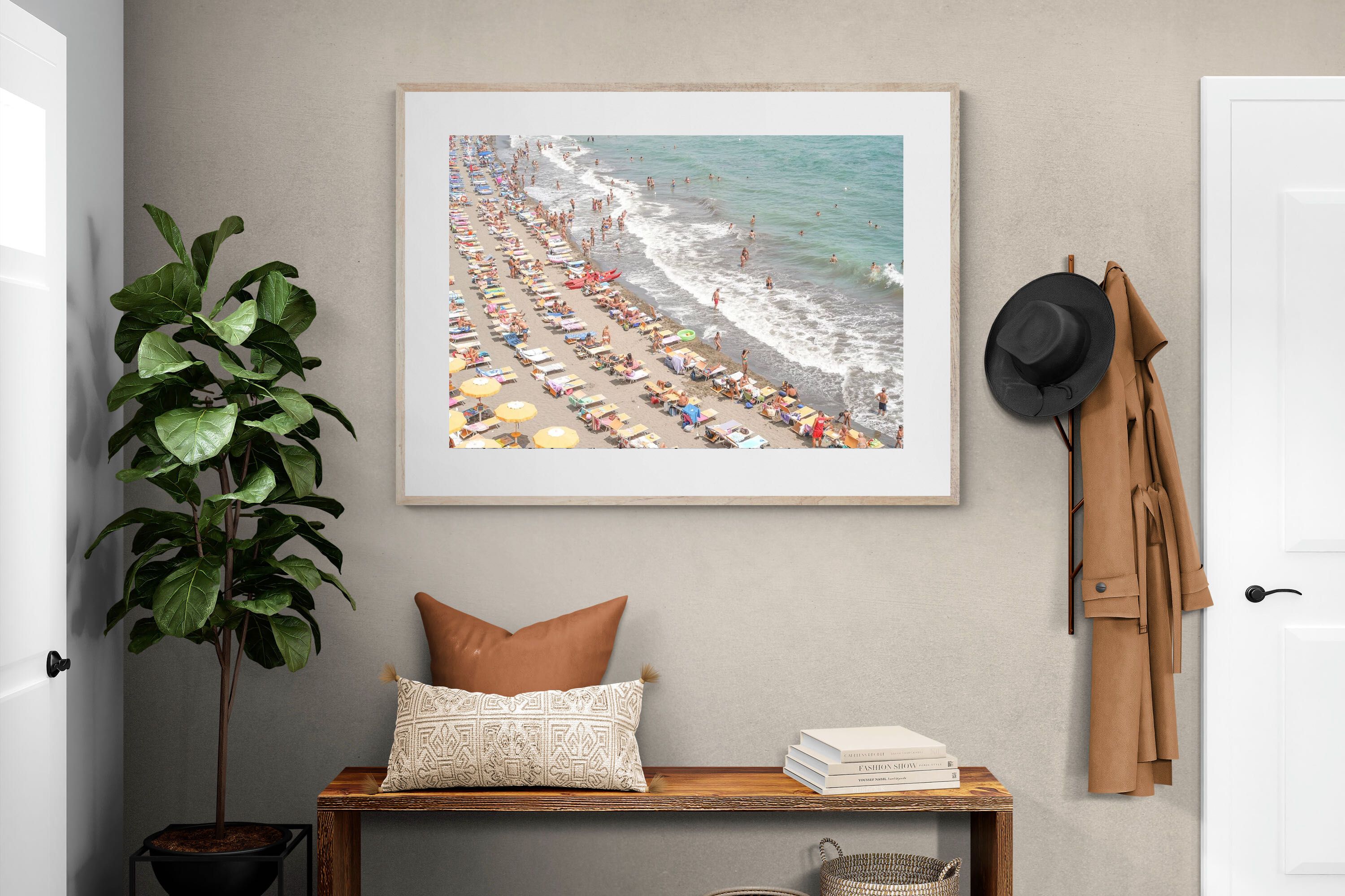 Rows of pastel loungers line the shoreline as waves fold gently onto the sand, capturing the lively rhythm of an Italian summer afternoon. The soft, sun-washed tones balance colour with refinement, preventing the scene from feeling chaotic. Ideal for relaxed living rooms, holiday homes or vibrant coastal interiors, this artwork introduces movement and warmth while maintaining a curated, editorial finish.