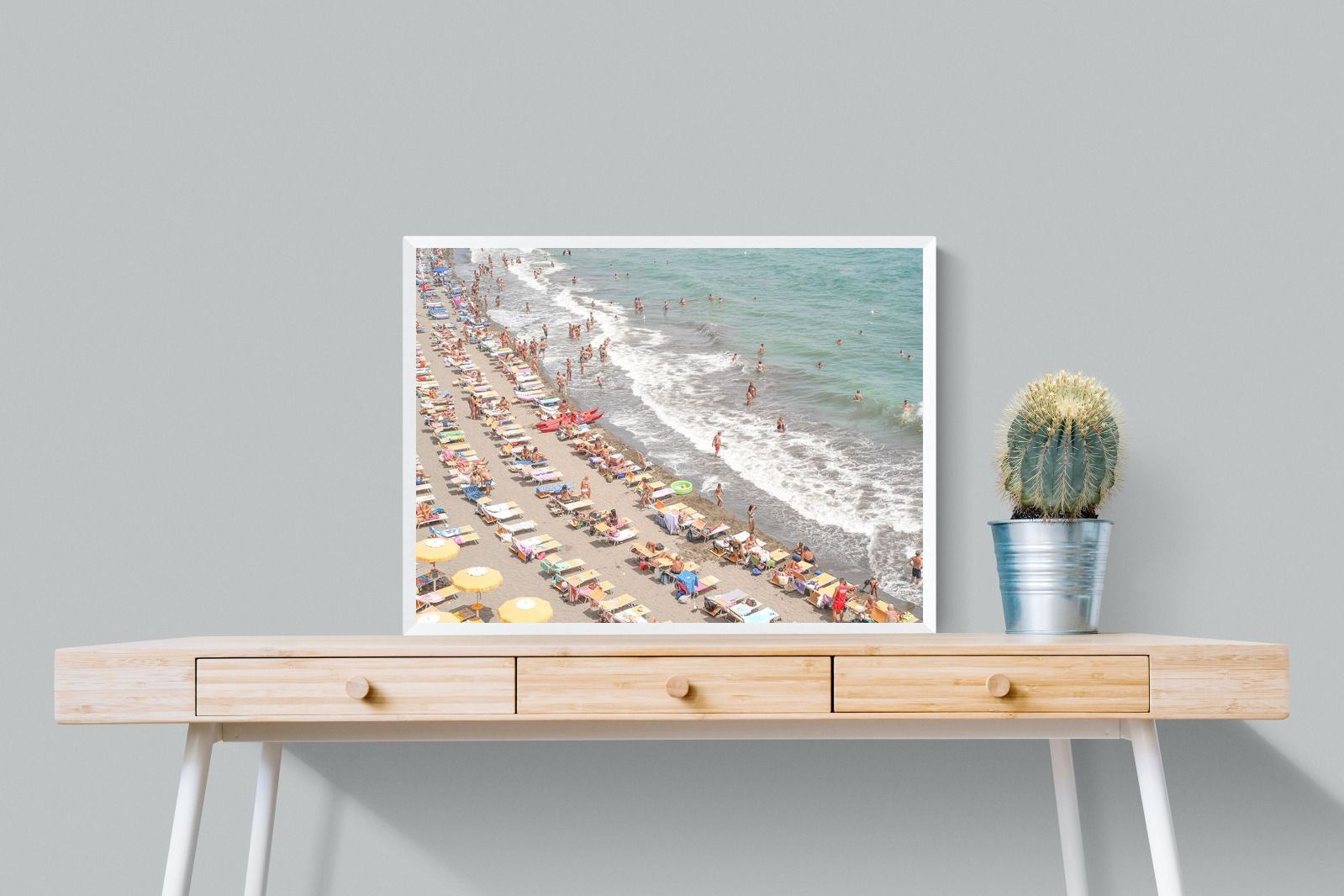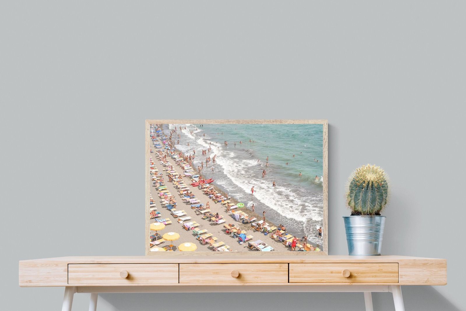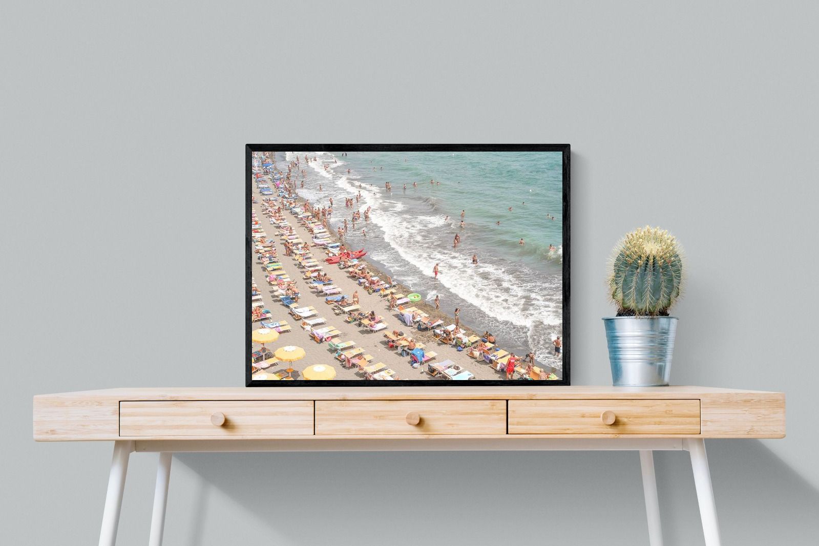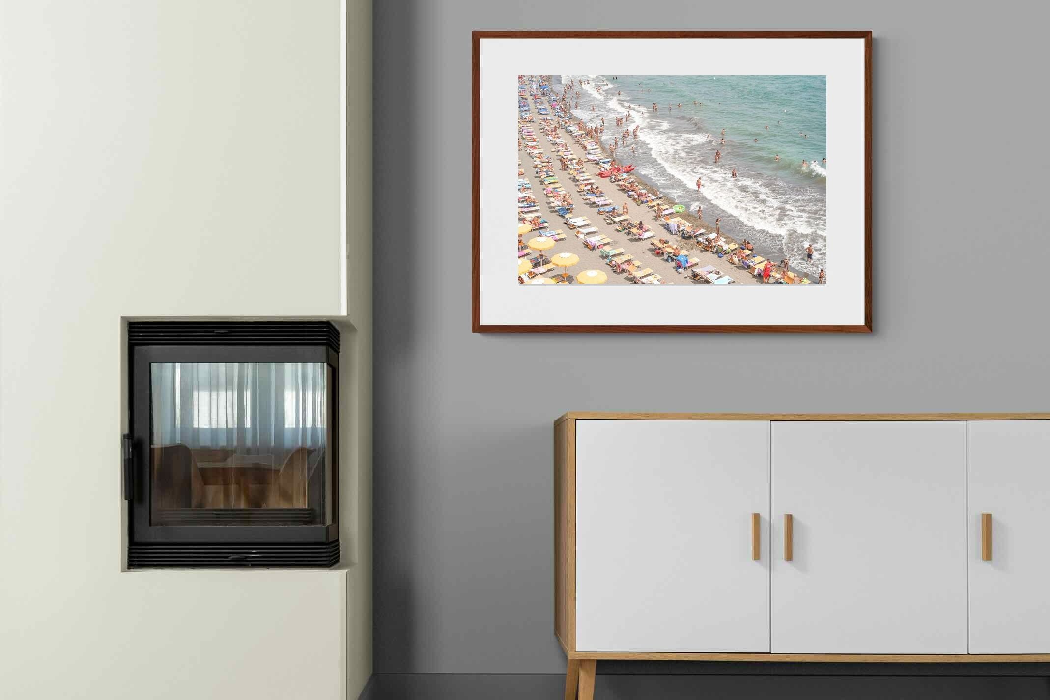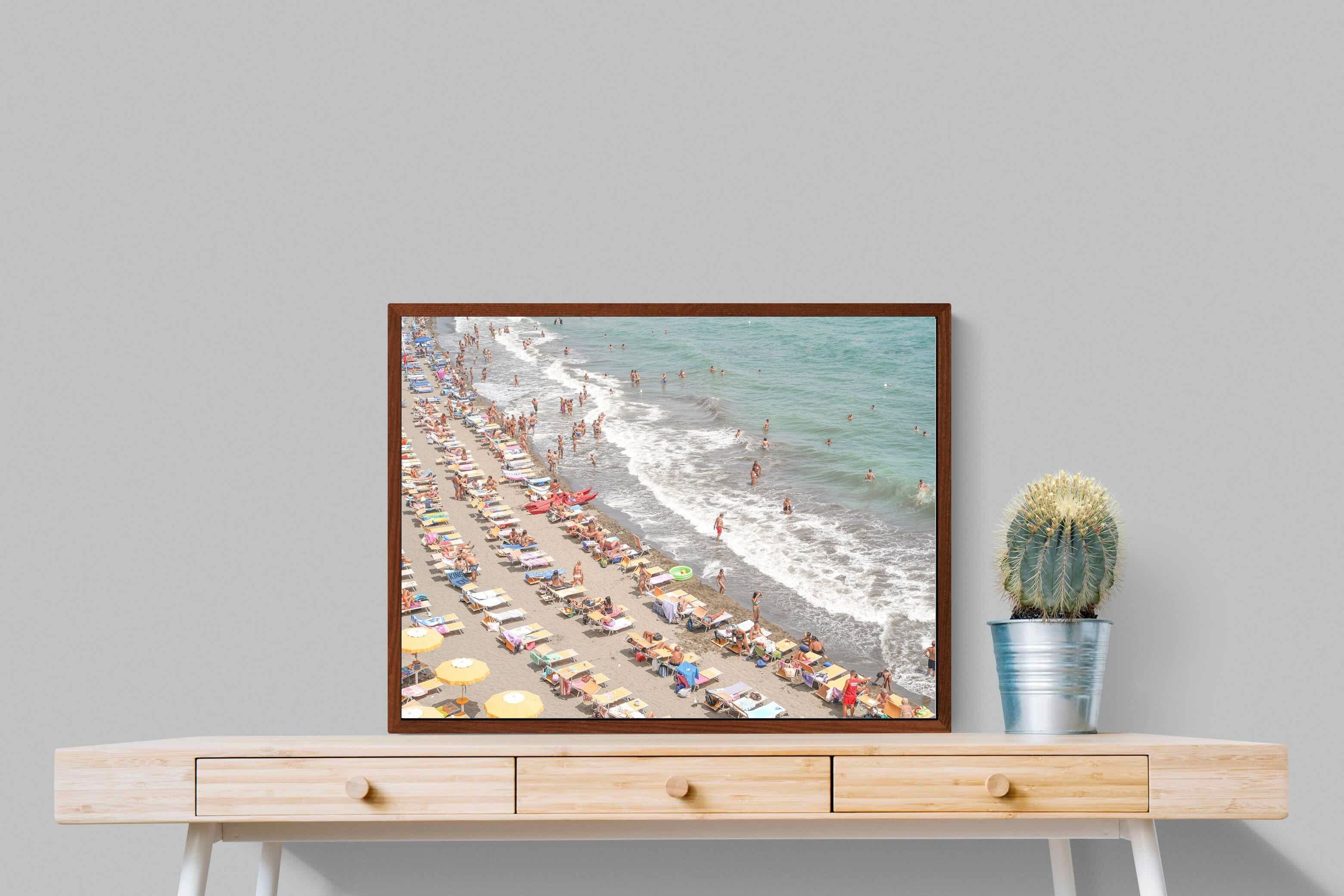 Rows of pastel loungers line the shoreline as waves fold gently onto the sand, capturing the lively rhythm of an Italian summer afternoon. The soft, sun-washed tones balance colour with refinement, preventing the scene from feeling chaotic. Ideal for relaxed living rooms, holiday homes or vibrant coastal interiors, this artwork introduces movement and warmth while maintaining a curated, editorial finish.