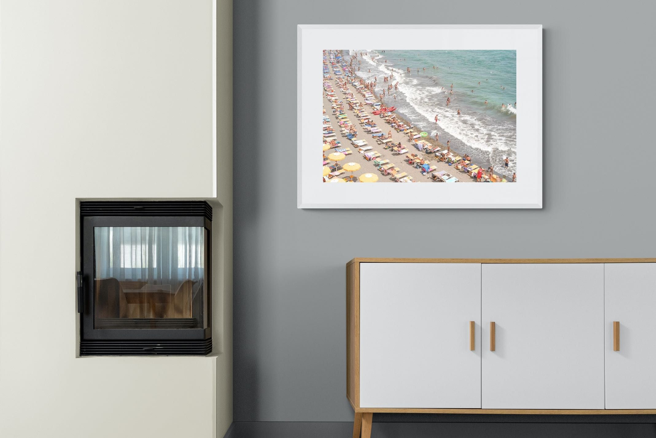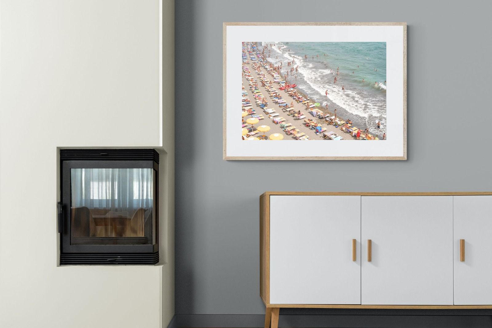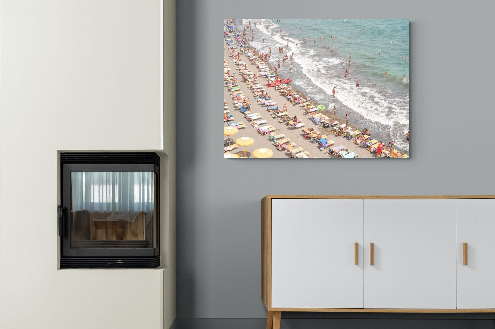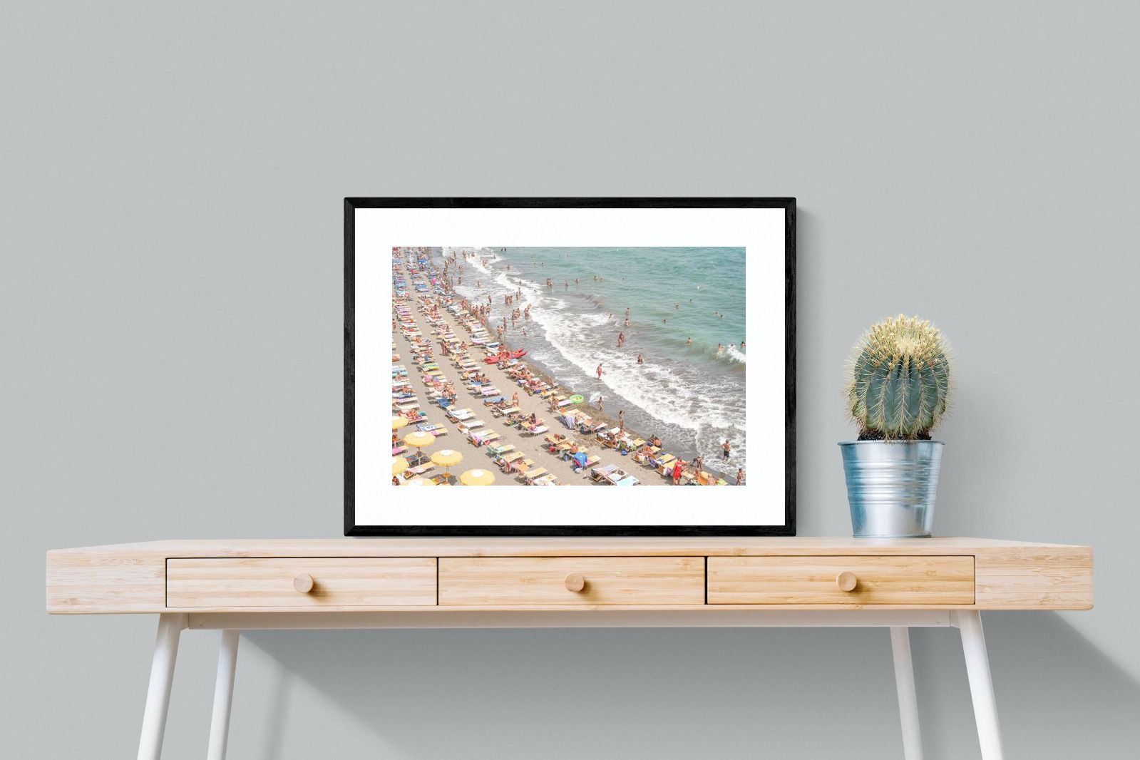 Rows of pastel loungers line the shoreline as waves fold gently onto the sand, capturing the lively rhythm of an Italian summer afternoon. The soft, sun-washed tones balance colour with refinement, preventing the scene from feeling chaotic. Ideal for relaxed living rooms, holiday homes or vibrant coastal interiors, this artwork introduces movement and warmth while maintaining a curated, editorial finish.