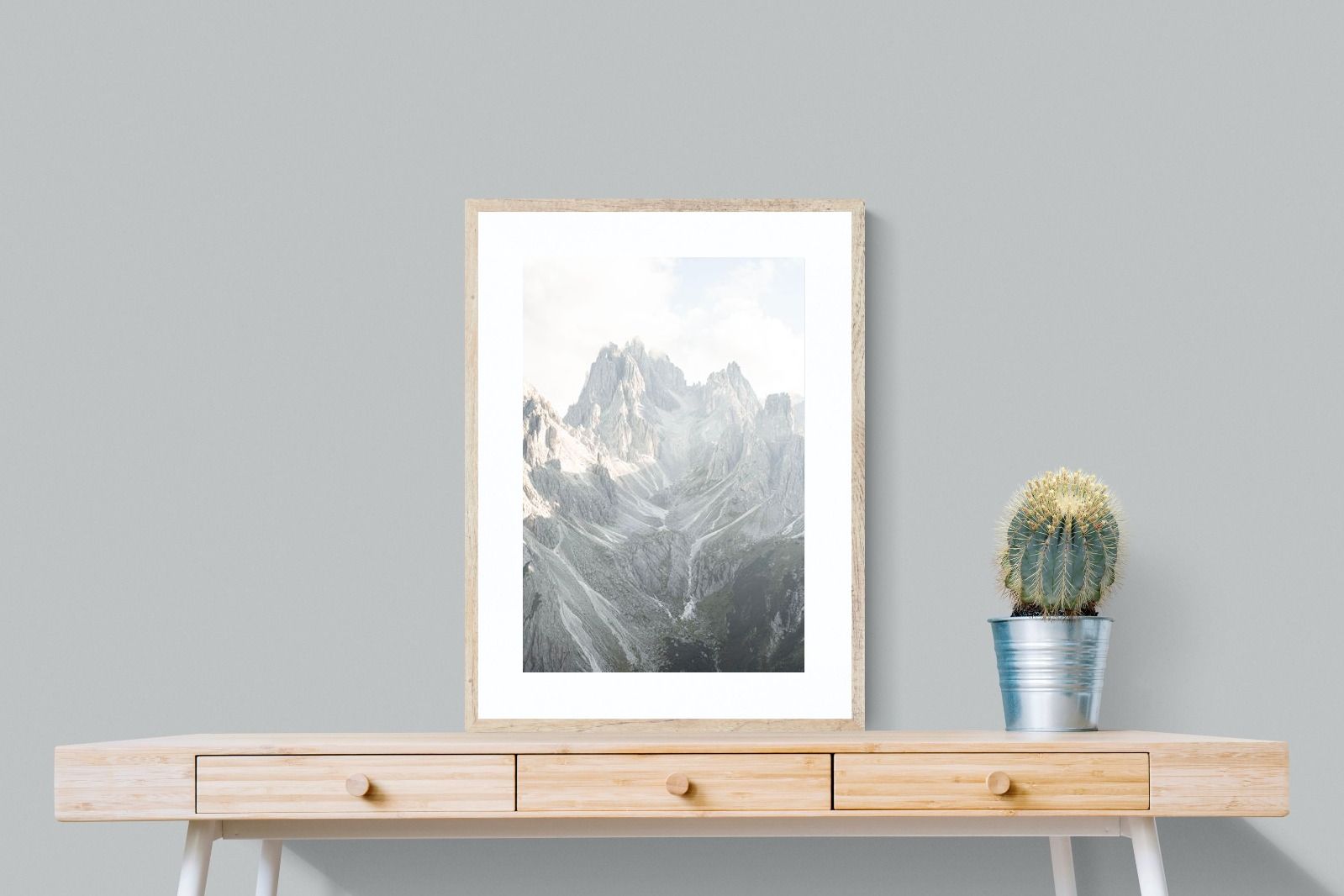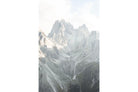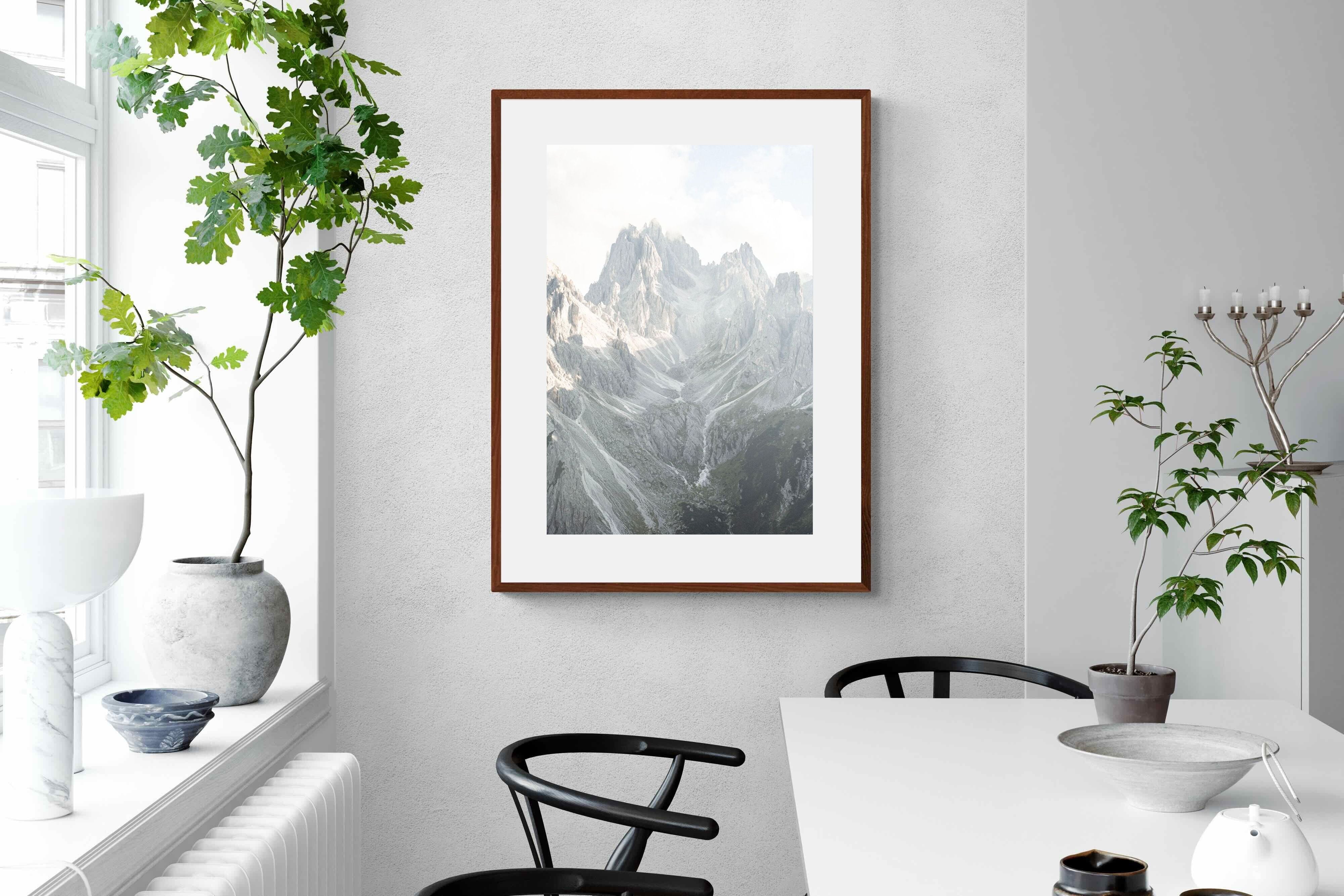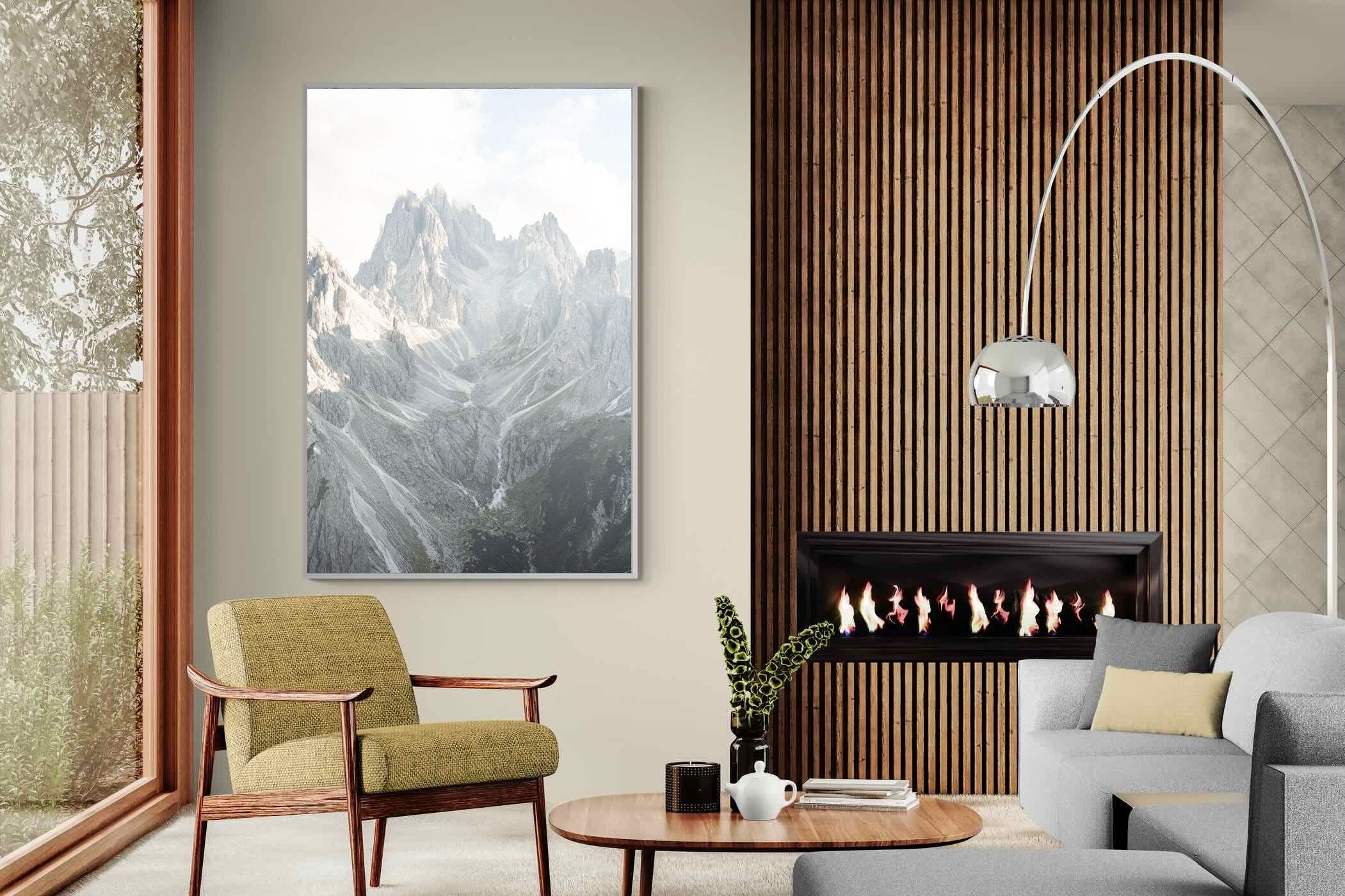 Sharp limestone peaks rise through soft morning haze, their ridgelines carved with striking geological detail. Subtle tones of grey and pale sage create an ethereal, almost monochrome palette that feels refined and contemporary. The vertical composition adds height and drama, making it ideal for large statement walls. Perfect for modern interiors, this artwork brings alpine grandeur and European landscape elegance into the home.