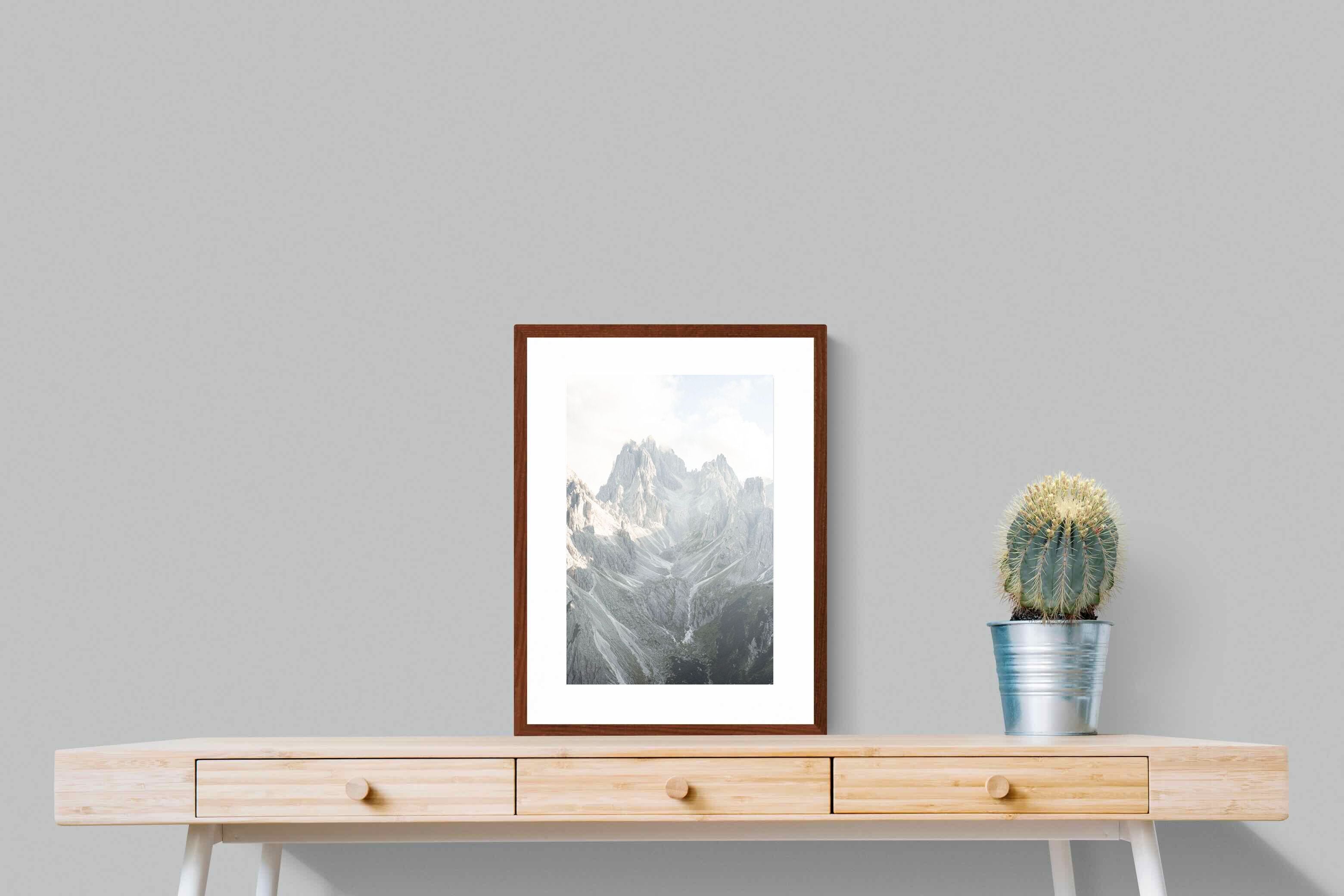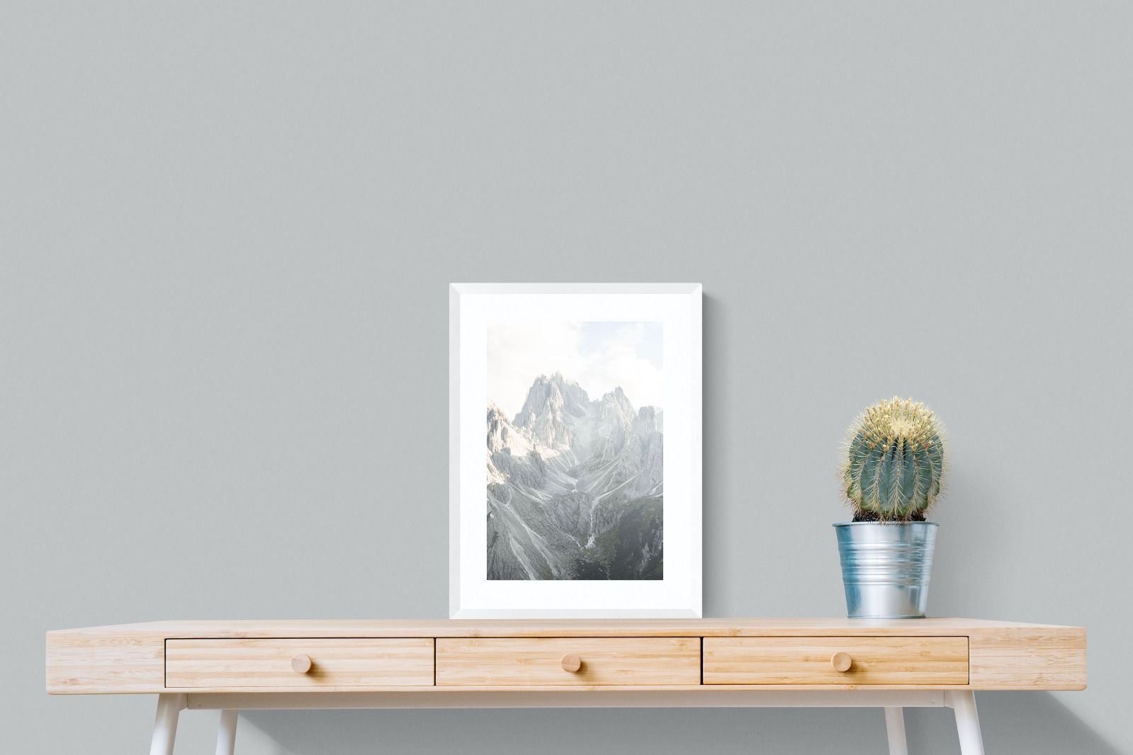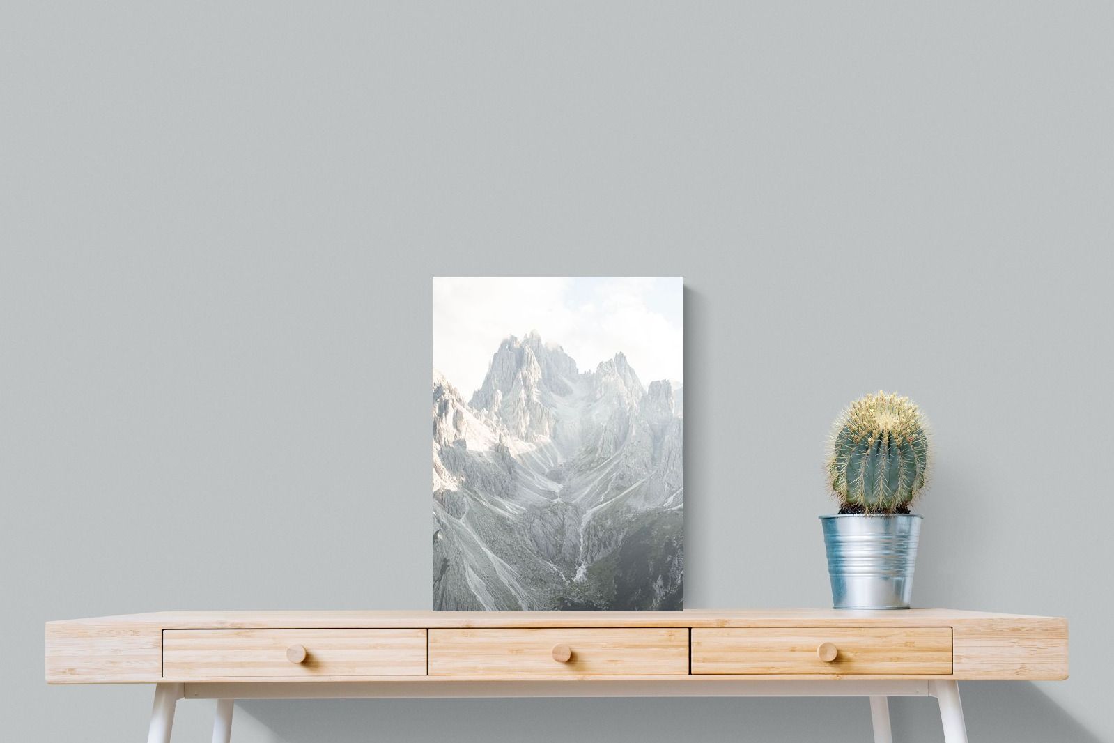 Sharp limestone peaks rise through soft morning haze, their ridgelines carved with striking geological detail. Subtle tones of grey and pale sage create an ethereal, almost monochrome palette that feels refined and contemporary. The vertical composition adds height and drama, making it ideal for large statement walls. Perfect for modern interiors, this artwork brings alpine grandeur and European landscape elegance into the home.